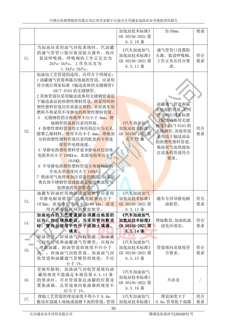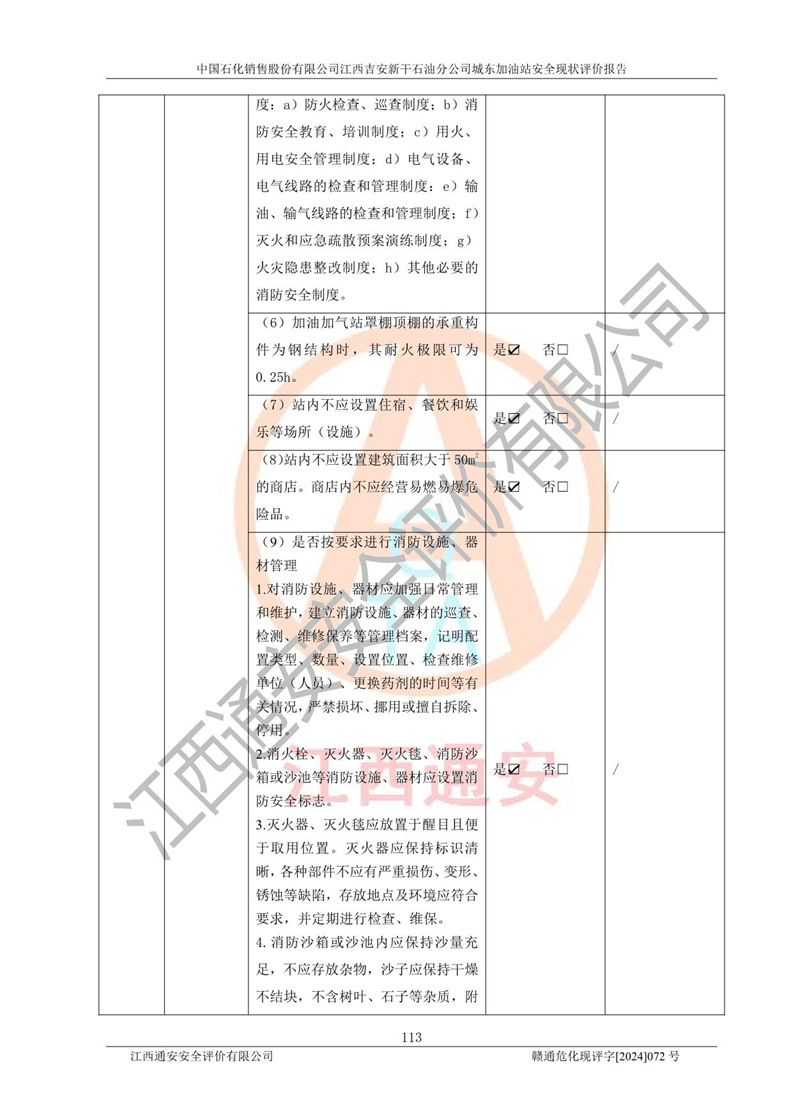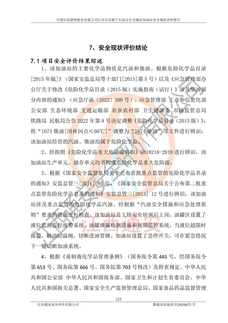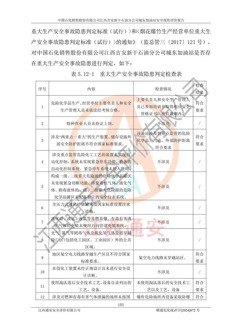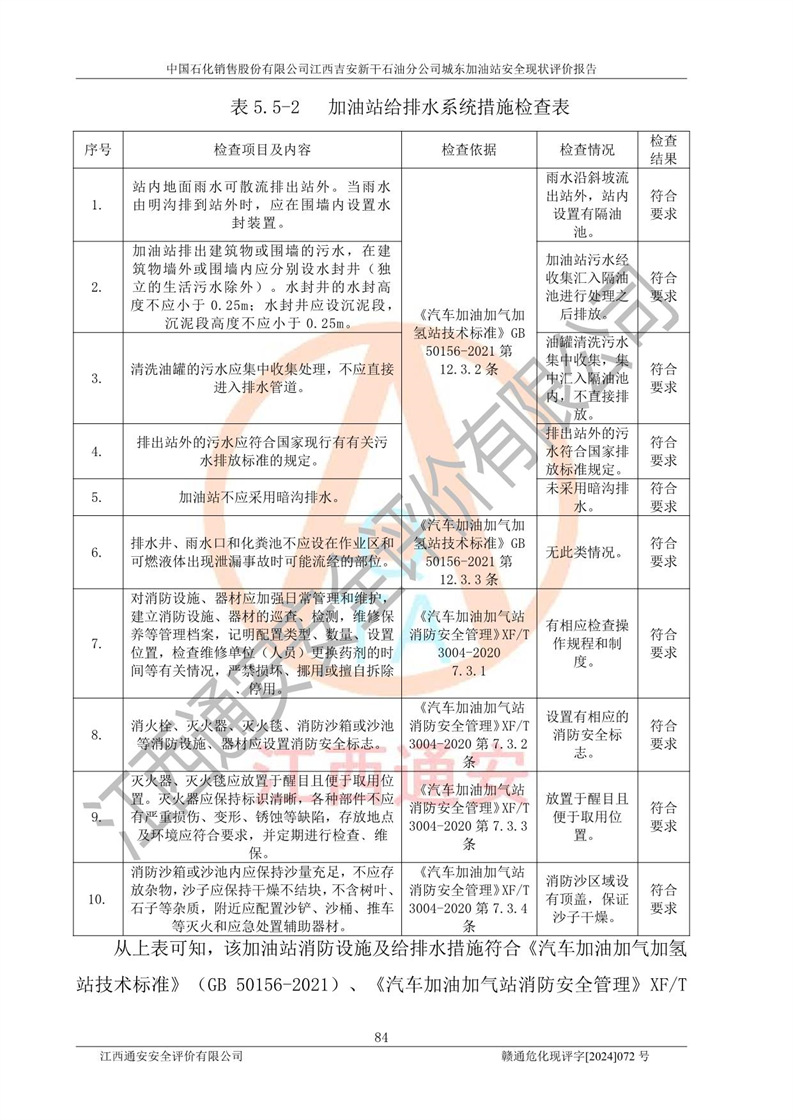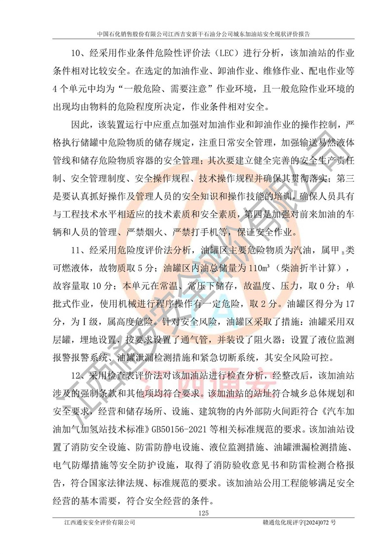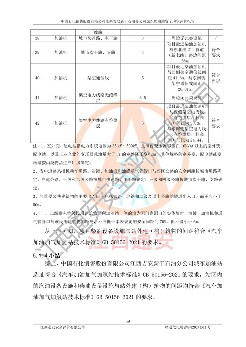 評(píng)價(jià)結(jié)論 | 中國(guó)石化銷售股份有限公司江西吉安新干石油分公司城東加油站符合《汽車加油加氣加氫站技術(shù)標(biāo)準(zhǔn)》GB50156-2021等標(biāo)準(zhǔn)規(guī)范的要求,安全風(fēng)險(xiǎn)可控,滿足危險(xiǎn)化學(xué)品經(jīng)營(yíng)的安全條件。 | |||