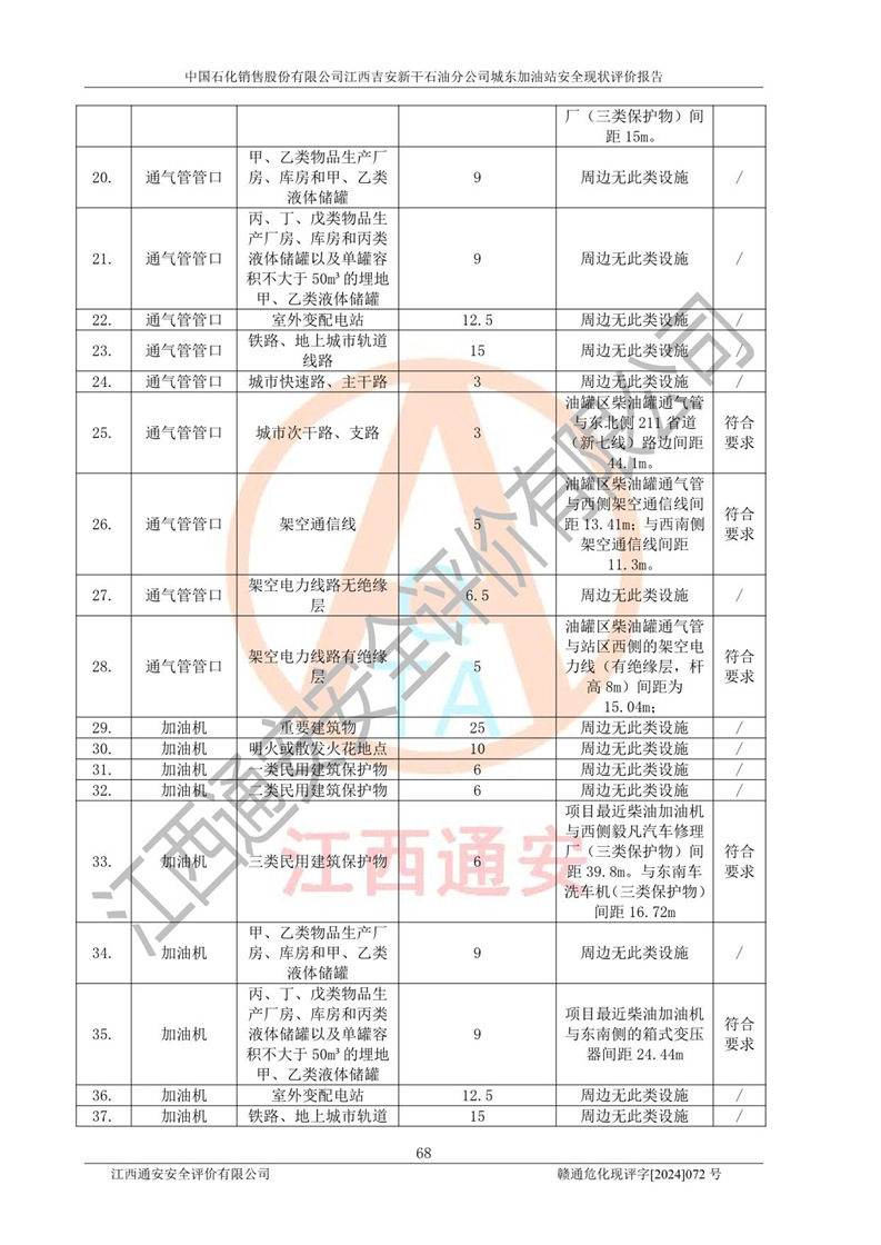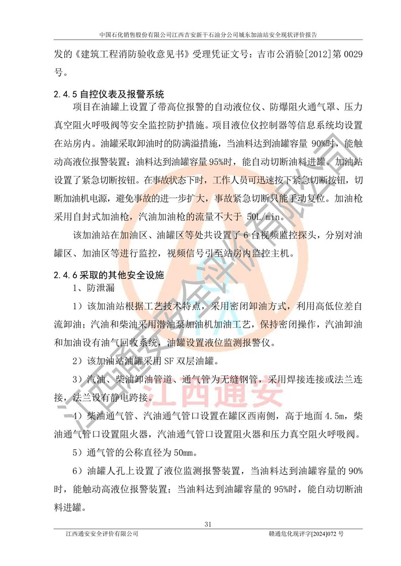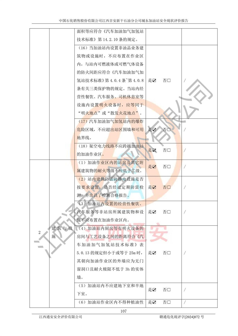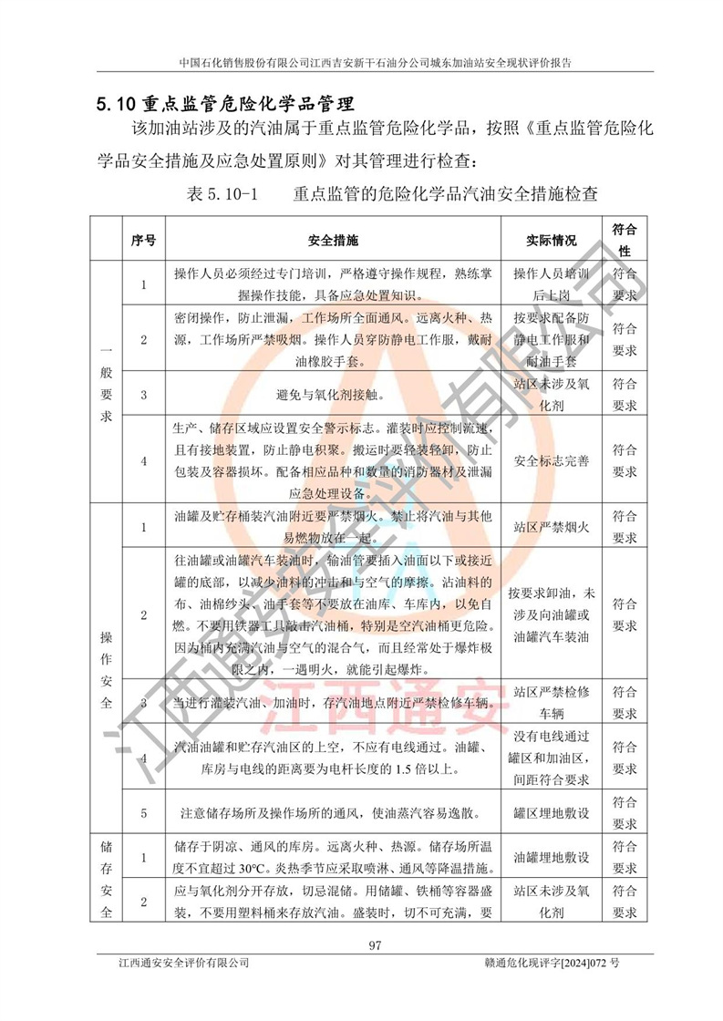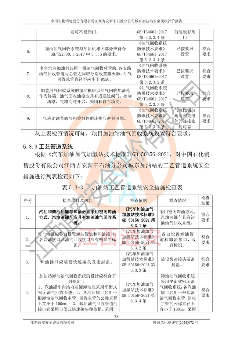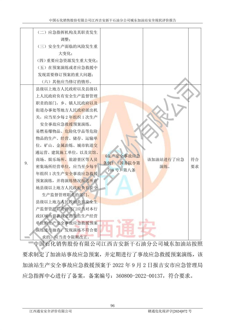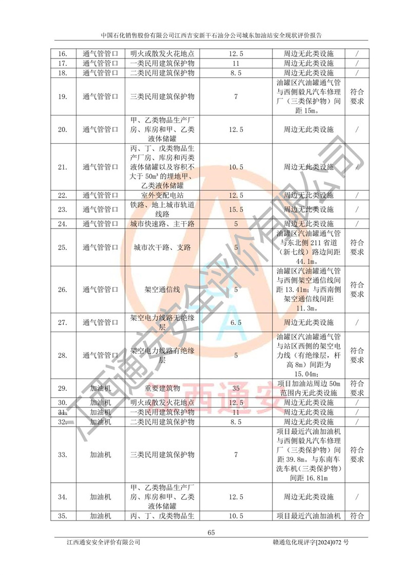 評(píng)價(jià)結(jié)論 | 中國(guó)石化銷售股份有限公司江西吉安新干石油分公司城東加油站符合《汽車加油加氣加氫站技術(shù)標(biāo)準(zhǔn)》GB50156-2021等標(biāo)準(zhǔn)規(guī)范的要求,安全風(fēng)險(xiǎn)可控,滿足危險(xiǎn)化學(xué)品經(jīng)營(yíng)的安全條件。 | |||