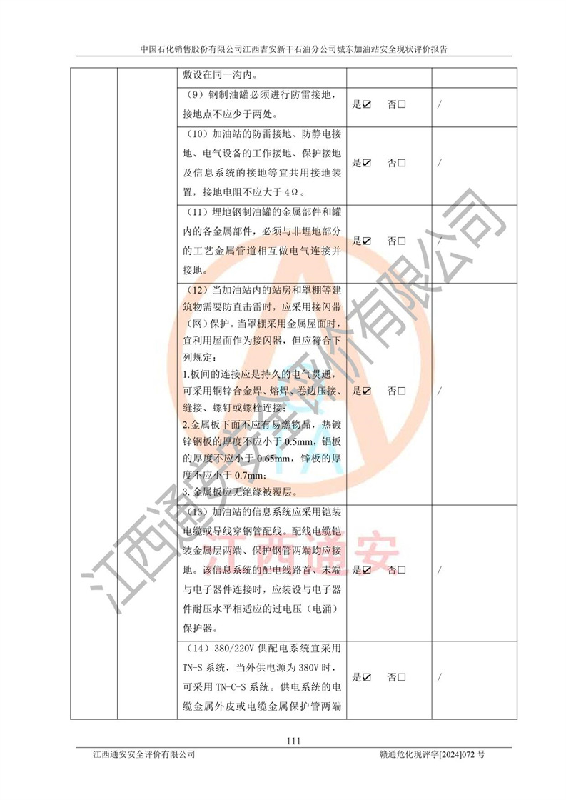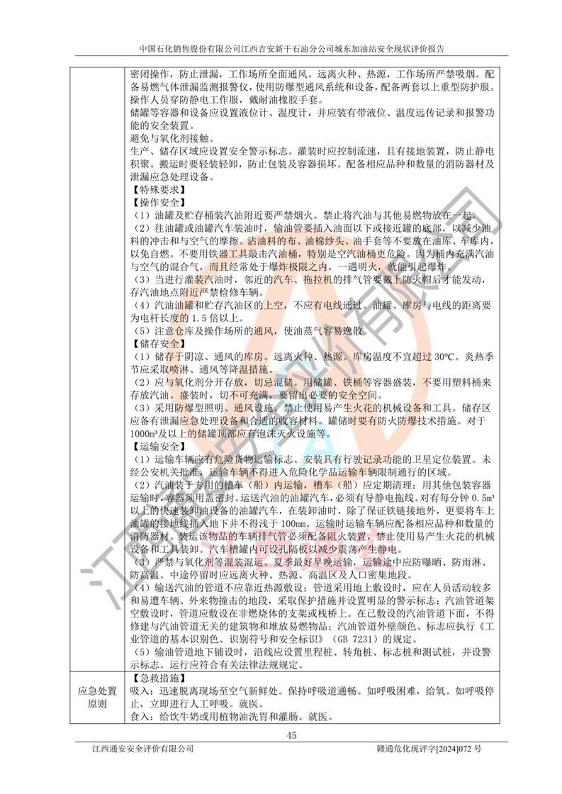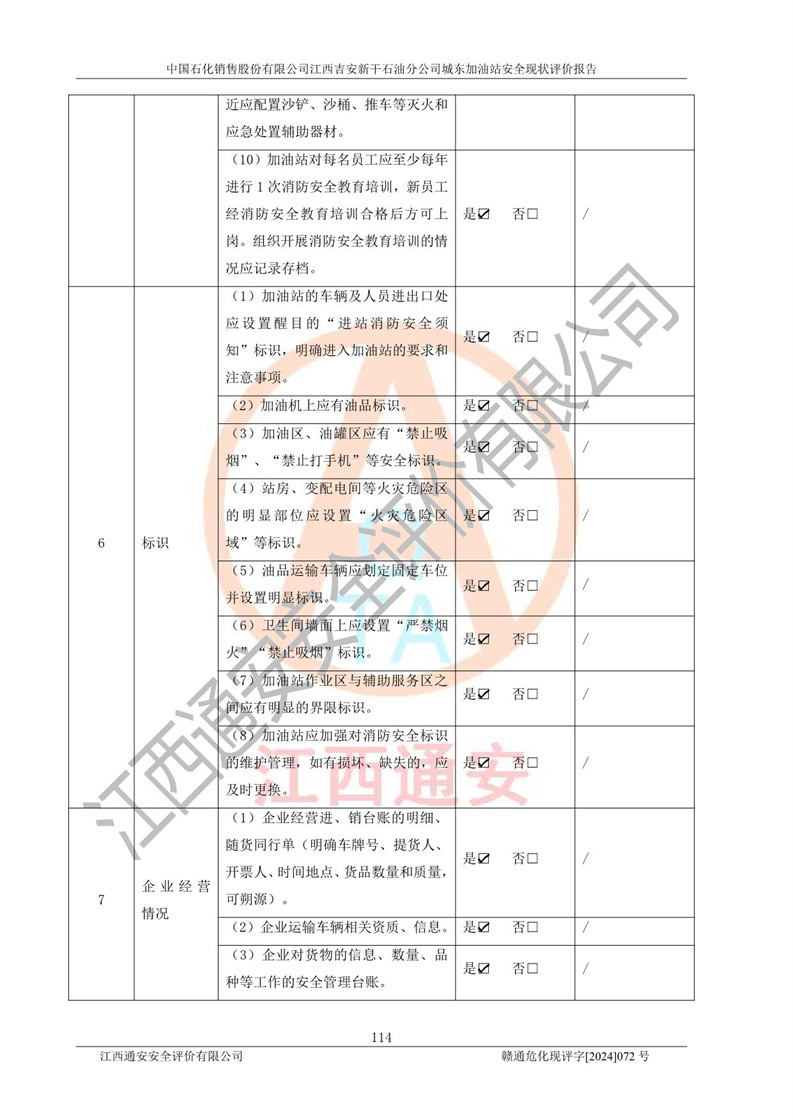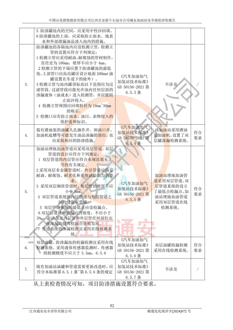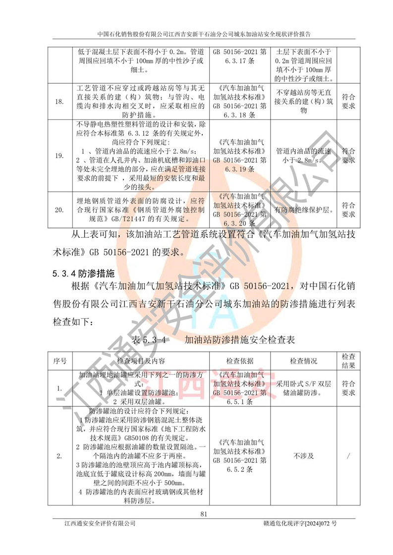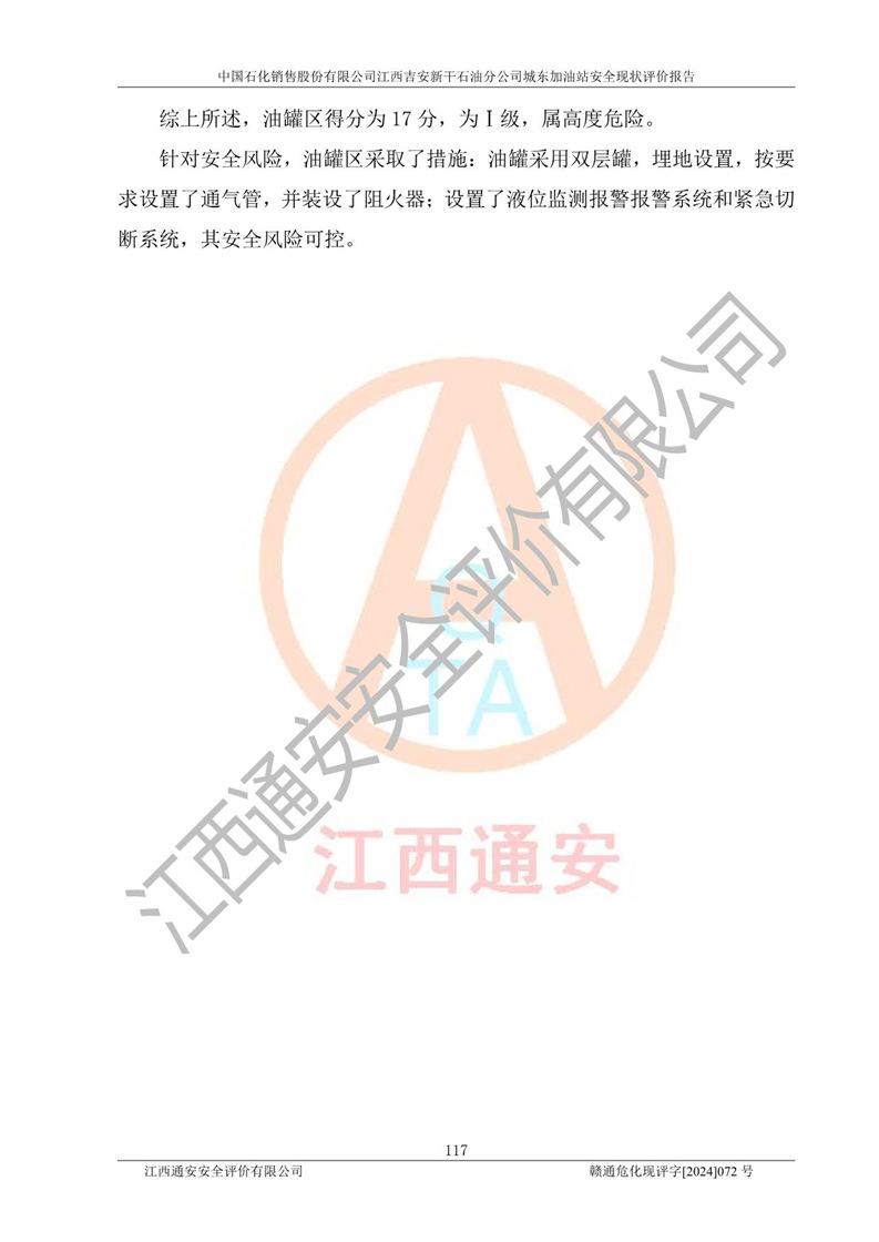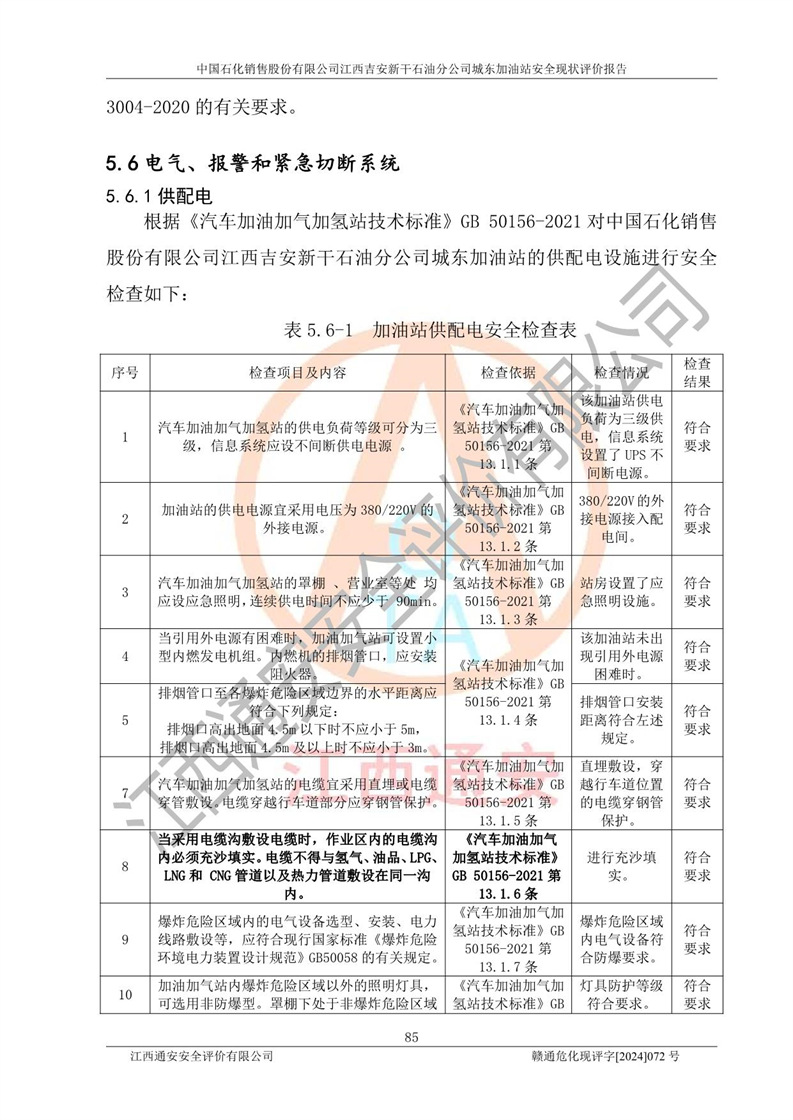 評(píng)價(jià)結(jié)論 | 中國(guó)石化銷售股份有限公司江西吉安新干石油分公司城東加油站符合《汽車加油加氣加氫站技術(shù)標(biāo)準(zhǔn)》GB50156-2021等標(biāo)準(zhǔn)規(guī)范的要求,安全風(fēng)險(xiǎn)可控,滿足危險(xiǎn)化學(xué)品經(jīng)營(yíng)的安全條件。 | |||