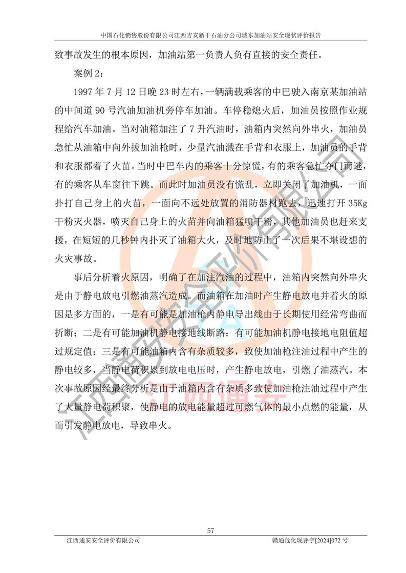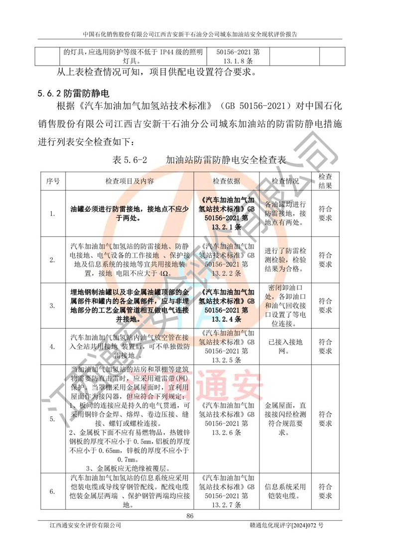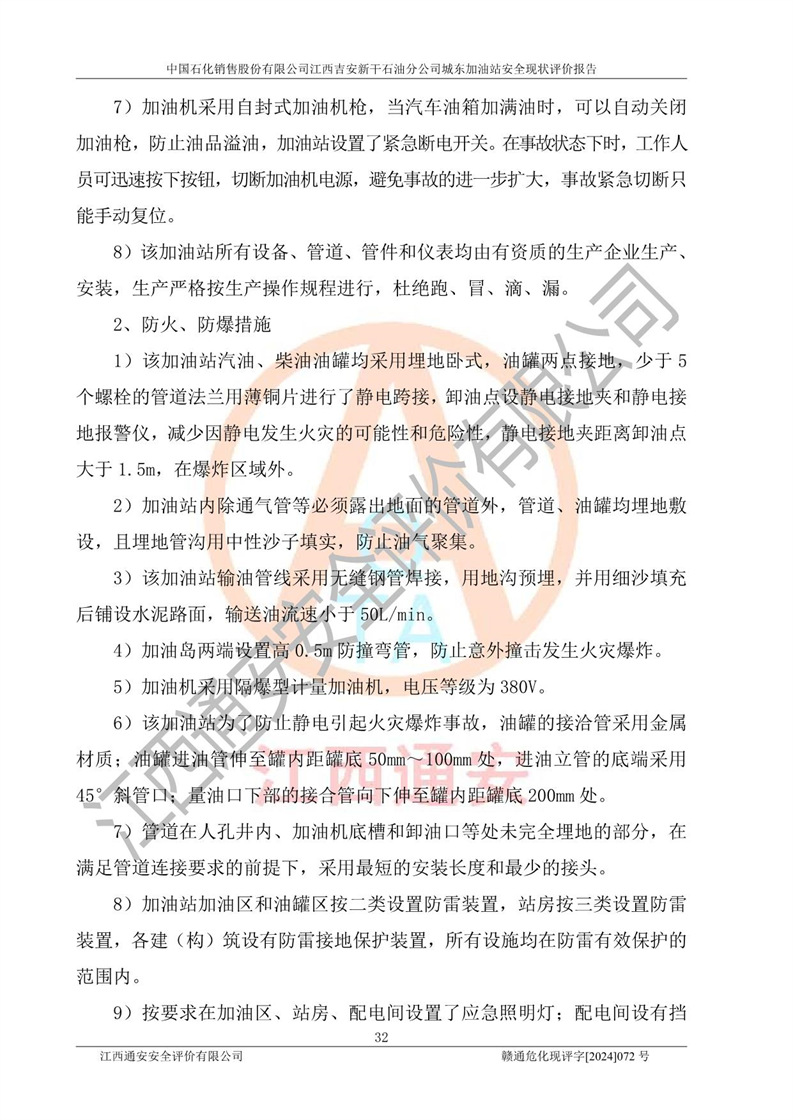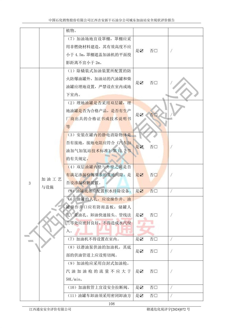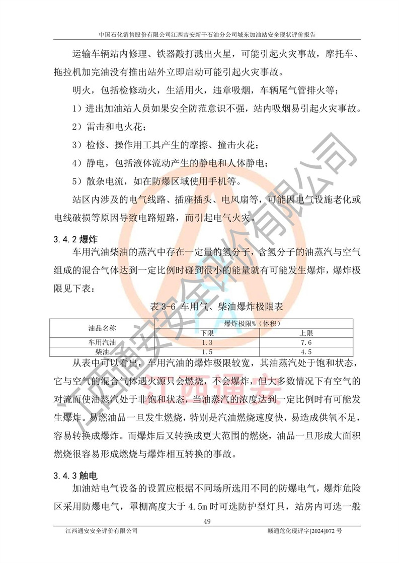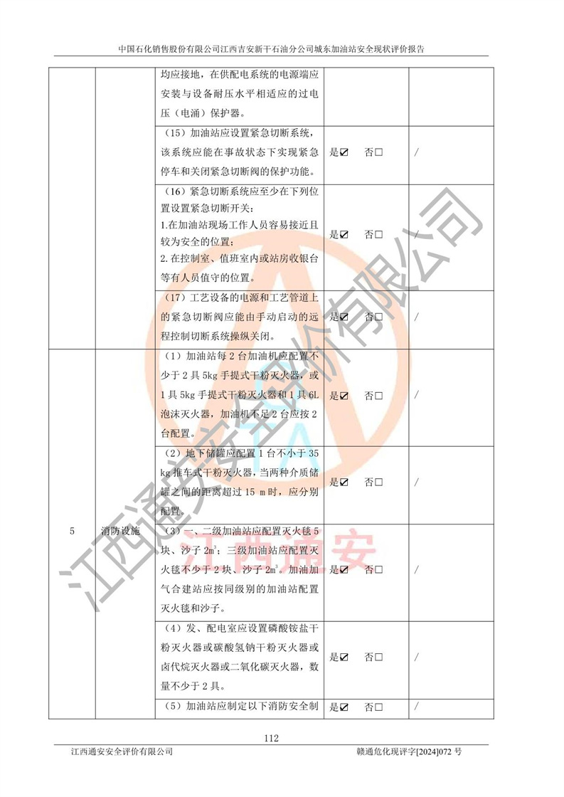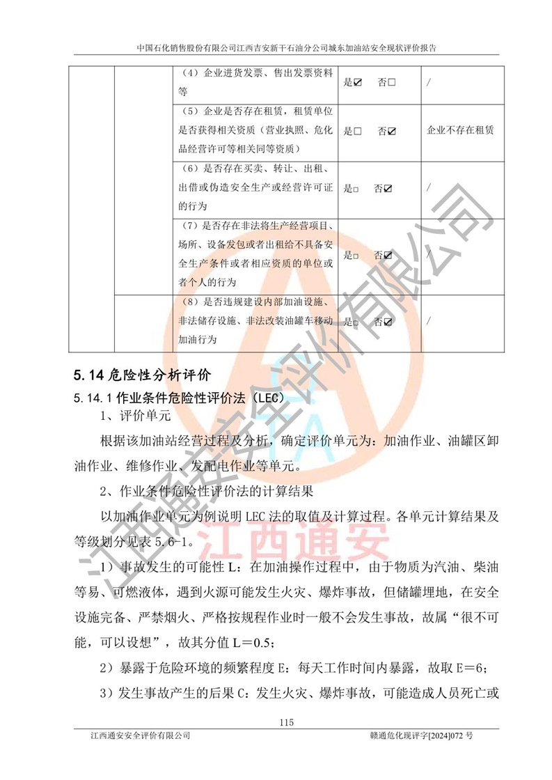 評(píng)價(jià)結(jié)論 | 中國(guó)石化銷售股份有限公司江西吉安新干石油分公司城東加油站符合《汽車加油加氣加氫站技術(shù)標(biāo)準(zhǔn)》GB50156-2021等標(biāo)準(zhǔn)規(guī)范的要求,安全風(fēng)險(xiǎn)可控,滿足危險(xiǎn)化學(xué)品經(jīng)營(yíng)的安全條件。 | |||