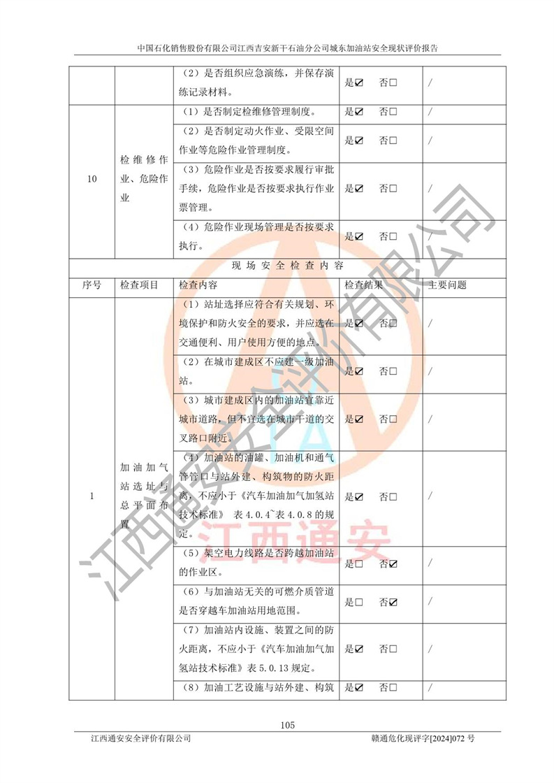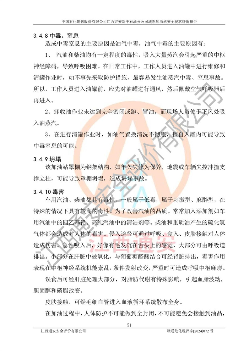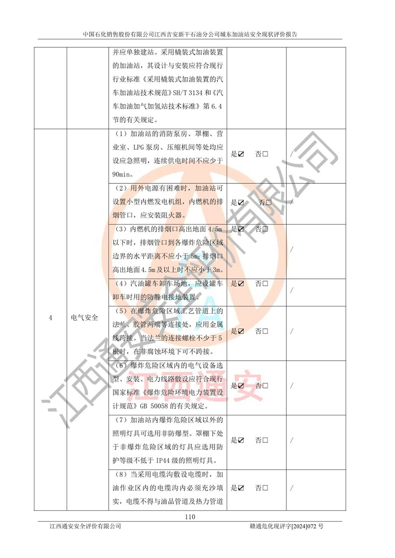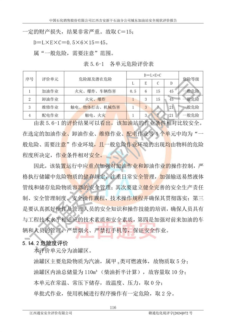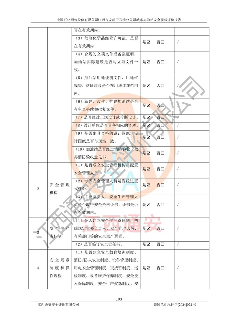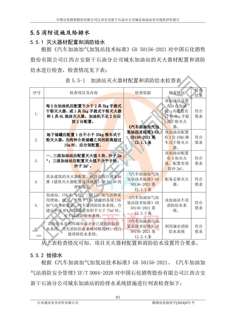 評(píng)價(jià)結(jié)論 | 中國(guó)石化銷售股份有限公司江西吉安新干石油分公司城東加油站符合《汽車加油加氣加氫站技術(shù)標(biāo)準(zhǔn)》GB50156-2021等標(biāo)準(zhǔn)規(guī)范的要求,安全風(fēng)險(xiǎn)可控,滿足危險(xiǎn)化學(xué)品經(jīng)營(yíng)的安全條件。 | |||