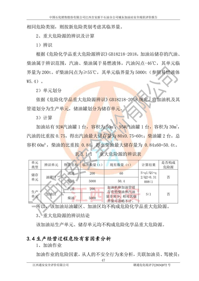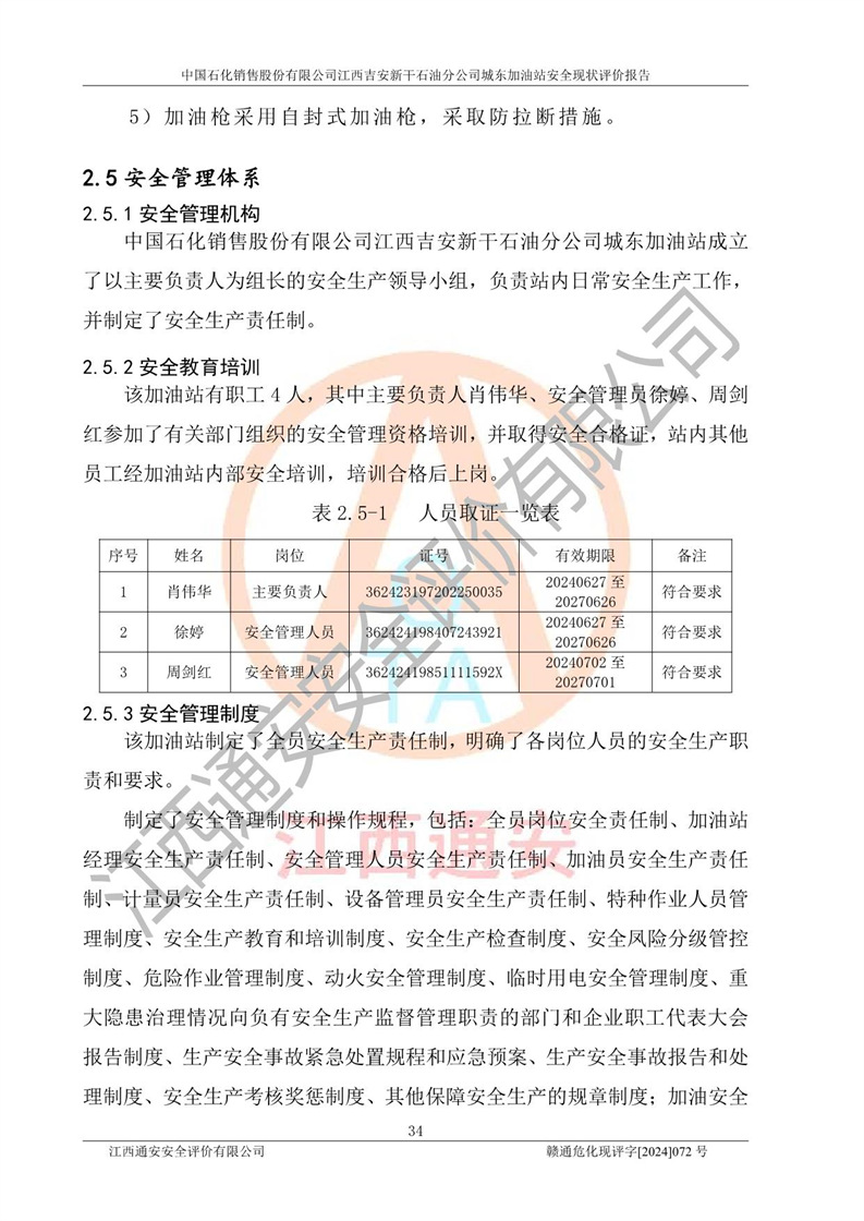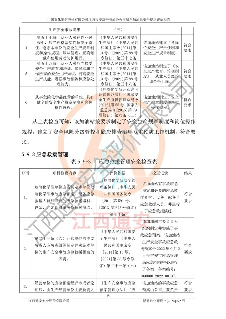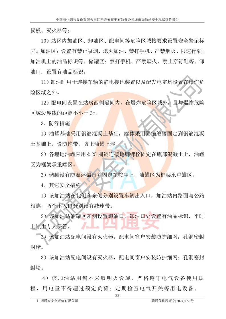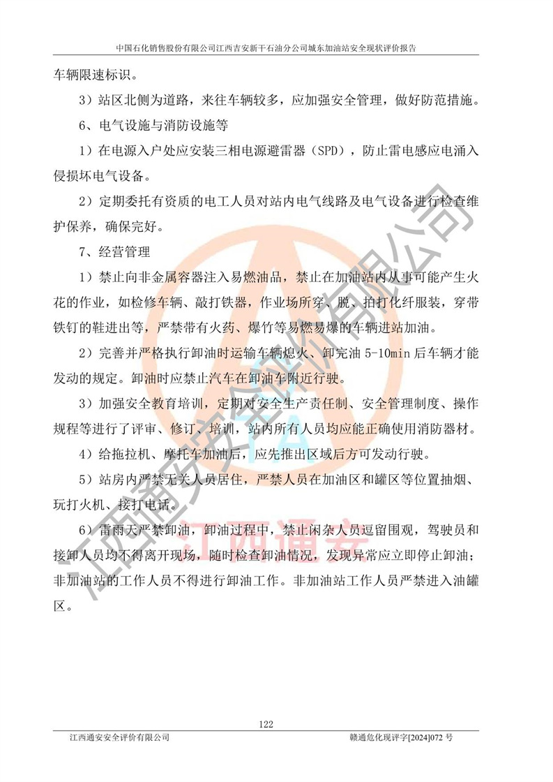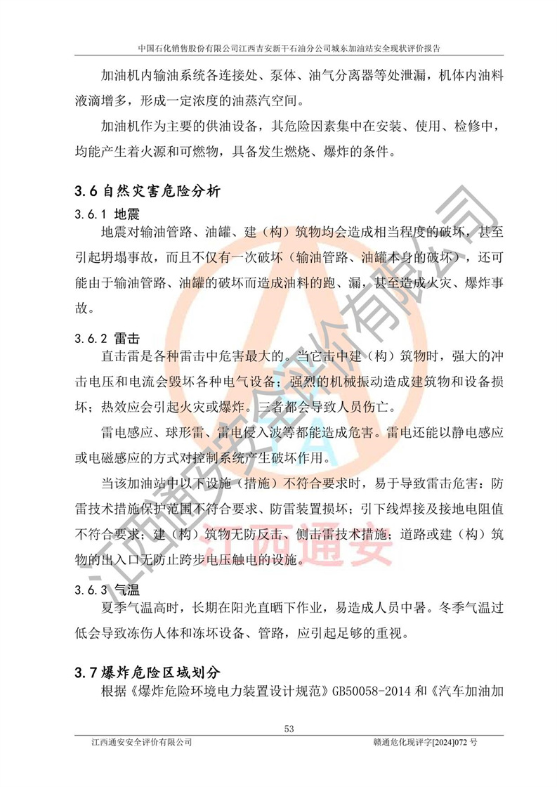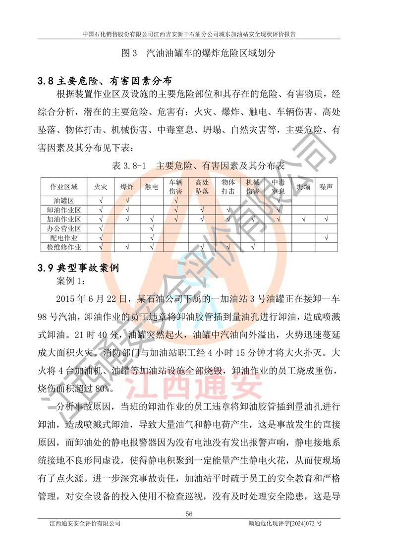 評(píng)價(jià)結(jié)論 | 中國(guó)石化銷售股份有限公司江西吉安新干石油分公司城東加油站符合《汽車加油加氣加氫站技術(shù)標(biāo)準(zhǔn)》GB50156-2021等標(biāo)準(zhǔn)規(guī)范的要求,安全風(fēng)險(xiǎn)可控,滿足危險(xiǎn)化學(xué)品經(jīng)營(yíng)的安全條件。 | |||