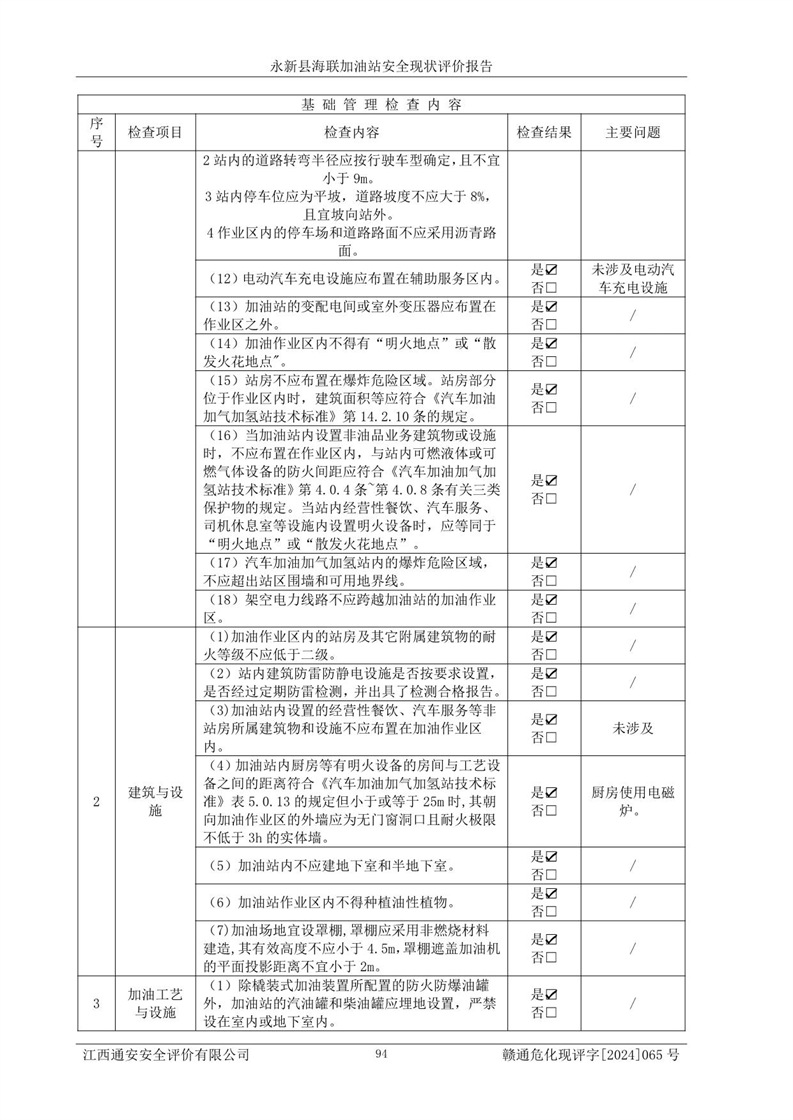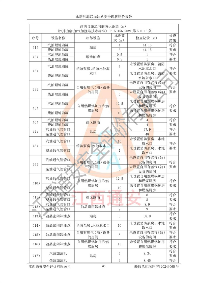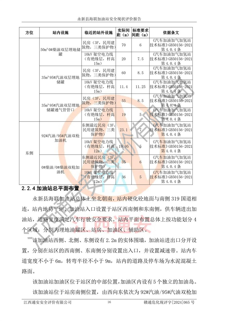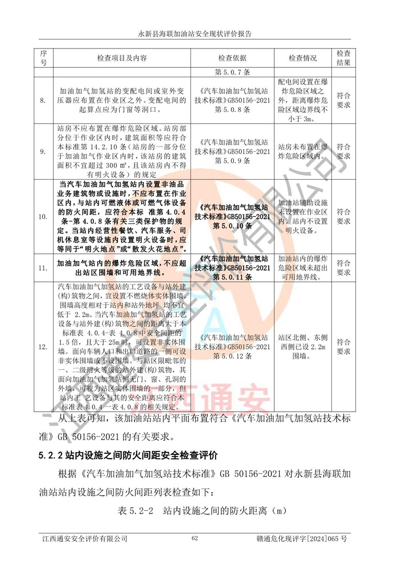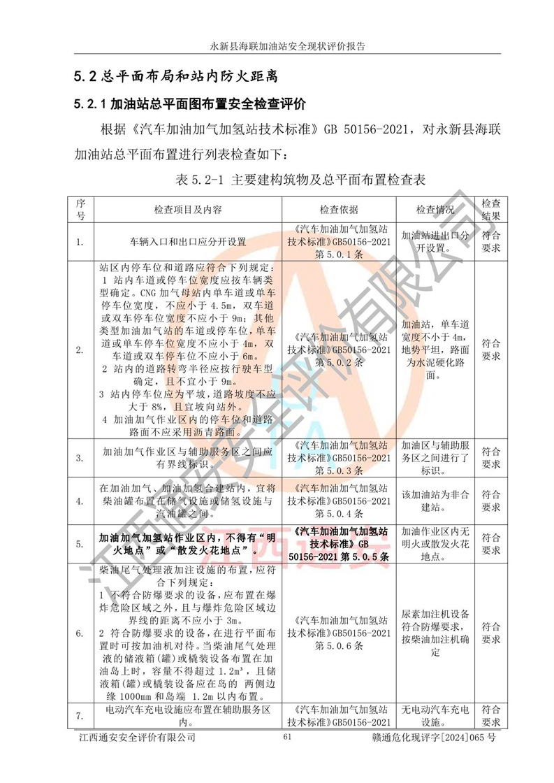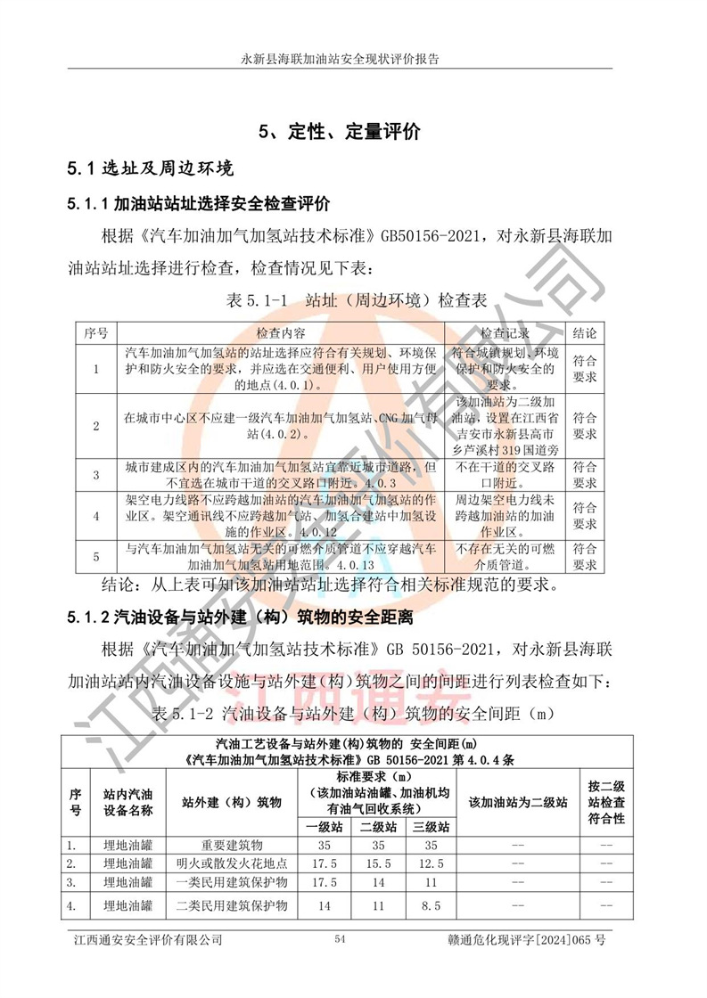 評價結(jié)論 | 永新縣海聯(lián)加油站站址合理,周邊環(huán)境良好,與敏感防護目標間距符合規(guī)范要求,站區(qū)建構(gòu)筑物之間的防火間距、耐火等級符合標準要求,與總平面布置圖一致,加油卸油工藝及設(shè)備設(shè)施合理,工藝布置得當(dāng),防雷設(shè)施經(jīng)檢測合格,采取的工藝安全設(shè)施符合規(guī)范要求;該加油站制定了安全管理制度和操作規(guī)程,人員經(jīng)培訓(xùn)合格后上崗,安全管理人員經(jīng)考核合格并取得安全合格證,能按照法律法規(guī)要求開展安全生產(chǎn)管理工作。 綜上:永新縣海聯(lián)加油站符合《汽車加油加氣加氫站技術(shù)標準》GB50156-2021等標準規(guī)范的要求,安全風(fēng)險可控,滿足危險化學(xué)品經(jīng)營的安全條件。 | |||