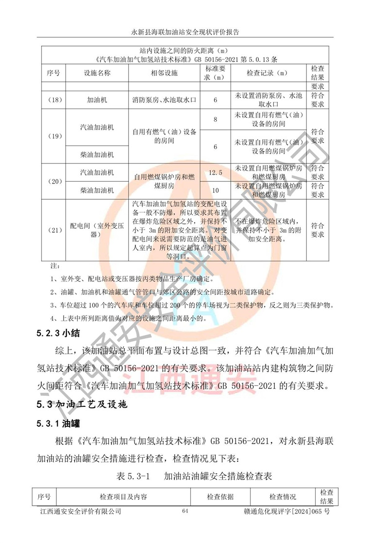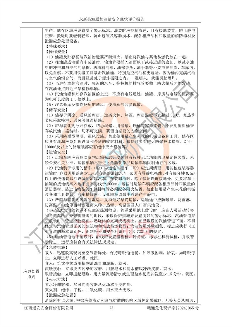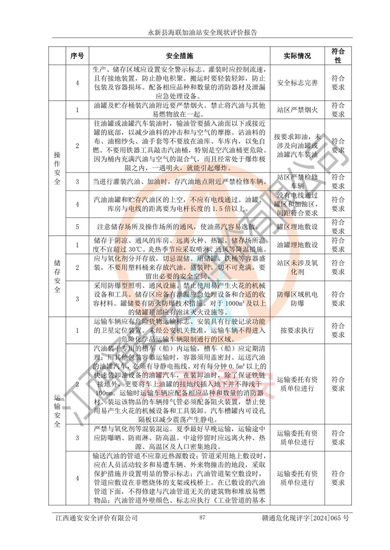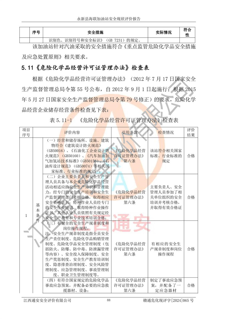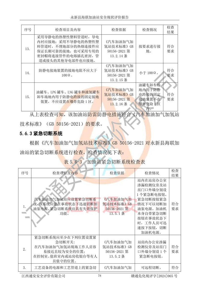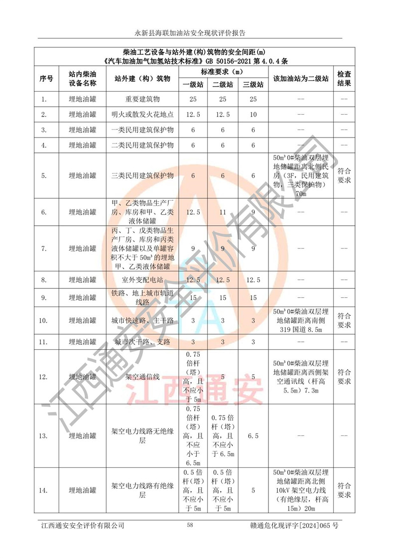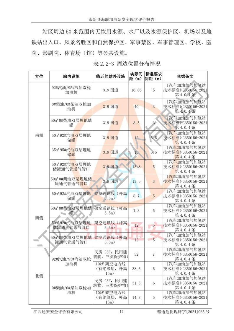 評價結(jié)論 | 永新縣海聯(lián)加油站站址合理,周邊環(huán)境良好,與敏感防護目標間距符合規(guī)范要求,站區(qū)建構(gòu)筑物之間的防火間距、耐火等級符合標準要求,與總平面布置圖一致,加油卸油工藝及設(shè)備設(shè)施合理,工藝布置得當(dāng),防雷設(shè)施經(jīng)檢測合格,采取的工藝安全設(shè)施符合規(guī)范要求;該加油站制定了安全管理制度和操作規(guī)程,人員經(jīng)培訓(xùn)合格后上崗,安全管理人員經(jīng)考核合格并取得安全合格證,能按照法律法規(guī)要求開展安全生產(chǎn)管理工作。 綜上:永新縣海聯(lián)加油站符合《汽車加油加氣加氫站技術(shù)標準》GB50156-2021等標準規(guī)范的要求,安全風(fēng)險可控,滿足危險化學(xué)品經(jīng)營的安全條件。 | |||