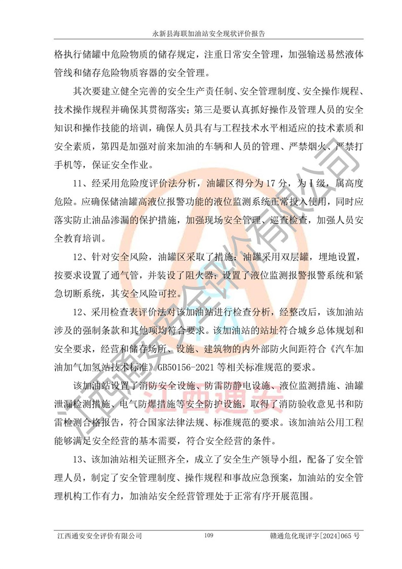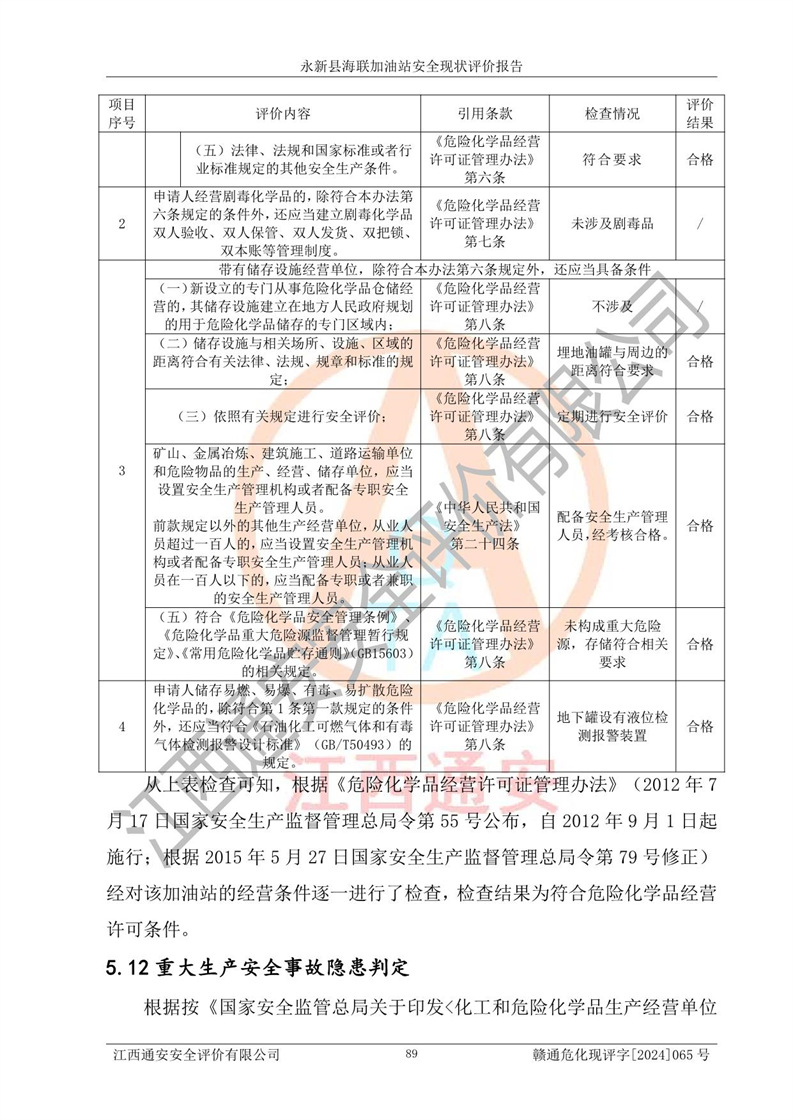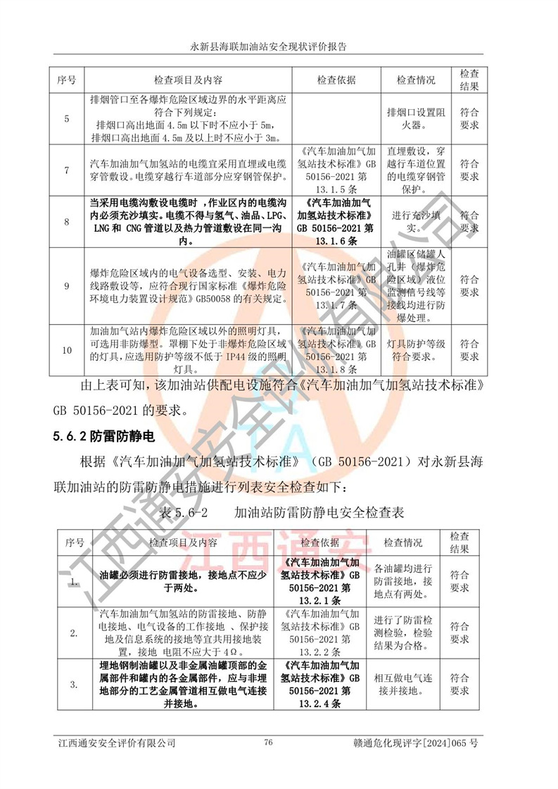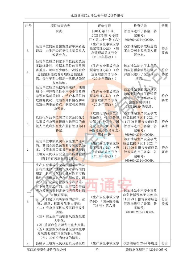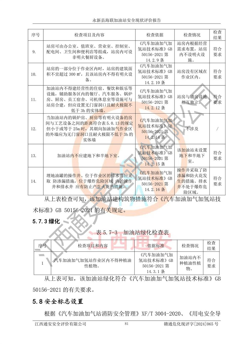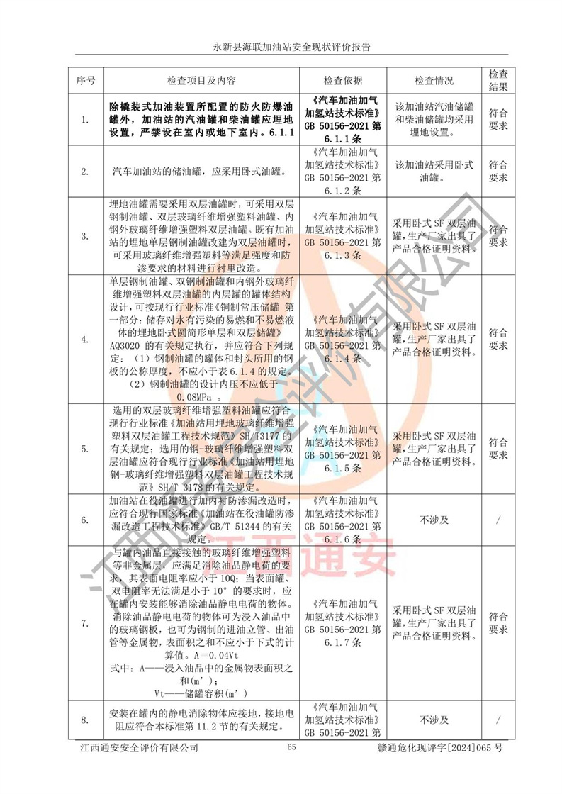 評價結(jié)論 | 永新縣海聯(lián)加油站站址合理,周邊環(huán)境良好,與敏感防護目標間距符合規(guī)范要求,站區(qū)建構(gòu)筑物之間的防火間距、耐火等級符合標準要求,與總平面布置圖一致,加油卸油工藝及設(shè)備設(shè)施合理,工藝布置得當(dāng),防雷設(shè)施經(jīng)檢測合格,采取的工藝安全設(shè)施符合規(guī)范要求;該加油站制定了安全管理制度和操作規(guī)程,人員經(jīng)培訓(xùn)合格后上崗,安全管理人員經(jīng)考核合格并取得安全合格證,能按照法律法規(guī)要求開展安全生產(chǎn)管理工作。 綜上:永新縣海聯(lián)加油站符合《汽車加油加氣加氫站技術(shù)標準》GB50156-2021等標準規(guī)范的要求,安全風(fēng)險可控,滿足危險化學(xué)品經(jīng)營的安全條件。 | |||