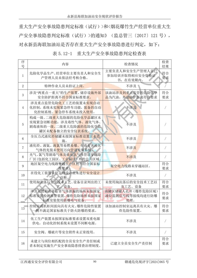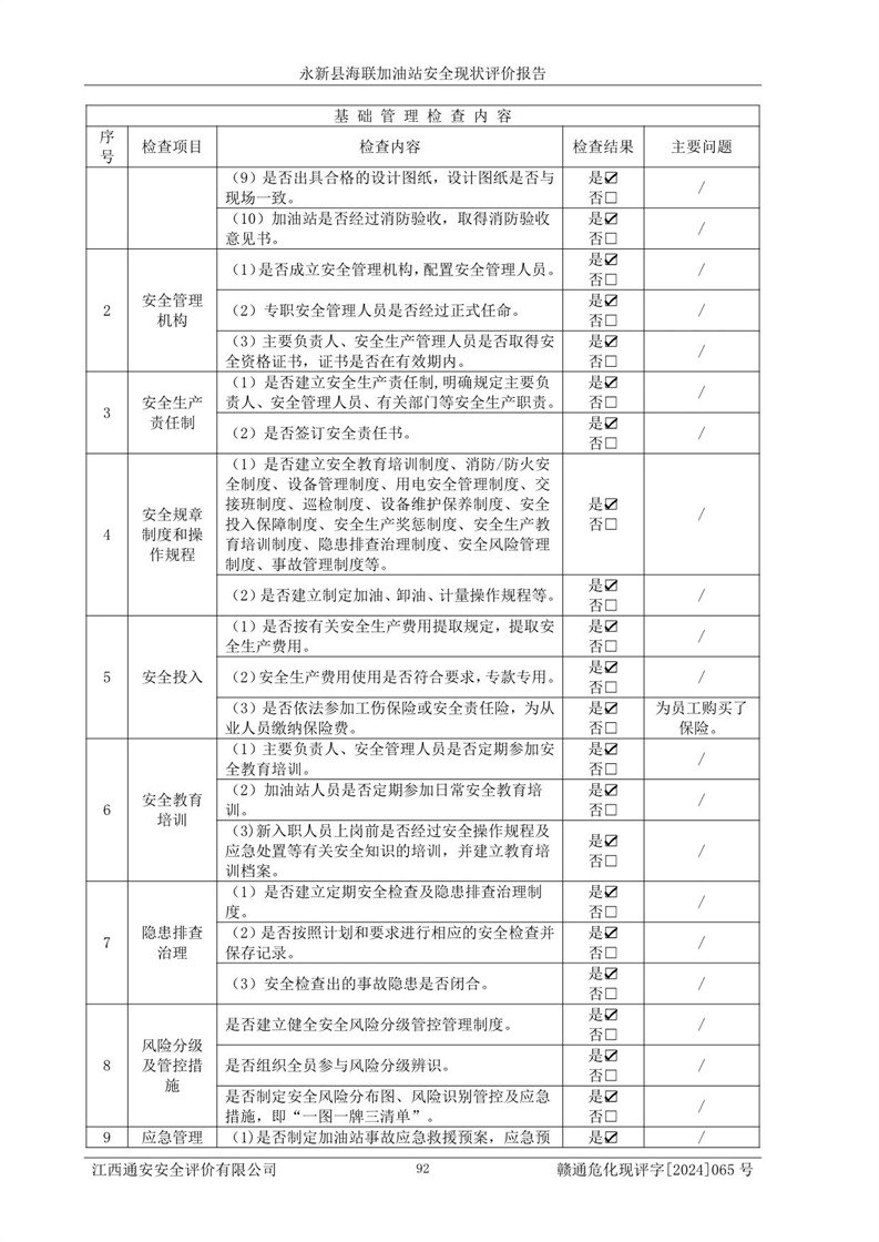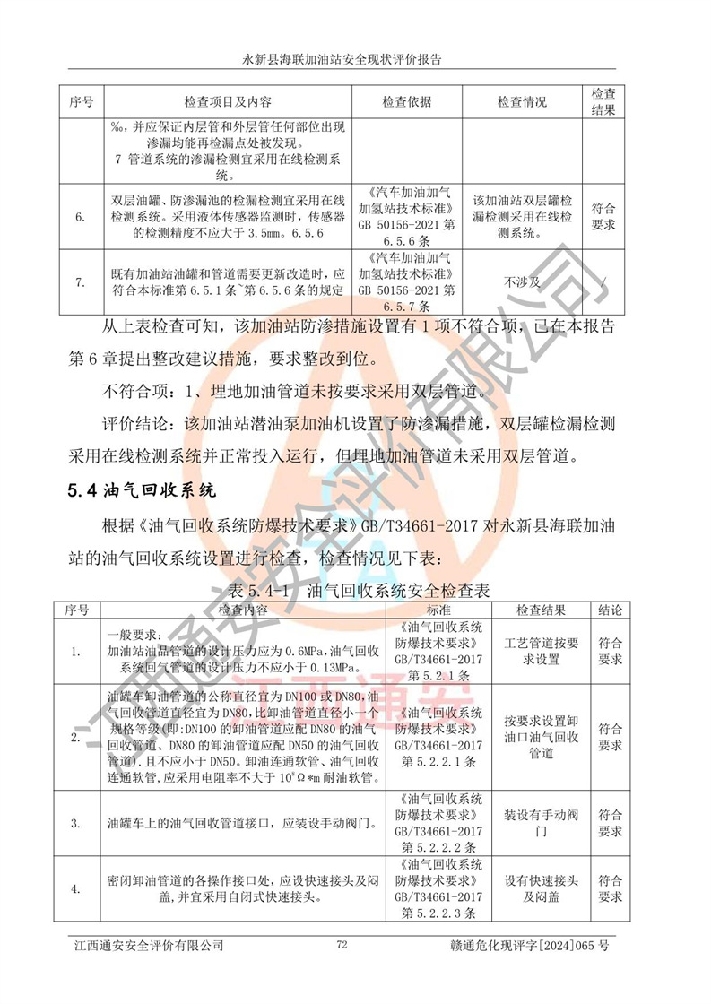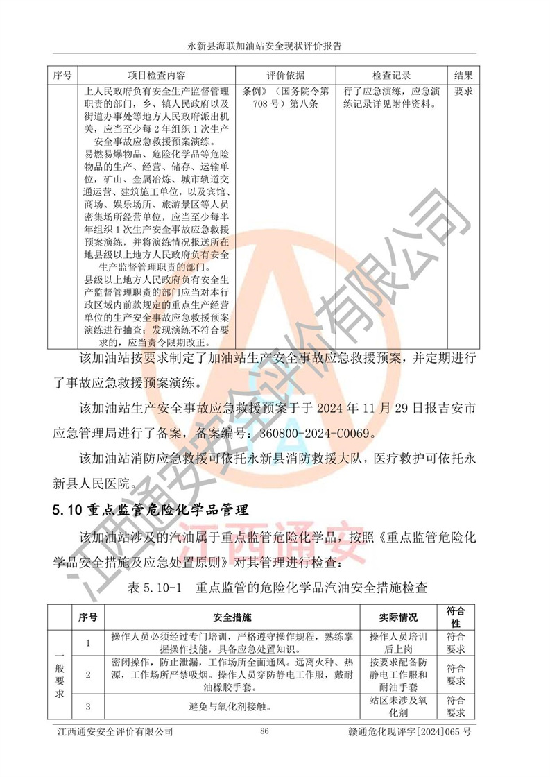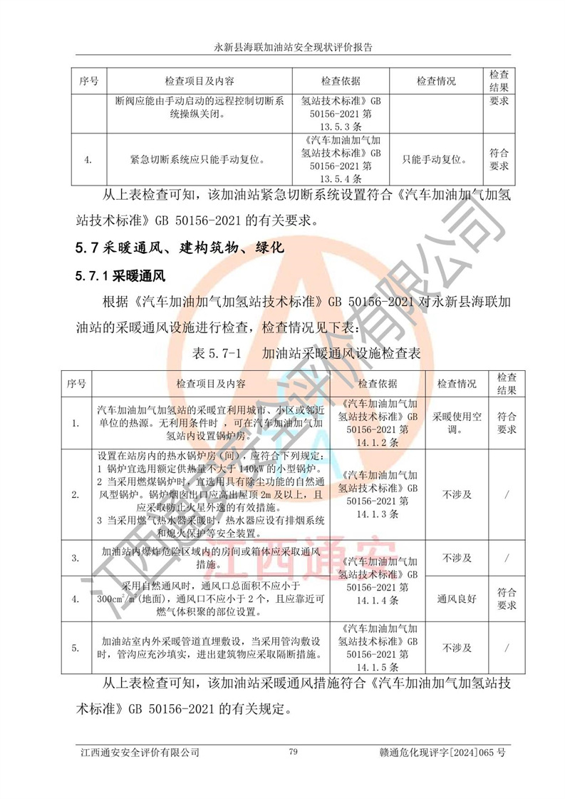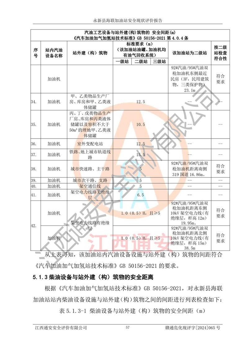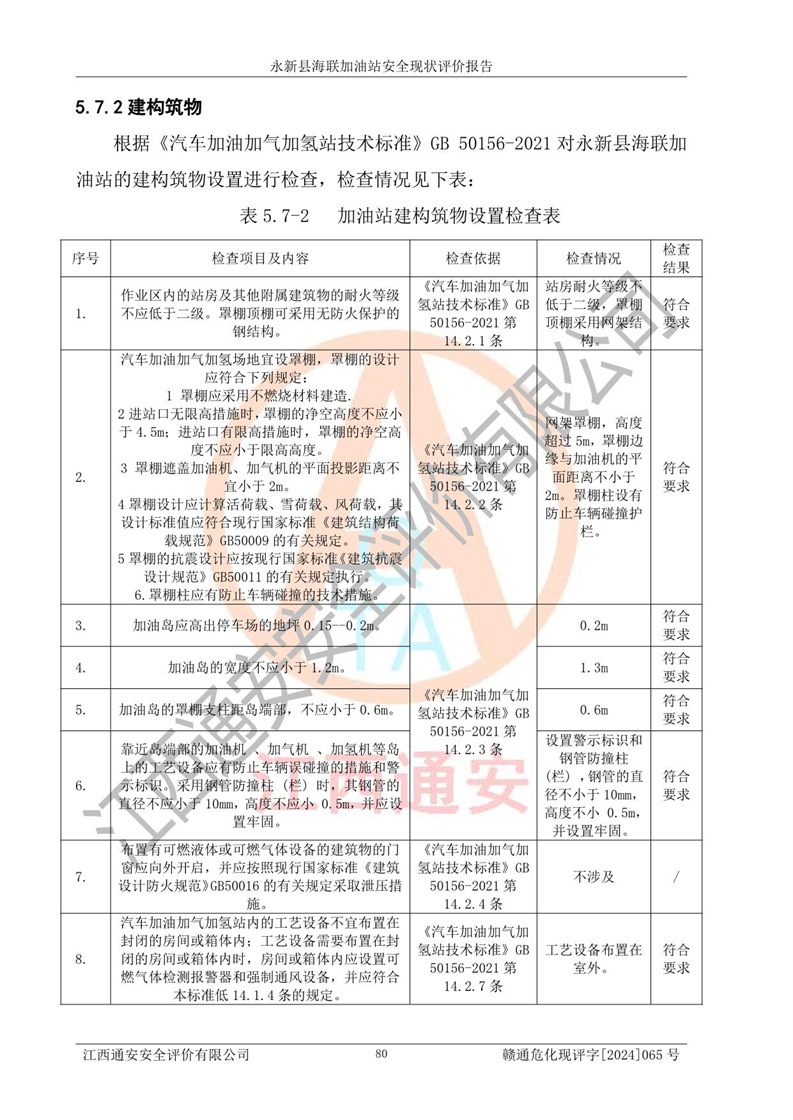 評價結(jié)論 | 永新縣海聯(lián)加油站站址合理,周邊環(huán)境良好,與敏感防護目標間距符合規(guī)范要求,站區(qū)建構(gòu)筑物之間的防火間距、耐火等級符合標準要求,與總平面布置圖一致,加油卸油工藝及設(shè)備設(shè)施合理,工藝布置得當(dāng),防雷設(shè)施經(jīng)檢測合格,采取的工藝安全設(shè)施符合規(guī)范要求;該加油站制定了安全管理制度和操作規(guī)程,人員經(jīng)培訓(xùn)合格后上崗,安全管理人員經(jīng)考核合格并取得安全合格證,能按照法律法規(guī)要求開展安全生產(chǎn)管理工作。 綜上:永新縣海聯(lián)加油站符合《汽車加油加氣加氫站技術(shù)標準》GB50156-2021等標準規(guī)范的要求,安全風(fēng)險可控,滿足危險化學(xué)品經(jīng)營的安全條件。 | |||