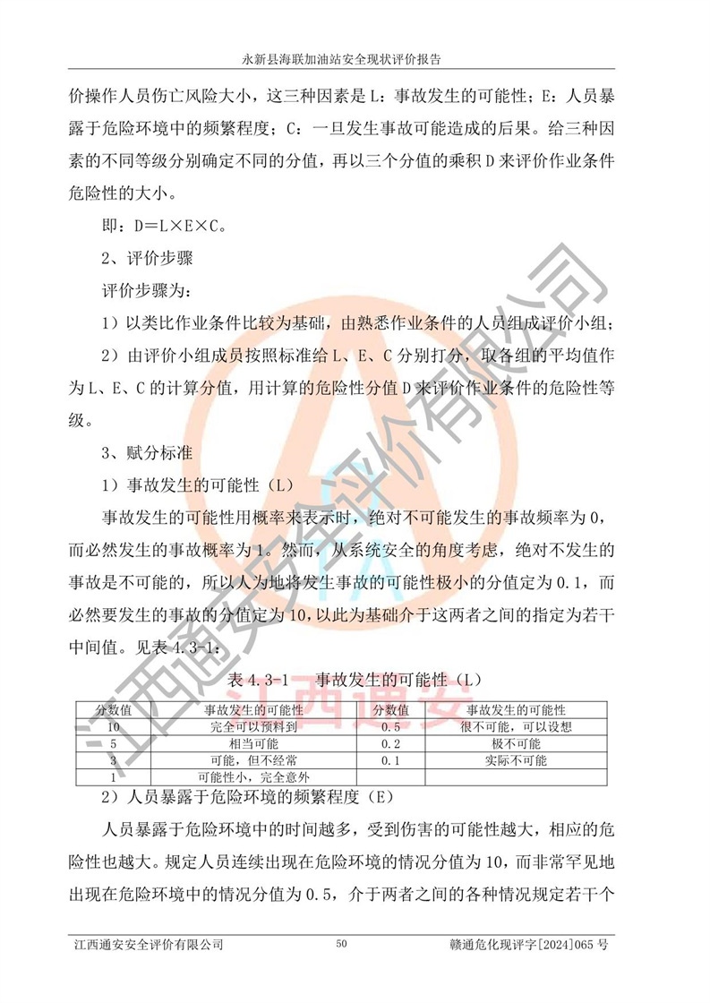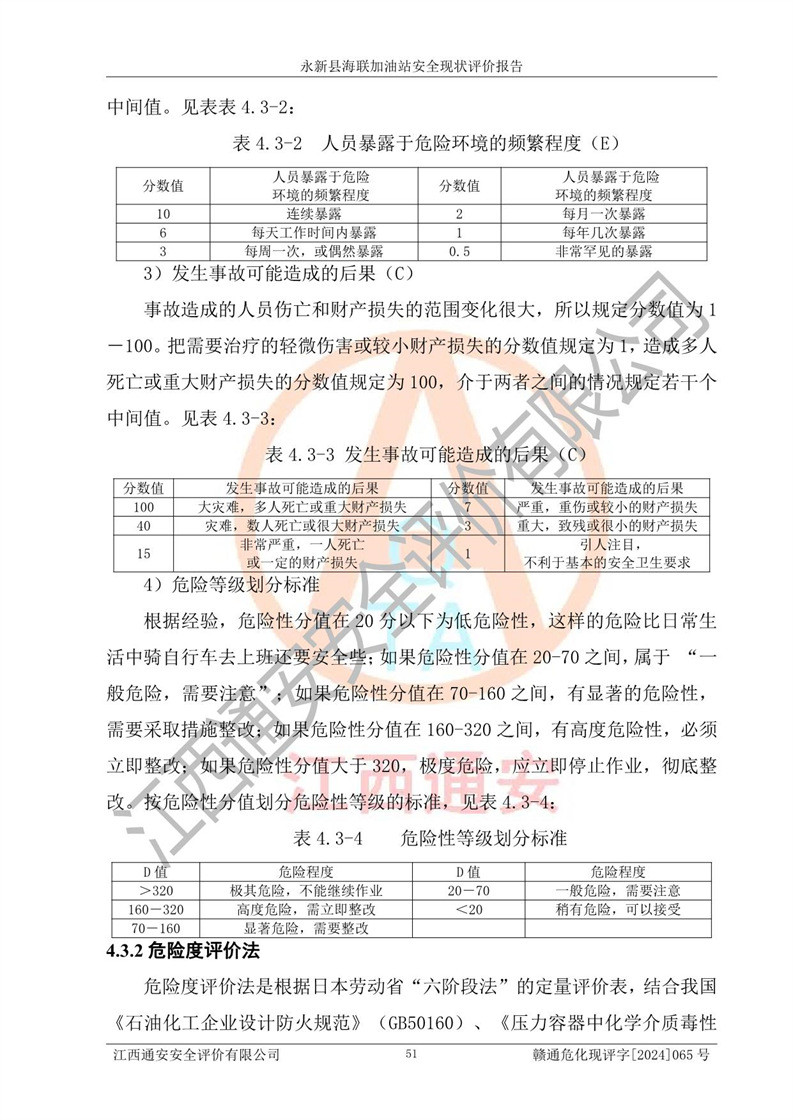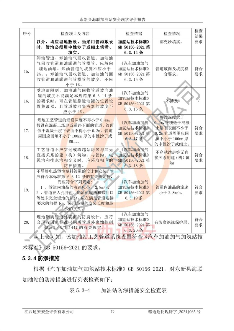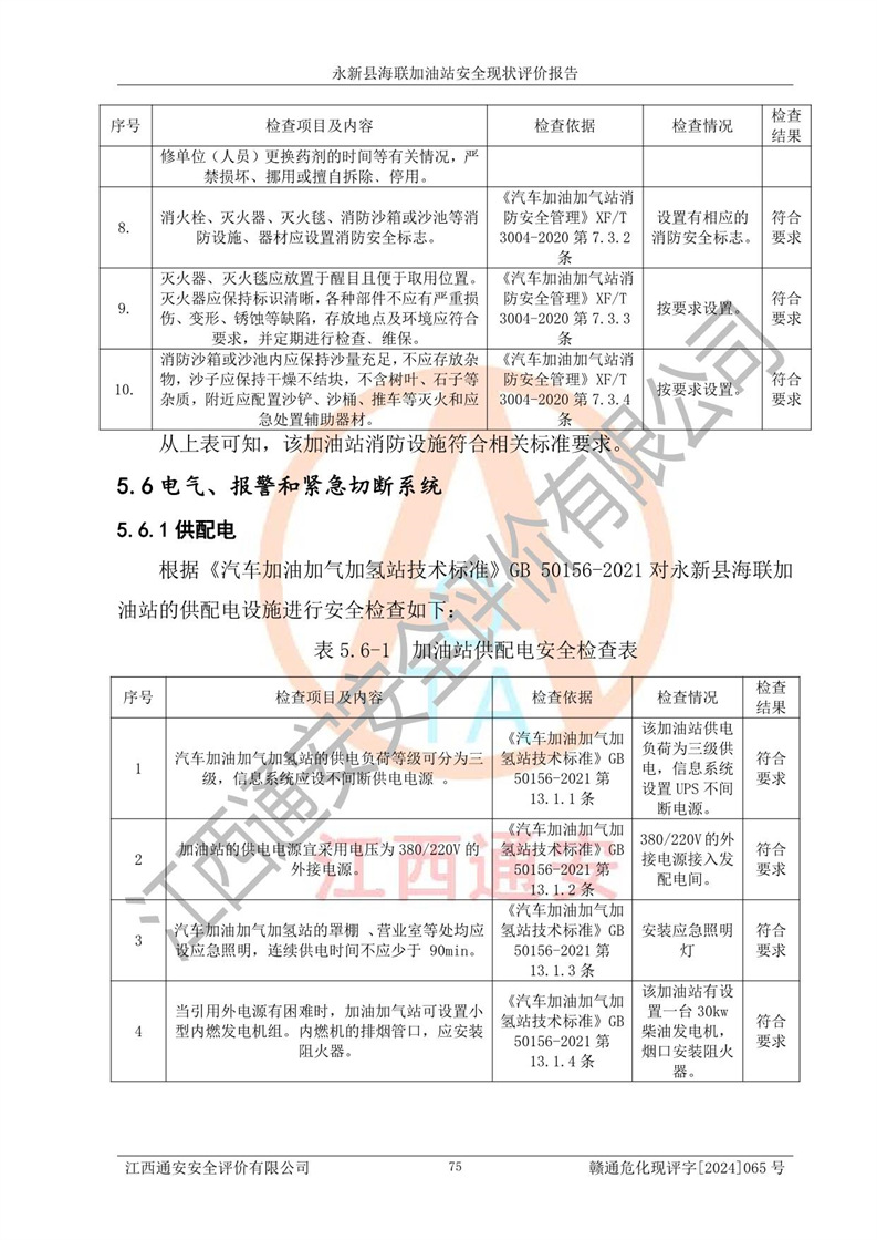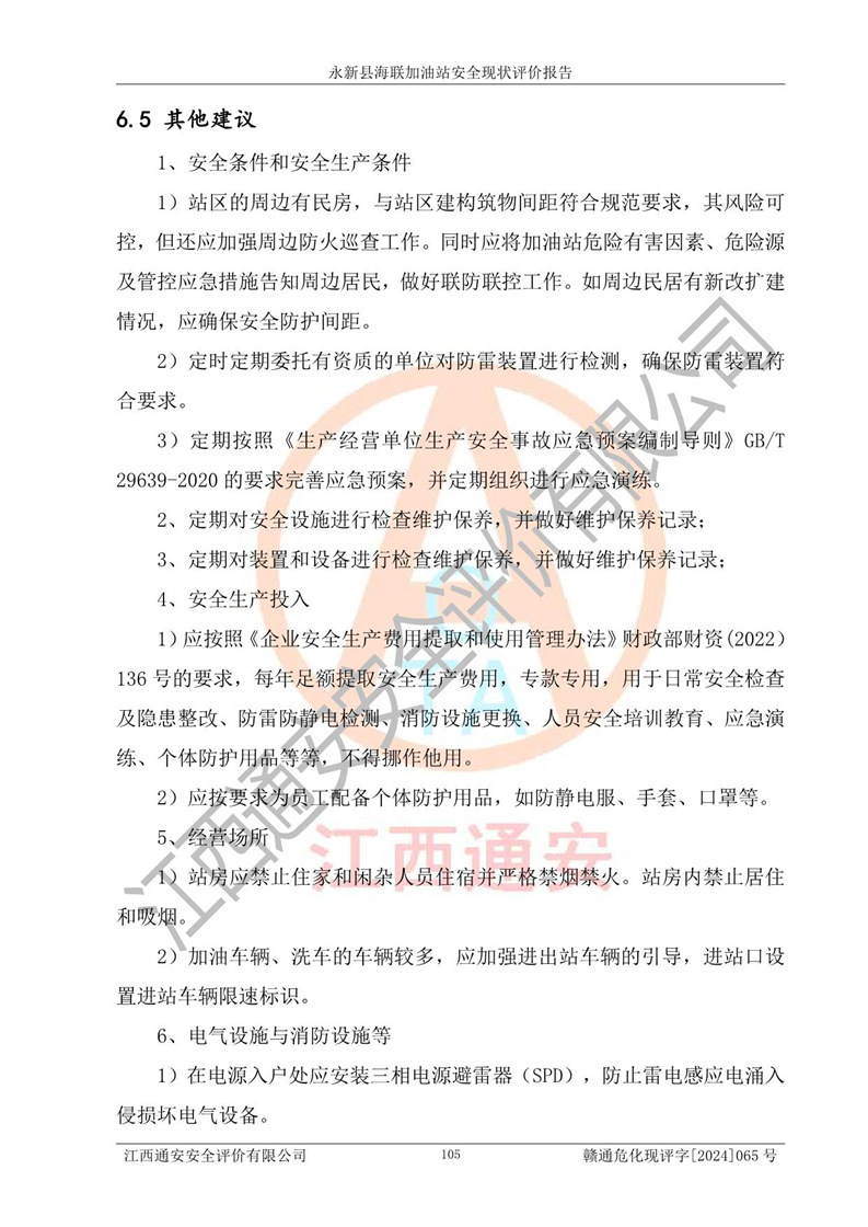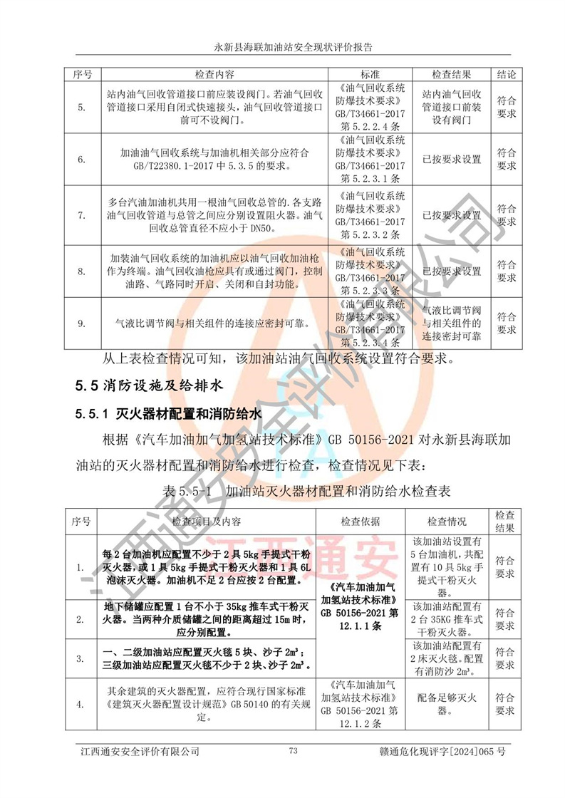 評價結(jié)論 | 永新縣海聯(lián)加油站站址合理,周邊環(huán)境良好,與敏感防護目標間距符合規(guī)范要求,站區(qū)建構(gòu)筑物之間的防火間距、耐火等級符合標準要求,與總平面布置圖一致,加油卸油工藝及設(shè)備設(shè)施合理,工藝布置得當(dāng),防雷設(shè)施經(jīng)檢測合格,采取的工藝安全設(shè)施符合規(guī)范要求;該加油站制定了安全管理制度和操作規(guī)程,人員經(jīng)培訓(xùn)合格后上崗,安全管理人員經(jīng)考核合格并取得安全合格證,能按照法律法規(guī)要求開展安全生產(chǎn)管理工作。 綜上:永新縣海聯(lián)加油站符合《汽車加油加氣加氫站技術(shù)標準》GB50156-2021等標準規(guī)范的要求,安全風(fēng)險可控,滿足危險化學(xué)品經(jīng)營的安全條件。 | |||