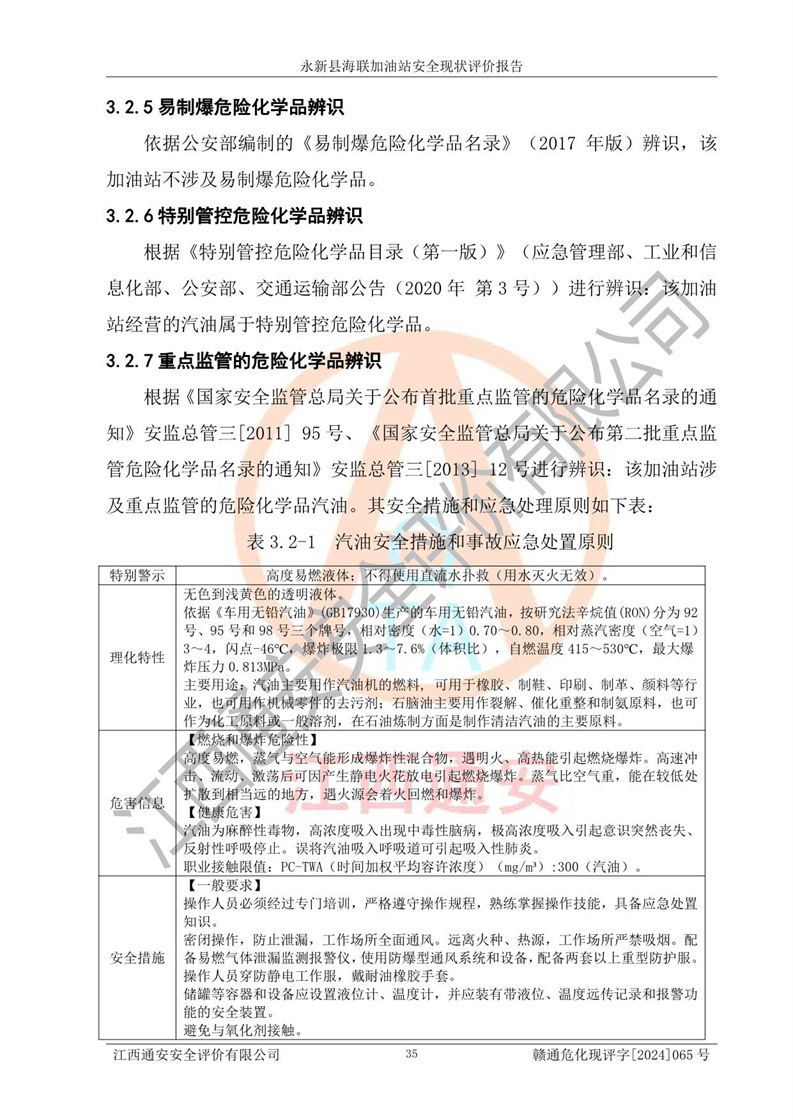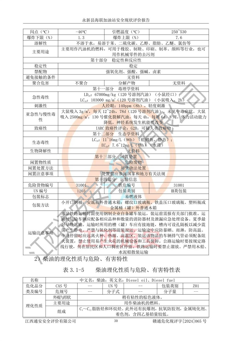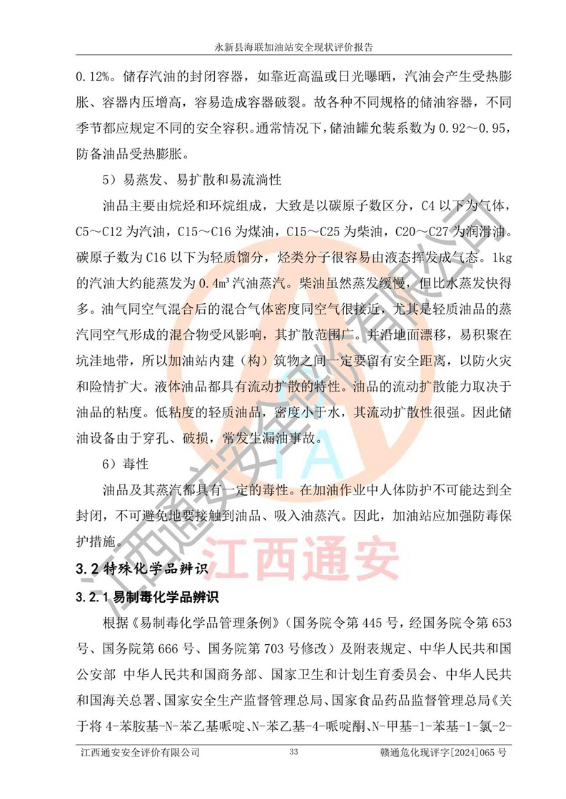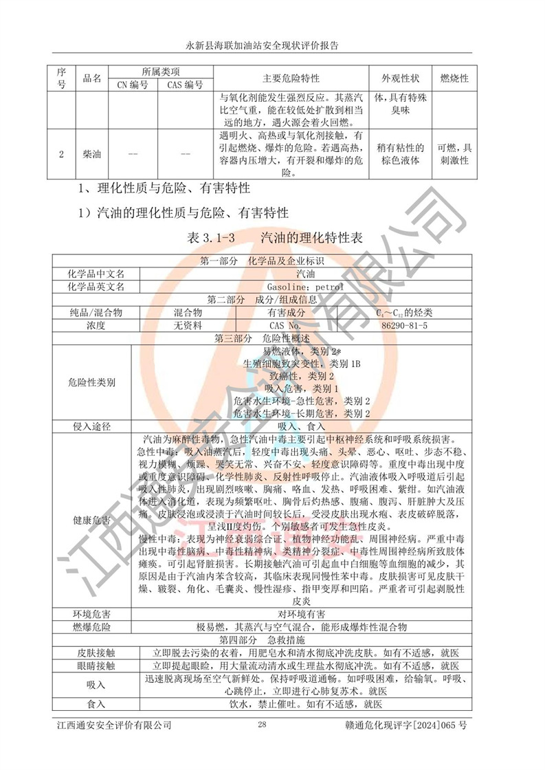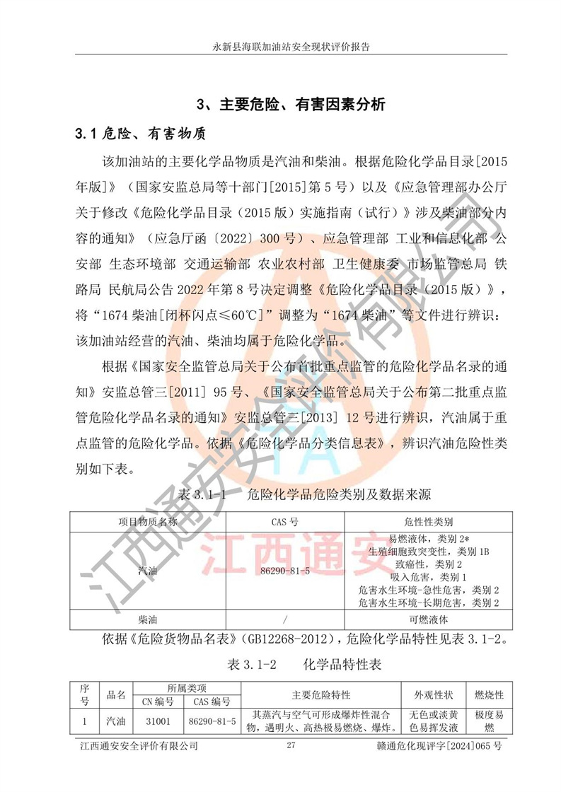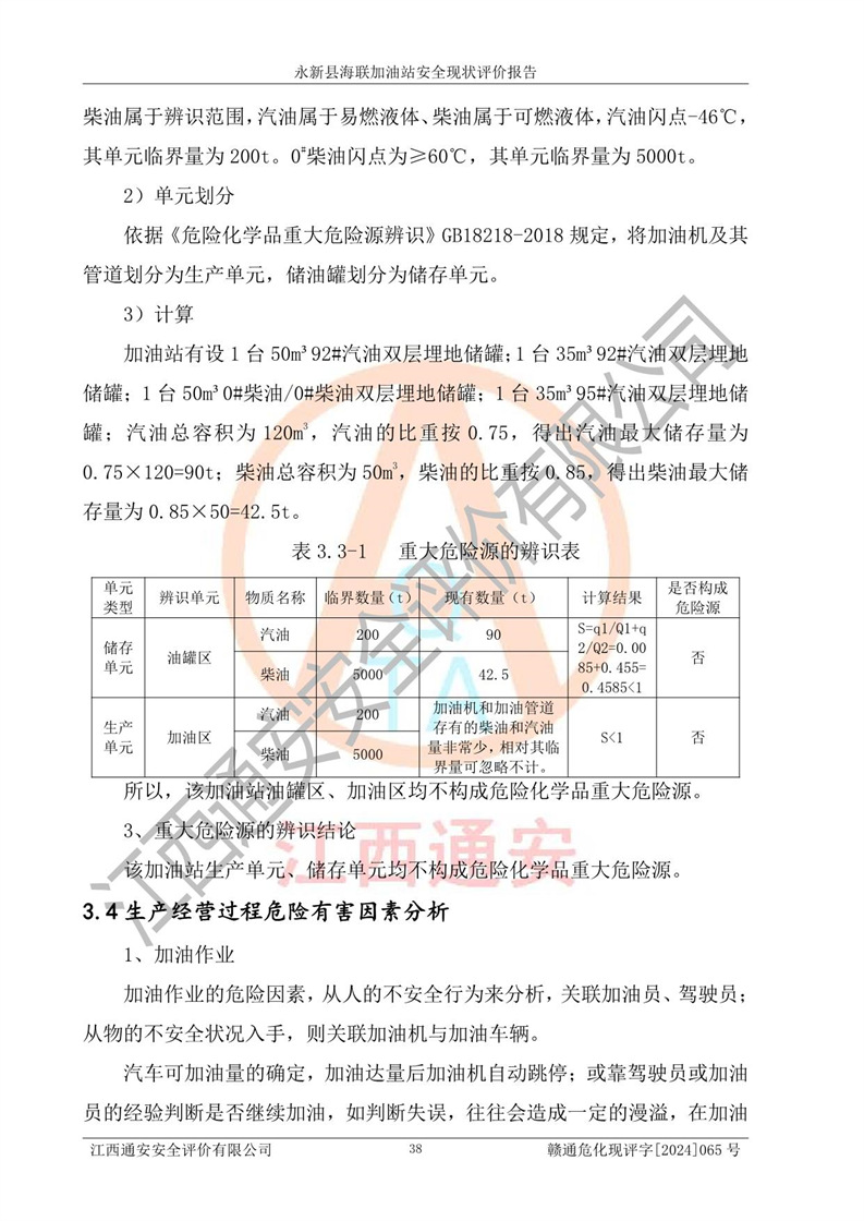 項目簡介 | 永新縣海聯(lián)加油站成立于2009年9月8日,住所位于江西省吉安市永新縣高市鄉(xiāng)蘆溪村319國道旁。該加油站經(jīng)營許可范圍:許可項目:成品油零售(依法須經(jīng)批準的項目,經(jīng)相關(guān)部門批準后方可開展經(jīng)營活動,具體經(jīng)營項目以相關(guān)部門批準文件或許可證件為準)。 永新縣海聯(lián)加油站設(shè)2臺0#柴油/0#柴油雙槍加油機,2臺92#汽油/95#汽油雙槍加油機,1臺92#汽油/92#汽油雙槍加油機;設(shè)置4臺SF雙層埋地儲罐,其中包括:1臺50m392#汽油雙層埋地儲罐;1臺35m392#汽油雙層埋地儲罐;1臺50m30#柴油雙層埋地儲罐;1臺35m395#汽油雙層埋地儲罐;總儲量為170m3,柴油折半后總?cè)莘e為145m3,加油站等級為二級,汽油卸油、加油設(shè)置了油氣回收系統(tǒng)。 該加油站的主要化學(xué)品物質(zhì)是汽油和柴油。根據(jù)危險化學(xué)品目錄[2015年版]》(**安監(jiān)總局等十部門[2015]第5號)以及《應(yīng)急管理部辦公廳關(guān)于修改《危險化學(xué)品目錄(2015版)實施指南(試行)》涉及柴油部分內(nèi)容的通知》(應(yīng)急廳函〔2022〕300號)、應(yīng)急管理部 工業(yè)和信息化部 公安部 生態(tài)環(huán)境部 交通運輸部 農(nóng)業(yè)農(nóng)村部 衛(wèi)生健康委 市場監(jiān)管總局 鐵路局 民航局公告2022年第8號決定調(diào)整《危險化學(xué)品目錄(2015版)》,將“1674柴油[閉杯閃點≤60℃]”調(diào)整為“1674柴油”等文件進行辨識:該加油站經(jīng)營的汽油、柴油均屬于危險化學(xué)品。 | |||