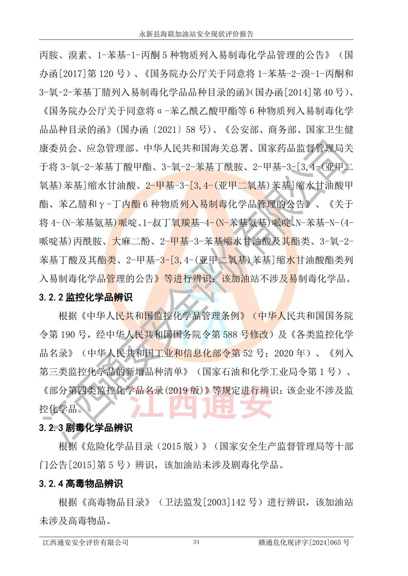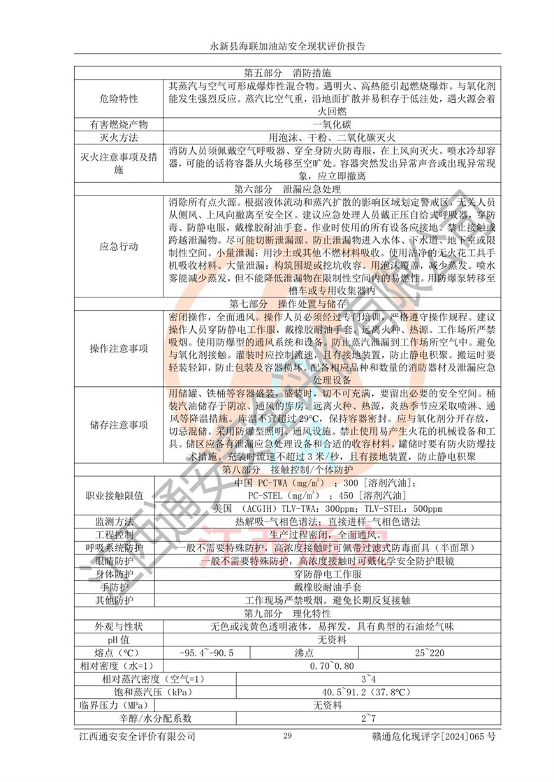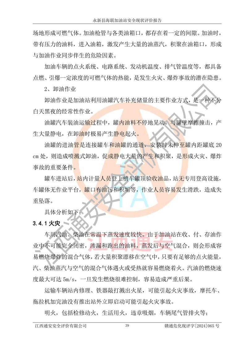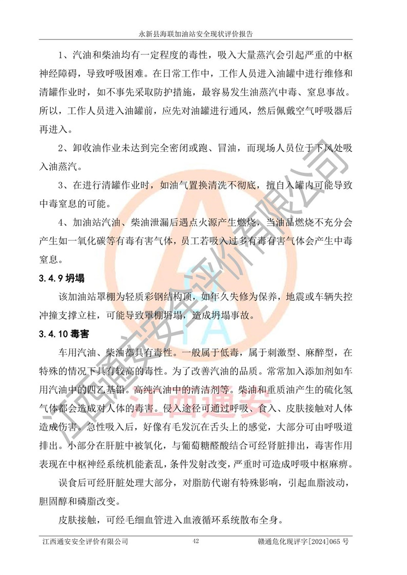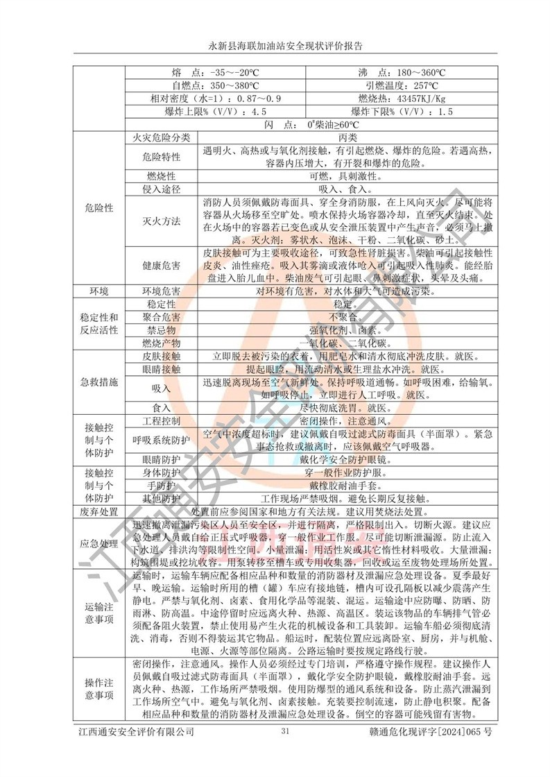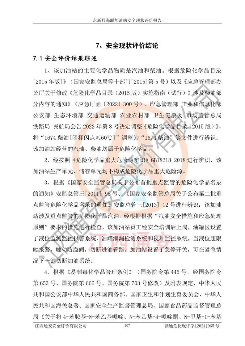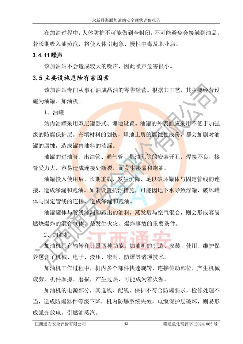 項目簡介 | 永新縣海聯(lián)加油站成立于2009年9月8日,住所位于江西省吉安市永新縣高市鄉(xiāng)蘆溪村319國道旁。該加油站經(jīng)營許可范圍:許可項目:成品油零售(依法須經(jīng)批準的項目,經(jīng)相關(guān)部門批準后方可開展經(jīng)營活動,具體經(jīng)營項目以相關(guān)部門批準文件或許可證件為準)。 永新縣海聯(lián)加油站設(shè)2臺0#柴油/0#柴油雙槍加油機,2臺92#汽油/95#汽油雙槍加油機,1臺92#汽油/92#汽油雙槍加油機;設(shè)置4臺SF雙層埋地儲罐,其中包括:1臺50m392#汽油雙層埋地儲罐;1臺35m392#汽油雙層埋地儲罐;1臺50m30#柴油雙層埋地儲罐;1臺35m395#汽油雙層埋地儲罐;總儲量為170m3,柴油折半后總?cè)莘e為145m3,加油站等級為二級,汽油卸油、加油設(shè)置了油氣回收系統(tǒng)。 該加油站的主要化學(xué)品物質(zhì)是汽油和柴油。根據(jù)危險化學(xué)品目錄[2015年版]》(**安監(jiān)總局等十部門[2015]第5號)以及《應(yīng)急管理部辦公廳關(guān)于修改《危險化學(xué)品目錄(2015版)實施指南(試行)》涉及柴油部分內(nèi)容的通知》(應(yīng)急廳函〔2022〕300號)、應(yīng)急管理部 工業(yè)和信息化部 公安部 生態(tài)環(huán)境部 交通運輸部 農(nóng)業(yè)農(nóng)村部 衛(wèi)生健康委 市場監(jiān)管總局 鐵路局 民航局公告2022年第8號決定調(diào)整《危險化學(xué)品目錄(2015版)》,將“1674柴油[閉杯閃點≤60℃]”調(diào)整為“1674柴油”等文件進行辨識:該加油站經(jīng)營的汽油、柴油均屬于危險化學(xué)品。 | |||