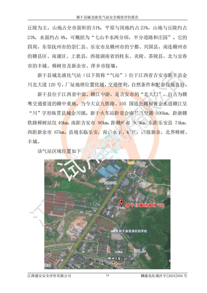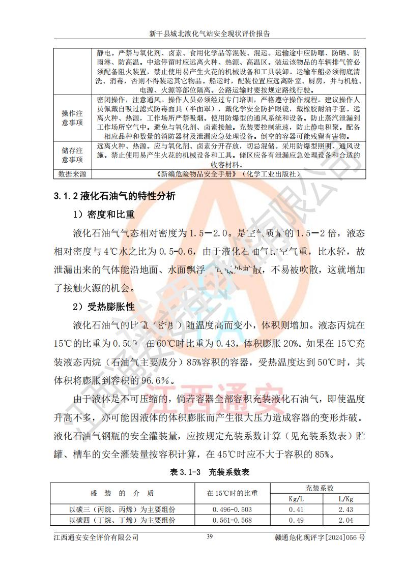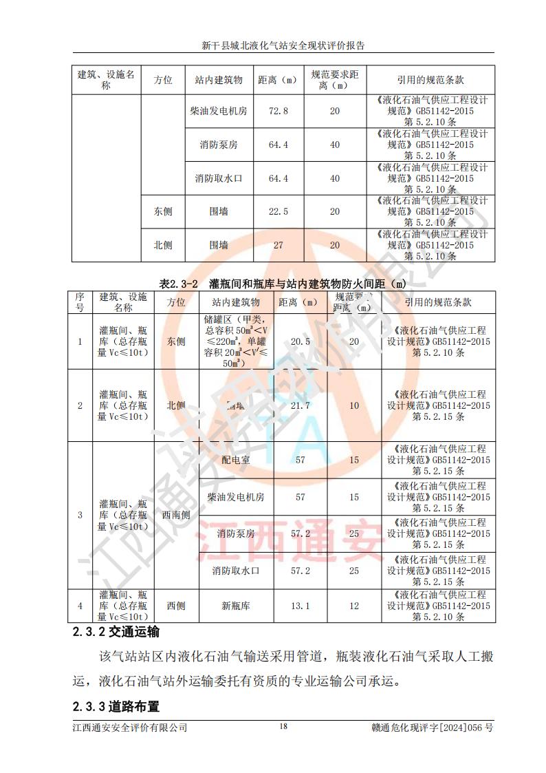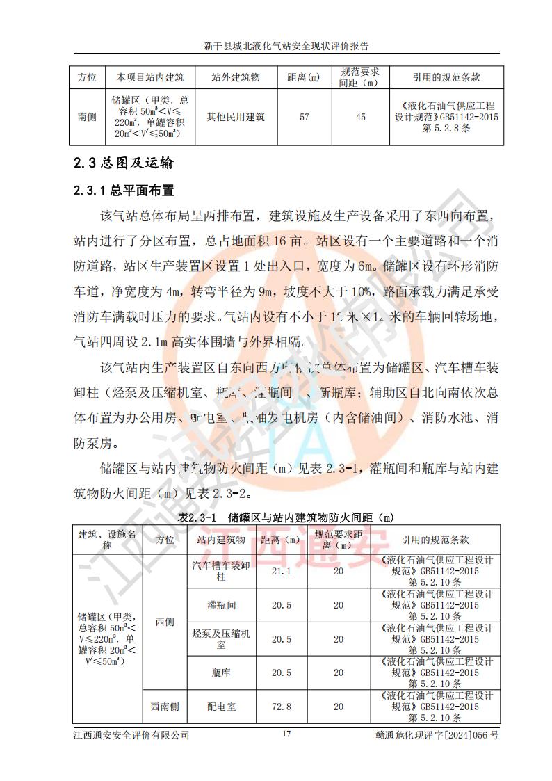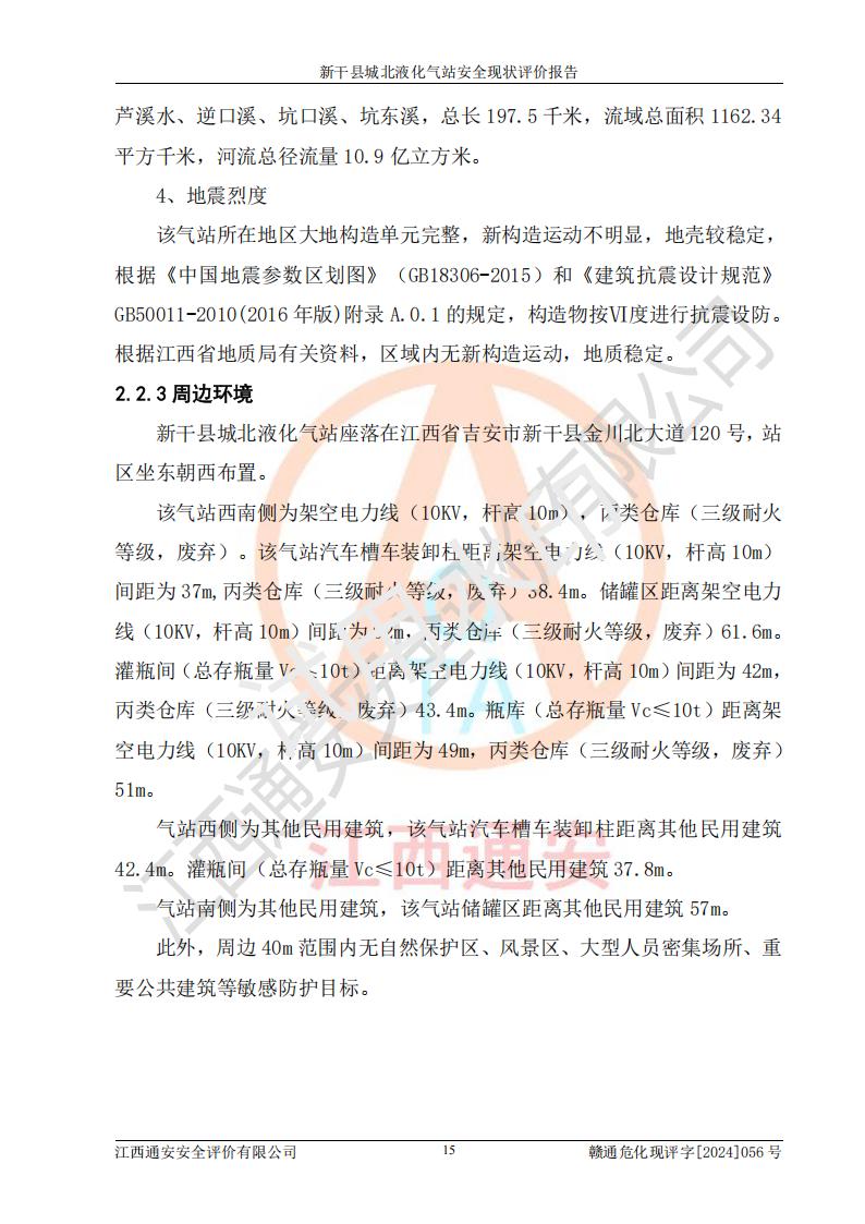 項(xiàng)目簡(jiǎn)介 | 新干縣城北液化氣站(以下簡(jiǎn)稱“氣站”)位于江西省吉安市新干縣金川北大道120號(hào),是一家從事液化石油氣儲(chǔ)存、經(jīng)營的企業(yè),成立于 2002年11月14日,投資人:莫端儉,企業(yè)類型:個(gè)人獨(dú)資企業(yè),經(jīng)營范圍:瓶裝液化石油氣銷售(憑燃?xì)饨?jīng)營許可證**期經(jīng)營)、液化石油氣氣瓶充裝(憑氣瓶充裝許可證**期經(jīng)營)、液化氣鋼瓶、爐具銷售。(依法須經(jīng)批準(zhǔn)的項(xiàng)目,經(jīng)相關(guān)部門批準(zhǔn)后方可開展經(jīng)營活動(dòng))。 該氣站于2021年10月26日換得新干縣住房和城鄉(xiāng)建設(shè)局頒發(fā)的燃?xì)饨?jīng)營許可證,許可證編號(hào):贛201307050005P,**期至2024年10月25日,經(jīng)營類別:瓶裝液化石油氣,主要儲(chǔ)存、充裝、經(jīng)營液化石油氣。2024年8月23日經(jīng)新干縣住房和城鄉(xiāng)建設(shè)局同意,該站完成場(chǎng)站整改后,申請(qǐng)續(xù)證。 該氣站于2023年6月27日換得江西省市場(chǎng)監(jiān)督管理局頒發(fā)的氣瓶充裝許可證,編號(hào):TS4236060-2027,獲準(zhǔn)從事液化石油氣氣瓶充裝,**期至2027年8月25日。 該氣站設(shè)有容積為24m3的地上臥式液化石油氣儲(chǔ)罐2臺(tái)和容積為6.3m3的地上臥式液化石油氣殘液罐1臺(tái)。根據(jù)《液化石油氣供應(yīng)工程設(shè)計(jì)規(guī)范》GB51142-2015對(duì)液化石油氣供應(yīng)站等級(jí)劃分,該站屬于六級(jí)液化石油氣供應(yīng)站。 | ||||