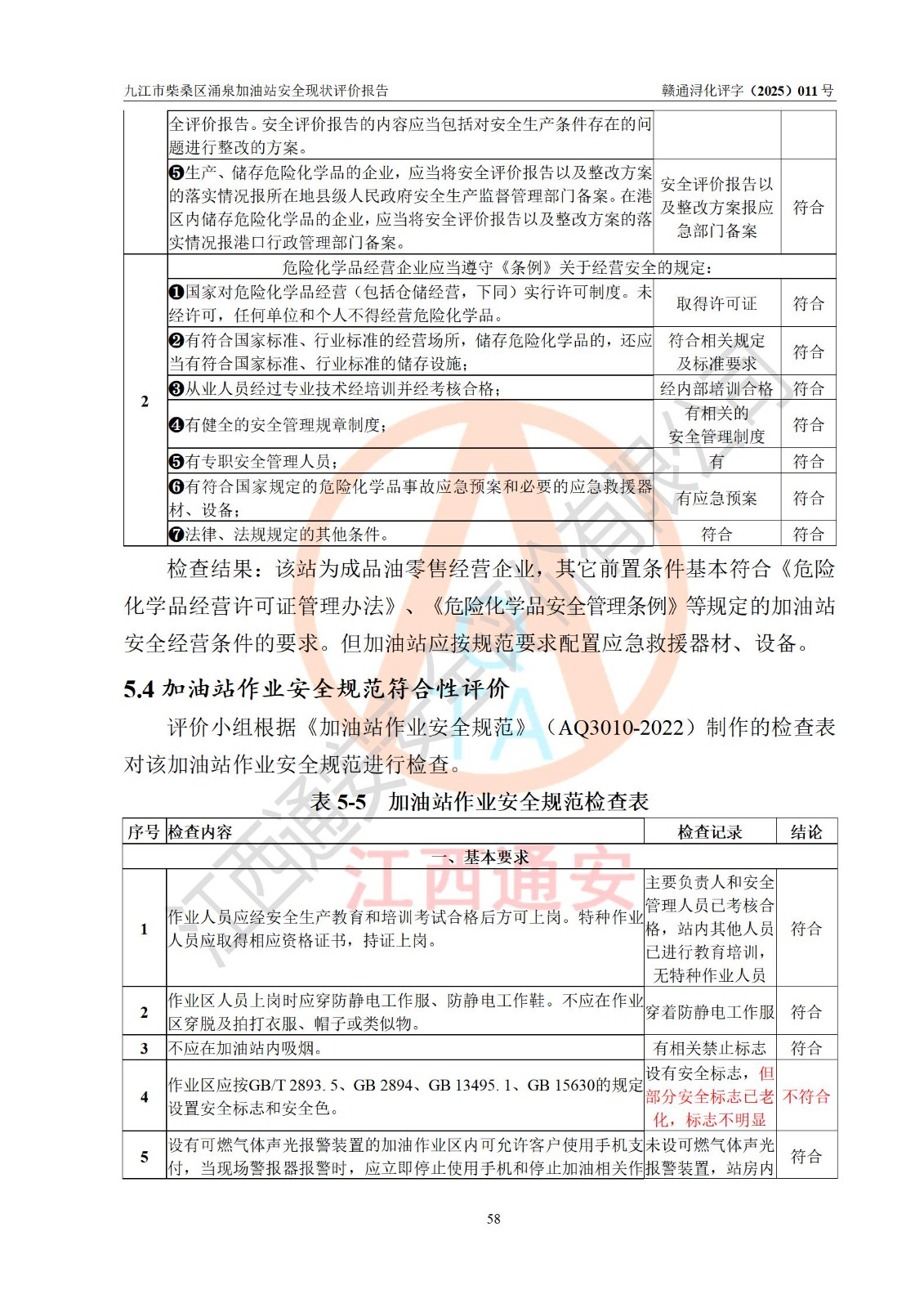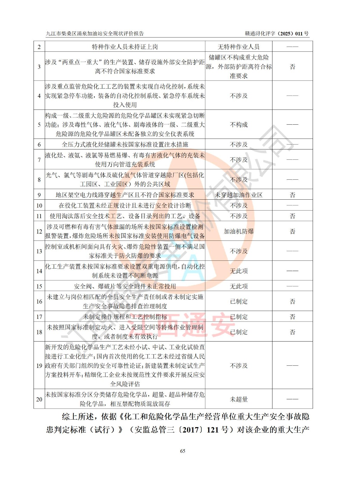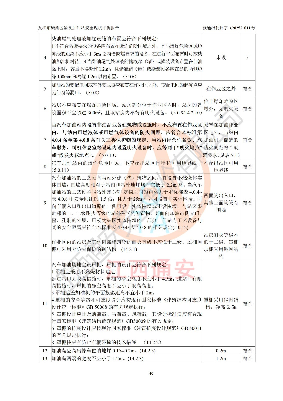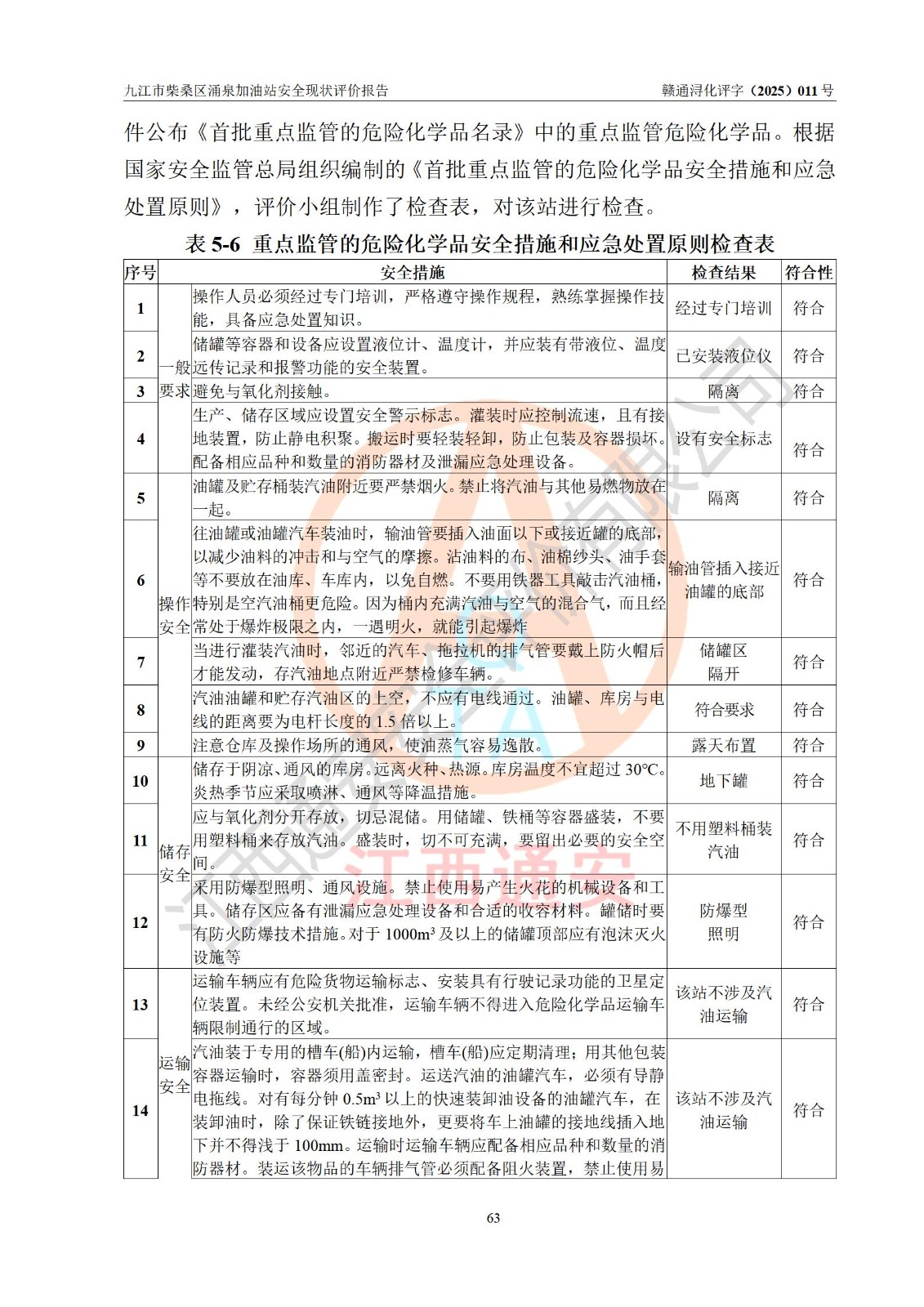 評(píng)價(jià)結(jié)論 | 九江市柴桑區(qū)涌泉加油站涉及的安全條件、安全經(jīng)營(yíng)條件、安全生產(chǎn)管理符合《危險(xiǎn)化學(xué)品經(jīng)營(yíng)許可證管理辦法》、《汽車加油加氣加氫站技術(shù)標(biāo)準(zhǔn)》等**有關(guān)法規(guī)、標(biāo)準(zhǔn)、規(guī)范要求,能滿足危險(xiǎn)化學(xué)品經(jīng)營(yíng)安全條件。 | |||