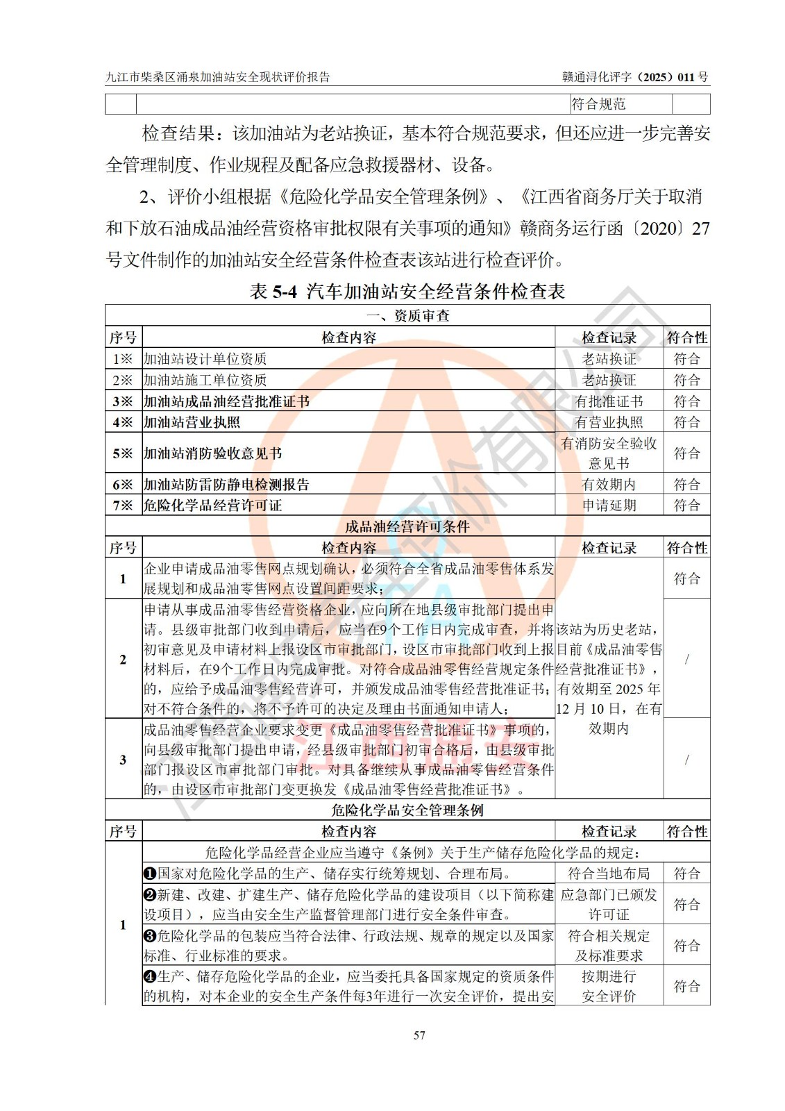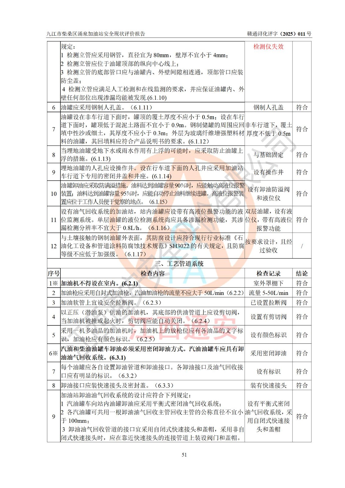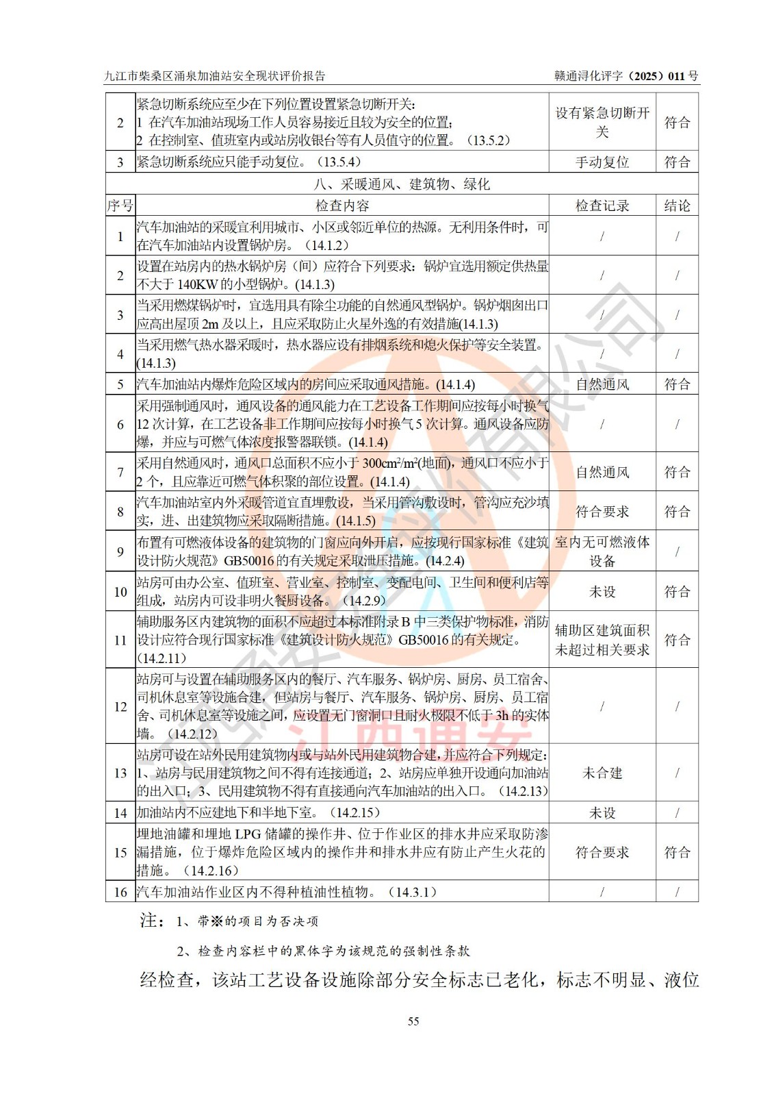 評(píng)價(jià)結(jié)論 | 九江市柴桑區(qū)涌泉加油站涉及的安全條件、安全經(jīng)營(yíng)條件、安全生產(chǎn)管理符合《危險(xiǎn)化學(xué)品經(jīng)營(yíng)許可證管理辦法》、《汽車加油加氣加氫站技術(shù)標(biāo)準(zhǔn)》等**有關(guān)法規(guī)、標(biāo)準(zhǔn)、規(guī)范要求,能滿足危險(xiǎn)化學(xué)品經(jīng)營(yíng)安全條件。 | |||