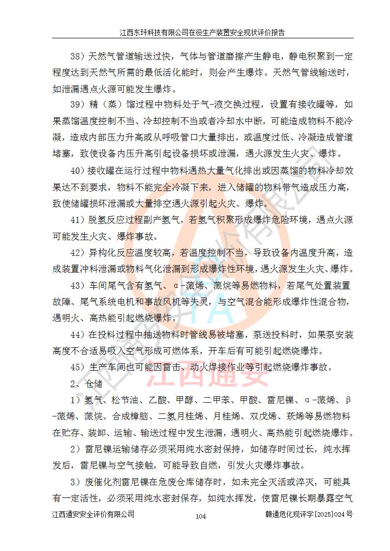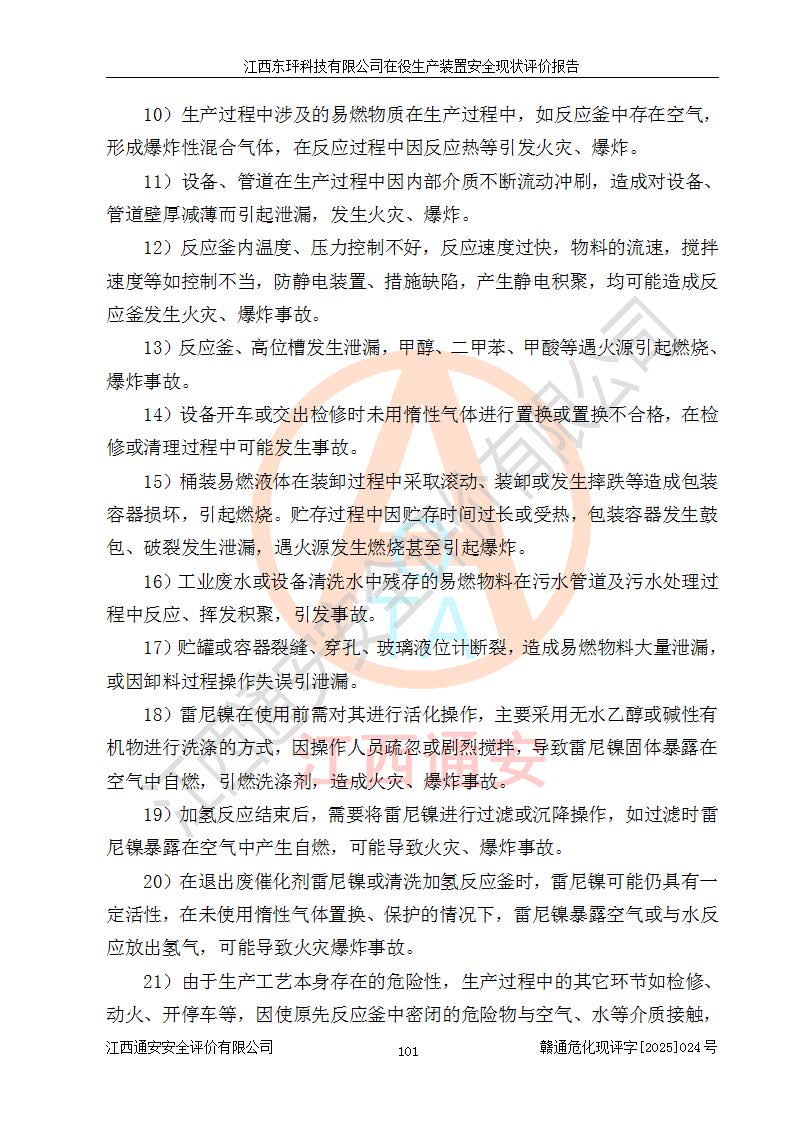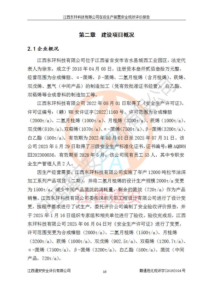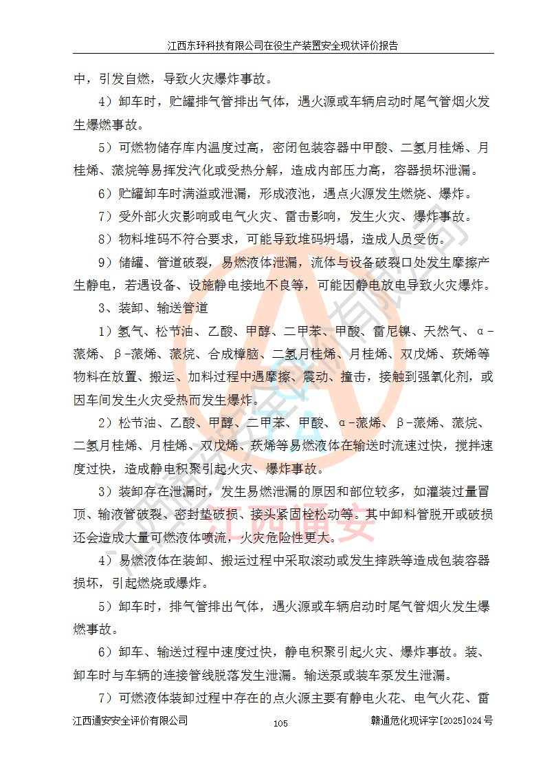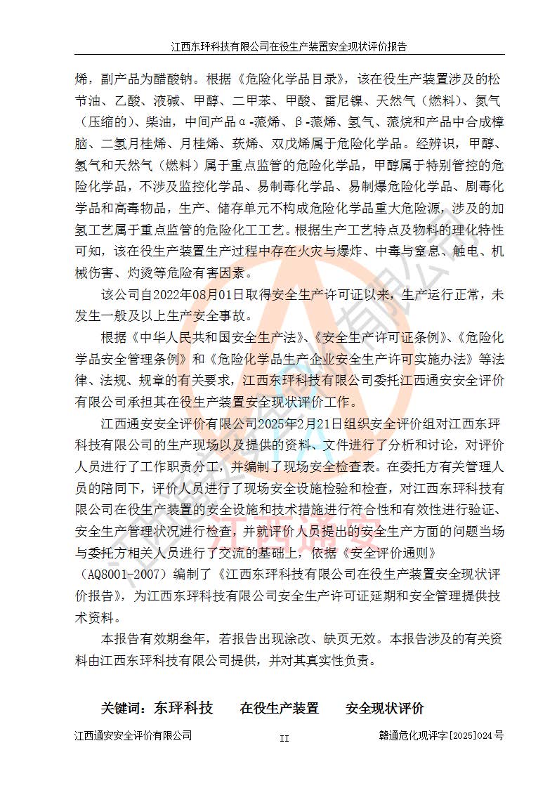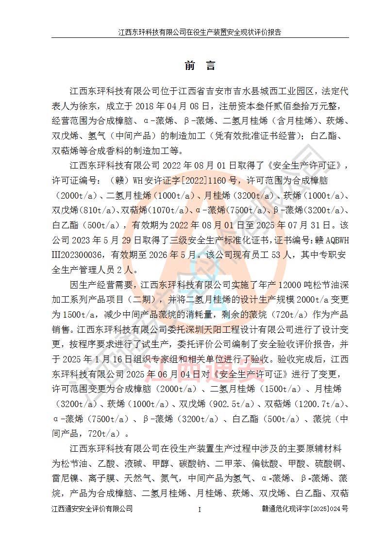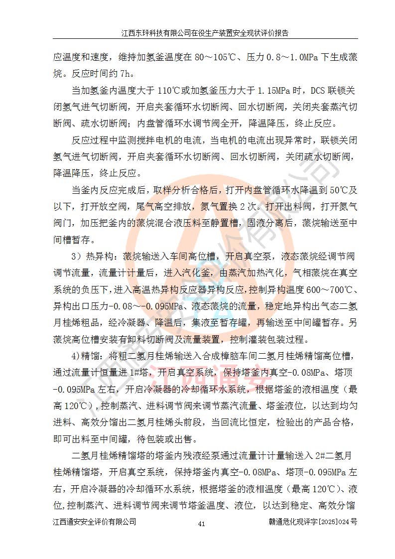 江西東玶科技有限公司位于江西省吉安市吉水縣城西工業(yè)園區(qū),法定**人為徐東,成立于2018年04月08日,注冊(cè)資本叁仟貳佰叁拾萬(wàn)元整,經(jīng)營(yíng)范圍為合成樟腦、α-蒎烯、β-蒎烯、二氫月桂烯(含月桂烯)、莰烯、雙戊烯、氫氣(中間產(chǎn)品)的制造加工(憑**批準(zhǔn)證書(shū)經(jīng)營(yíng));白乙酯、雙萜烯等合成香料的制造加工等。 江西東玶科技有限公司2022年08月01日取得了《安全生產(chǎn)許可證》,許可證編號(hào):(贛)WH安許證字[2022]1160號(hào),許可范圍為合成樟腦(2000t/a)、二氫月桂烯(1000t/a)、月桂烯(3200t/a)、莰烯(1000t/a)、雙戊烯(810t/a)、雙萜烯(1070t/a)、α-蒎烯(7500t/a)、β-蒎烯(3200t/a)、白乙酯(500t/a),**期為2022年08月01日至2025年07月31日。該公司2023年5月29日取得了三級(jí)安全生產(chǎn)標(biāo)準(zhǔn)化證書(shū),證書(shū)編號(hào):贛AQBWHⅢ202300036,**期至2026年5月。該公司現(xiàn)有員工53人,其中專職安全生產(chǎn)管理人員2人。 因生產(chǎn)經(jīng)營(yíng)需要,江西東玶科技有限公司實(shí)施了年產(chǎn)12000噸松節(jié)油深加工系列產(chǎn)品項(xiàng)目(二期),并將二氫月桂烯的設(shè)計(jì)生產(chǎn)規(guī)模2000t/a變更為1500t/a,減少中間產(chǎn)品蒎烷的消耗量,剩余的蒎烷(720t/a)作為產(chǎn)品銷售。江西東玶科技有限公司委托深圳天陽(yáng)工程設(shè)計(jì)有限公司進(jìn)行了設(shè)計(jì)變更,按程序要求進(jìn)行了試生產(chǎn),委托評(píng)價(jià)公司編制了安全驗(yàn)收評(píng)價(jià)報(bào)告,并于2025年1月16日組織專家組和相關(guān)單位進(jìn)行了驗(yàn)收。驗(yàn)收完成后,江西東玶科技有限公司2025年06月04日對(duì)《安全生產(chǎn)許可證》進(jìn)行了變更,許可范圍變更為合成樟腦(2000t/a)、二氫月桂烯(1500t/a)、月桂烯(3200t/a)、莰烯(1000t/a)、雙戊烯(902.5t/a)、雙萜烯(1200.7t/a)、α-蒎烯(7500t/a)、β-蒎烯(3200t/a)、白乙酯(500t/a)、蒎烷(中間產(chǎn)品,720t/a)。 江西東玶科技有限公司在役生產(chǎn)裝置生產(chǎn)過(guò)程中涉及的主要原輔材料為松節(jié)油、乙酸、液堿、甲醇、碳酸鈉、二甲苯、偏鈦酸、甲酸、硫酸銅、雷尼鎳、離子膜、天然氣、氮?dú)?,中間產(chǎn)品為氫氣、α-蒎烯、β-蒎烯、蒎烷,產(chǎn)品為合成樟腦、二氫月桂烯、月桂烯、莰烯、雙戊烯、白乙酯、雙萜烯,副產(chǎn)品為醋酸鈉。根據(jù)《危險(xiǎn)化學(xué)品目錄》,該在役生產(chǎn)裝置涉及的松節(jié)油、乙酸、液堿、甲醇、二甲苯、甲酸、雷尼鎳、天然氣(燃料)、氮?dú)猓▔嚎s的)、柴油,中間產(chǎn)品α-蒎烯、β-蒎烯、氫氣、蒎烷和產(chǎn)品中合成樟腦、二氫月桂烯、月桂烯、莰烯、雙戊烯屬于危險(xiǎn)化學(xué)品。經(jīng)辨識(shí),甲醇、氫氣和天然氣(燃料)屬于重點(diǎn)監(jiān)管的危險(xiǎn)化學(xué)品,甲醇屬于特別管控的危險(xiǎn)化學(xué)品,不涉及監(jiān)控化學(xué)品、易制毒化學(xué)品、易制爆危險(xiǎn)化學(xué)品、劇毒化學(xué)品和高毒物品,生產(chǎn)、儲(chǔ)存單元不構(gòu)成危險(xiǎn)化學(xué)品重大危險(xiǎn)源,涉及的加氫工藝屬于重點(diǎn)監(jiān)管的危險(xiǎn)化工工藝。根據(jù)生產(chǎn)工藝特點(diǎn)及物料的理化特性可知,該在役生產(chǎn)裝置生產(chǎn)過(guò)程中存在火災(zāi)與爆炸、中毒與窒息、觸電、機(jī)械傷害、灼燙等危險(xiǎn)有害因素。 該公司自2022年08月01日取得安全生產(chǎn)許可證以來(lái),生產(chǎn)運(yùn)行正常,未發(fā)生一般及以上生產(chǎn)安全事故。 |