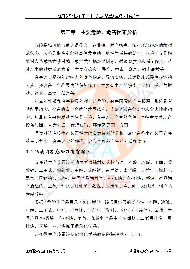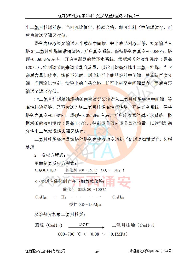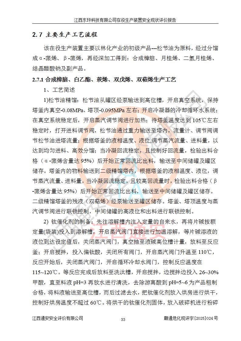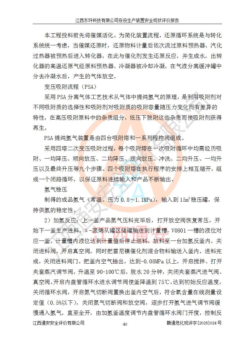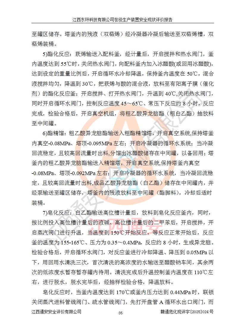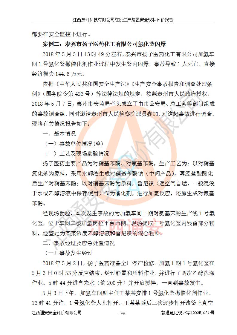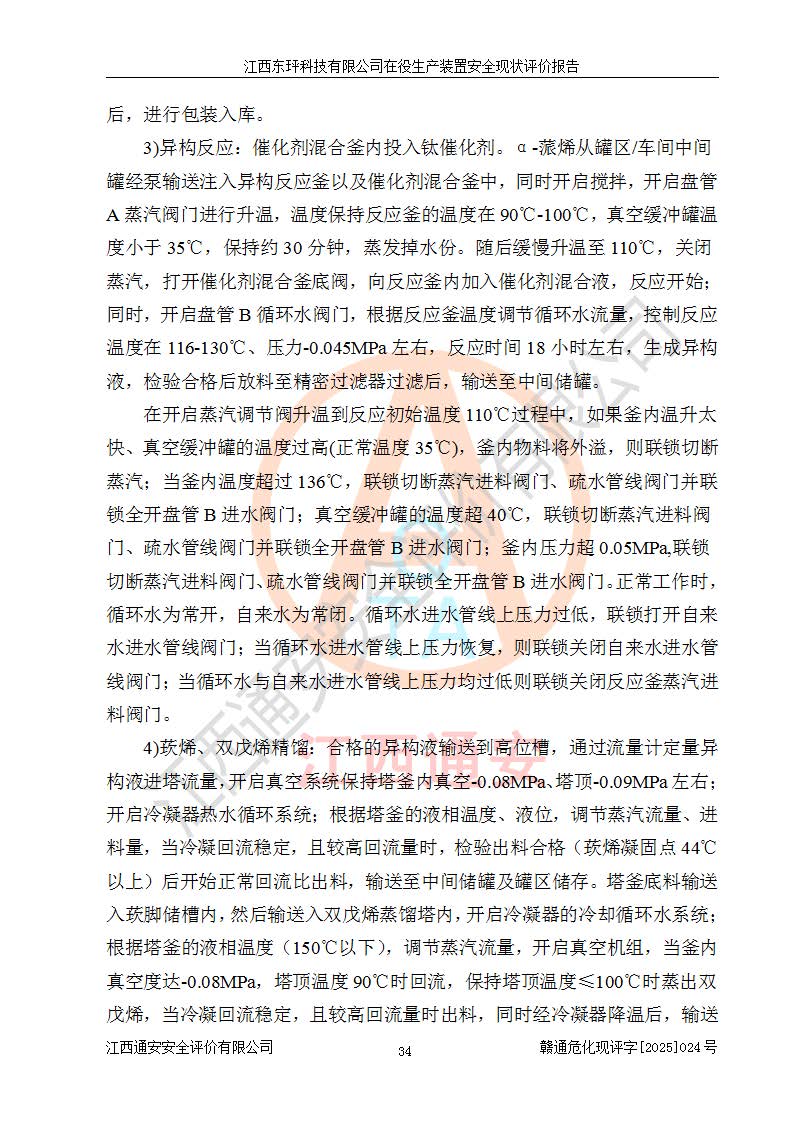 江西東玶科技有限公司位于江西省吉安市吉水縣城西工業(yè)園區(qū),法定**人為徐東,成立于2018年04月08日,注冊(cè)資本叁仟貳佰叁拾萬(wàn)元整,經(jīng)營(yíng)范圍為合成樟腦、α-蒎烯、β-蒎烯、二氫月桂烯(含月桂烯)、莰烯、雙戊烯、氫氣(中間產(chǎn)品)的制造加工(憑**批準(zhǔn)證書(shū)經(jīng)營(yíng));白乙酯、雙萜烯等合成香料的制造加工等。 江西東玶科技有限公司2022年08月01日取得了《安全生產(chǎn)許可證》,許可證編號(hào):(贛)WH安許證字[2022]1160號(hào),許可范圍為合成樟腦(2000t/a)、二氫月桂烯(1000t/a)、月桂烯(3200t/a)、莰烯(1000t/a)、雙戊烯(810t/a)、雙萜烯(1070t/a)、α-蒎烯(7500t/a)、β-蒎烯(3200t/a)、白乙酯(500t/a),**期為2022年08月01日至2025年07月31日。該公司2023年5月29日取得了三級(jí)安全生產(chǎn)標(biāo)準(zhǔn)化證書(shū),證書(shū)編號(hào):贛AQBWHⅢ202300036,**期至2026年5月。該公司現(xiàn)有員工53人,其中專職安全生產(chǎn)管理人員2人。 因生產(chǎn)經(jīng)營(yíng)需要,江西東玶科技有限公司實(shí)施了年產(chǎn)12000噸松節(jié)油深加工系列產(chǎn)品項(xiàng)目(二期),并將二氫月桂烯的設(shè)計(jì)生產(chǎn)規(guī)模2000t/a變更為1500t/a,減少中間產(chǎn)品蒎烷的消耗量,剩余的蒎烷(720t/a)作為產(chǎn)品銷售。江西東玶科技有限公司委托深圳天陽(yáng)工程設(shè)計(jì)有限公司進(jìn)行了設(shè)計(jì)變更,按程序要求進(jìn)行了試生產(chǎn),委托評(píng)價(jià)公司編制了安全驗(yàn)收評(píng)價(jià)報(bào)告,并于2025年1月16日組織專家組和相關(guān)單位進(jìn)行了驗(yàn)收。驗(yàn)收完成后,江西東玶科技有限公司2025年06月04日對(duì)《安全生產(chǎn)許可證》進(jìn)行了變更,許可范圍變更為合成樟腦(2000t/a)、二氫月桂烯(1500t/a)、月桂烯(3200t/a)、莰烯(1000t/a)、雙戊烯(902.5t/a)、雙萜烯(1200.7t/a)、α-蒎烯(7500t/a)、β-蒎烯(3200t/a)、白乙酯(500t/a)、蒎烷(中間產(chǎn)品,720t/a)。 江西東玶科技有限公司在役生產(chǎn)裝置生產(chǎn)過(guò)程中涉及的主要原輔材料為松節(jié)油、乙酸、液堿、甲醇、碳酸鈉、二甲苯、偏鈦酸、甲酸、硫酸銅、雷尼鎳、離子膜、天然氣、氮?dú)?,中間產(chǎn)品為氫氣、α-蒎烯、β-蒎烯、蒎烷,產(chǎn)品為合成樟腦、二氫月桂烯、月桂烯、莰烯、雙戊烯、白乙酯、雙萜烯,副產(chǎn)品為醋酸鈉。根據(jù)《危險(xiǎn)化學(xué)品目錄》,該在役生產(chǎn)裝置涉及的松節(jié)油、乙酸、液堿、甲醇、二甲苯、甲酸、雷尼鎳、天然氣(燃料)、氮?dú)猓▔嚎s的)、柴油,中間產(chǎn)品α-蒎烯、β-蒎烯、氫氣、蒎烷和產(chǎn)品中合成樟腦、二氫月桂烯、月桂烯、莰烯、雙戊烯屬于危險(xiǎn)化學(xué)品。經(jīng)辨識(shí),甲醇、氫氣和天然氣(燃料)屬于重點(diǎn)監(jiān)管的危險(xiǎn)化學(xué)品,甲醇屬于特別管控的危險(xiǎn)化學(xué)品,不涉及監(jiān)控化學(xué)品、易制毒化學(xué)品、易制爆危險(xiǎn)化學(xué)品、劇毒化學(xué)品和高毒物品,生產(chǎn)、儲(chǔ)存單元不構(gòu)成危險(xiǎn)化學(xué)品重大危險(xiǎn)源,涉及的加氫工藝屬于重點(diǎn)監(jiān)管的危險(xiǎn)化工工藝。根據(jù)生產(chǎn)工藝特點(diǎn)及物料的理化特性可知,該在役生產(chǎn)裝置生產(chǎn)過(guò)程中存在火災(zāi)與爆炸、中毒與窒息、觸電、機(jī)械傷害、灼燙等危險(xiǎn)有害因素。 該公司自2022年08月01日取得安全生產(chǎn)許可證以來(lái),生產(chǎn)運(yùn)行正常,未發(fā)生一般及以上生產(chǎn)安全事故。 |