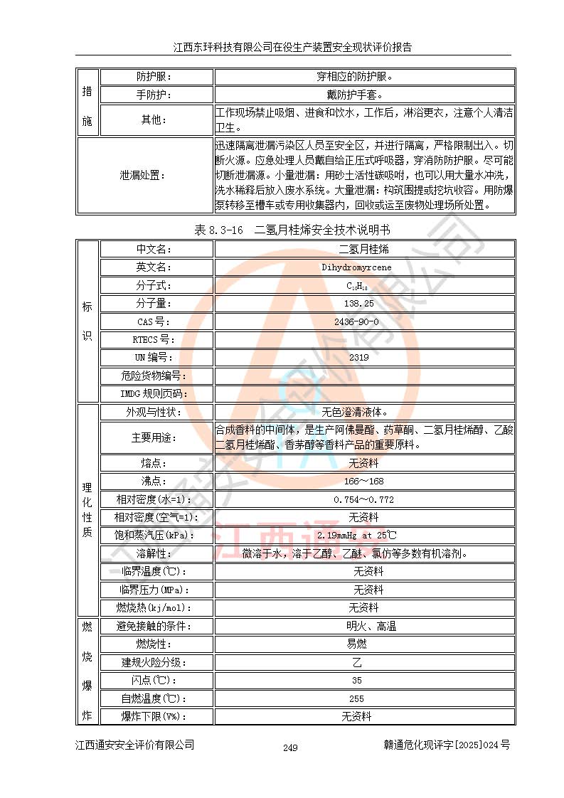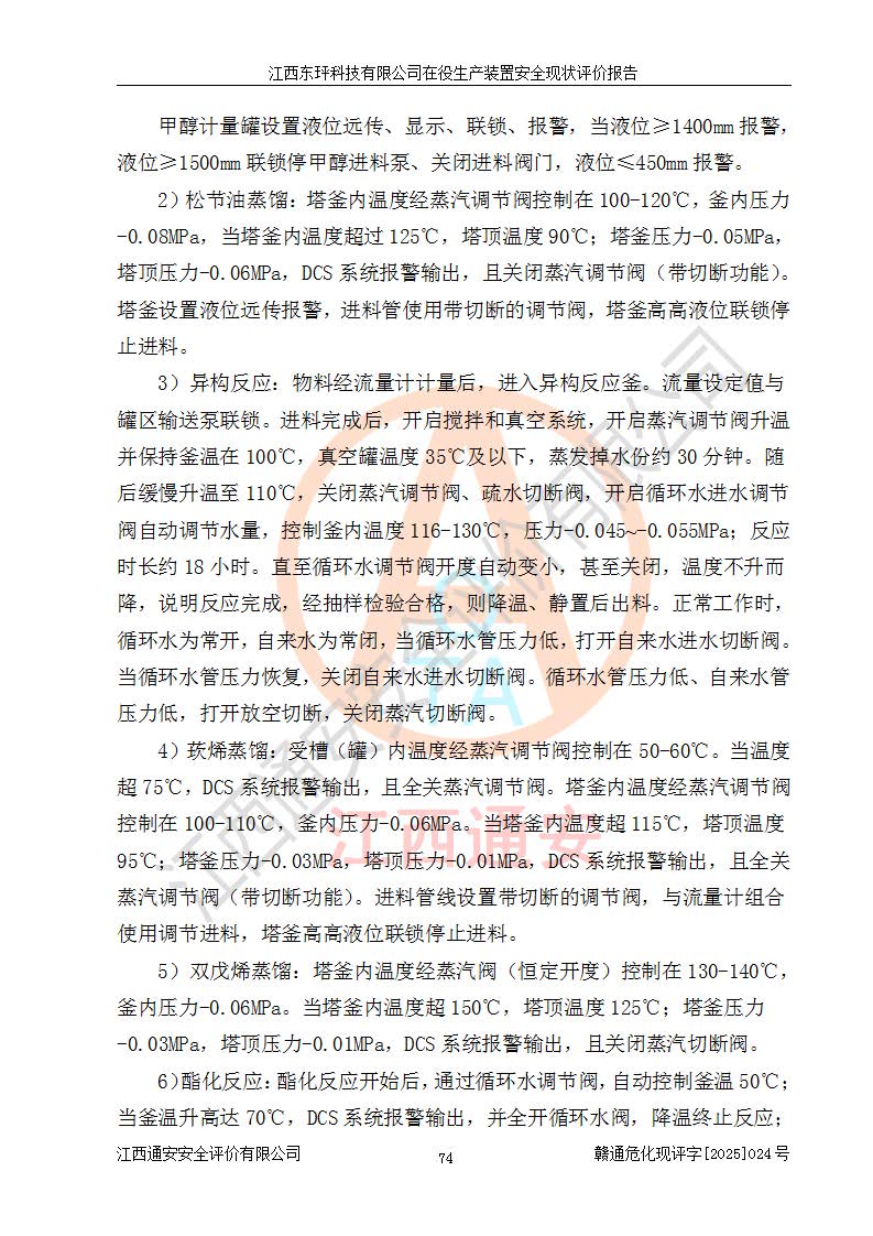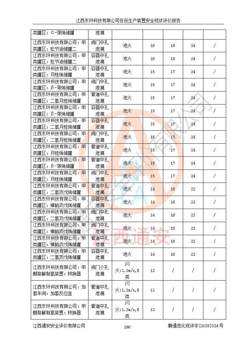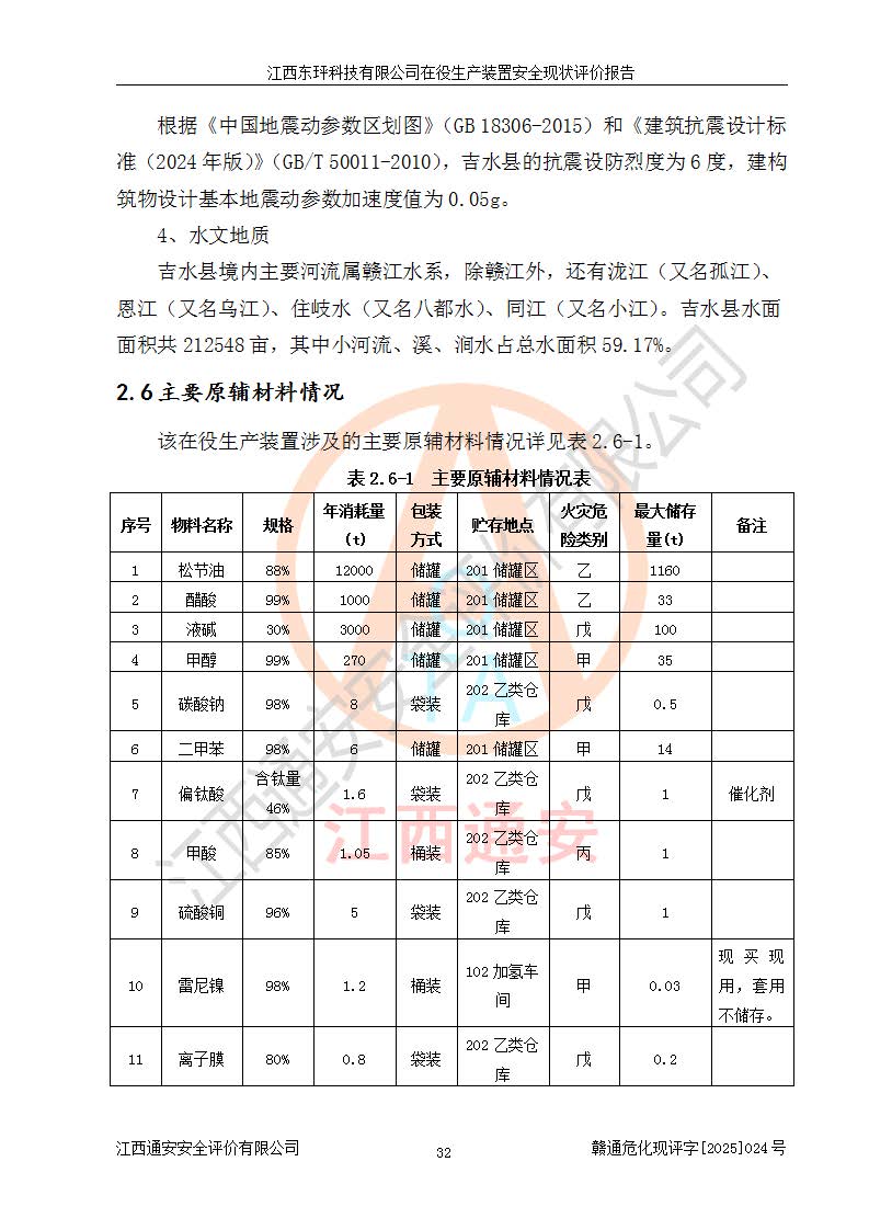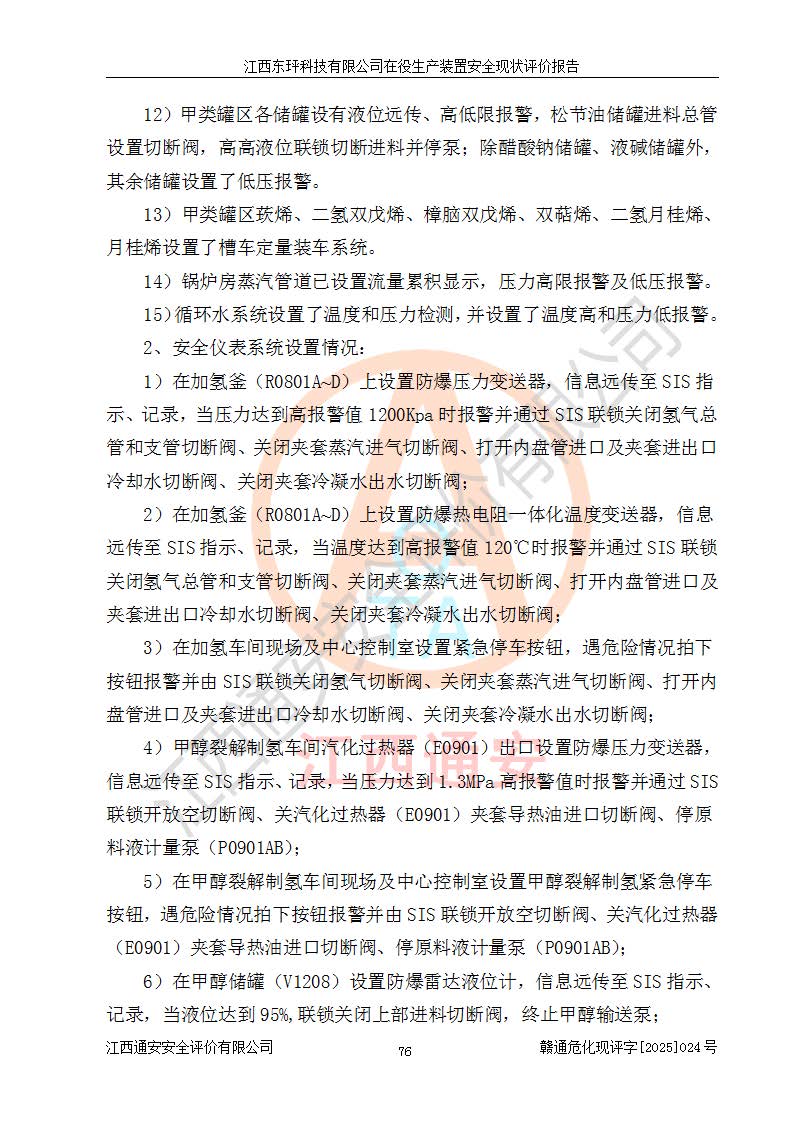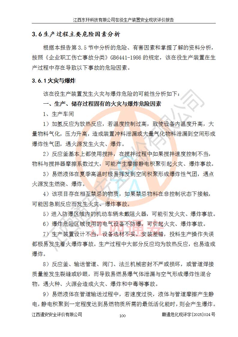江西東玶科技有限公司位于江西省吉安市吉水縣城西工業(yè)園區(qū),法定**人為徐東,成立于2018年04月08日,注冊(cè)資本叁仟貳佰叁拾萬(wàn)元整,經(jīng)營(yíng)范圍為合成樟腦、α-蒎烯、β-蒎烯、二氫月桂烯(含月桂烯)、莰烯、雙戊烯、氫氣(中間產(chǎn)品)的制造加工(憑**批準(zhǔn)證書(shū)經(jīng)營(yíng));白乙酯、雙萜烯等合成香料的制造加工等。 江西東玶科技有限公司2022年08月01日取得了《安全生產(chǎn)許可證》,許可證編號(hào):(贛)WH安許證字[2022]1160號(hào),許可范圍為合成樟腦(2000t/a)、二氫月桂烯(1000t/a)、月桂烯(3200t/a)、莰烯(1000t/a)、雙戊烯(810t/a)、雙萜烯(1070t/a)、α-蒎烯(7500t/a)、β-蒎烯(3200t/a)、白乙酯(500t/a),**期為2022年08月01日至2025年07月31日。該公司2023年5月29日取得了三級(jí)安全生產(chǎn)標(biāo)準(zhǔn)化證書(shū),證書(shū)編號(hào):贛AQBWHⅢ202300036,**期至2026年5月。該公司現(xiàn)有員工53人,其中專職安全生產(chǎn)管理人員2人。 因生產(chǎn)經(jīng)營(yíng)需要,江西東玶科技有限公司實(shí)施了年產(chǎn)12000噸松節(jié)油深加工系列產(chǎn)品項(xiàng)目(二期),并將二氫月桂烯的設(shè)計(jì)生產(chǎn)規(guī)模2000t/a變更為1500t/a,減少中間產(chǎn)品蒎烷的消耗量,剩余的蒎烷(720t/a)作為產(chǎn)品銷售。江西東玶科技有限公司委托深圳天陽(yáng)工程設(shè)計(jì)有限公司進(jìn)行了設(shè)計(jì)變更,按程序要求進(jìn)行了試生產(chǎn),委托評(píng)價(jià)公司編制了安全驗(yàn)收評(píng)價(jià)報(bào)告,并于2025年1月16日組織專家組和相關(guān)單位進(jìn)行了驗(yàn)收。驗(yàn)收完成后,江西東玶科技有限公司2025年06月04日對(duì)《安全生產(chǎn)許可證》進(jìn)行了變更,許可范圍變更為合成樟腦(2000t/a)、二氫月桂烯(1500t/a)、月桂烯(3200t/a)、莰烯(1000t/a)、雙戊烯(902.5t/a)、雙萜烯(1200.7t/a)、α-蒎烯(7500t/a)、β-蒎烯(3200t/a)、白乙酯(500t/a)、蒎烷(中間產(chǎn)品,720t/a)。 江西東玶科技有限公司在役生產(chǎn)裝置生產(chǎn)過(guò)程中涉及的主要原輔材料為松節(jié)油、乙酸、液堿、甲醇、碳酸鈉、二甲苯、偏鈦酸、甲酸、硫酸銅、雷尼鎳、離子膜、天然氣、氮?dú)?,中間產(chǎn)品為氫氣、α-蒎烯、β-蒎烯、蒎烷,產(chǎn)品為合成樟腦、二氫月桂烯、月桂烯、莰烯、雙戊烯、白乙酯、雙萜烯,副產(chǎn)品為醋酸鈉。根據(jù)《危險(xiǎn)化學(xué)品目錄》,該在役生產(chǎn)裝置涉及的松節(jié)油、乙酸、液堿、甲醇、二甲苯、甲酸、雷尼鎳、天然氣(燃料)、氮?dú)猓▔嚎s的)、柴油,中間產(chǎn)品α-蒎烯、β-蒎烯、氫氣、蒎烷和產(chǎn)品中合成樟腦、二氫月桂烯、月桂烯、莰烯、雙戊烯屬于危險(xiǎn)化學(xué)品。經(jīng)辨識(shí),甲醇、氫氣和天然氣(燃料)屬于重點(diǎn)監(jiān)管的危險(xiǎn)化學(xué)品,甲醇屬于特別管控的危險(xiǎn)化學(xué)品,不涉及監(jiān)控化學(xué)品、易制毒化學(xué)品、易制爆危險(xiǎn)化學(xué)品、劇毒化學(xué)品和高毒物品,生產(chǎn)、儲(chǔ)存單元不構(gòu)成危險(xiǎn)化學(xué)品重大危險(xiǎn)源,涉及的加氫工藝屬于重點(diǎn)監(jiān)管的危險(xiǎn)化工工藝。根據(jù)生產(chǎn)工藝特點(diǎn)及物料的理化特性可知,該在役生產(chǎn)裝置生產(chǎn)過(guò)程中存在火災(zāi)與爆炸、中毒與窒息、觸電、機(jī)械傷害、灼燙等危險(xiǎn)有害因素。 該公司自2022年08月01日取得安全生產(chǎn)許可證以來(lái),生產(chǎn)運(yùn)行正常,未發(fā)生一般及以上生產(chǎn)安全事故。 |