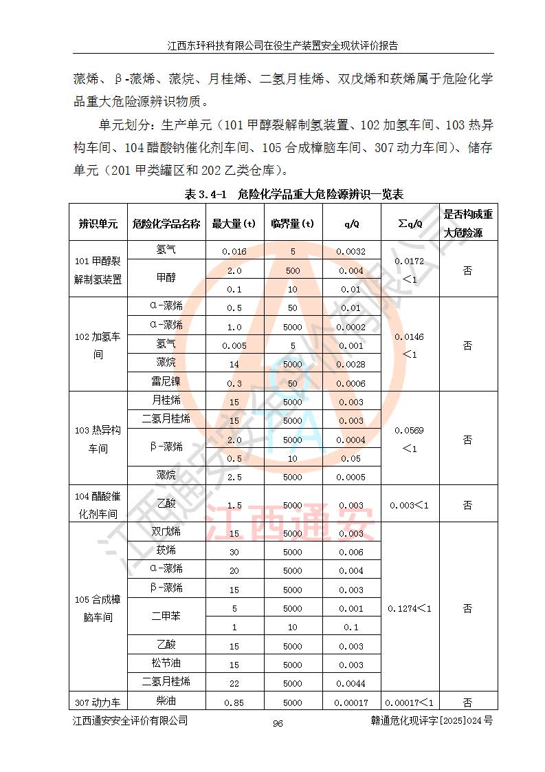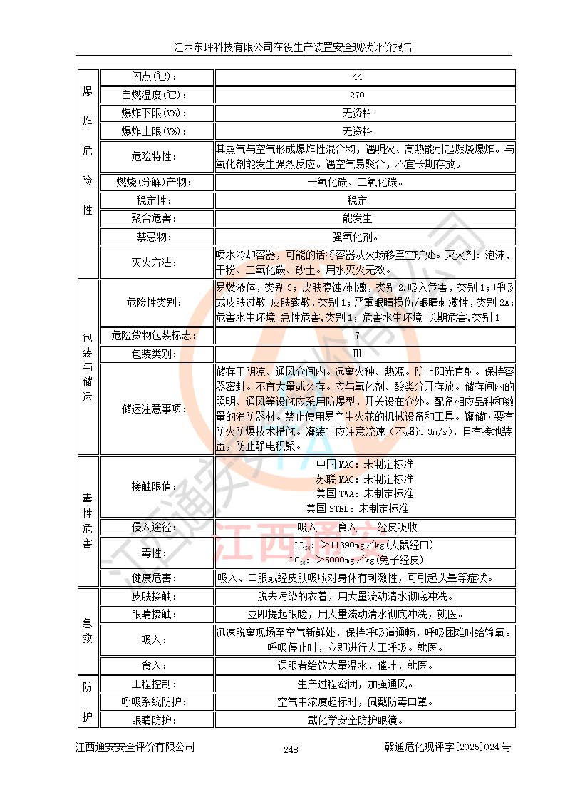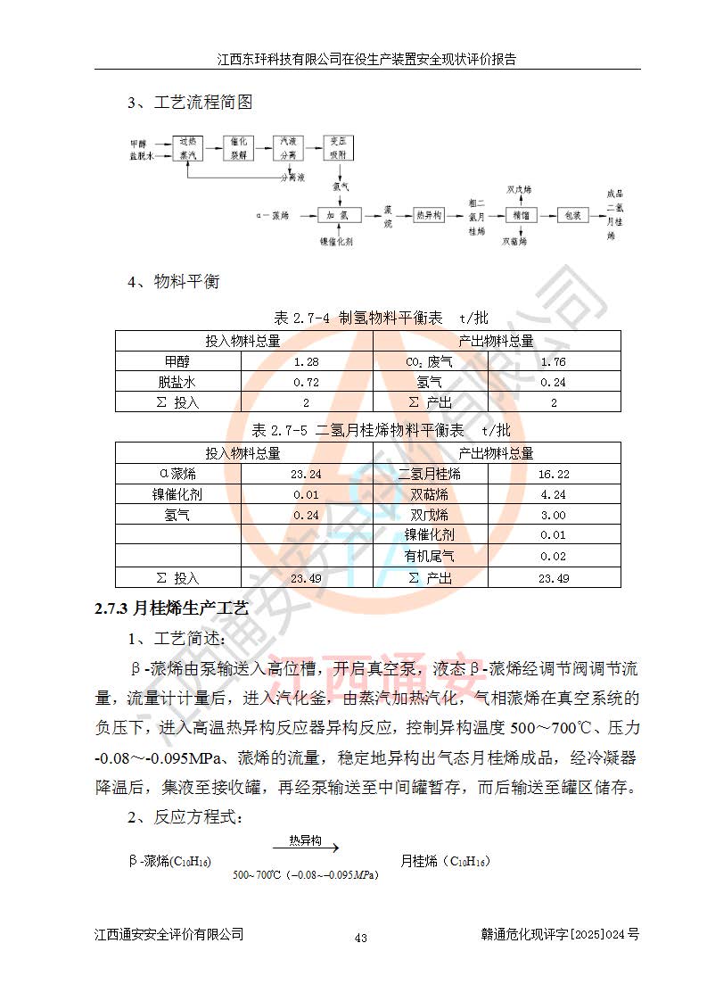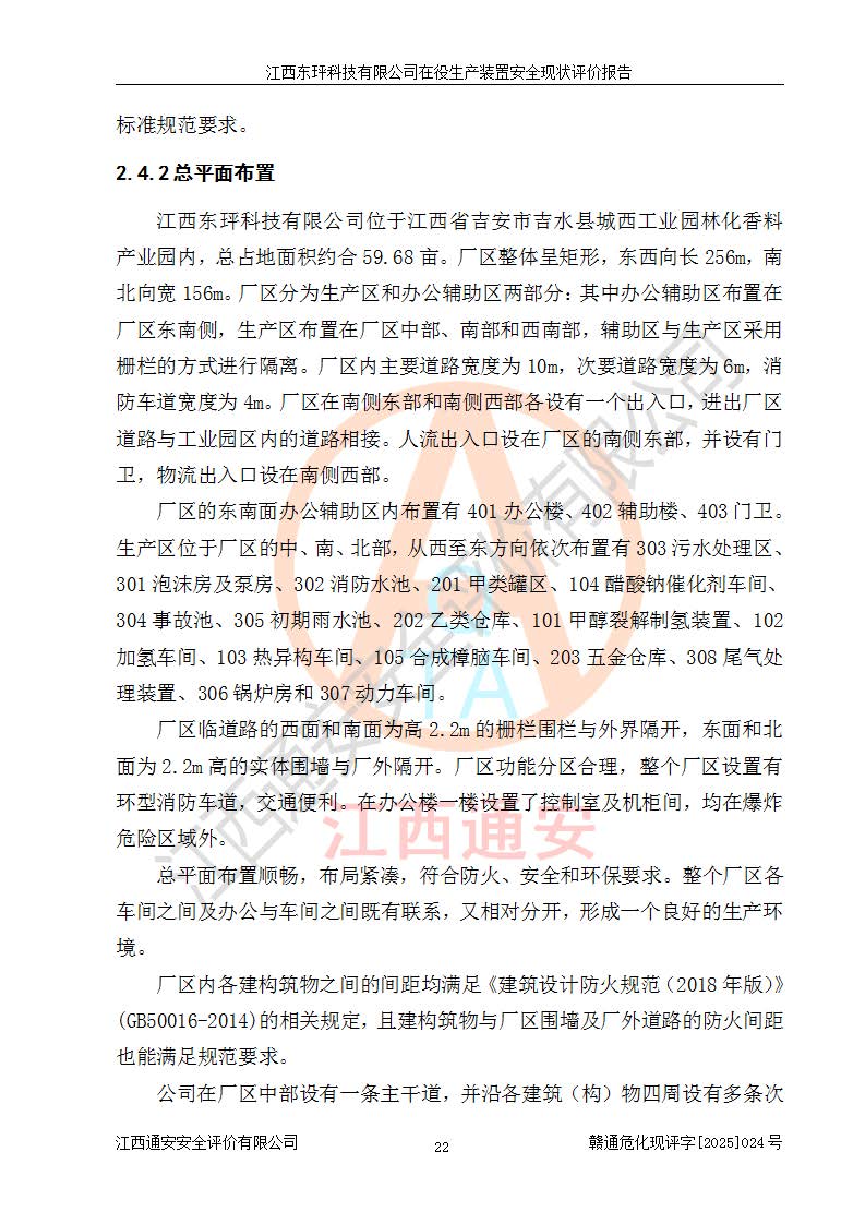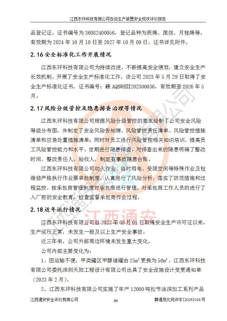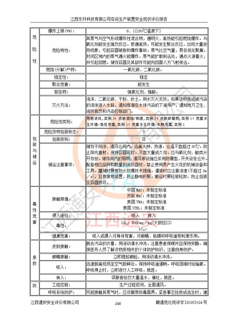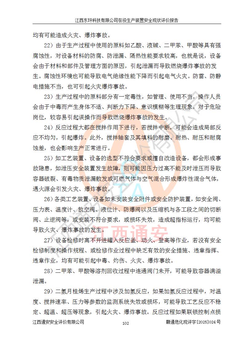 江西東玶科技有限公司位于江西省吉安市吉水縣城西工業(yè)園區(qū),法定**人為徐東,成立于2018年04月08日,注冊(cè)資本叁仟貳佰叁拾萬(wàn)元整,經(jīng)營(yíng)范圍為合成樟腦、α-蒎烯、β-蒎烯、二氫月桂烯(含月桂烯)、莰烯、雙戊烯、氫氣(中間產(chǎn)品)的制造加工(憑**批準(zhǔn)證書(shū)經(jīng)營(yíng));白乙酯、雙萜烯等合成香料的制造加工等。 江西東玶科技有限公司2022年08月01日取得了《安全生產(chǎn)許可證》,許可證編號(hào):(贛)WH安許證字[2022]1160號(hào),許可范圍為合成樟腦(2000t/a)、二氫月桂烯(1000t/a)、月桂烯(3200t/a)、莰烯(1000t/a)、雙戊烯(810t/a)、雙萜烯(1070t/a)、α-蒎烯(7500t/a)、β-蒎烯(3200t/a)、白乙酯(500t/a),**期為2022年08月01日至2025年07月31日。該公司2023年5月29日取得了三級(jí)安全生產(chǎn)標(biāo)準(zhǔn)化證書(shū),證書(shū)編號(hào):贛AQBWHⅢ202300036,**期至2026年5月。該公司現(xiàn)有員工53人,其中專職安全生產(chǎn)管理人員2人。 因生產(chǎn)經(jīng)營(yíng)需要,江西東玶科技有限公司實(shí)施了年產(chǎn)12000噸松節(jié)油深加工系列產(chǎn)品項(xiàng)目(二期),并將二氫月桂烯的設(shè)計(jì)生產(chǎn)規(guī)模2000t/a變更為1500t/a,減少中間產(chǎn)品蒎烷的消耗量,剩余的蒎烷(720t/a)作為產(chǎn)品銷售。江西東玶科技有限公司委托深圳天陽(yáng)工程設(shè)計(jì)有限公司進(jìn)行了設(shè)計(jì)變更,按程序要求進(jìn)行了試生產(chǎn),委托評(píng)價(jià)公司編制了安全驗(yàn)收評(píng)價(jià)報(bào)告,并于2025年1月16日組織專家組和相關(guān)單位進(jìn)行了驗(yàn)收。驗(yàn)收完成后,江西東玶科技有限公司2025年06月04日對(duì)《安全生產(chǎn)許可證》進(jìn)行了變更,許可范圍變更為合成樟腦(2000t/a)、二氫月桂烯(1500t/a)、月桂烯(3200t/a)、莰烯(1000t/a)、雙戊烯(902.5t/a)、雙萜烯(1200.7t/a)、α-蒎烯(7500t/a)、β-蒎烯(3200t/a)、白乙酯(500t/a)、蒎烷(中間產(chǎn)品,720t/a)。 江西東玶科技有限公司在役生產(chǎn)裝置生產(chǎn)過(guò)程中涉及的主要原輔材料為松節(jié)油、乙酸、液堿、甲醇、碳酸鈉、二甲苯、偏鈦酸、甲酸、硫酸銅、雷尼鎳、離子膜、天然氣、氮?dú)?,中間產(chǎn)品為氫氣、α-蒎烯、β-蒎烯、蒎烷,產(chǎn)品為合成樟腦、二氫月桂烯、月桂烯、莰烯、雙戊烯、白乙酯、雙萜烯,副產(chǎn)品為醋酸鈉。根據(jù)《危險(xiǎn)化學(xué)品目錄》,該在役生產(chǎn)裝置涉及的松節(jié)油、乙酸、液堿、甲醇、二甲苯、甲酸、雷尼鎳、天然氣(燃料)、氮?dú)猓▔嚎s的)、柴油,中間產(chǎn)品α-蒎烯、β-蒎烯、氫氣、蒎烷和產(chǎn)品中合成樟腦、二氫月桂烯、月桂烯、莰烯、雙戊烯屬于危險(xiǎn)化學(xué)品。經(jīng)辨識(shí),甲醇、氫氣和天然氣(燃料)屬于重點(diǎn)監(jiān)管的危險(xiǎn)化學(xué)品,甲醇屬于特別管控的危險(xiǎn)化學(xué)品,不涉及監(jiān)控化學(xué)品、易制毒化學(xué)品、易制爆危險(xiǎn)化學(xué)品、劇毒化學(xué)品和高毒物品,生產(chǎn)、儲(chǔ)存單元不構(gòu)成危險(xiǎn)化學(xué)品重大危險(xiǎn)源,涉及的加氫工藝屬于重點(diǎn)監(jiān)管的危險(xiǎn)化工工藝。根據(jù)生產(chǎn)工藝特點(diǎn)及物料的理化特性可知,該在役生產(chǎn)裝置生產(chǎn)過(guò)程中存在火災(zāi)與爆炸、中毒與窒息、觸電、機(jī)械傷害、灼燙等危險(xiǎn)有害因素。 該公司自2022年08月01日取得安全生產(chǎn)許可證以來(lái),生產(chǎn)運(yùn)行正常,未發(fā)生一般及以上生產(chǎn)安全事故。 |