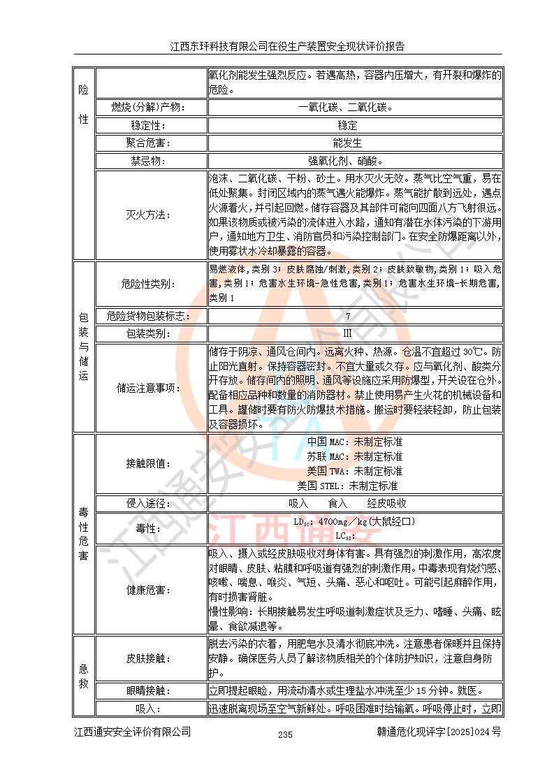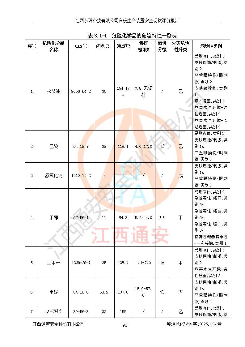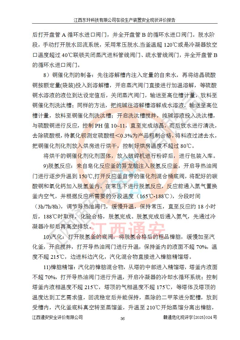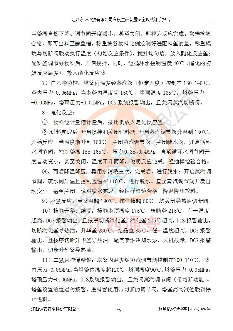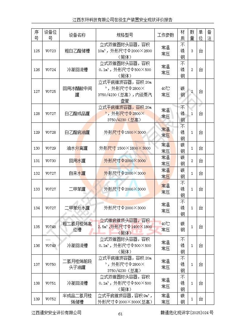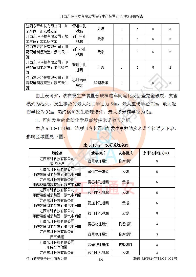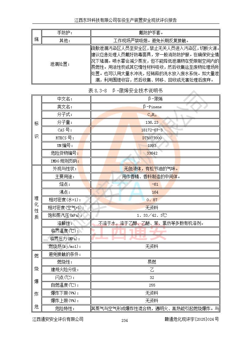 江西東玶科技有限公司位于江西省吉安市吉水縣城西工業(yè)園區(qū),法定**人為徐東,成立于2018年04月08日,注冊(cè)資本叁仟貳佰叁拾萬(wàn)元整,經(jīng)營(yíng)范圍為合成樟腦、α-蒎烯、β-蒎烯、二氫月桂烯(含月桂烯)、莰烯、雙戊烯、氫氣(中間產(chǎn)品)的制造加工(憑**批準(zhǔn)證書(shū)經(jīng)營(yíng));白乙酯、雙萜烯等合成香料的制造加工等。 江西東玶科技有限公司2022年08月01日取得了《安全生產(chǎn)許可證》,許可證編號(hào):(贛)WH安許證字[2022]1160號(hào),許可范圍為合成樟腦(2000t/a)、二氫月桂烯(1000t/a)、月桂烯(3200t/a)、莰烯(1000t/a)、雙戊烯(810t/a)、雙萜烯(1070t/a)、α-蒎烯(7500t/a)、β-蒎烯(3200t/a)、白乙酯(500t/a),**期為2022年08月01日至2025年07月31日。該公司2023年5月29日取得了三級(jí)安全生產(chǎn)標(biāo)準(zhǔn)化證書(shū),證書(shū)編號(hào):贛AQBWHⅢ202300036,**期至2026年5月。該公司現(xiàn)有員工53人,其中專職安全生產(chǎn)管理人員2人。 因生產(chǎn)經(jīng)營(yíng)需要,江西東玶科技有限公司實(shí)施了年產(chǎn)12000噸松節(jié)油深加工系列產(chǎn)品項(xiàng)目(二期),并將二氫月桂烯的設(shè)計(jì)生產(chǎn)規(guī)模2000t/a變更為1500t/a,減少中間產(chǎn)品蒎烷的消耗量,剩余的蒎烷(720t/a)作為產(chǎn)品銷售。江西東玶科技有限公司委托深圳天陽(yáng)工程設(shè)計(jì)有限公司進(jìn)行了設(shè)計(jì)變更,按程序要求進(jìn)行了試生產(chǎn),委托評(píng)價(jià)公司編制了安全驗(yàn)收評(píng)價(jià)報(bào)告,并于2025年1月16日組織專家組和相關(guān)單位進(jìn)行了驗(yàn)收。驗(yàn)收完成后,江西東玶科技有限公司2025年06月04日對(duì)《安全生產(chǎn)許可證》進(jìn)行了變更,許可范圍變更為合成樟腦(2000t/a)、二氫月桂烯(1500t/a)、月桂烯(3200t/a)、莰烯(1000t/a)、雙戊烯(902.5t/a)、雙萜烯(1200.7t/a)、α-蒎烯(7500t/a)、β-蒎烯(3200t/a)、白乙酯(500t/a)、蒎烷(中間產(chǎn)品,720t/a)。 江西東玶科技有限公司在役生產(chǎn)裝置生產(chǎn)過(guò)程中涉及的主要原輔材料為松節(jié)油、乙酸、液堿、甲醇、碳酸鈉、二甲苯、偏鈦酸、甲酸、硫酸銅、雷尼鎳、離子膜、天然氣、氮?dú)?,中間產(chǎn)品為氫氣、α-蒎烯、β-蒎烯、蒎烷,產(chǎn)品為合成樟腦、二氫月桂烯、月桂烯、莰烯、雙戊烯、白乙酯、雙萜烯,副產(chǎn)品為醋酸鈉。根據(jù)《危險(xiǎn)化學(xué)品目錄》,該在役生產(chǎn)裝置涉及的松節(jié)油、乙酸、液堿、甲醇、二甲苯、甲酸、雷尼鎳、天然氣(燃料)、氮?dú)猓▔嚎s的)、柴油,中間產(chǎn)品α-蒎烯、β-蒎烯、氫氣、蒎烷和產(chǎn)品中合成樟腦、二氫月桂烯、月桂烯、莰烯、雙戊烯屬于危險(xiǎn)化學(xué)品。經(jīng)辨識(shí),甲醇、氫氣和天然氣(燃料)屬于重點(diǎn)監(jiān)管的危險(xiǎn)化學(xué)品,甲醇屬于特別管控的危險(xiǎn)化學(xué)品,不涉及監(jiān)控化學(xué)品、易制毒化學(xué)品、易制爆危險(xiǎn)化學(xué)品、劇毒化學(xué)品和高毒物品,生產(chǎn)、儲(chǔ)存單元不構(gòu)成危險(xiǎn)化學(xué)品重大危險(xiǎn)源,涉及的加氫工藝屬于重點(diǎn)監(jiān)管的危險(xiǎn)化工工藝。根據(jù)生產(chǎn)工藝特點(diǎn)及物料的理化特性可知,該在役生產(chǎn)裝置生產(chǎn)過(guò)程中存在火災(zāi)與爆炸、中毒與窒息、觸電、機(jī)械傷害、灼燙等危險(xiǎn)有害因素。 該公司自2022年08月01日取得安全生產(chǎn)許可證以來(lái),生產(chǎn)運(yùn)行正常,未發(fā)生一般及以上生產(chǎn)安全事故。 |