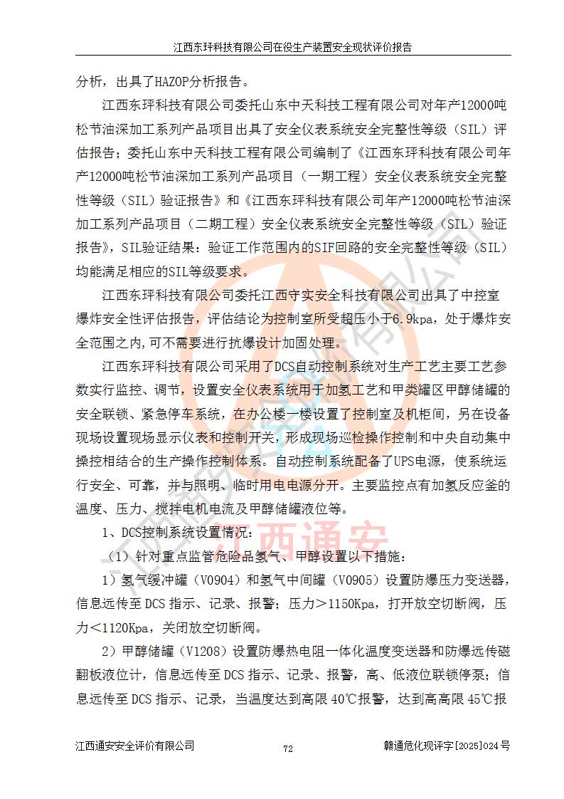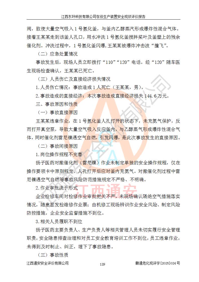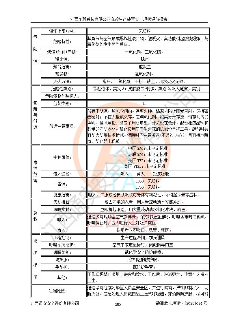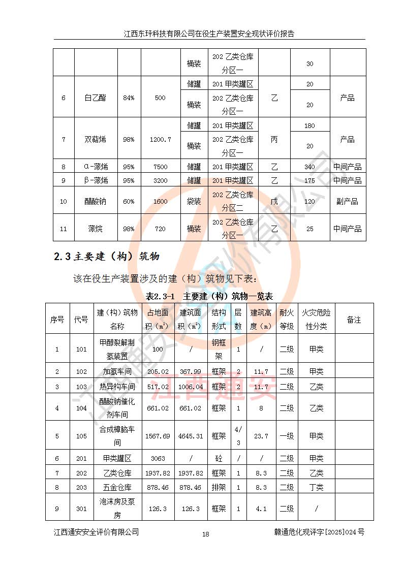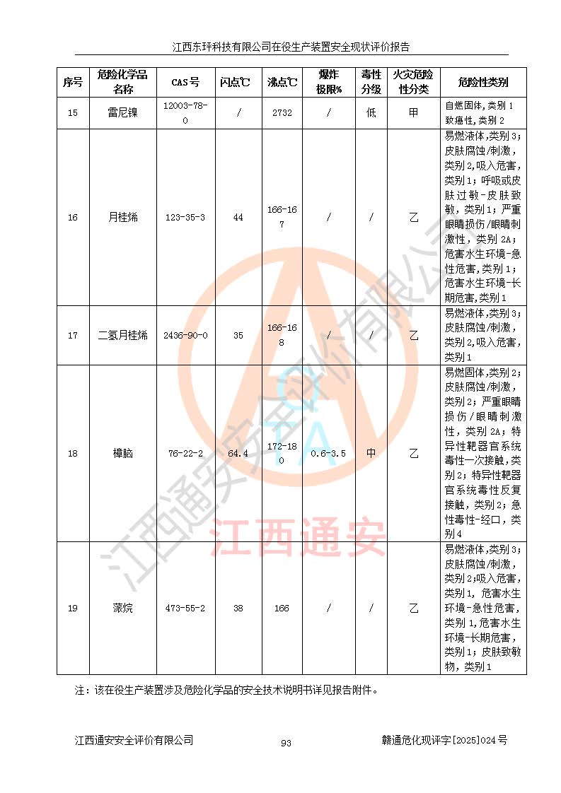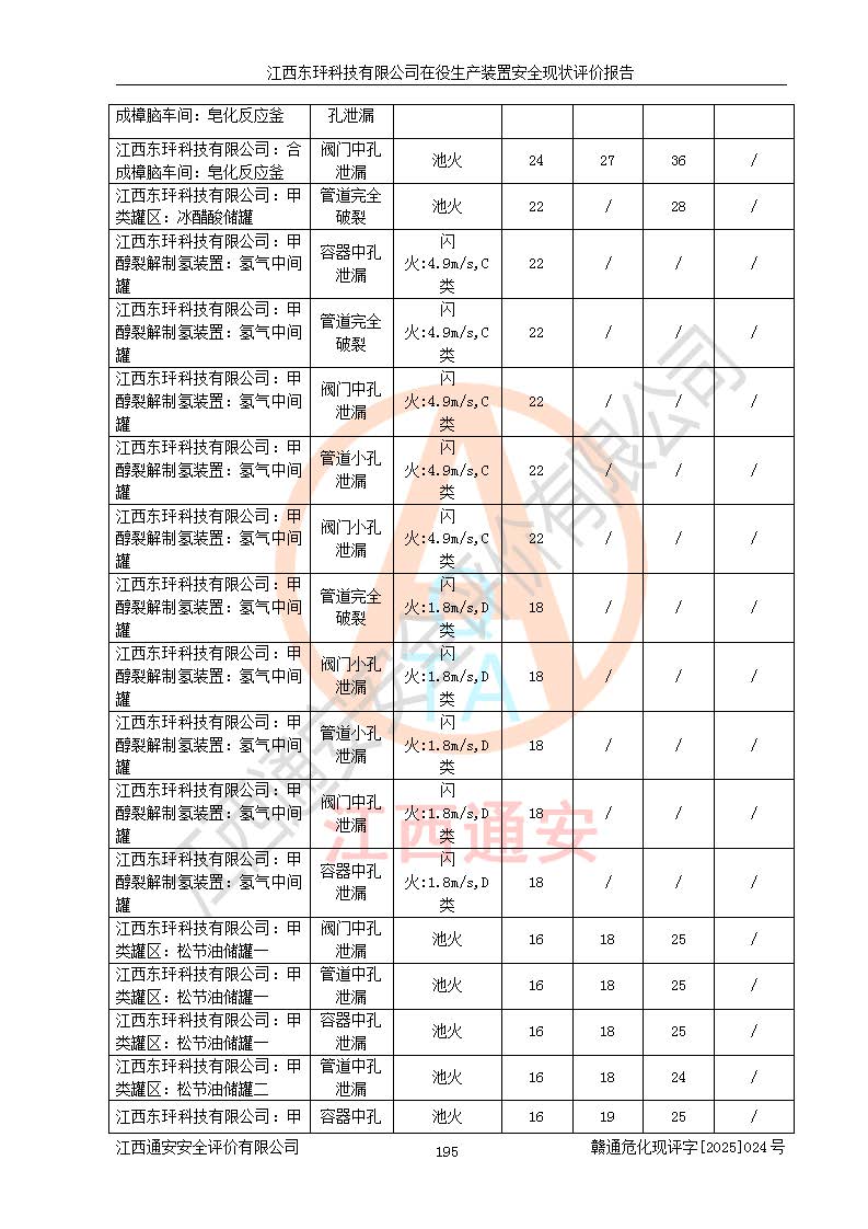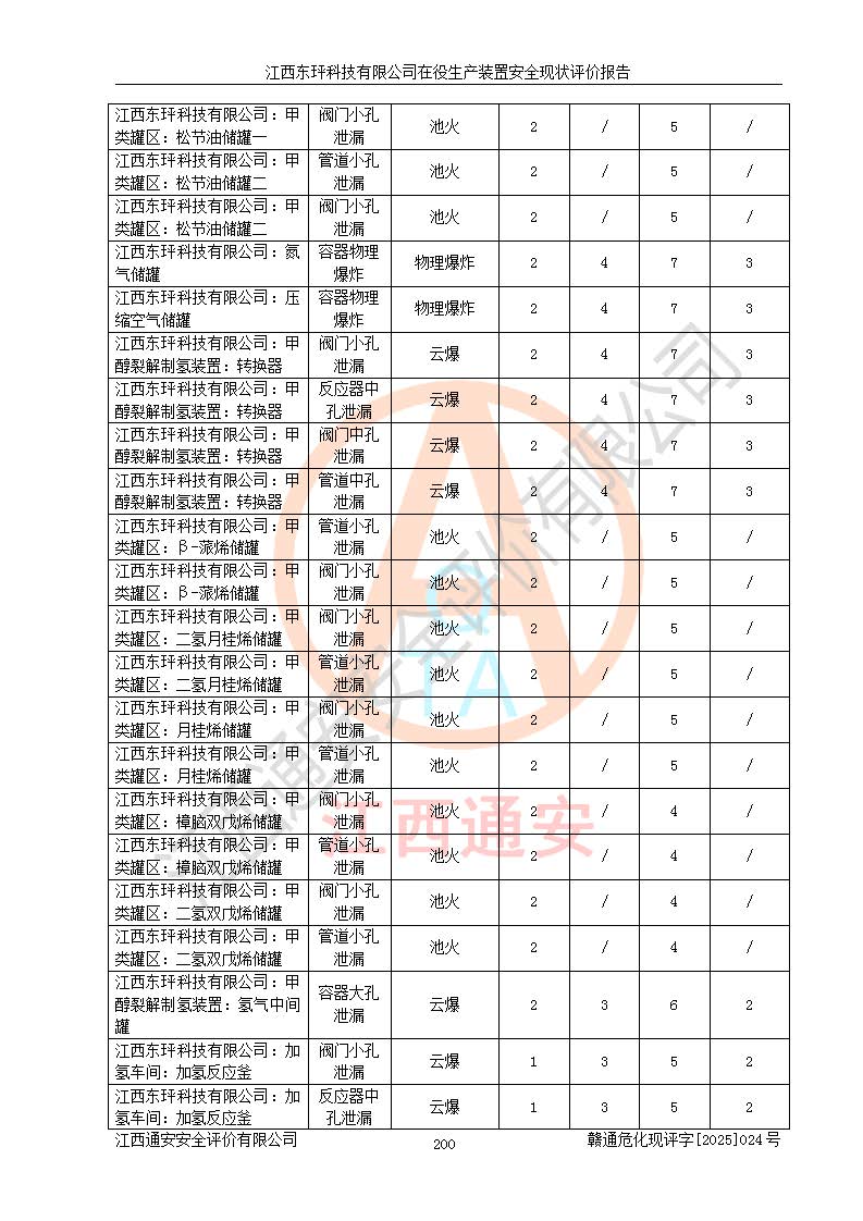 江西東玶科技有限公司位于江西省吉安市吉水縣城西工業(yè)園區(qū),法定**人為徐東,成立于2018年04月08日,注冊(cè)資本叁仟貳佰叁拾萬(wàn)元整,經(jīng)營(yíng)范圍為合成樟腦、α-蒎烯、β-蒎烯、二氫月桂烯(含月桂烯)、莰烯、雙戊烯、氫氣(中間產(chǎn)品)的制造加工(憑**批準(zhǔn)證書(shū)經(jīng)營(yíng));白乙酯、雙萜烯等合成香料的制造加工等。 江西東玶科技有限公司2022年08月01日取得了《安全生產(chǎn)許可證》,許可證編號(hào):(贛)WH安許證字[2022]1160號(hào),許可范圍為合成樟腦(2000t/a)、二氫月桂烯(1000t/a)、月桂烯(3200t/a)、莰烯(1000t/a)、雙戊烯(810t/a)、雙萜烯(1070t/a)、α-蒎烯(7500t/a)、β-蒎烯(3200t/a)、白乙酯(500t/a),**期為2022年08月01日至2025年07月31日。該公司2023年5月29日取得了三級(jí)安全生產(chǎn)標(biāo)準(zhǔn)化證書(shū),證書(shū)編號(hào):贛AQBWHⅢ202300036,**期至2026年5月。該公司現(xiàn)有員工53人,其中專職安全生產(chǎn)管理人員2人。 因生產(chǎn)經(jīng)營(yíng)需要,江西東玶科技有限公司實(shí)施了年產(chǎn)12000噸松節(jié)油深加工系列產(chǎn)品項(xiàng)目(二期),并將二氫月桂烯的設(shè)計(jì)生產(chǎn)規(guī)模2000t/a變更為1500t/a,減少中間產(chǎn)品蒎烷的消耗量,剩余的蒎烷(720t/a)作為產(chǎn)品銷售。江西東玶科技有限公司委托深圳天陽(yáng)工程設(shè)計(jì)有限公司進(jìn)行了設(shè)計(jì)變更,按程序要求進(jìn)行了試生產(chǎn),委托評(píng)價(jià)公司編制了安全驗(yàn)收評(píng)價(jià)報(bào)告,并于2025年1月16日組織專家組和相關(guān)單位進(jìn)行了驗(yàn)收。驗(yàn)收完成后,江西東玶科技有限公司2025年06月04日對(duì)《安全生產(chǎn)許可證》進(jìn)行了變更,許可范圍變更為合成樟腦(2000t/a)、二氫月桂烯(1500t/a)、月桂烯(3200t/a)、莰烯(1000t/a)、雙戊烯(902.5t/a)、雙萜烯(1200.7t/a)、α-蒎烯(7500t/a)、β-蒎烯(3200t/a)、白乙酯(500t/a)、蒎烷(中間產(chǎn)品,720t/a)。 江西東玶科技有限公司在役生產(chǎn)裝置生產(chǎn)過(guò)程中涉及的主要原輔材料為松節(jié)油、乙酸、液堿、甲醇、碳酸鈉、二甲苯、偏鈦酸、甲酸、硫酸銅、雷尼鎳、離子膜、天然氣、氮?dú)?,中間產(chǎn)品為氫氣、α-蒎烯、β-蒎烯、蒎烷,產(chǎn)品為合成樟腦、二氫月桂烯、月桂烯、莰烯、雙戊烯、白乙酯、雙萜烯,副產(chǎn)品為醋酸鈉。根據(jù)《危險(xiǎn)化學(xué)品目錄》,該在役生產(chǎn)裝置涉及的松節(jié)油、乙酸、液堿、甲醇、二甲苯、甲酸、雷尼鎳、天然氣(燃料)、氮?dú)猓▔嚎s的)、柴油,中間產(chǎn)品α-蒎烯、β-蒎烯、氫氣、蒎烷和產(chǎn)品中合成樟腦、二氫月桂烯、月桂烯、莰烯、雙戊烯屬于危險(xiǎn)化學(xué)品。經(jīng)辨識(shí),甲醇、氫氣和天然氣(燃料)屬于重點(diǎn)監(jiān)管的危險(xiǎn)化學(xué)品,甲醇屬于特別管控的危險(xiǎn)化學(xué)品,不涉及監(jiān)控化學(xué)品、易制毒化學(xué)品、易制爆危險(xiǎn)化學(xué)品、劇毒化學(xué)品和高毒物品,生產(chǎn)、儲(chǔ)存單元不構(gòu)成危險(xiǎn)化學(xué)品重大危險(xiǎn)源,涉及的加氫工藝屬于重點(diǎn)監(jiān)管的危險(xiǎn)化工工藝。根據(jù)生產(chǎn)工藝特點(diǎn)及物料的理化特性可知,該在役生產(chǎn)裝置生產(chǎn)過(guò)程中存在火災(zāi)與爆炸、中毒與窒息、觸電、機(jī)械傷害、灼燙等危險(xiǎn)有害因素。 該公司自2022年08月01日取得安全生產(chǎn)許可證以來(lái),生產(chǎn)運(yùn)行正常,未發(fā)生一般及以上生產(chǎn)安全事故。 |
