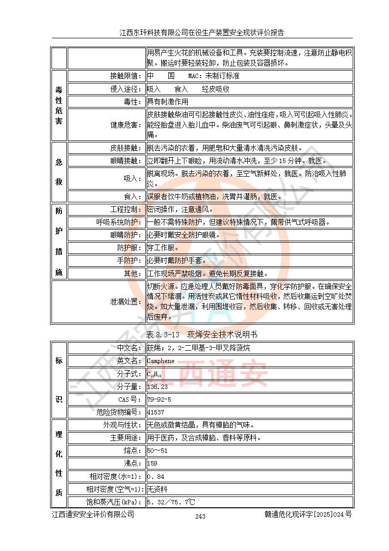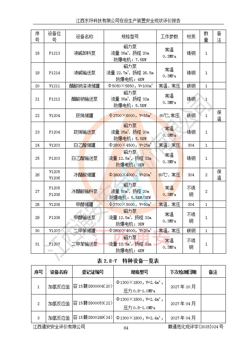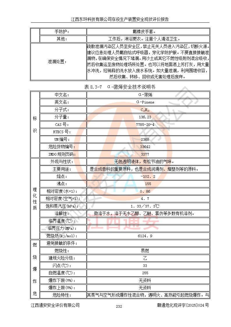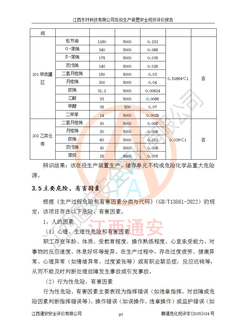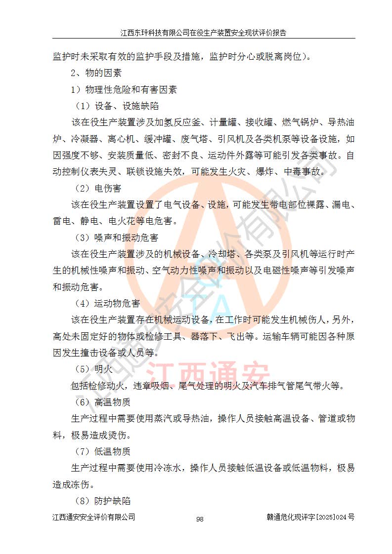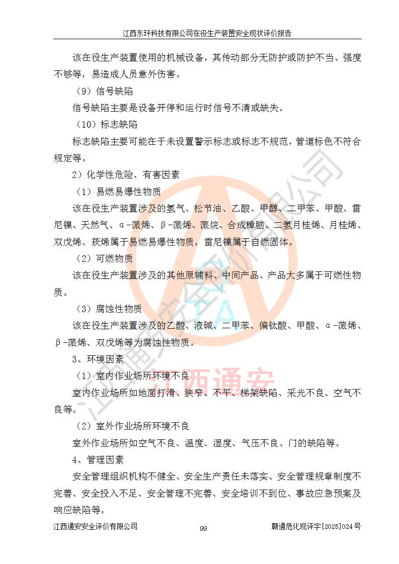 江西東玶科技有限公司位于江西省吉安市吉水縣城西工業(yè)園區(qū),法定**人為徐東,成立于2018年04月08日,注冊(cè)資本叁仟貳佰叁拾萬(wàn)元整,經(jīng)營(yíng)范圍為合成樟腦、α-蒎烯、β-蒎烯、二氫月桂烯(含月桂烯)、莰烯、雙戊烯、氫氣(中間產(chǎn)品)的制造加工(憑**批準(zhǔn)證書(shū)經(jīng)營(yíng));白乙酯、雙萜烯等合成香料的制造加工等。 江西東玶科技有限公司2022年08月01日取得了《安全生產(chǎn)許可證》,許可證編號(hào):(贛)WH安許證字[2022]1160號(hào),許可范圍為合成樟腦(2000t/a)、二氫月桂烯(1000t/a)、月桂烯(3200t/a)、莰烯(1000t/a)、雙戊烯(810t/a)、雙萜烯(1070t/a)、α-蒎烯(7500t/a)、β-蒎烯(3200t/a)、白乙酯(500t/a),**期為2022年08月01日至2025年07月31日。該公司2023年5月29日取得了三級(jí)安全生產(chǎn)標(biāo)準(zhǔn)化證書(shū),證書(shū)編號(hào):贛AQBWHⅢ202300036,**期至2026年5月。該公司現(xiàn)有員工53人,其中專職安全生產(chǎn)管理人員2人。 因生產(chǎn)經(jīng)營(yíng)需要,江西東玶科技有限公司實(shí)施了年產(chǎn)12000噸松節(jié)油深加工系列產(chǎn)品項(xiàng)目(二期),并將二氫月桂烯的設(shè)計(jì)生產(chǎn)規(guī)模2000t/a變更為1500t/a,減少中間產(chǎn)品蒎烷的消耗量,剩余的蒎烷(720t/a)作為產(chǎn)品銷售。江西東玶科技有限公司委托深圳天陽(yáng)工程設(shè)計(jì)有限公司進(jìn)行了設(shè)計(jì)變更,按程序要求進(jìn)行了試生產(chǎn),委托評(píng)價(jià)公司編制了安全驗(yàn)收評(píng)價(jià)報(bào)告,并于2025年1月16日組織專家組和相關(guān)單位進(jìn)行了驗(yàn)收。驗(yàn)收完成后,江西東玶科技有限公司2025年06月04日對(duì)《安全生產(chǎn)許可證》進(jìn)行了變更,許可范圍變更為合成樟腦(2000t/a)、二氫月桂烯(1500t/a)、月桂烯(3200t/a)、莰烯(1000t/a)、雙戊烯(902.5t/a)、雙萜烯(1200.7t/a)、α-蒎烯(7500t/a)、β-蒎烯(3200t/a)、白乙酯(500t/a)、蒎烷(中間產(chǎn)品,720t/a)。 江西東玶科技有限公司在役生產(chǎn)裝置生產(chǎn)過(guò)程中涉及的主要原輔材料為松節(jié)油、乙酸、液堿、甲醇、碳酸鈉、二甲苯、偏鈦酸、甲酸、硫酸銅、雷尼鎳、離子膜、天然氣、氮?dú)?,中間產(chǎn)品為氫氣、α-蒎烯、β-蒎烯、蒎烷,產(chǎn)品為合成樟腦、二氫月桂烯、月桂烯、莰烯、雙戊烯、白乙酯、雙萜烯,副產(chǎn)品為醋酸鈉。根據(jù)《危險(xiǎn)化學(xué)品目錄》,該在役生產(chǎn)裝置涉及的松節(jié)油、乙酸、液堿、甲醇、二甲苯、甲酸、雷尼鎳、天然氣(燃料)、氮?dú)猓▔嚎s的)、柴油,中間產(chǎn)品α-蒎烯、β-蒎烯、氫氣、蒎烷和產(chǎn)品中合成樟腦、二氫月桂烯、月桂烯、莰烯、雙戊烯屬于危險(xiǎn)化學(xué)品。經(jīng)辨識(shí),甲醇、氫氣和天然氣(燃料)屬于重點(diǎn)監(jiān)管的危險(xiǎn)化學(xué)品,甲醇屬于特別管控的危險(xiǎn)化學(xué)品,不涉及監(jiān)控化學(xué)品、易制毒化學(xué)品、易制爆危險(xiǎn)化學(xué)品、劇毒化學(xué)品和高毒物品,生產(chǎn)、儲(chǔ)存單元不構(gòu)成危險(xiǎn)化學(xué)品重大危險(xiǎn)源,涉及的加氫工藝屬于重點(diǎn)監(jiān)管的危險(xiǎn)化工工藝。根據(jù)生產(chǎn)工藝特點(diǎn)及物料的理化特性可知,該在役生產(chǎn)裝置生產(chǎn)過(guò)程中存在火災(zāi)與爆炸、中毒與窒息、觸電、機(jī)械傷害、灼燙等危險(xiǎn)有害因素。 該公司自2022年08月01日取得安全生產(chǎn)許可證以來(lái),生產(chǎn)運(yùn)行正常,未發(fā)生一般及以上生產(chǎn)安全事故。 |