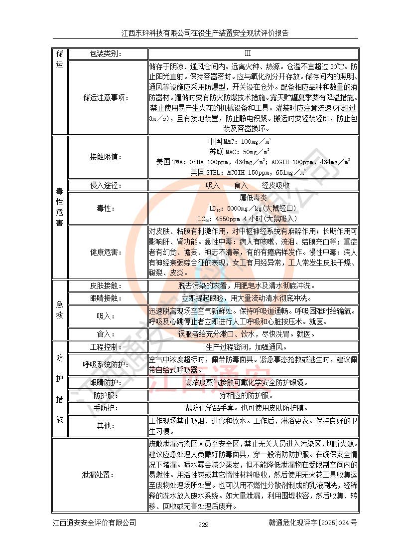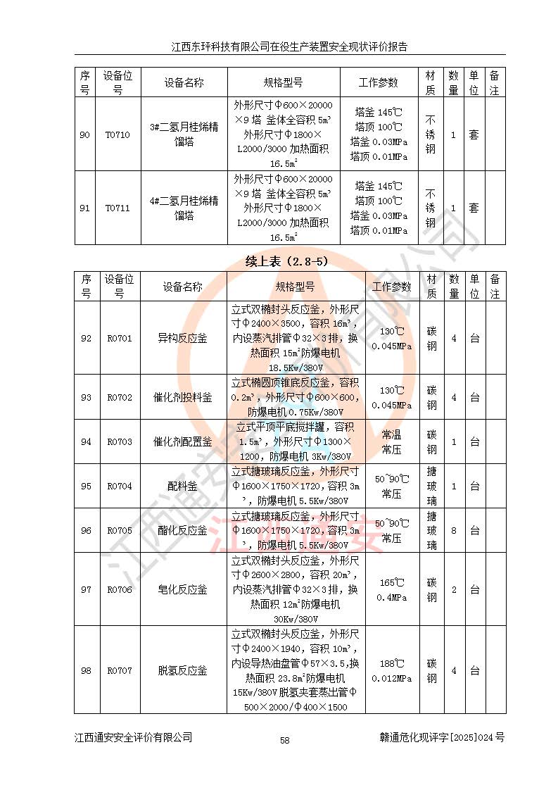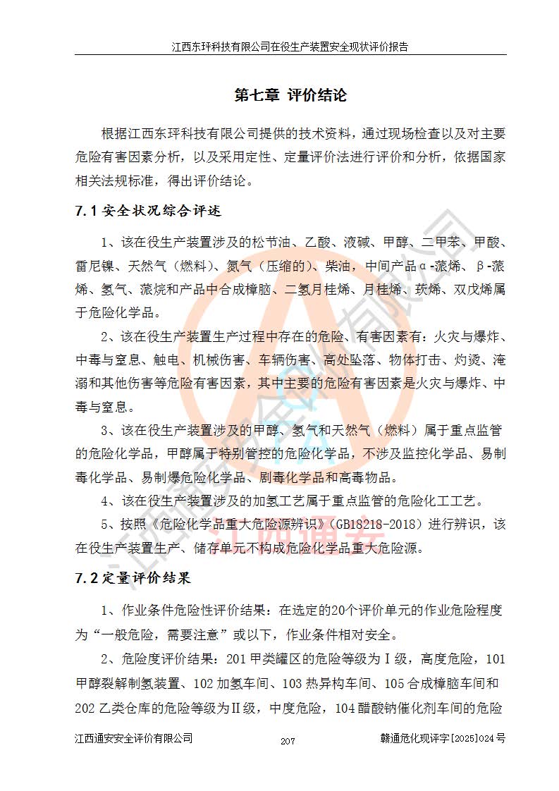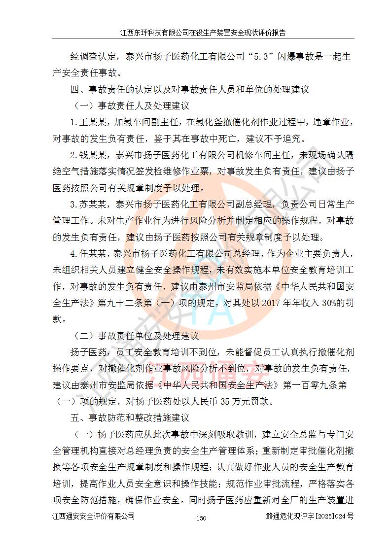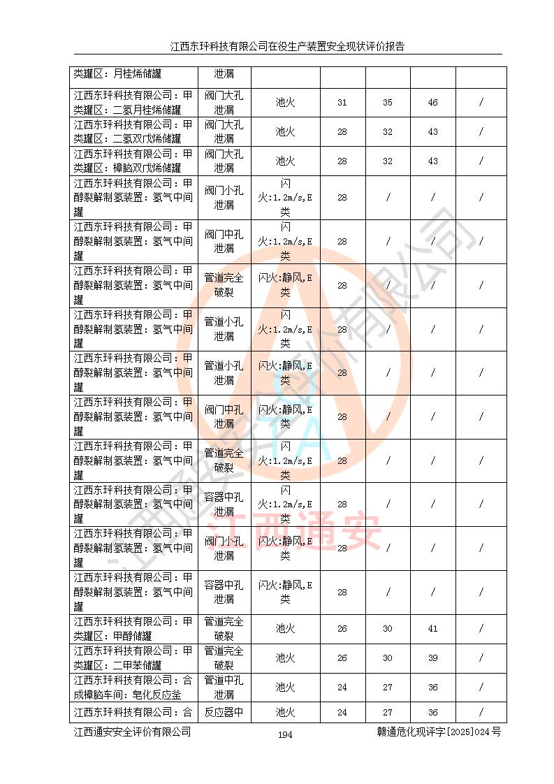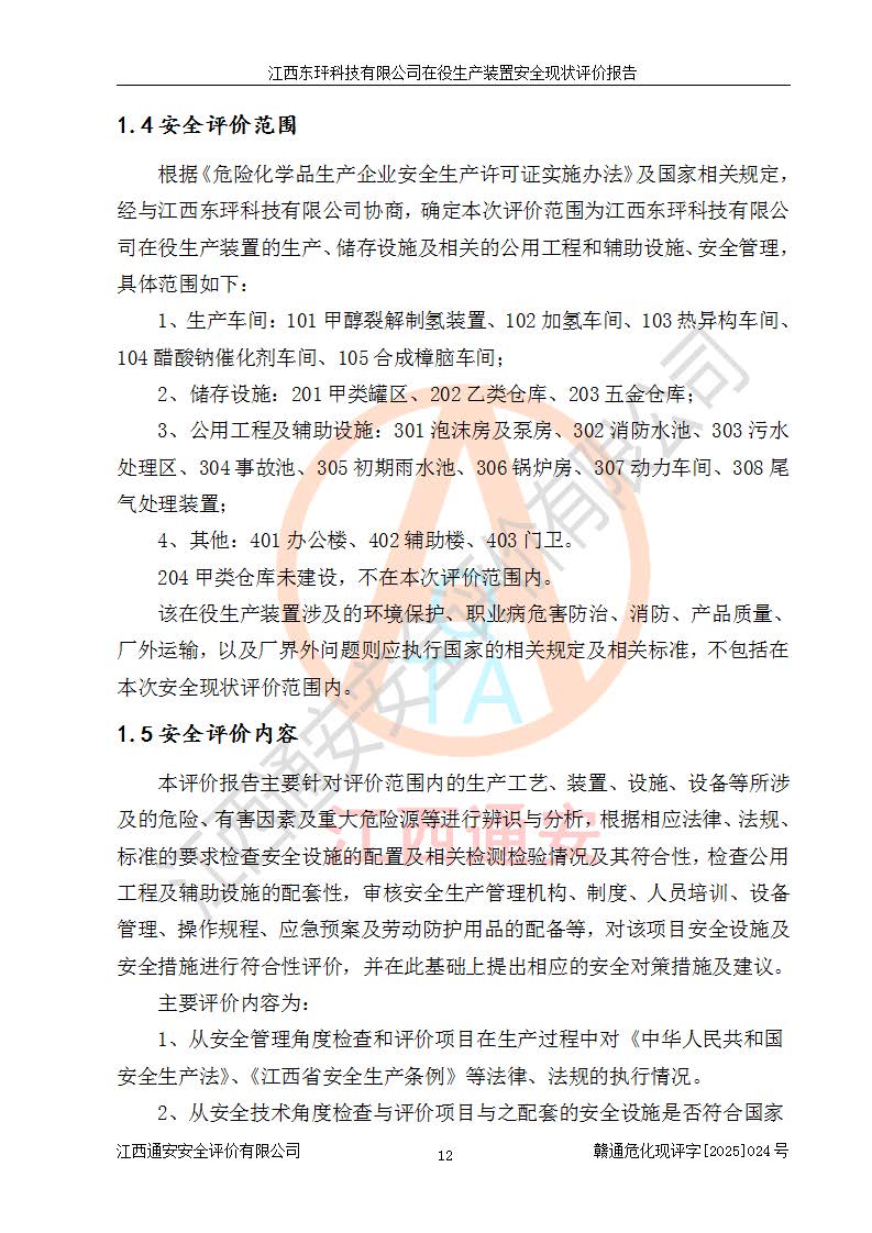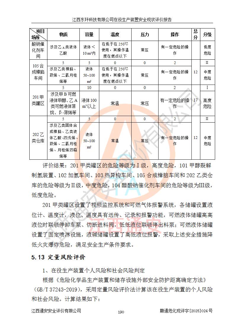江西東玶科技有限公司位于江西省吉安市吉水縣城西工業(yè)園區(qū),法定**人為徐東,成立于2018年04月08日,注冊(cè)資本叁仟貳佰叁拾萬(wàn)元整,經(jīng)營(yíng)范圍為合成樟腦、α-蒎烯、β-蒎烯、二氫月桂烯(含月桂烯)、莰烯、雙戊烯、氫氣(中間產(chǎn)品)的制造加工(憑**批準(zhǔn)證書(shū)經(jīng)營(yíng));白乙酯、雙萜烯等合成香料的制造加工等。 江西東玶科技有限公司2022年08月01日取得了《安全生產(chǎn)許可證》,許可證編號(hào):(贛)WH安許證字[2022]1160號(hào),許可范圍為合成樟腦(2000t/a)、二氫月桂烯(1000t/a)、月桂烯(3200t/a)、莰烯(1000t/a)、雙戊烯(810t/a)、雙萜烯(1070t/a)、α-蒎烯(7500t/a)、β-蒎烯(3200t/a)、白乙酯(500t/a),**期為2022年08月01日至2025年07月31日。該公司2023年5月29日取得了三級(jí)安全生產(chǎn)標(biāo)準(zhǔn)化證書(shū),證書(shū)編號(hào):贛AQBWHⅢ202300036,**期至2026年5月。該公司現(xiàn)有員工53人,其中專職安全生產(chǎn)管理人員2人。 因生產(chǎn)經(jīng)營(yíng)需要,江西東玶科技有限公司實(shí)施了年產(chǎn)12000噸松節(jié)油深加工系列產(chǎn)品項(xiàng)目(二期),并將二氫月桂烯的設(shè)計(jì)生產(chǎn)規(guī)模2000t/a變更為1500t/a,減少中間產(chǎn)品蒎烷的消耗量,剩余的蒎烷(720t/a)作為產(chǎn)品銷售。江西東玶科技有限公司委托深圳天陽(yáng)工程設(shè)計(jì)有限公司進(jìn)行了設(shè)計(jì)變更,按程序要求進(jìn)行了試生產(chǎn),委托評(píng)價(jià)公司編制了安全驗(yàn)收評(píng)價(jià)報(bào)告,并于2025年1月16日組織專家組和相關(guān)單位進(jìn)行了驗(yàn)收。驗(yàn)收完成后,江西東玶科技有限公司2025年06月04日對(duì)《安全生產(chǎn)許可證》進(jìn)行了變更,許可范圍變更為合成樟腦(2000t/a)、二氫月桂烯(1500t/a)、月桂烯(3200t/a)、莰烯(1000t/a)、雙戊烯(902.5t/a)、雙萜烯(1200.7t/a)、α-蒎烯(7500t/a)、β-蒎烯(3200t/a)、白乙酯(500t/a)、蒎烷(中間產(chǎn)品,720t/a)。 江西東玶科技有限公司在役生產(chǎn)裝置生產(chǎn)過(guò)程中涉及的主要原輔材料為松節(jié)油、乙酸、液堿、甲醇、碳酸鈉、二甲苯、偏鈦酸、甲酸、硫酸銅、雷尼鎳、離子膜、天然氣、氮?dú)?,中間產(chǎn)品為氫氣、α-蒎烯、β-蒎烯、蒎烷,產(chǎn)品為合成樟腦、二氫月桂烯、月桂烯、莰烯、雙戊烯、白乙酯、雙萜烯,副產(chǎn)品為醋酸鈉。根據(jù)《危險(xiǎn)化學(xué)品目錄》,該在役生產(chǎn)裝置涉及的松節(jié)油、乙酸、液堿、甲醇、二甲苯、甲酸、雷尼鎳、天然氣(燃料)、氮?dú)猓▔嚎s的)、柴油,中間產(chǎn)品α-蒎烯、β-蒎烯、氫氣、蒎烷和產(chǎn)品中合成樟腦、二氫月桂烯、月桂烯、莰烯、雙戊烯屬于危險(xiǎn)化學(xué)品。經(jīng)辨識(shí),甲醇、氫氣和天然氣(燃料)屬于重點(diǎn)監(jiān)管的危險(xiǎn)化學(xué)品,甲醇屬于特別管控的危險(xiǎn)化學(xué)品,不涉及監(jiān)控化學(xué)品、易制毒化學(xué)品、易制爆危險(xiǎn)化學(xué)品、劇毒化學(xué)品和高毒物品,生產(chǎn)、儲(chǔ)存單元不構(gòu)成危險(xiǎn)化學(xué)品重大危險(xiǎn)源,涉及的加氫工藝屬于重點(diǎn)監(jiān)管的危險(xiǎn)化工工藝。根據(jù)生產(chǎn)工藝特點(diǎn)及物料的理化特性可知,該在役生產(chǎn)裝置生產(chǎn)過(guò)程中存在火災(zāi)與爆炸、中毒與窒息、觸電、機(jī)械傷害、灼燙等危險(xiǎn)有害因素。 該公司自2022年08月01日取得安全生產(chǎn)許可證以來(lái),生產(chǎn)運(yùn)行正常,未發(fā)生一般及以上生產(chǎn)安全事故。 |