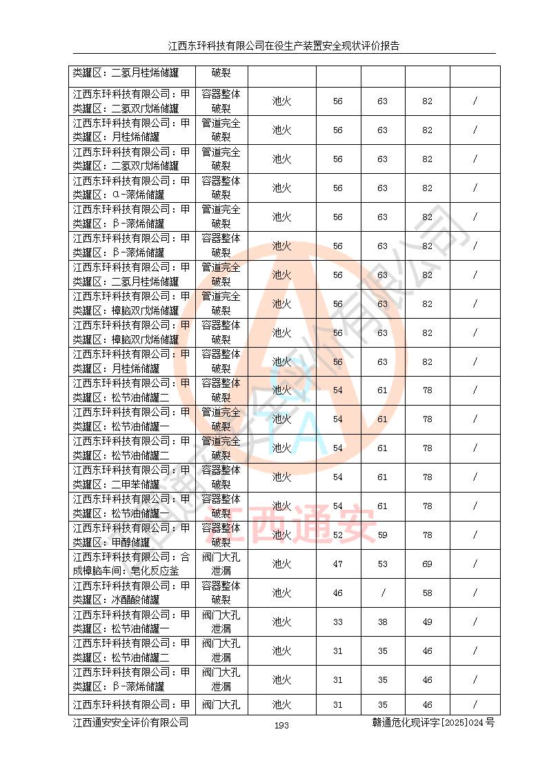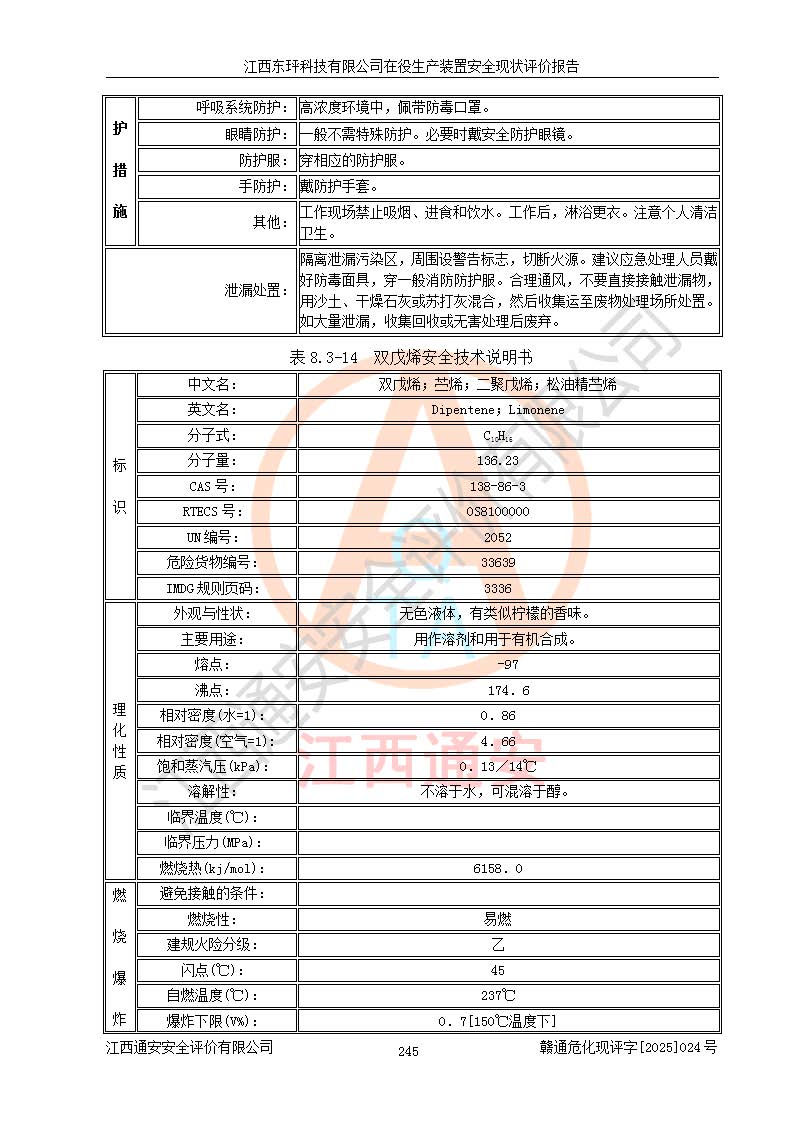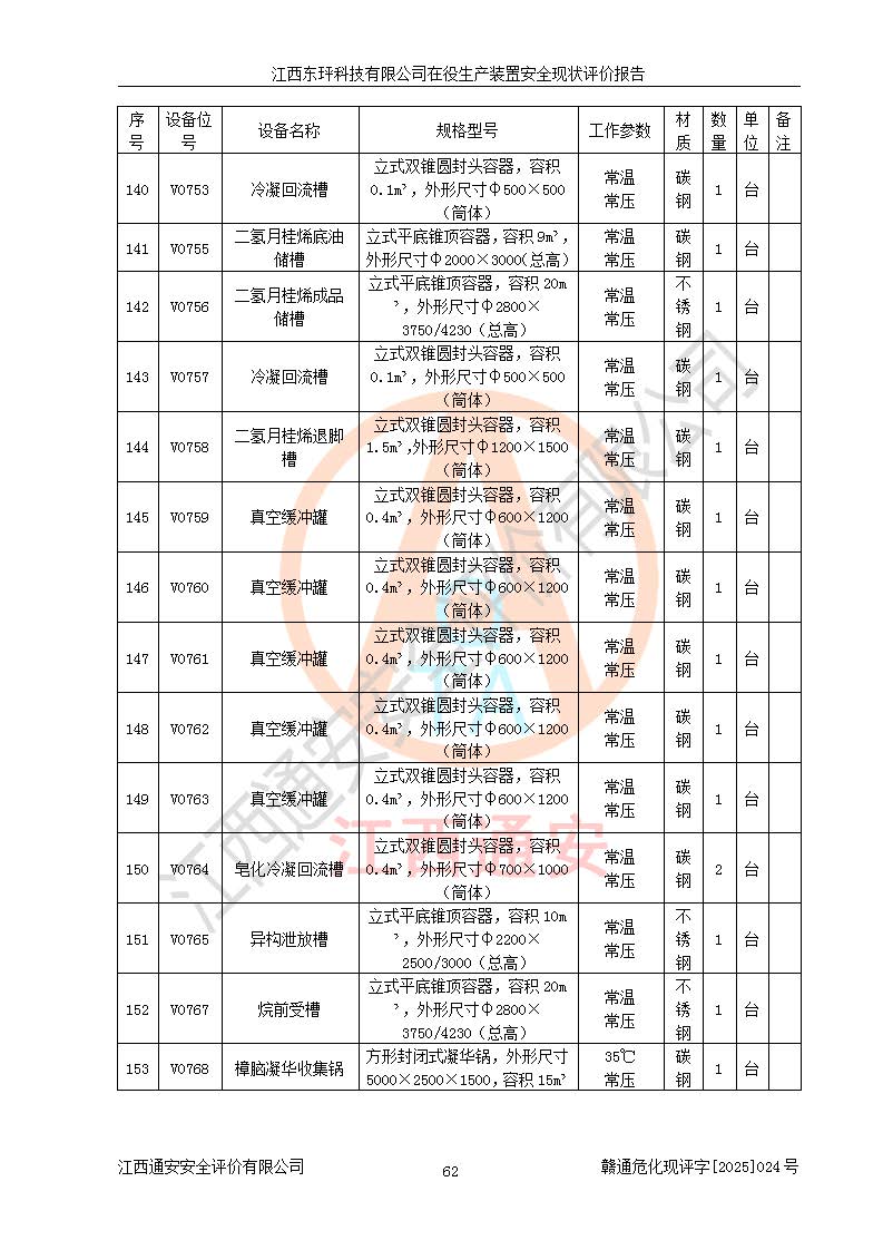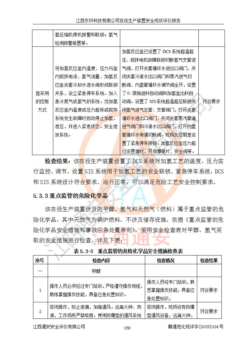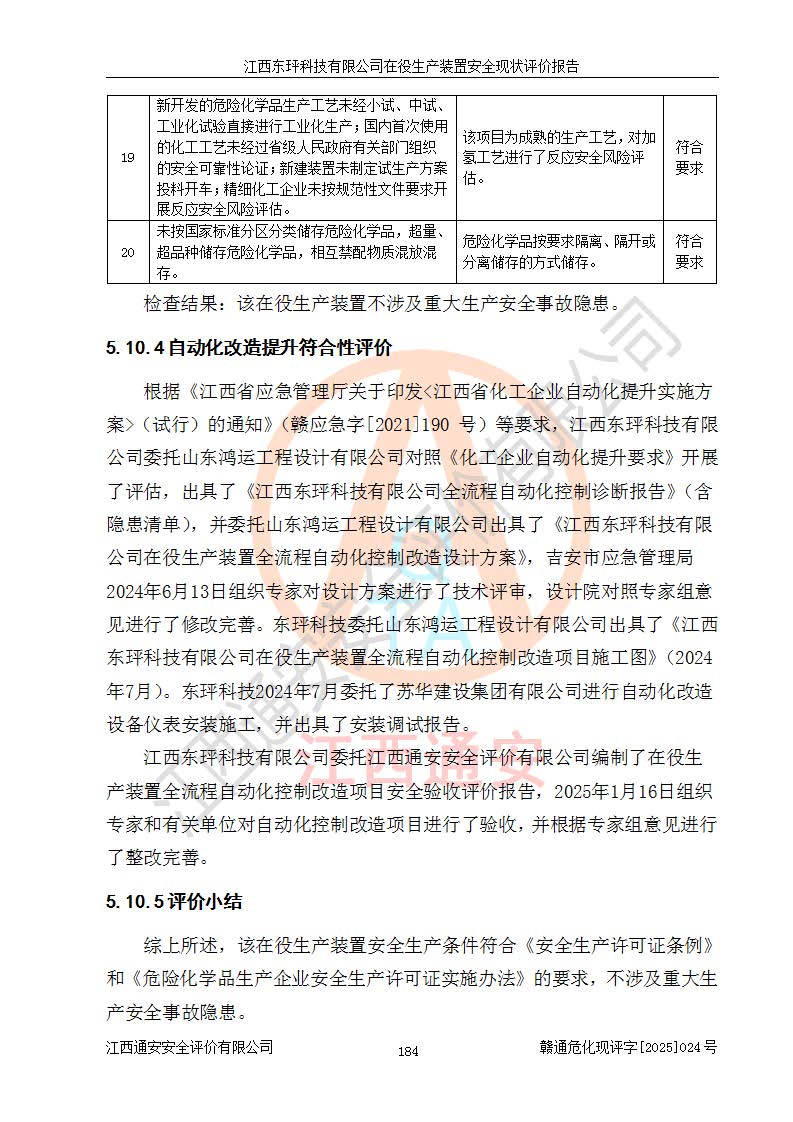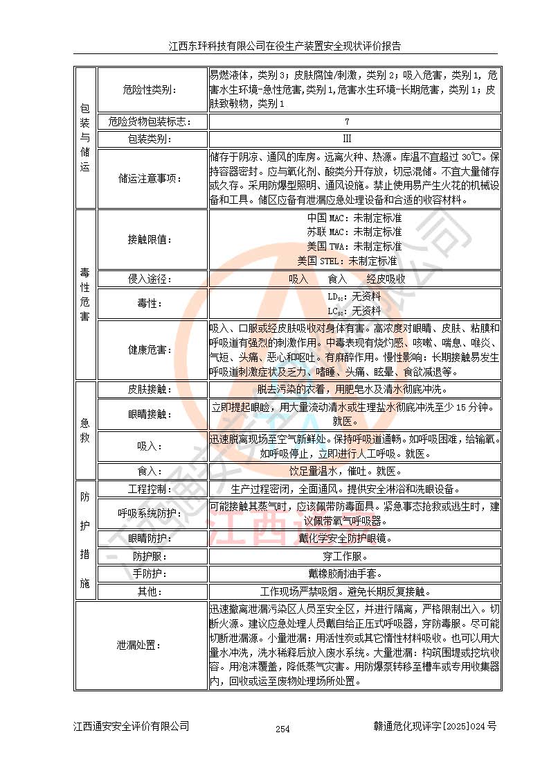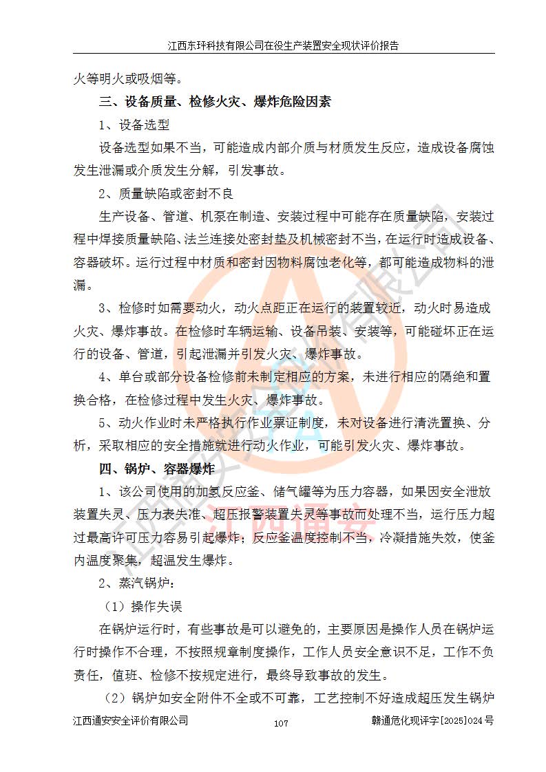 江西東玶科技有限公司位于江西省吉安市吉水縣城西工業(yè)園區(qū),法定**人為徐東,成立于2018年04月08日,注冊(cè)資本叁仟貳佰叁拾萬(wàn)元整,經(jīng)營(yíng)范圍為合成樟腦、α-蒎烯、β-蒎烯、二氫月桂烯(含月桂烯)、莰烯、雙戊烯、氫氣(中間產(chǎn)品)的制造加工(憑**批準(zhǔn)證書(shū)經(jīng)營(yíng));白乙酯、雙萜烯等合成香料的制造加工等。 江西東玶科技有限公司2022年08月01日取得了《安全生產(chǎn)許可證》,許可證編號(hào):(贛)WH安許證字[2022]1160號(hào),許可范圍為合成樟腦(2000t/a)、二氫月桂烯(1000t/a)、月桂烯(3200t/a)、莰烯(1000t/a)、雙戊烯(810t/a)、雙萜烯(1070t/a)、α-蒎烯(7500t/a)、β-蒎烯(3200t/a)、白乙酯(500t/a),**期為2022年08月01日至2025年07月31日。該公司2023年5月29日取得了三級(jí)安全生產(chǎn)標(biāo)準(zhǔn)化證書(shū),證書(shū)編號(hào):贛AQBWHⅢ202300036,**期至2026年5月。該公司現(xiàn)有員工53人,其中專職安全生產(chǎn)管理人員2人。 因生產(chǎn)經(jīng)營(yíng)需要,江西東玶科技有限公司實(shí)施了年產(chǎn)12000噸松節(jié)油深加工系列產(chǎn)品項(xiàng)目(二期),并將二氫月桂烯的設(shè)計(jì)生產(chǎn)規(guī)模2000t/a變更為1500t/a,減少中間產(chǎn)品蒎烷的消耗量,剩余的蒎烷(720t/a)作為產(chǎn)品銷售。江西東玶科技有限公司委托深圳天陽(yáng)工程設(shè)計(jì)有限公司進(jìn)行了設(shè)計(jì)變更,按程序要求進(jìn)行了試生產(chǎn),委托評(píng)價(jià)公司編制了安全驗(yàn)收評(píng)價(jià)報(bào)告,并于2025年1月16日組織專家組和相關(guān)單位進(jìn)行了驗(yàn)收。驗(yàn)收完成后,江西東玶科技有限公司2025年06月04日對(duì)《安全生產(chǎn)許可證》進(jìn)行了變更,許可范圍變更為合成樟腦(2000t/a)、二氫月桂烯(1500t/a)、月桂烯(3200t/a)、莰烯(1000t/a)、雙戊烯(902.5t/a)、雙萜烯(1200.7t/a)、α-蒎烯(7500t/a)、β-蒎烯(3200t/a)、白乙酯(500t/a)、蒎烷(中間產(chǎn)品,720t/a)。 江西東玶科技有限公司在役生產(chǎn)裝置生產(chǎn)過(guò)程中涉及的主要原輔材料為松節(jié)油、乙酸、液堿、甲醇、碳酸鈉、二甲苯、偏鈦酸、甲酸、硫酸銅、雷尼鎳、離子膜、天然氣、氮?dú)?,中間產(chǎn)品為氫氣、α-蒎烯、β-蒎烯、蒎烷,產(chǎn)品為合成樟腦、二氫月桂烯、月桂烯、莰烯、雙戊烯、白乙酯、雙萜烯,副產(chǎn)品為醋酸鈉。根據(jù)《危險(xiǎn)化學(xué)品目錄》,該在役生產(chǎn)裝置涉及的松節(jié)油、乙酸、液堿、甲醇、二甲苯、甲酸、雷尼鎳、天然氣(燃料)、氮?dú)猓▔嚎s的)、柴油,中間產(chǎn)品α-蒎烯、β-蒎烯、氫氣、蒎烷和產(chǎn)品中合成樟腦、二氫月桂烯、月桂烯、莰烯、雙戊烯屬于危險(xiǎn)化學(xué)品。經(jīng)辨識(shí),甲醇、氫氣和天然氣(燃料)屬于重點(diǎn)監(jiān)管的危險(xiǎn)化學(xué)品,甲醇屬于特別管控的危險(xiǎn)化學(xué)品,不涉及監(jiān)控化學(xué)品、易制毒化學(xué)品、易制爆危險(xiǎn)化學(xué)品、劇毒化學(xué)品和高毒物品,生產(chǎn)、儲(chǔ)存單元不構(gòu)成危險(xiǎn)化學(xué)品重大危險(xiǎn)源,涉及的加氫工藝屬于重點(diǎn)監(jiān)管的危險(xiǎn)化工工藝。根據(jù)生產(chǎn)工藝特點(diǎn)及物料的理化特性可知,該在役生產(chǎn)裝置生產(chǎn)過(guò)程中存在火災(zāi)與爆炸、中毒與窒息、觸電、機(jī)械傷害、灼燙等危險(xiǎn)有害因素。 該公司自2022年08月01日取得安全生產(chǎn)許可證以來(lái),生產(chǎn)運(yùn)行正常,未發(fā)生一般及以上生產(chǎn)安全事故。 |