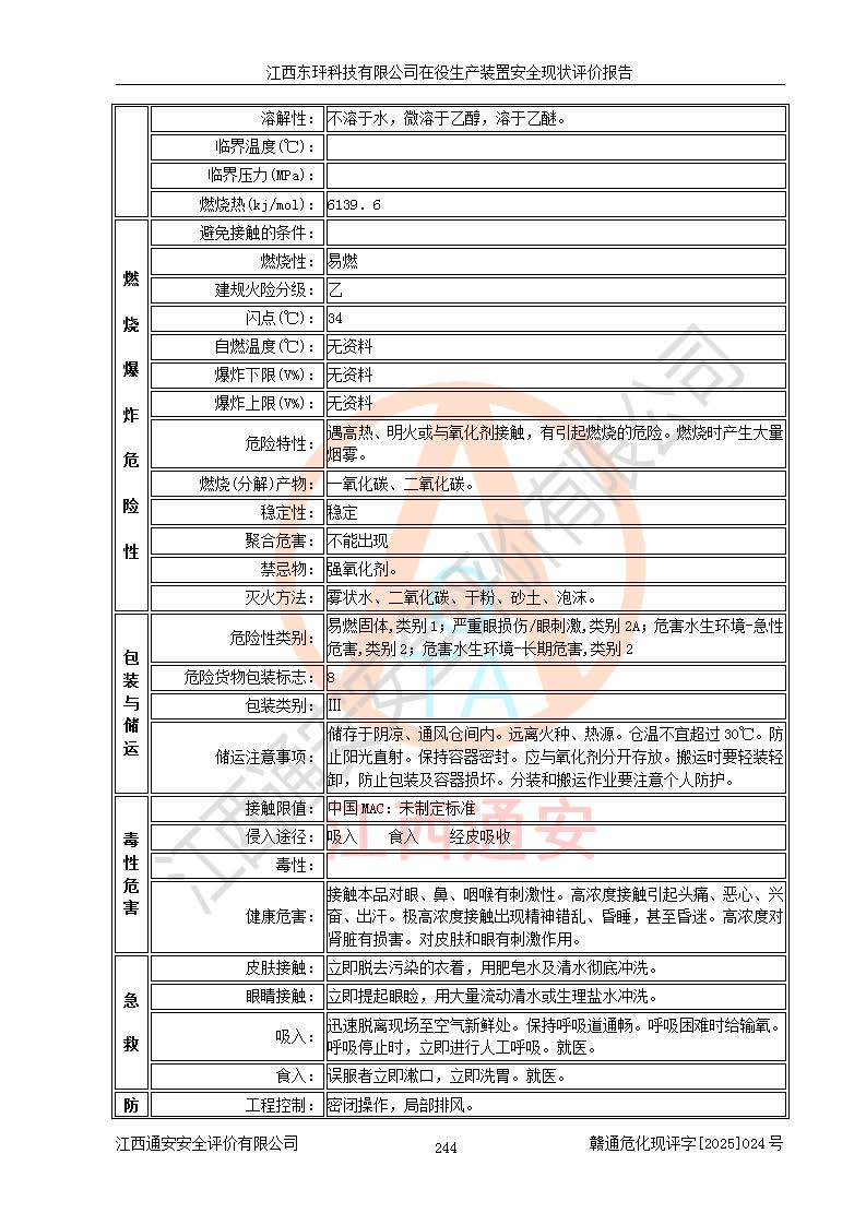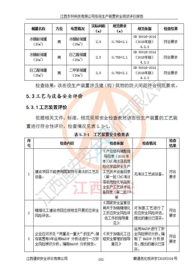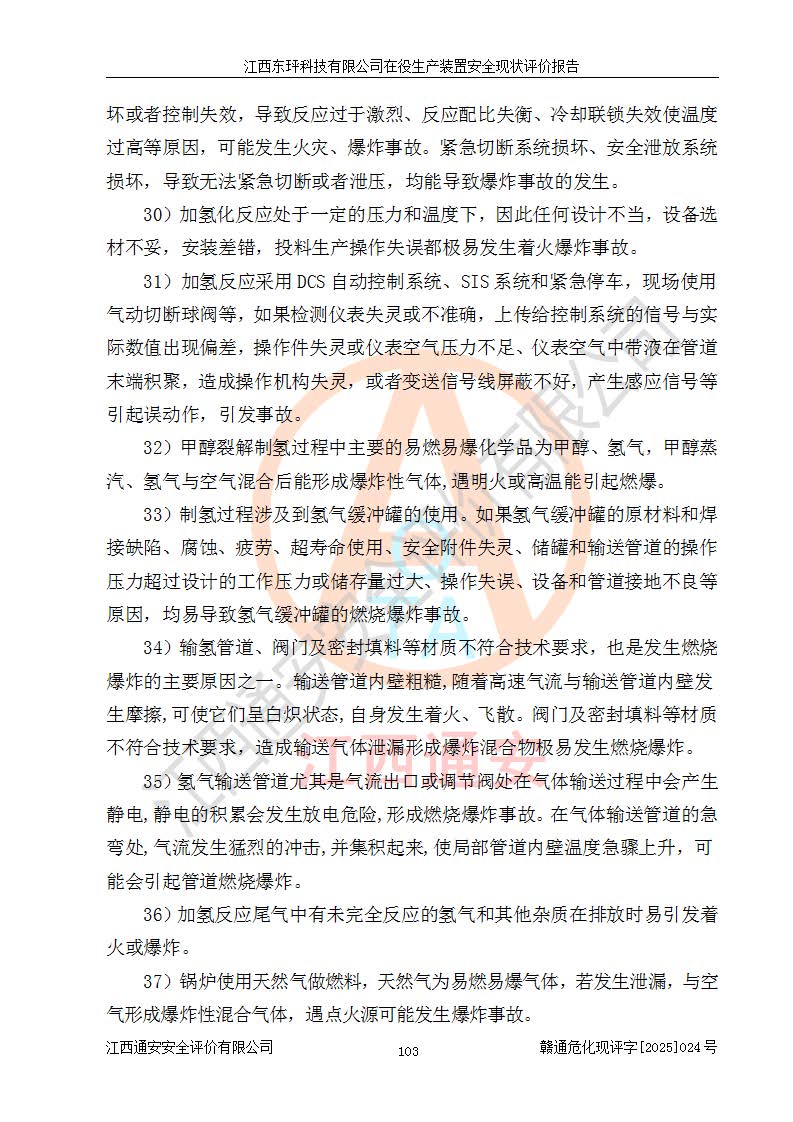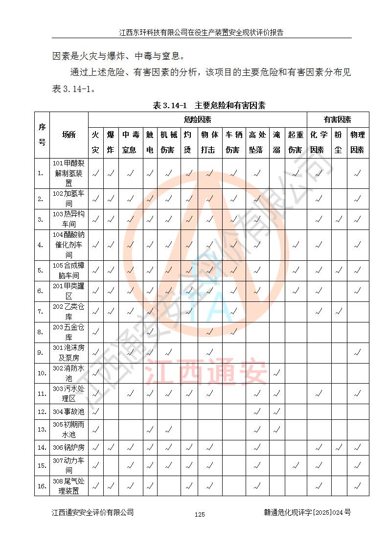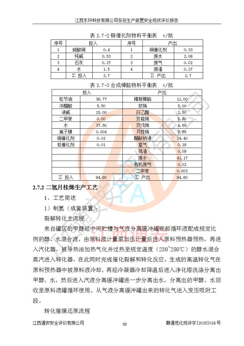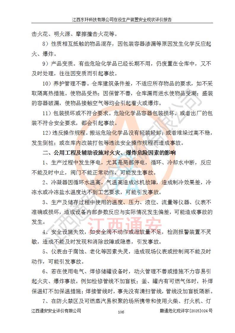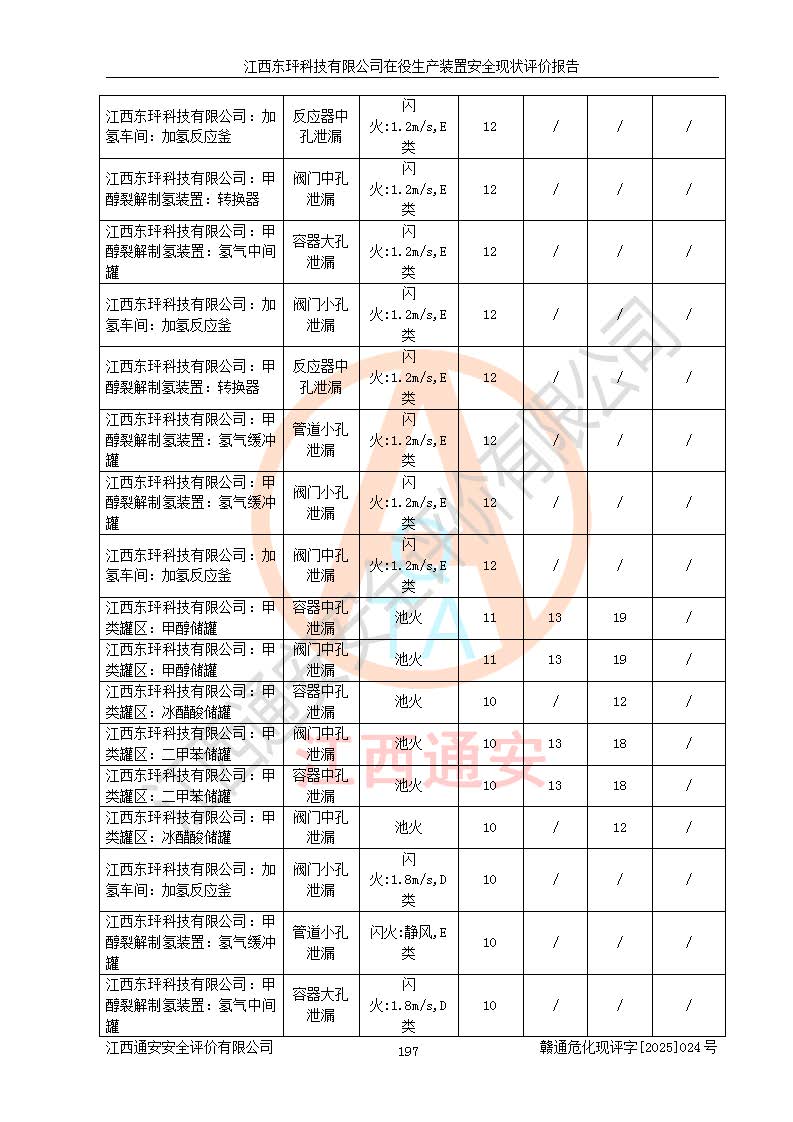 江西東玶科技有限公司位于江西省吉安市吉水縣城西工業(yè)園區(qū),法定**人為徐東,成立于2018年04月08日,注冊(cè)資本叁仟貳佰叁拾萬(wàn)元整,經(jīng)營(yíng)范圍為合成樟腦、α-蒎烯、β-蒎烯、二氫月桂烯(含月桂烯)、莰烯、雙戊烯、氫氣(中間產(chǎn)品)的制造加工(憑**批準(zhǔn)證書(shū)經(jīng)營(yíng));白乙酯、雙萜烯等合成香料的制造加工等。 江西東玶科技有限公司2022年08月01日取得了《安全生產(chǎn)許可證》,許可證編號(hào):(贛)WH安許證字[2022]1160號(hào),許可范圍為合成樟腦(2000t/a)、二氫月桂烯(1000t/a)、月桂烯(3200t/a)、莰烯(1000t/a)、雙戊烯(810t/a)、雙萜烯(1070t/a)、α-蒎烯(7500t/a)、β-蒎烯(3200t/a)、白乙酯(500t/a),**期為2022年08月01日至2025年07月31日。該公司2023年5月29日取得了三級(jí)安全生產(chǎn)標(biāo)準(zhǔn)化證書(shū),證書(shū)編號(hào):贛AQBWHⅢ202300036,**期至2026年5月。該公司現(xiàn)有員工53人,其中專職安全生產(chǎn)管理人員2人。 因生產(chǎn)經(jīng)營(yíng)需要,江西東玶科技有限公司實(shí)施了年產(chǎn)12000噸松節(jié)油深加工系列產(chǎn)品項(xiàng)目(二期),并將二氫月桂烯的設(shè)計(jì)生產(chǎn)規(guī)模2000t/a變更為1500t/a,減少中間產(chǎn)品蒎烷的消耗量,剩余的蒎烷(720t/a)作為產(chǎn)品銷售。江西東玶科技有限公司委托深圳天陽(yáng)工程設(shè)計(jì)有限公司進(jìn)行了設(shè)計(jì)變更,按程序要求進(jìn)行了試生產(chǎn),委托評(píng)價(jià)公司編制了安全驗(yàn)收評(píng)價(jià)報(bào)告,并于2025年1月16日組織專家組和相關(guān)單位進(jìn)行了驗(yàn)收。驗(yàn)收完成后,江西東玶科技有限公司2025年06月04日對(duì)《安全生產(chǎn)許可證》進(jìn)行了變更,許可范圍變更為合成樟腦(2000t/a)、二氫月桂烯(1500t/a)、月桂烯(3200t/a)、莰烯(1000t/a)、雙戊烯(902.5t/a)、雙萜烯(1200.7t/a)、α-蒎烯(7500t/a)、β-蒎烯(3200t/a)、白乙酯(500t/a)、蒎烷(中間產(chǎn)品,720t/a)。 江西東玶科技有限公司在役生產(chǎn)裝置生產(chǎn)過(guò)程中涉及的主要原輔材料為松節(jié)油、乙酸、液堿、甲醇、碳酸鈉、二甲苯、偏鈦酸、甲酸、硫酸銅、雷尼鎳、離子膜、天然氣、氮?dú)?,中間產(chǎn)品為氫氣、α-蒎烯、β-蒎烯、蒎烷,產(chǎn)品為合成樟腦、二氫月桂烯、月桂烯、莰烯、雙戊烯、白乙酯、雙萜烯,副產(chǎn)品為醋酸鈉。根據(jù)《危險(xiǎn)化學(xué)品目錄》,該在役生產(chǎn)裝置涉及的松節(jié)油、乙酸、液堿、甲醇、二甲苯、甲酸、雷尼鎳、天然氣(燃料)、氮?dú)猓▔嚎s的)、柴油,中間產(chǎn)品α-蒎烯、β-蒎烯、氫氣、蒎烷和產(chǎn)品中合成樟腦、二氫月桂烯、月桂烯、莰烯、雙戊烯屬于危險(xiǎn)化學(xué)品。經(jīng)辨識(shí),甲醇、氫氣和天然氣(燃料)屬于重點(diǎn)監(jiān)管的危險(xiǎn)化學(xué)品,甲醇屬于特別管控的危險(xiǎn)化學(xué)品,不涉及監(jiān)控化學(xué)品、易制毒化學(xué)品、易制爆危險(xiǎn)化學(xué)品、劇毒化學(xué)品和高毒物品,生產(chǎn)、儲(chǔ)存單元不構(gòu)成危險(xiǎn)化學(xué)品重大危險(xiǎn)源,涉及的加氫工藝屬于重點(diǎn)監(jiān)管的危險(xiǎn)化工工藝。根據(jù)生產(chǎn)工藝特點(diǎn)及物料的理化特性可知,該在役生產(chǎn)裝置生產(chǎn)過(guò)程中存在火災(zāi)與爆炸、中毒與窒息、觸電、機(jī)械傷害、灼燙等危險(xiǎn)有害因素。 該公司自2022年08月01日取得安全生產(chǎn)許可證以來(lái),生產(chǎn)運(yùn)行正常,未發(fā)生一般及以上生產(chǎn)安全事故。 |