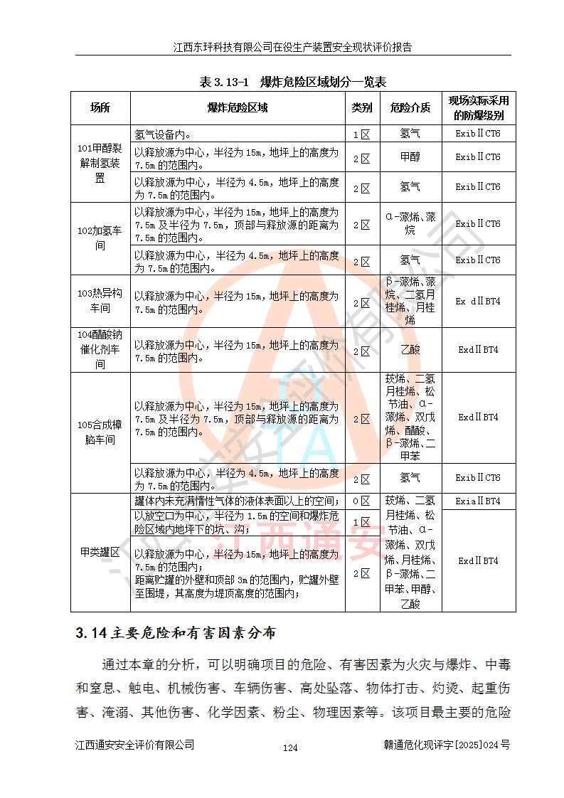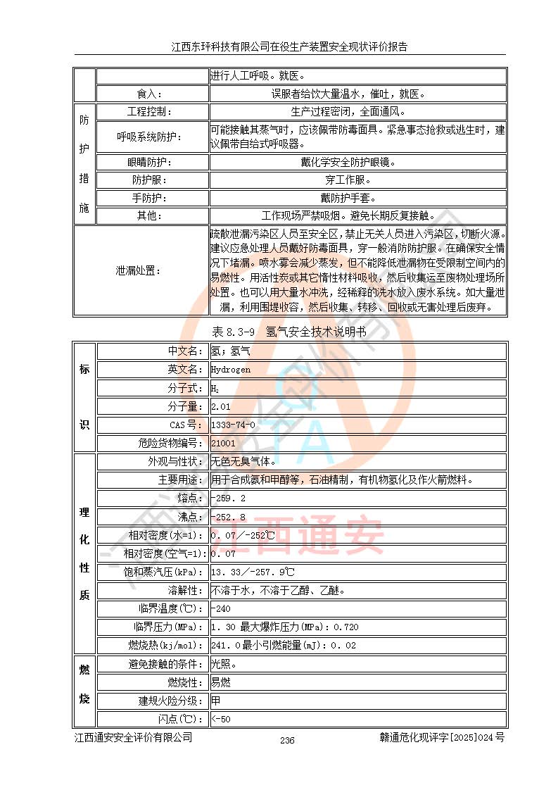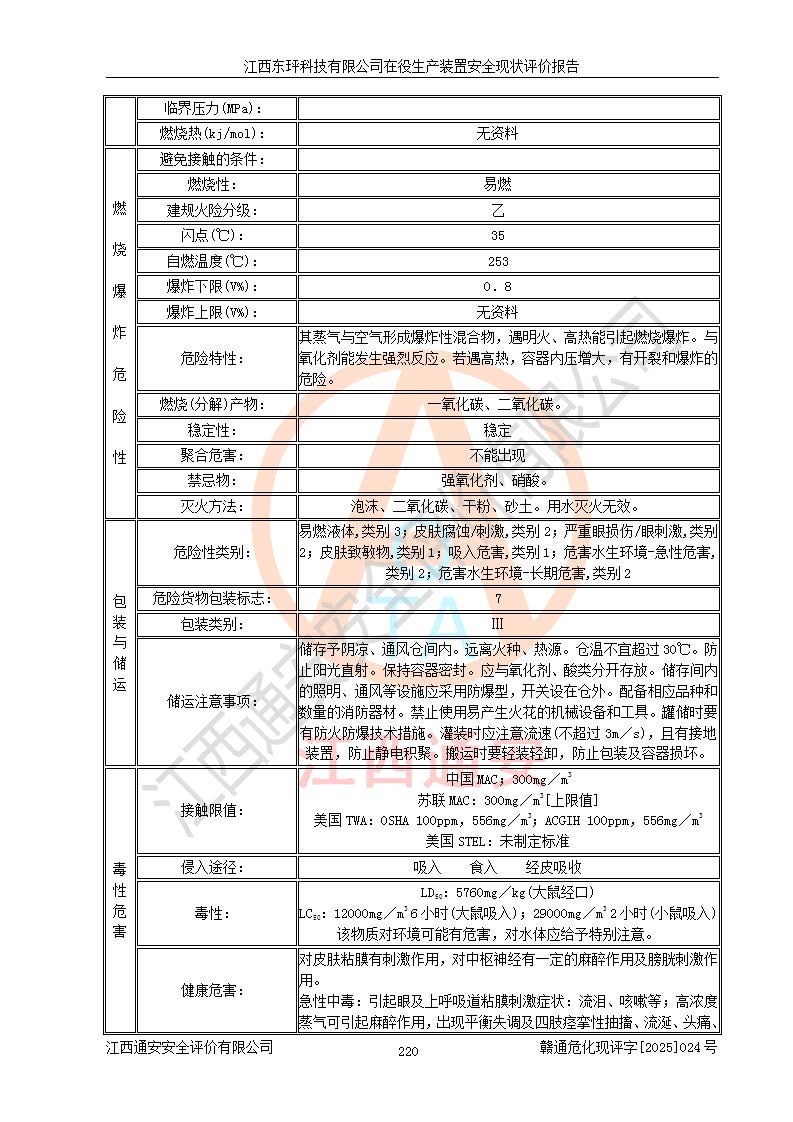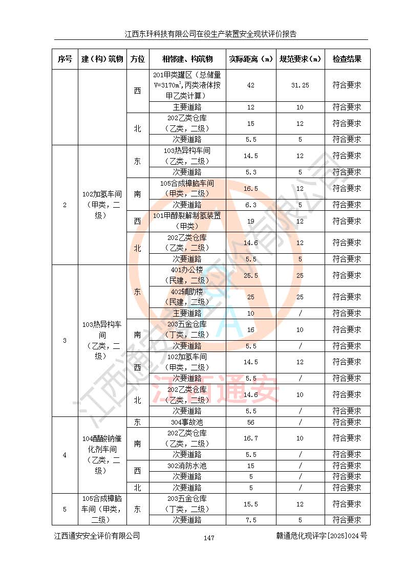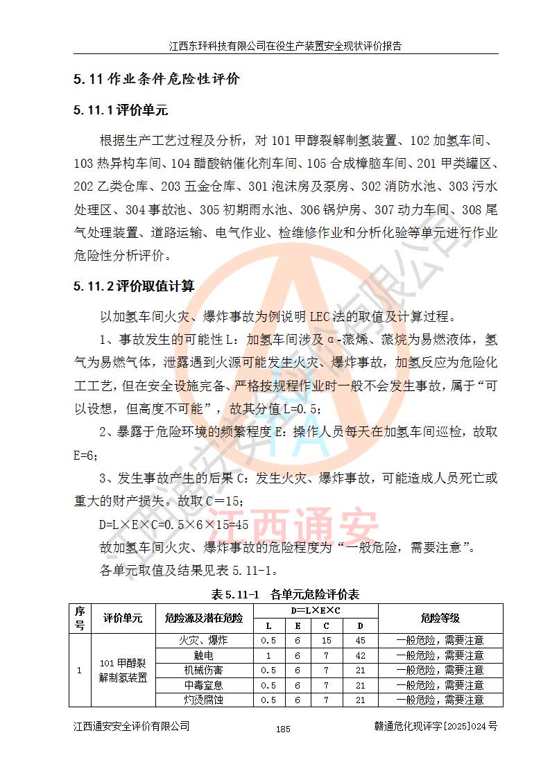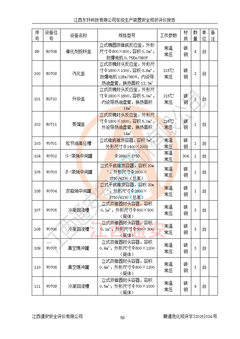 江西東玶科技有限公司位于江西省吉安市吉水縣城西工業(yè)園區(qū),法定**人為徐東,成立于2018年04月08日,注冊(cè)資本叁仟貳佰叁拾萬(wàn)元整,經(jīng)營(yíng)范圍為合成樟腦、α-蒎烯、β-蒎烯、二氫月桂烯(含月桂烯)、莰烯、雙戊烯、氫氣(中間產(chǎn)品)的制造加工(憑**批準(zhǔn)證書(shū)經(jīng)營(yíng));白乙酯、雙萜烯等合成香料的制造加工等。 江西東玶科技有限公司2022年08月01日取得了《安全生產(chǎn)許可證》,許可證編號(hào):(贛)WH安許證字[2022]1160號(hào),許可范圍為合成樟腦(2000t/a)、二氫月桂烯(1000t/a)、月桂烯(3200t/a)、莰烯(1000t/a)、雙戊烯(810t/a)、雙萜烯(1070t/a)、α-蒎烯(7500t/a)、β-蒎烯(3200t/a)、白乙酯(500t/a),**期為2022年08月01日至2025年07月31日。該公司2023年5月29日取得了三級(jí)安全生產(chǎn)標(biāo)準(zhǔn)化證書(shū),證書(shū)編號(hào):贛AQBWHⅢ202300036,**期至2026年5月。該公司現(xiàn)有員工53人,其中專職安全生產(chǎn)管理人員2人。 因生產(chǎn)經(jīng)營(yíng)需要,江西東玶科技有限公司實(shí)施了年產(chǎn)12000噸松節(jié)油深加工系列產(chǎn)品項(xiàng)目(二期),并將二氫月桂烯的設(shè)計(jì)生產(chǎn)規(guī)模2000t/a變更為1500t/a,減少中間產(chǎn)品蒎烷的消耗量,剩余的蒎烷(720t/a)作為產(chǎn)品銷售。江西東玶科技有限公司委托深圳天陽(yáng)工程設(shè)計(jì)有限公司進(jìn)行了設(shè)計(jì)變更,按程序要求進(jìn)行了試生產(chǎn),委托評(píng)價(jià)公司編制了安全驗(yàn)收評(píng)價(jià)報(bào)告,并于2025年1月16日組織專家組和相關(guān)單位進(jìn)行了驗(yàn)收。驗(yàn)收完成后,江西東玶科技有限公司2025年06月04日對(duì)《安全生產(chǎn)許可證》進(jìn)行了變更,許可范圍變更為合成樟腦(2000t/a)、二氫月桂烯(1500t/a)、月桂烯(3200t/a)、莰烯(1000t/a)、雙戊烯(902.5t/a)、雙萜烯(1200.7t/a)、α-蒎烯(7500t/a)、β-蒎烯(3200t/a)、白乙酯(500t/a)、蒎烷(中間產(chǎn)品,720t/a)。 江西東玶科技有限公司在役生產(chǎn)裝置生產(chǎn)過(guò)程中涉及的主要原輔材料為松節(jié)油、乙酸、液堿、甲醇、碳酸鈉、二甲苯、偏鈦酸、甲酸、硫酸銅、雷尼鎳、離子膜、天然氣、氮?dú)?,中間產(chǎn)品為氫氣、α-蒎烯、β-蒎烯、蒎烷,產(chǎn)品為合成樟腦、二氫月桂烯、月桂烯、莰烯、雙戊烯、白乙酯、雙萜烯,副產(chǎn)品為醋酸鈉。根據(jù)《危險(xiǎn)化學(xué)品目錄》,該在役生產(chǎn)裝置涉及的松節(jié)油、乙酸、液堿、甲醇、二甲苯、甲酸、雷尼鎳、天然氣(燃料)、氮?dú)猓▔嚎s的)、柴油,中間產(chǎn)品α-蒎烯、β-蒎烯、氫氣、蒎烷和產(chǎn)品中合成樟腦、二氫月桂烯、月桂烯、莰烯、雙戊烯屬于危險(xiǎn)化學(xué)品。經(jīng)辨識(shí),甲醇、氫氣和天然氣(燃料)屬于重點(diǎn)監(jiān)管的危險(xiǎn)化學(xué)品,甲醇屬于特別管控的危險(xiǎn)化學(xué)品,不涉及監(jiān)控化學(xué)品、易制毒化學(xué)品、易制爆危險(xiǎn)化學(xué)品、劇毒化學(xué)品和高毒物品,生產(chǎn)、儲(chǔ)存單元不構(gòu)成危險(xiǎn)化學(xué)品重大危險(xiǎn)源,涉及的加氫工藝屬于重點(diǎn)監(jiān)管的危險(xiǎn)化工工藝。根據(jù)生產(chǎn)工藝特點(diǎn)及物料的理化特性可知,該在役生產(chǎn)裝置生產(chǎn)過(guò)程中存在火災(zāi)與爆炸、中毒與窒息、觸電、機(jī)械傷害、灼燙等危險(xiǎn)有害因素。 該公司自2022年08月01日取得安全生產(chǎn)許可證以來(lái),生產(chǎn)運(yùn)行正常,未發(fā)生一般及以上生產(chǎn)安全事故。 |