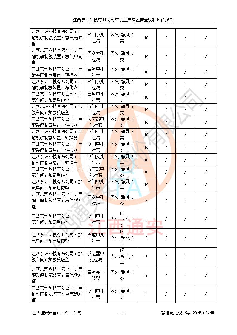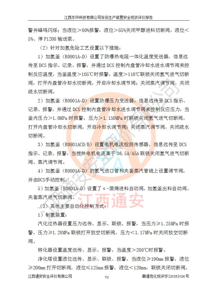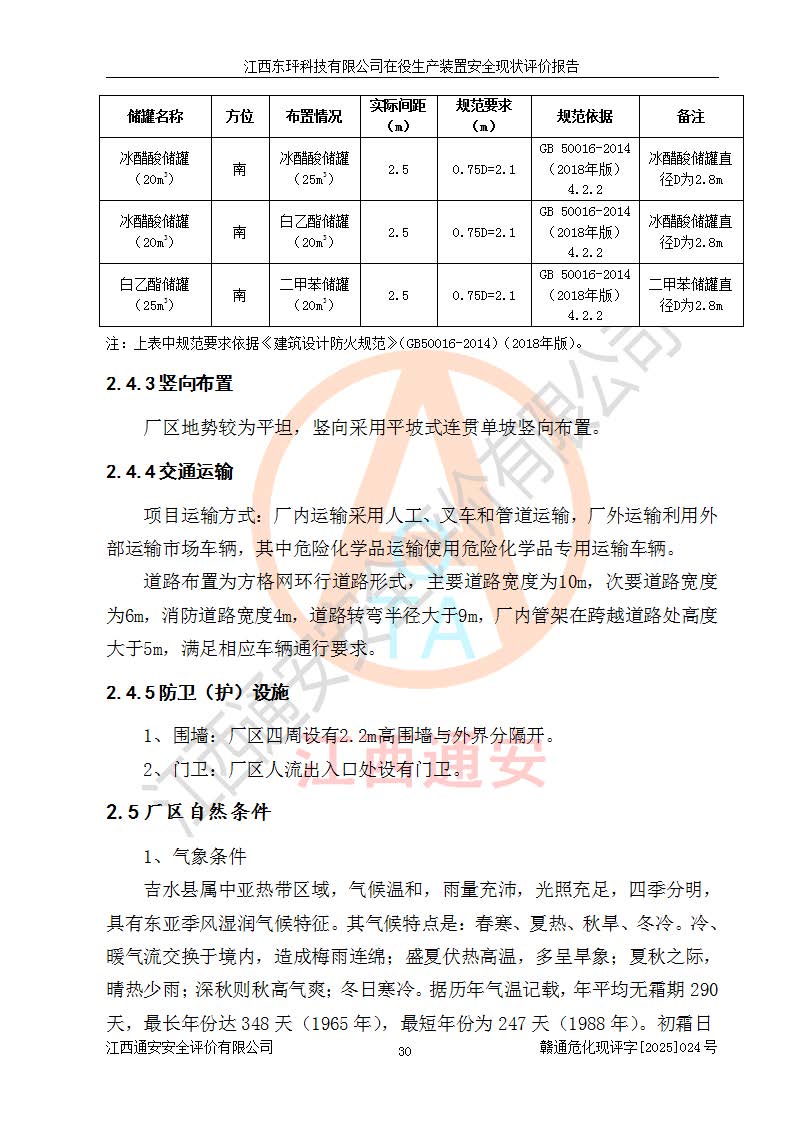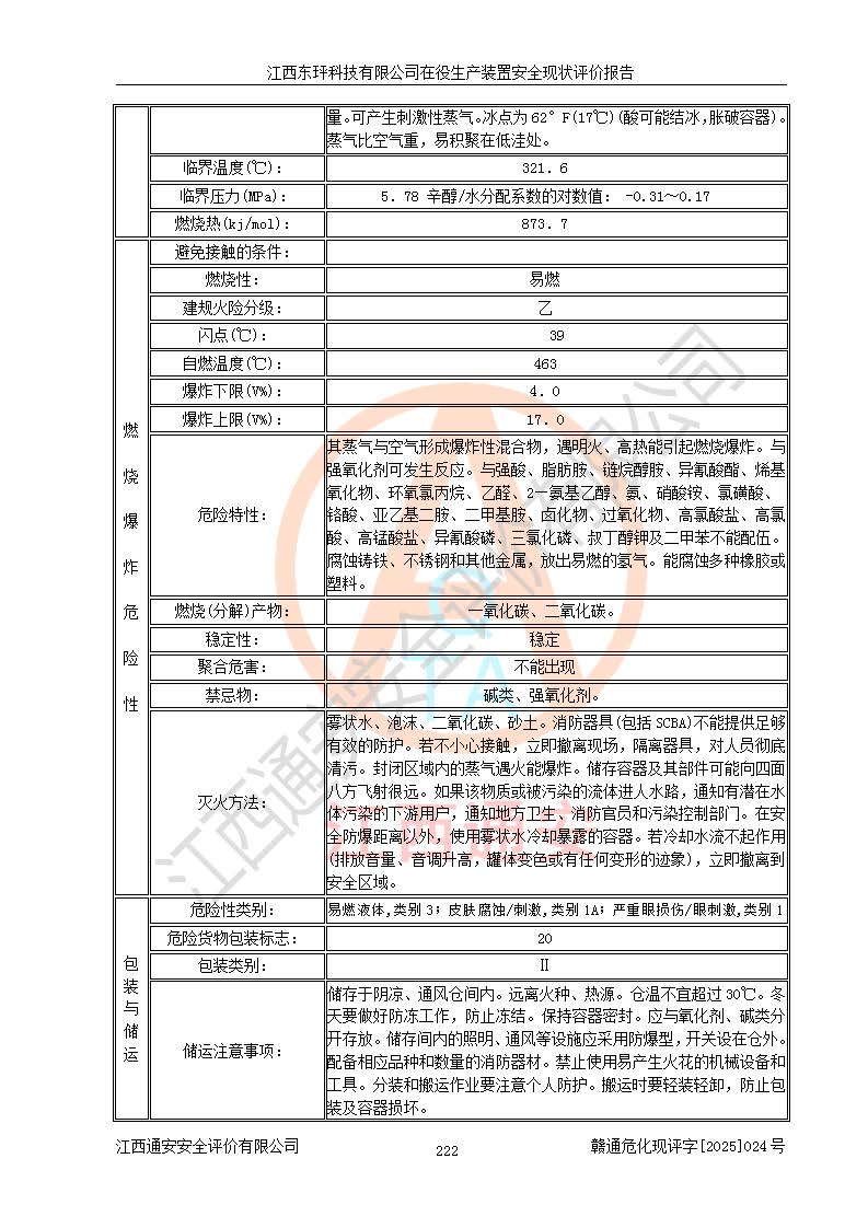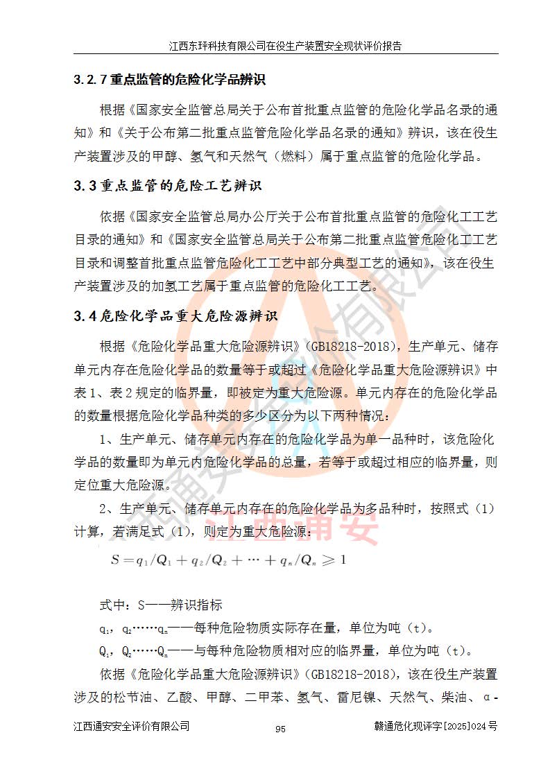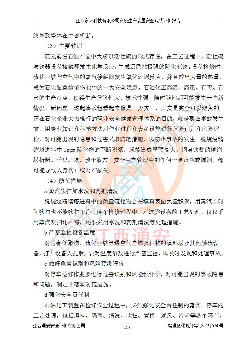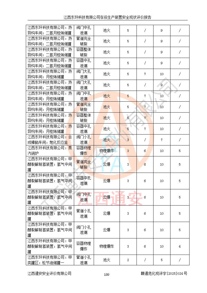 江西東玶科技有限公司位于江西省吉安市吉水縣城西工業(yè)園區(qū),法定**人為徐東,成立于2018年04月08日,注冊(cè)資本叁仟貳佰叁拾萬(wàn)元整,經(jīng)營(yíng)范圍為合成樟腦、α-蒎烯、β-蒎烯、二氫月桂烯(含月桂烯)、莰烯、雙戊烯、氫氣(中間產(chǎn)品)的制造加工(憑**批準(zhǔn)證書(shū)經(jīng)營(yíng));白乙酯、雙萜烯等合成香料的制造加工等。 江西東玶科技有限公司2022年08月01日取得了《安全生產(chǎn)許可證》,許可證編號(hào):(贛)WH安許證字[2022]1160號(hào),許可范圍為合成樟腦(2000t/a)、二氫月桂烯(1000t/a)、月桂烯(3200t/a)、莰烯(1000t/a)、雙戊烯(810t/a)、雙萜烯(1070t/a)、α-蒎烯(7500t/a)、β-蒎烯(3200t/a)、白乙酯(500t/a),**期為2022年08月01日至2025年07月31日。該公司2023年5月29日取得了三級(jí)安全生產(chǎn)標(biāo)準(zhǔn)化證書(shū),證書(shū)編號(hào):贛AQBWHⅢ202300036,**期至2026年5月。該公司現(xiàn)有員工53人,其中專職安全生產(chǎn)管理人員2人。 因生產(chǎn)經(jīng)營(yíng)需要,江西東玶科技有限公司實(shí)施了年產(chǎn)12000噸松節(jié)油深加工系列產(chǎn)品項(xiàng)目(二期),并將二氫月桂烯的設(shè)計(jì)生產(chǎn)規(guī)模2000t/a變更為1500t/a,減少中間產(chǎn)品蒎烷的消耗量,剩余的蒎烷(720t/a)作為產(chǎn)品銷售。江西東玶科技有限公司委托深圳天陽(yáng)工程設(shè)計(jì)有限公司進(jìn)行了設(shè)計(jì)變更,按程序要求進(jìn)行了試生產(chǎn),委托評(píng)價(jià)公司編制了安全驗(yàn)收評(píng)價(jià)報(bào)告,并于2025年1月16日組織專家組和相關(guān)單位進(jìn)行了驗(yàn)收。驗(yàn)收完成后,江西東玶科技有限公司2025年06月04日對(duì)《安全生產(chǎn)許可證》進(jìn)行了變更,許可范圍變更為合成樟腦(2000t/a)、二氫月桂烯(1500t/a)、月桂烯(3200t/a)、莰烯(1000t/a)、雙戊烯(902.5t/a)、雙萜烯(1200.7t/a)、α-蒎烯(7500t/a)、β-蒎烯(3200t/a)、白乙酯(500t/a)、蒎烷(中間產(chǎn)品,720t/a)。 江西東玶科技有限公司在役生產(chǎn)裝置生產(chǎn)過(guò)程中涉及的主要原輔材料為松節(jié)油、乙酸、液堿、甲醇、碳酸鈉、二甲苯、偏鈦酸、甲酸、硫酸銅、雷尼鎳、離子膜、天然氣、氮?dú)?,中間產(chǎn)品為氫氣、α-蒎烯、β-蒎烯、蒎烷,產(chǎn)品為合成樟腦、二氫月桂烯、月桂烯、莰烯、雙戊烯、白乙酯、雙萜烯,副產(chǎn)品為醋酸鈉。根據(jù)《危險(xiǎn)化學(xué)品目錄》,該在役生產(chǎn)裝置涉及的松節(jié)油、乙酸、液堿、甲醇、二甲苯、甲酸、雷尼鎳、天然氣(燃料)、氮?dú)猓▔嚎s的)、柴油,中間產(chǎn)品α-蒎烯、β-蒎烯、氫氣、蒎烷和產(chǎn)品中合成樟腦、二氫月桂烯、月桂烯、莰烯、雙戊烯屬于危險(xiǎn)化學(xué)品。經(jīng)辨識(shí),甲醇、氫氣和天然氣(燃料)屬于重點(diǎn)監(jiān)管的危險(xiǎn)化學(xué)品,甲醇屬于特別管控的危險(xiǎn)化學(xué)品,不涉及監(jiān)控化學(xué)品、易制毒化學(xué)品、易制爆危險(xiǎn)化學(xué)品、劇毒化學(xué)品和高毒物品,生產(chǎn)、儲(chǔ)存單元不構(gòu)成危險(xiǎn)化學(xué)品重大危險(xiǎn)源,涉及的加氫工藝屬于重點(diǎn)監(jiān)管的危險(xiǎn)化工工藝。根據(jù)生產(chǎn)工藝特點(diǎn)及物料的理化特性可知,該在役生產(chǎn)裝置生產(chǎn)過(guò)程中存在火災(zāi)與爆炸、中毒與窒息、觸電、機(jī)械傷害、灼燙等危險(xiǎn)有害因素。 該公司自2022年08月01日取得安全生產(chǎn)許可證以來(lái),生產(chǎn)運(yùn)行正常,未發(fā)生一般及以上生產(chǎn)安全事故。 |