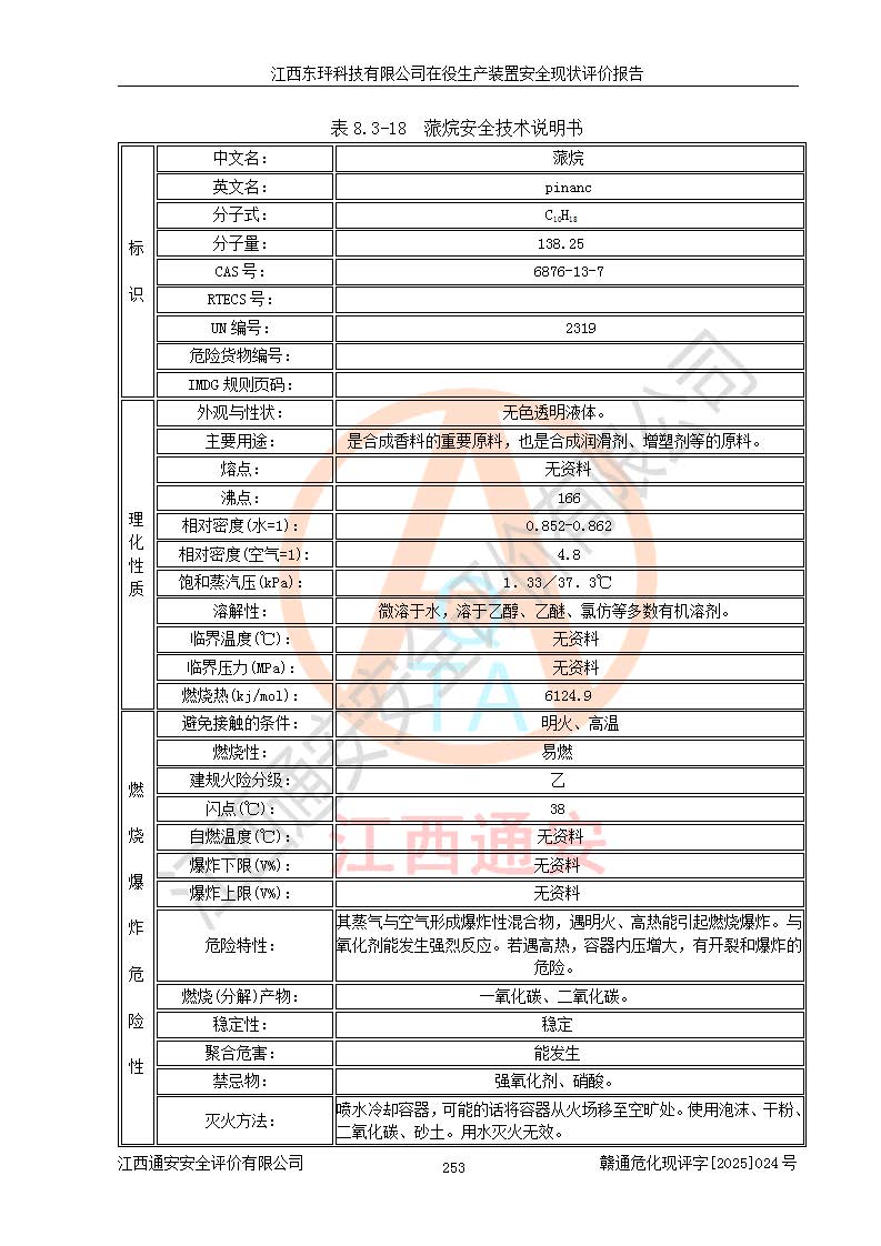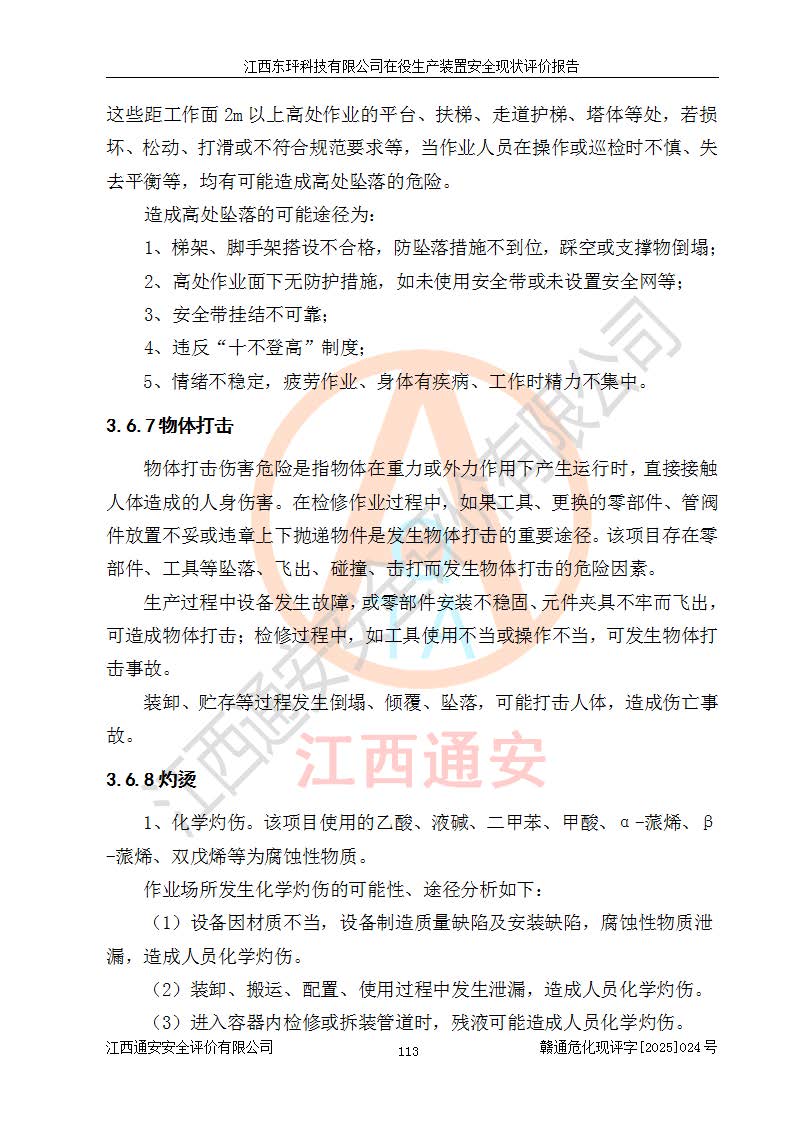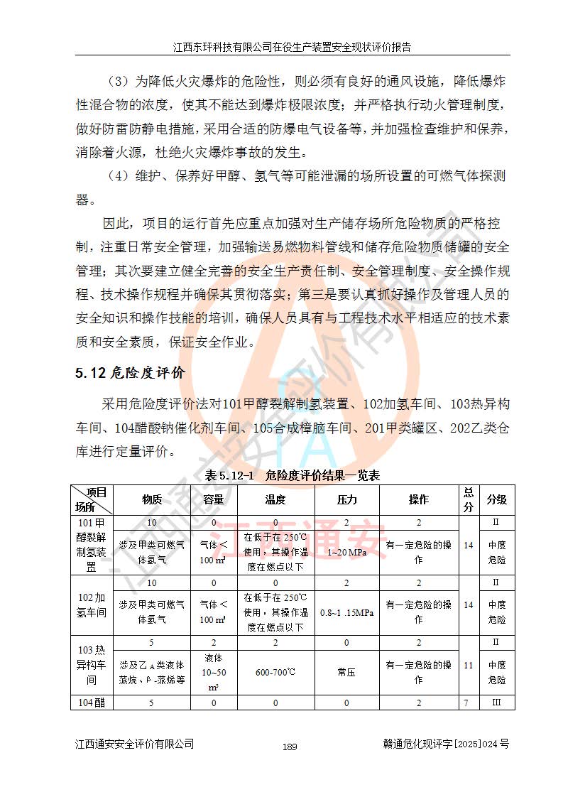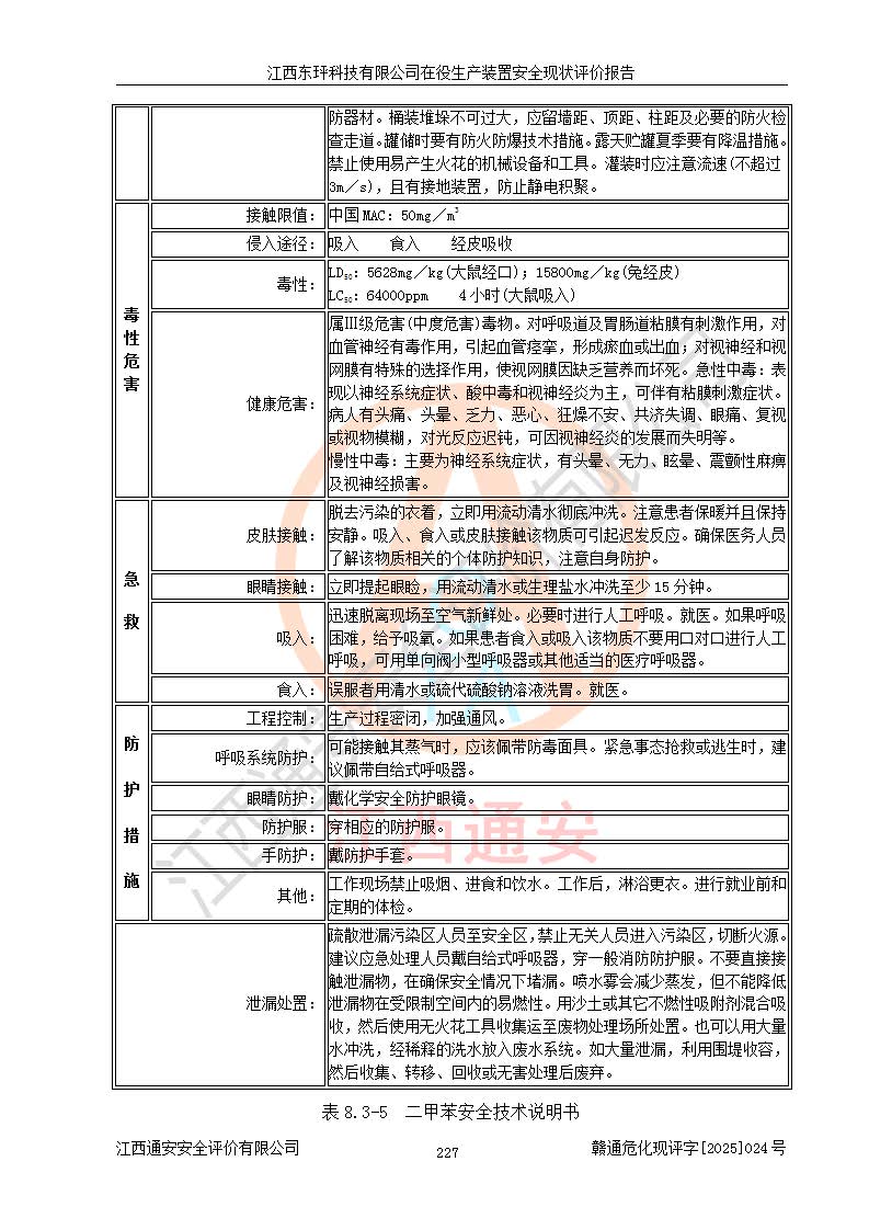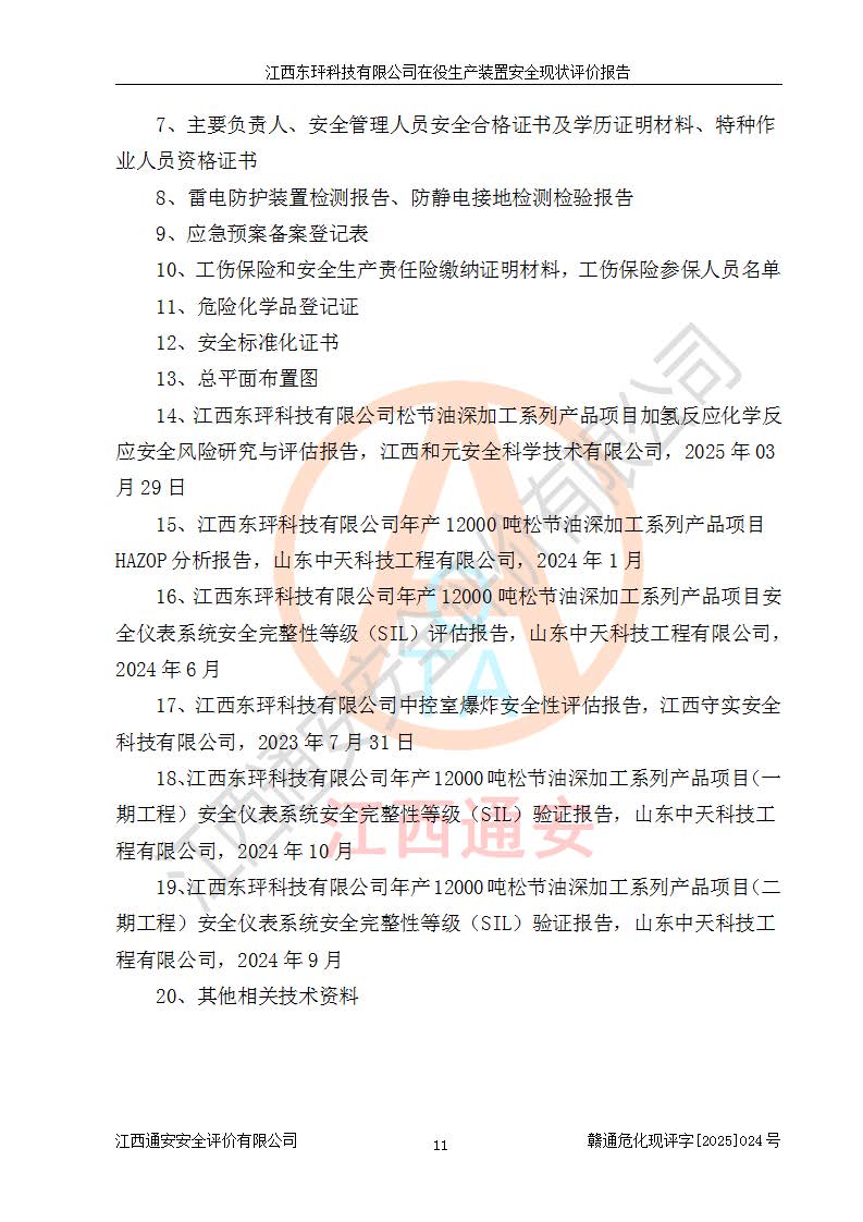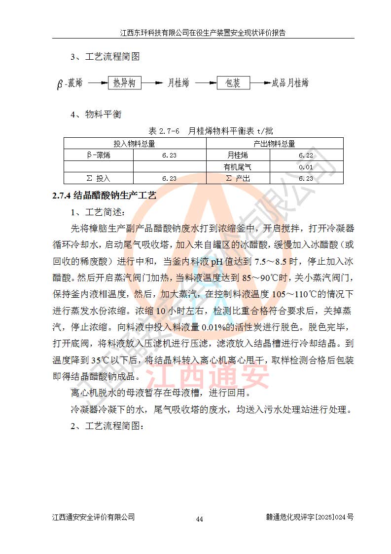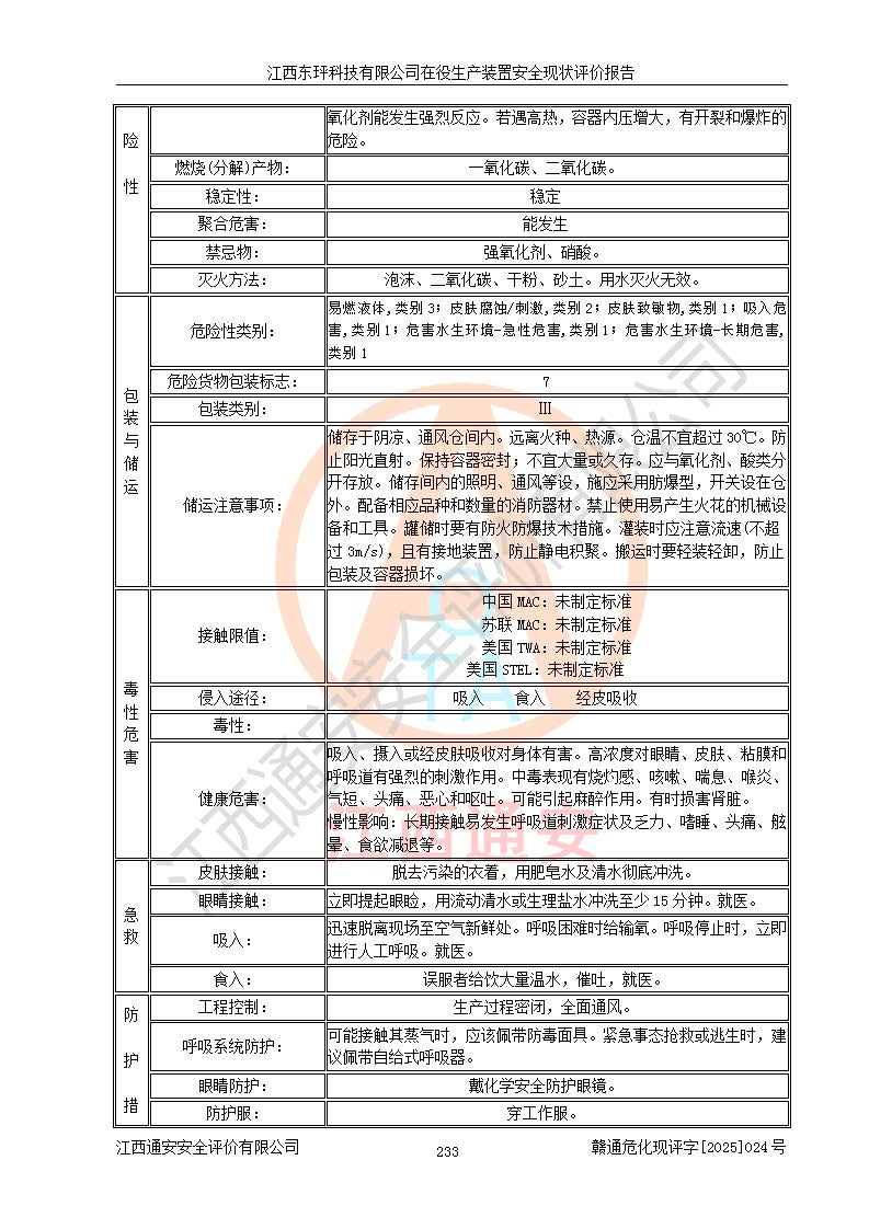 江西東玶科技有限公司位于江西省吉安市吉水縣城西工業(yè)園區(qū),法定**人為徐東,成立于2018年04月08日,注冊(cè)資本叁仟貳佰叁拾萬(wàn)元整,經(jīng)營(yíng)范圍為合成樟腦、α-蒎烯、β-蒎烯、二氫月桂烯(含月桂烯)、莰烯、雙戊烯、氫氣(中間產(chǎn)品)的制造加工(憑**批準(zhǔn)證書(shū)經(jīng)營(yíng));白乙酯、雙萜烯等合成香料的制造加工等。 江西東玶科技有限公司2022年08月01日取得了《安全生產(chǎn)許可證》,許可證編號(hào):(贛)WH安許證字[2022]1160號(hào),許可范圍為合成樟腦(2000t/a)、二氫月桂烯(1000t/a)、月桂烯(3200t/a)、莰烯(1000t/a)、雙戊烯(810t/a)、雙萜烯(1070t/a)、α-蒎烯(7500t/a)、β-蒎烯(3200t/a)、白乙酯(500t/a),**期為2022年08月01日至2025年07月31日。該公司2023年5月29日取得了三級(jí)安全生產(chǎn)標(biāo)準(zhǔn)化證書(shū),證書(shū)編號(hào):贛AQBWHⅢ202300036,**期至2026年5月。該公司現(xiàn)有員工53人,其中專職安全生產(chǎn)管理人員2人。 因生產(chǎn)經(jīng)營(yíng)需要,江西東玶科技有限公司實(shí)施了年產(chǎn)12000噸松節(jié)油深加工系列產(chǎn)品項(xiàng)目(二期),并將二氫月桂烯的設(shè)計(jì)生產(chǎn)規(guī)模2000t/a變更為1500t/a,減少中間產(chǎn)品蒎烷的消耗量,剩余的蒎烷(720t/a)作為產(chǎn)品銷售。江西東玶科技有限公司委托深圳天陽(yáng)工程設(shè)計(jì)有限公司進(jìn)行了設(shè)計(jì)變更,按程序要求進(jìn)行了試生產(chǎn),委托評(píng)價(jià)公司編制了安全驗(yàn)收評(píng)價(jià)報(bào)告,并于2025年1月16日組織專家組和相關(guān)單位進(jìn)行了驗(yàn)收。驗(yàn)收完成后,江西東玶科技有限公司2025年06月04日對(duì)《安全生產(chǎn)許可證》進(jìn)行了變更,許可范圍變更為合成樟腦(2000t/a)、二氫月桂烯(1500t/a)、月桂烯(3200t/a)、莰烯(1000t/a)、雙戊烯(902.5t/a)、雙萜烯(1200.7t/a)、α-蒎烯(7500t/a)、β-蒎烯(3200t/a)、白乙酯(500t/a)、蒎烷(中間產(chǎn)品,720t/a)。 江西東玶科技有限公司在役生產(chǎn)裝置生產(chǎn)過(guò)程中涉及的主要原輔材料為松節(jié)油、乙酸、液堿、甲醇、碳酸鈉、二甲苯、偏鈦酸、甲酸、硫酸銅、雷尼鎳、離子膜、天然氣、氮?dú)?,中間產(chǎn)品為氫氣、α-蒎烯、β-蒎烯、蒎烷,產(chǎn)品為合成樟腦、二氫月桂烯、月桂烯、莰烯、雙戊烯、白乙酯、雙萜烯,副產(chǎn)品為醋酸鈉。根據(jù)《危險(xiǎn)化學(xué)品目錄》,該在役生產(chǎn)裝置涉及的松節(jié)油、乙酸、液堿、甲醇、二甲苯、甲酸、雷尼鎳、天然氣(燃料)、氮?dú)猓▔嚎s的)、柴油,中間產(chǎn)品α-蒎烯、β-蒎烯、氫氣、蒎烷和產(chǎn)品中合成樟腦、二氫月桂烯、月桂烯、莰烯、雙戊烯屬于危險(xiǎn)化學(xué)品。經(jīng)辨識(shí),甲醇、氫氣和天然氣(燃料)屬于重點(diǎn)監(jiān)管的危險(xiǎn)化學(xué)品,甲醇屬于特別管控的危險(xiǎn)化學(xué)品,不涉及監(jiān)控化學(xué)品、易制毒化學(xué)品、易制爆危險(xiǎn)化學(xué)品、劇毒化學(xué)品和高毒物品,生產(chǎn)、儲(chǔ)存單元不構(gòu)成危險(xiǎn)化學(xué)品重大危險(xiǎn)源,涉及的加氫工藝屬于重點(diǎn)監(jiān)管的危險(xiǎn)化工工藝。根據(jù)生產(chǎn)工藝特點(diǎn)及物料的理化特性可知,該在役生產(chǎn)裝置生產(chǎn)過(guò)程中存在火災(zāi)與爆炸、中毒與窒息、觸電、機(jī)械傷害、灼燙等危險(xiǎn)有害因素。 該公司自2022年08月01日取得安全生產(chǎn)許可證以來(lái),生產(chǎn)運(yùn)行正常,未發(fā)生一般及以上生產(chǎn)安全事故。 |