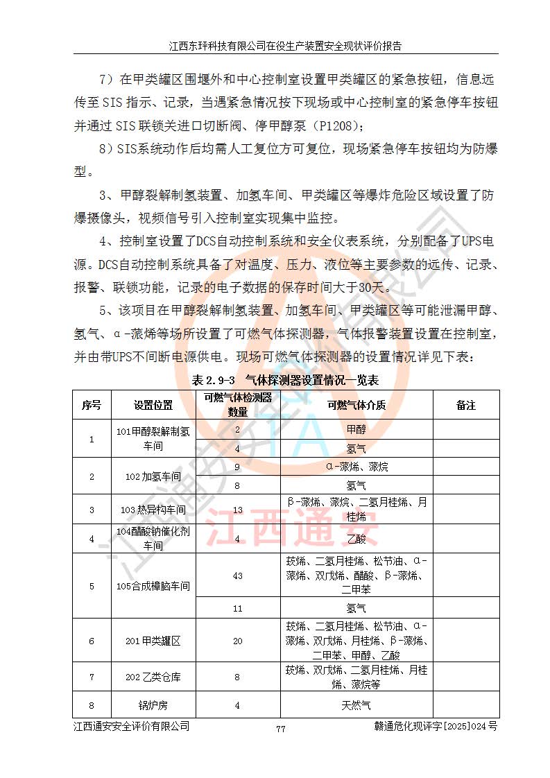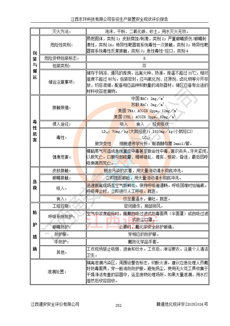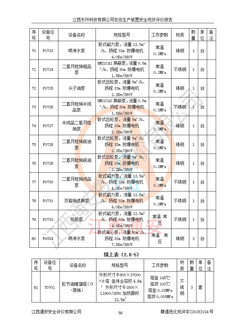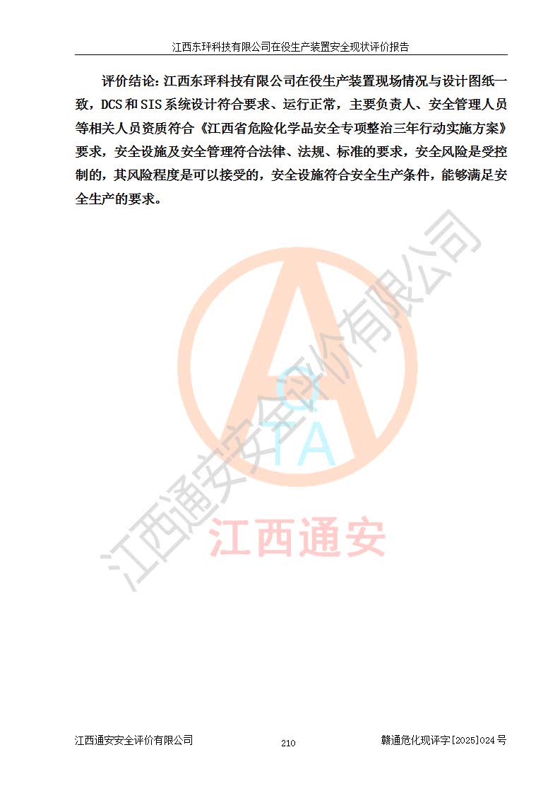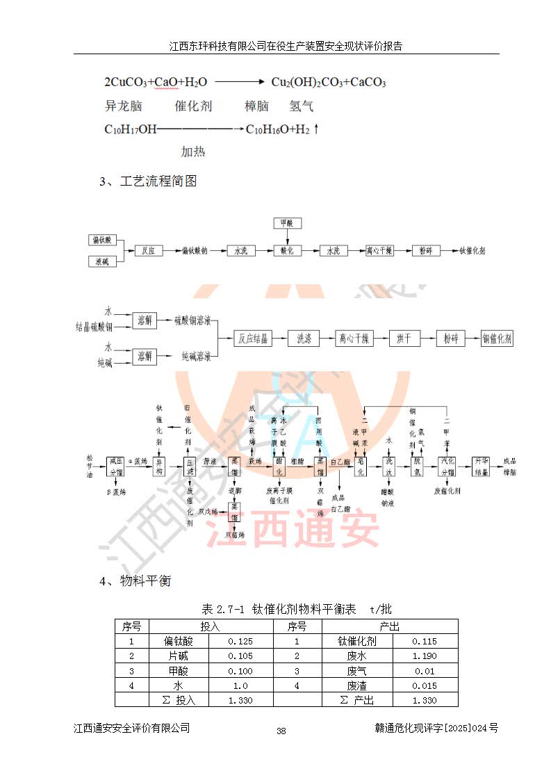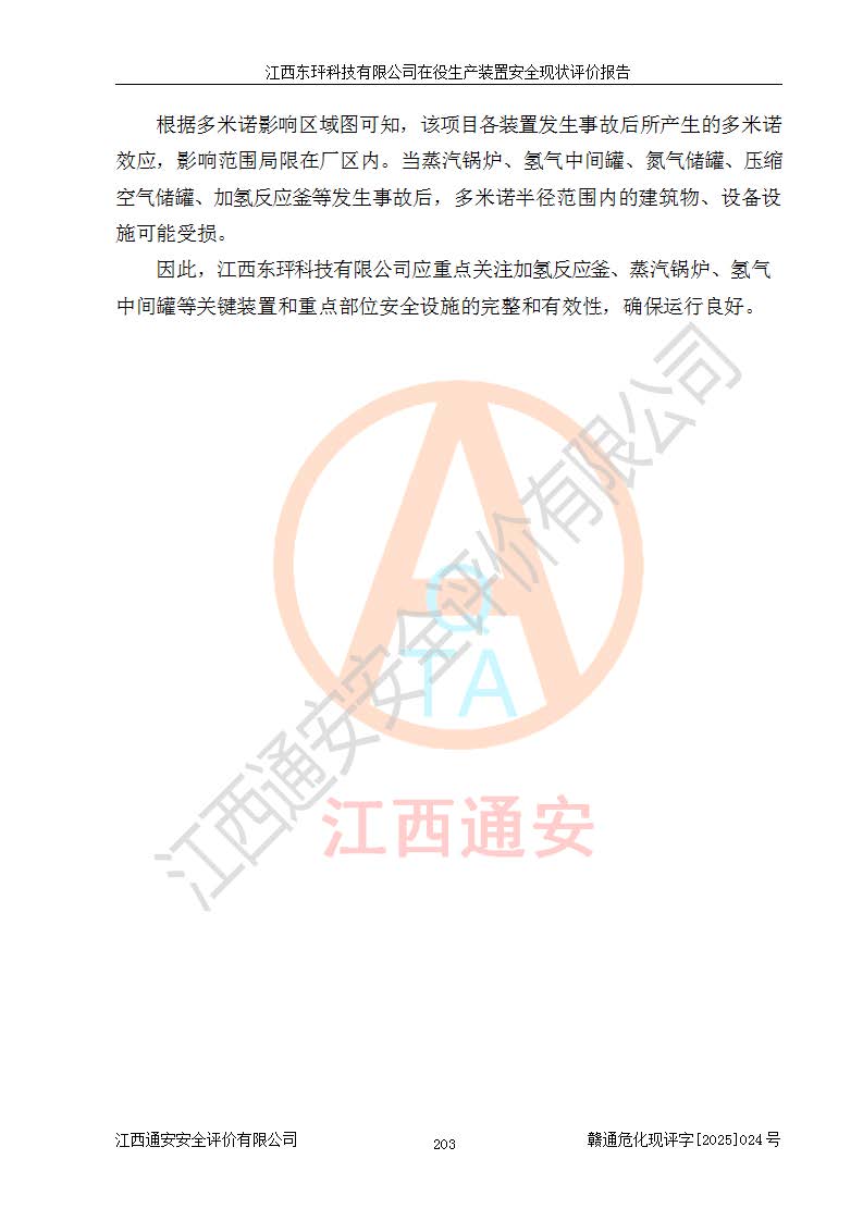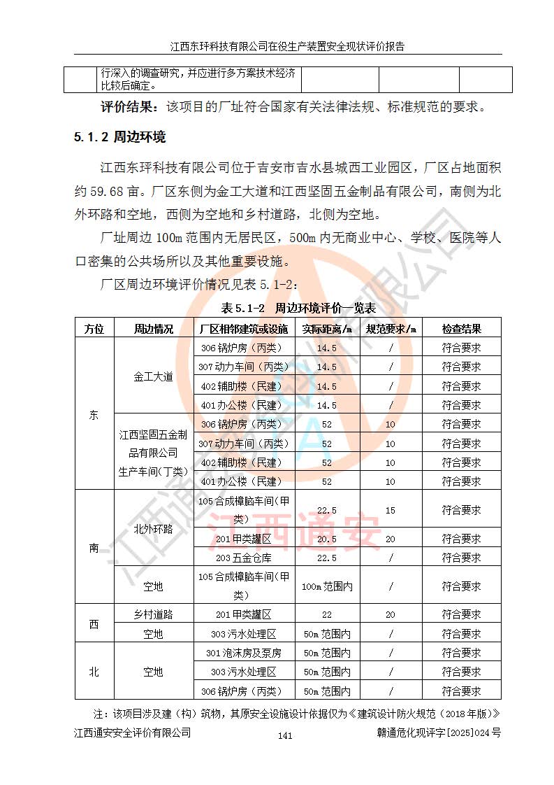 江西東玶科技有限公司位于江西省吉安市吉水縣城西工業(yè)園區(qū),法定**人為徐東,成立于2018年04月08日,注冊(cè)資本叁仟貳佰叁拾萬(wàn)元整,經(jīng)營(yíng)范圍為合成樟腦、α-蒎烯、β-蒎烯、二氫月桂烯(含月桂烯)、莰烯、雙戊烯、氫氣(中間產(chǎn)品)的制造加工(憑**批準(zhǔn)證書(shū)經(jīng)營(yíng));白乙酯、雙萜烯等合成香料的制造加工等。 江西東玶科技有限公司2022年08月01日取得了《安全生產(chǎn)許可證》,許可證編號(hào):(贛)WH安許證字[2022]1160號(hào),許可范圍為合成樟腦(2000t/a)、二氫月桂烯(1000t/a)、月桂烯(3200t/a)、莰烯(1000t/a)、雙戊烯(810t/a)、雙萜烯(1070t/a)、α-蒎烯(7500t/a)、β-蒎烯(3200t/a)、白乙酯(500t/a),**期為2022年08月01日至2025年07月31日。該公司2023年5月29日取得了三級(jí)安全生產(chǎn)標(biāo)準(zhǔn)化證書(shū),證書(shū)編號(hào):贛AQBWHⅢ202300036,**期至2026年5月。該公司現(xiàn)有員工53人,其中專職安全生產(chǎn)管理人員2人。 因生產(chǎn)經(jīng)營(yíng)需要,江西東玶科技有限公司實(shí)施了年產(chǎn)12000噸松節(jié)油深加工系列產(chǎn)品項(xiàng)目(二期),并將二氫月桂烯的設(shè)計(jì)生產(chǎn)規(guī)模2000t/a變更為1500t/a,減少中間產(chǎn)品蒎烷的消耗量,剩余的蒎烷(720t/a)作為產(chǎn)品銷售。江西東玶科技有限公司委托深圳天陽(yáng)工程設(shè)計(jì)有限公司進(jìn)行了設(shè)計(jì)變更,按程序要求進(jìn)行了試生產(chǎn),委托評(píng)價(jià)公司編制了安全驗(yàn)收評(píng)價(jià)報(bào)告,并于2025年1月16日組織專家組和相關(guān)單位進(jìn)行了驗(yàn)收。驗(yàn)收完成后,江西東玶科技有限公司2025年06月04日對(duì)《安全生產(chǎn)許可證》進(jìn)行了變更,許可范圍變更為合成樟腦(2000t/a)、二氫月桂烯(1500t/a)、月桂烯(3200t/a)、莰烯(1000t/a)、雙戊烯(902.5t/a)、雙萜烯(1200.7t/a)、α-蒎烯(7500t/a)、β-蒎烯(3200t/a)、白乙酯(500t/a)、蒎烷(中間產(chǎn)品,720t/a)。 江西東玶科技有限公司在役生產(chǎn)裝置生產(chǎn)過(guò)程中涉及的主要原輔材料為松節(jié)油、乙酸、液堿、甲醇、碳酸鈉、二甲苯、偏鈦酸、甲酸、硫酸銅、雷尼鎳、離子膜、天然氣、氮?dú)?,中間產(chǎn)品為氫氣、α-蒎烯、β-蒎烯、蒎烷,產(chǎn)品為合成樟腦、二氫月桂烯、月桂烯、莰烯、雙戊烯、白乙酯、雙萜烯,副產(chǎn)品為醋酸鈉。根據(jù)《危險(xiǎn)化學(xué)品目錄》,該在役生產(chǎn)裝置涉及的松節(jié)油、乙酸、液堿、甲醇、二甲苯、甲酸、雷尼鎳、天然氣(燃料)、氮?dú)猓▔嚎s的)、柴油,中間產(chǎn)品α-蒎烯、β-蒎烯、氫氣、蒎烷和產(chǎn)品中合成樟腦、二氫月桂烯、月桂烯、莰烯、雙戊烯屬于危險(xiǎn)化學(xué)品。經(jīng)辨識(shí),甲醇、氫氣和天然氣(燃料)屬于重點(diǎn)監(jiān)管的危險(xiǎn)化學(xué)品,甲醇屬于特別管控的危險(xiǎn)化學(xué)品,不涉及監(jiān)控化學(xué)品、易制毒化學(xué)品、易制爆危險(xiǎn)化學(xué)品、劇毒化學(xué)品和高毒物品,生產(chǎn)、儲(chǔ)存單元不構(gòu)成危險(xiǎn)化學(xué)品重大危險(xiǎn)源,涉及的加氫工藝屬于重點(diǎn)監(jiān)管的危險(xiǎn)化工工藝。根據(jù)生產(chǎn)工藝特點(diǎn)及物料的理化特性可知,該在役生產(chǎn)裝置生產(chǎn)過(guò)程中存在火災(zāi)與爆炸、中毒與窒息、觸電、機(jī)械傷害、灼燙等危險(xiǎn)有害因素。 該公司自2022年08月01日取得安全生產(chǎn)許可證以來(lái),生產(chǎn)運(yùn)行正常,未發(fā)生一般及以上生產(chǎn)安全事故。 |