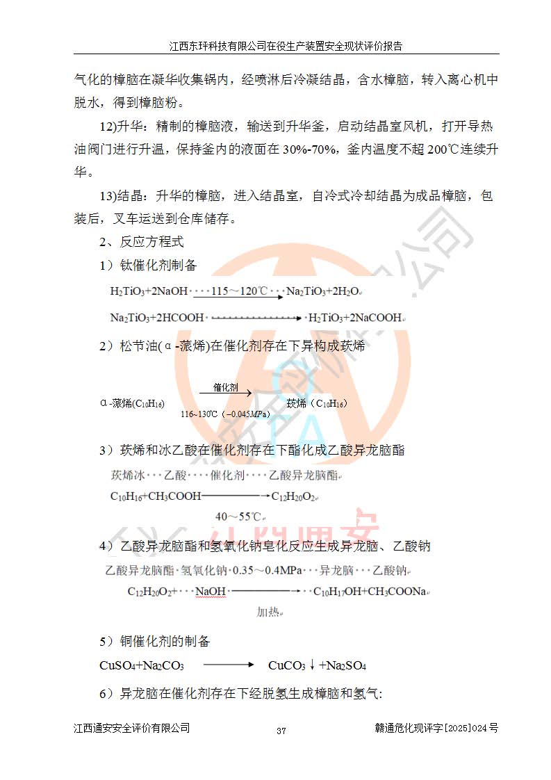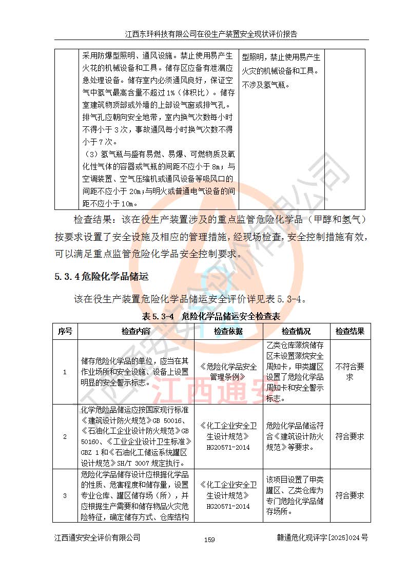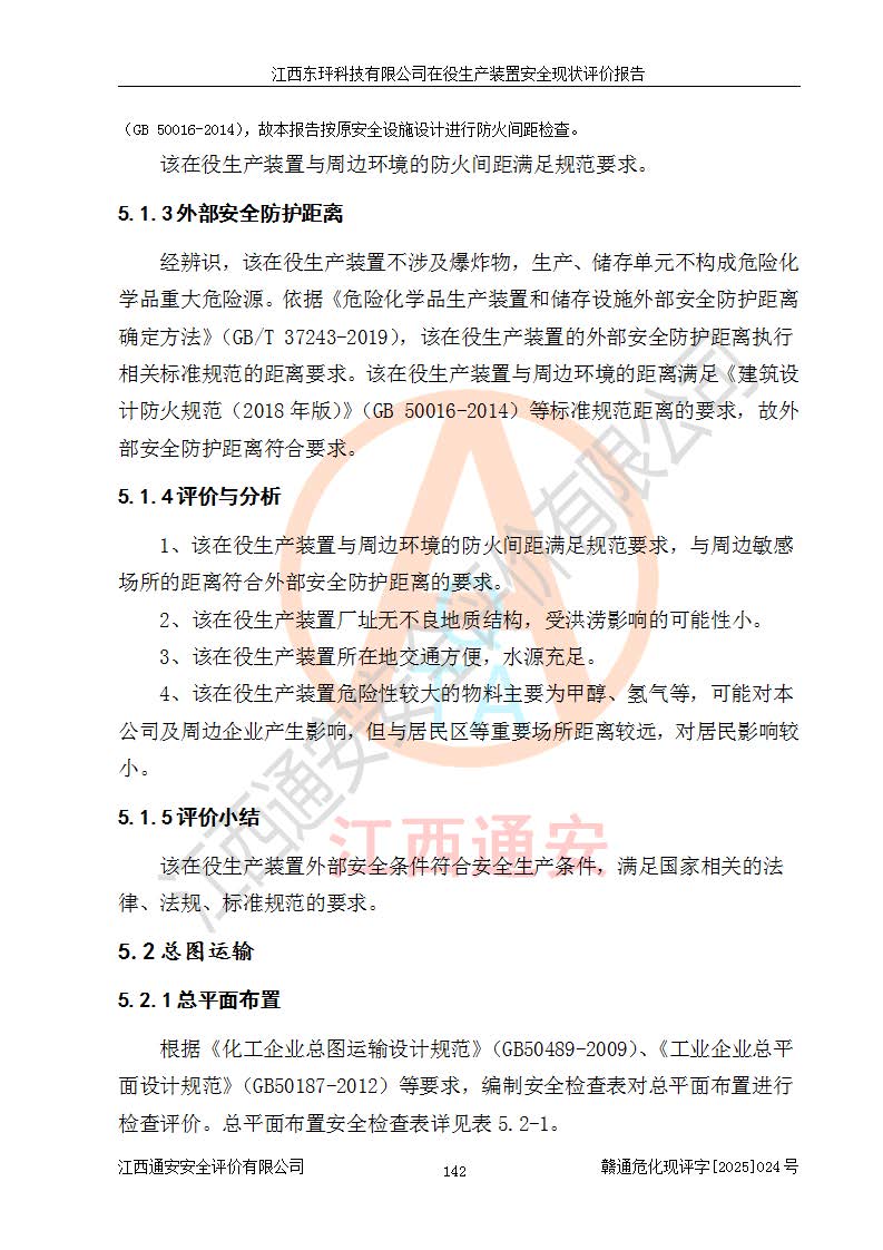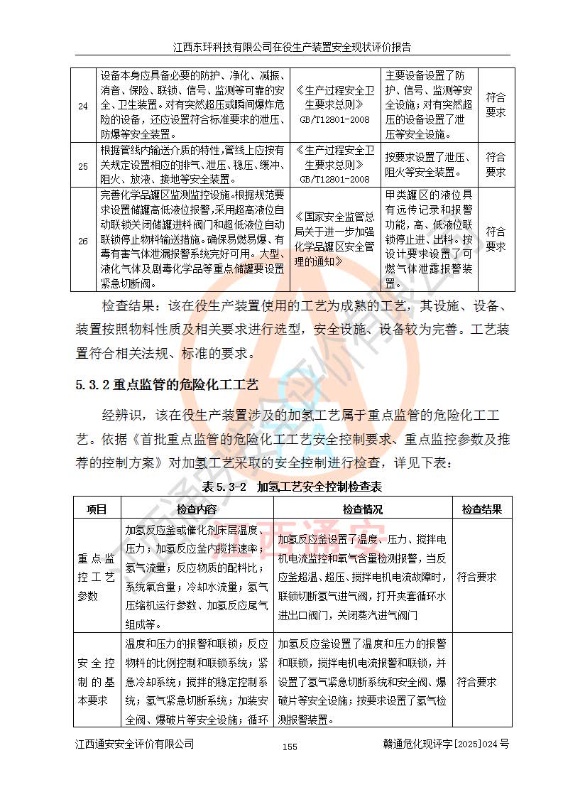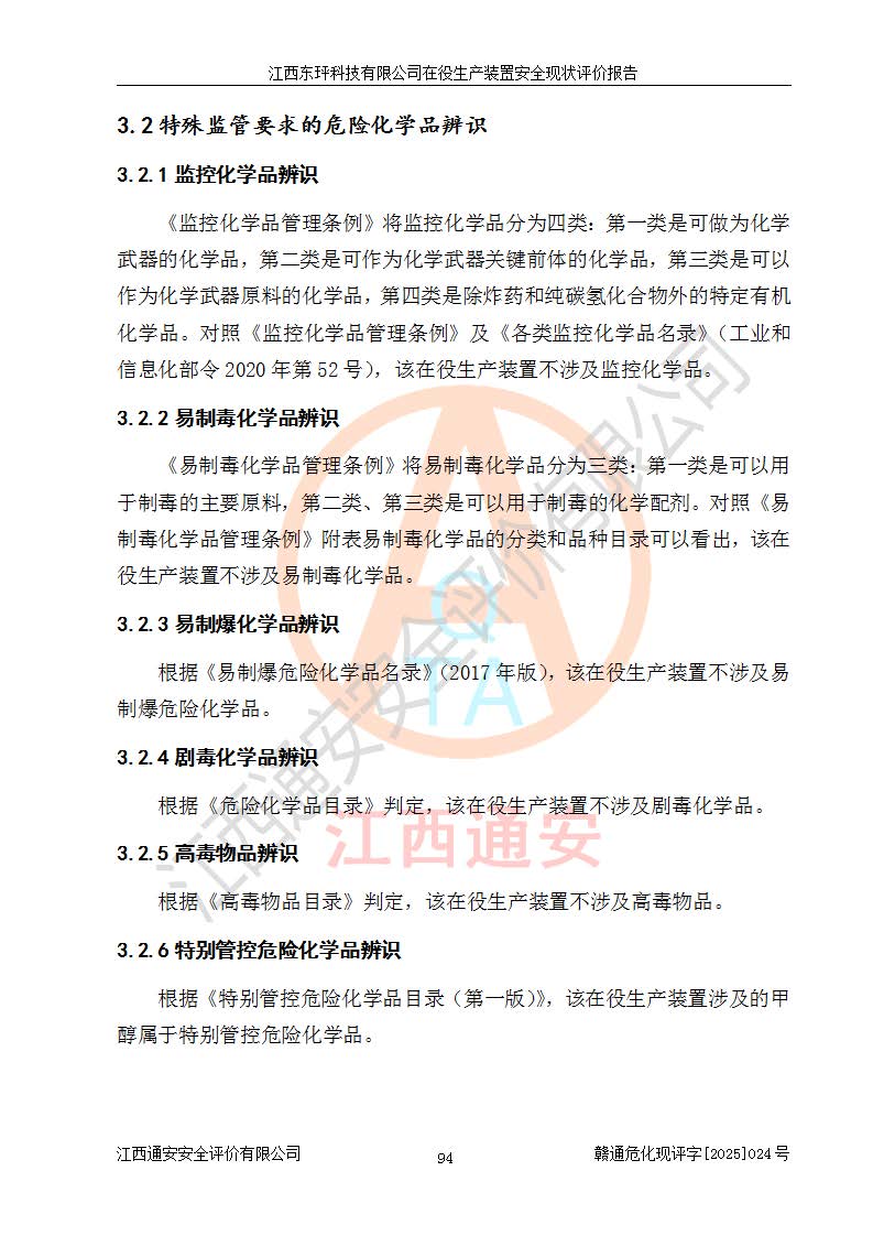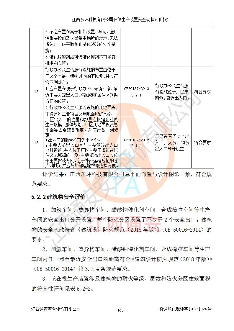 江西東玶科技有限公司位于江西省吉安市吉水縣城西工業(yè)園區(qū),法定**人為徐東,成立于2018年04月08日,注冊(cè)資本叁仟貳佰叁拾萬(wàn)元整,經(jīng)營(yíng)范圍為合成樟腦、α-蒎烯、β-蒎烯、二氫月桂烯(含月桂烯)、莰烯、雙戊烯、氫氣(中間產(chǎn)品)的制造加工(憑**批準(zhǔn)證書(shū)經(jīng)營(yíng));白乙酯、雙萜烯等合成香料的制造加工等。 江西東玶科技有限公司2022年08月01日取得了《安全生產(chǎn)許可證》,許可證編號(hào):(贛)WH安許證字[2022]1160號(hào),許可范圍為合成樟腦(2000t/a)、二氫月桂烯(1000t/a)、月桂烯(3200t/a)、莰烯(1000t/a)、雙戊烯(810t/a)、雙萜烯(1070t/a)、α-蒎烯(7500t/a)、β-蒎烯(3200t/a)、白乙酯(500t/a),**期為2022年08月01日至2025年07月31日。該公司2023年5月29日取得了三級(jí)安全生產(chǎn)標(biāo)準(zhǔn)化證書(shū),證書(shū)編號(hào):贛AQBWHⅢ202300036,**期至2026年5月。該公司現(xiàn)有員工53人,其中專職安全生產(chǎn)管理人員2人。 因生產(chǎn)經(jīng)營(yíng)需要,江西東玶科技有限公司實(shí)施了年產(chǎn)12000噸松節(jié)油深加工系列產(chǎn)品項(xiàng)目(二期),并將二氫月桂烯的設(shè)計(jì)生產(chǎn)規(guī)模2000t/a變更為1500t/a,減少中間產(chǎn)品蒎烷的消耗量,剩余的蒎烷(720t/a)作為產(chǎn)品銷售。江西東玶科技有限公司委托深圳天陽(yáng)工程設(shè)計(jì)有限公司進(jìn)行了設(shè)計(jì)變更,按程序要求進(jìn)行了試生產(chǎn),委托評(píng)價(jià)公司編制了安全驗(yàn)收評(píng)價(jià)報(bào)告,并于2025年1月16日組織專家組和相關(guān)單位進(jìn)行了驗(yàn)收。驗(yàn)收完成后,江西東玶科技有限公司2025年06月04日對(duì)《安全生產(chǎn)許可證》進(jìn)行了變更,許可范圍變更為合成樟腦(2000t/a)、二氫月桂烯(1500t/a)、月桂烯(3200t/a)、莰烯(1000t/a)、雙戊烯(902.5t/a)、雙萜烯(1200.7t/a)、α-蒎烯(7500t/a)、β-蒎烯(3200t/a)、白乙酯(500t/a)、蒎烷(中間產(chǎn)品,720t/a)。 江西東玶科技有限公司在役生產(chǎn)裝置生產(chǎn)過(guò)程中涉及的主要原輔材料為松節(jié)油、乙酸、液堿、甲醇、碳酸鈉、二甲苯、偏鈦酸、甲酸、硫酸銅、雷尼鎳、離子膜、天然氣、氮?dú)?,中間產(chǎn)品為氫氣、α-蒎烯、β-蒎烯、蒎烷,產(chǎn)品為合成樟腦、二氫月桂烯、月桂烯、莰烯、雙戊烯、白乙酯、雙萜烯,副產(chǎn)品為醋酸鈉。根據(jù)《危險(xiǎn)化學(xué)品目錄》,該在役生產(chǎn)裝置涉及的松節(jié)油、乙酸、液堿、甲醇、二甲苯、甲酸、雷尼鎳、天然氣(燃料)、氮?dú)猓▔嚎s的)、柴油,中間產(chǎn)品α-蒎烯、β-蒎烯、氫氣、蒎烷和產(chǎn)品中合成樟腦、二氫月桂烯、月桂烯、莰烯、雙戊烯屬于危險(xiǎn)化學(xué)品。經(jīng)辨識(shí),甲醇、氫氣和天然氣(燃料)屬于重點(diǎn)監(jiān)管的危險(xiǎn)化學(xué)品,甲醇屬于特別管控的危險(xiǎn)化學(xué)品,不涉及監(jiān)控化學(xué)品、易制毒化學(xué)品、易制爆危險(xiǎn)化學(xué)品、劇毒化學(xué)品和高毒物品,生產(chǎn)、儲(chǔ)存單元不構(gòu)成危險(xiǎn)化學(xué)品重大危險(xiǎn)源,涉及的加氫工藝屬于重點(diǎn)監(jiān)管的危險(xiǎn)化工工藝。根據(jù)生產(chǎn)工藝特點(diǎn)及物料的理化特性可知,該在役生產(chǎn)裝置生產(chǎn)過(guò)程中存在火災(zāi)與爆炸、中毒與窒息、觸電、機(jī)械傷害、灼燙等危險(xiǎn)有害因素。 該公司自2022年08月01日取得安全生產(chǎn)許可證以來(lái),生產(chǎn)運(yùn)行正常,未發(fā)生一般及以上生產(chǎn)安全事故。 |