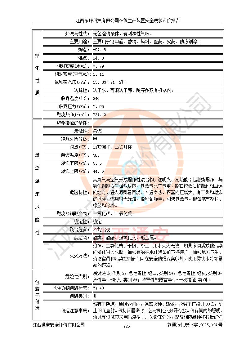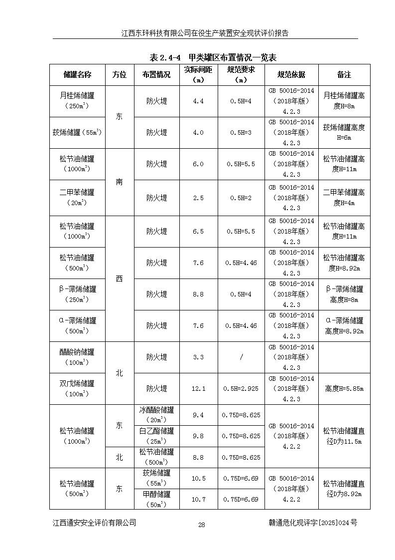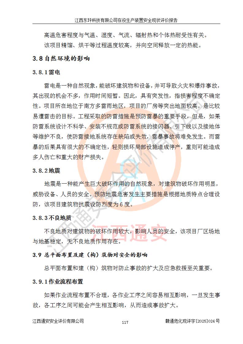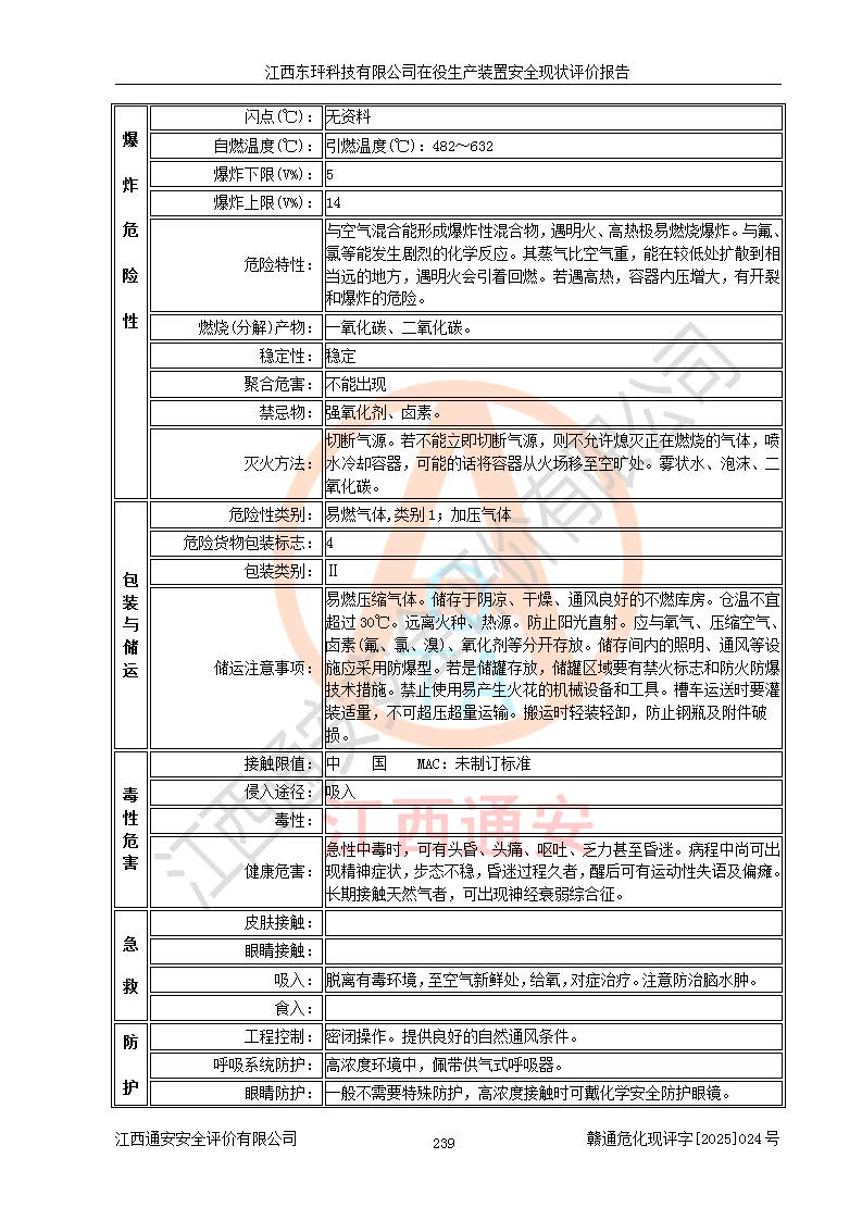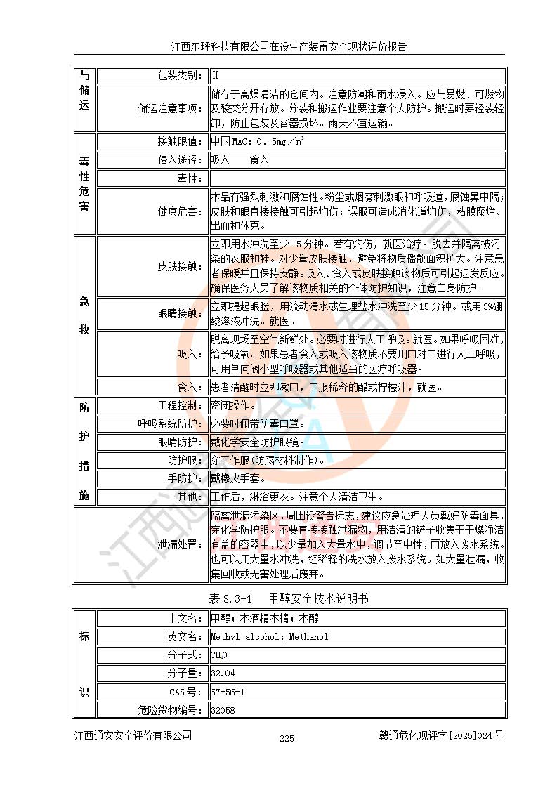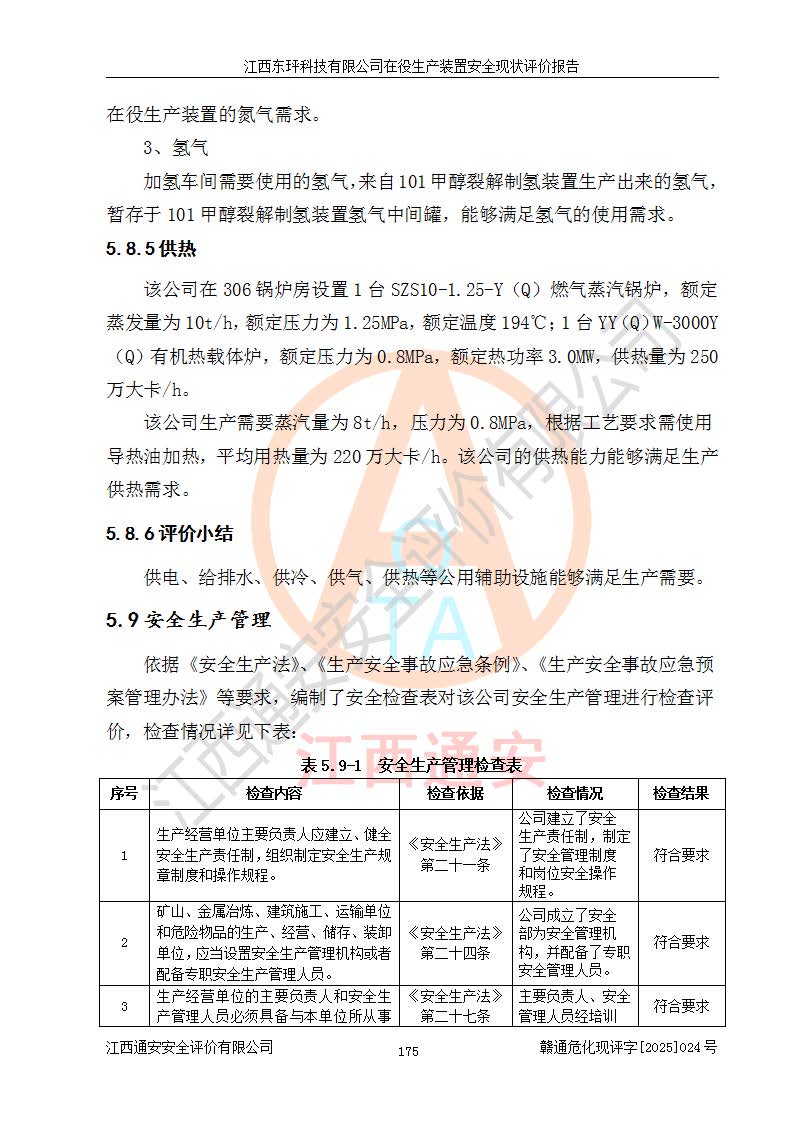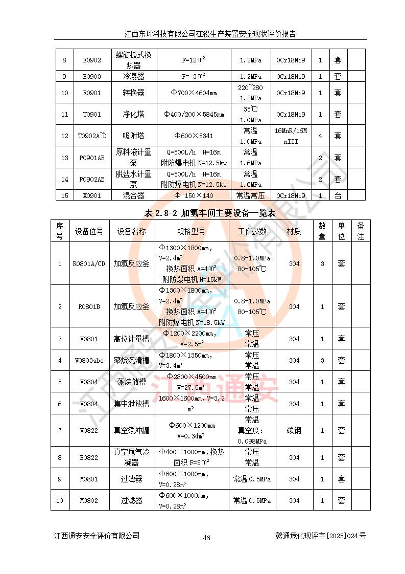 江西東玶科技有限公司位于江西省吉安市吉水縣城西工業(yè)園區(qū),法定**人為徐東,成立于2018年04月08日,注冊(cè)資本叁仟貳佰叁拾萬(wàn)元整,經(jīng)營(yíng)范圍為合成樟腦、α-蒎烯、β-蒎烯、二氫月桂烯(含月桂烯)、莰烯、雙戊烯、氫氣(中間產(chǎn)品)的制造加工(憑**批準(zhǔn)證書(shū)經(jīng)營(yíng));白乙酯、雙萜烯等合成香料的制造加工等。 江西東玶科技有限公司2022年08月01日取得了《安全生產(chǎn)許可證》,許可證編號(hào):(贛)WH安許證字[2022]1160號(hào),許可范圍為合成樟腦(2000t/a)、二氫月桂烯(1000t/a)、月桂烯(3200t/a)、莰烯(1000t/a)、雙戊烯(810t/a)、雙萜烯(1070t/a)、α-蒎烯(7500t/a)、β-蒎烯(3200t/a)、白乙酯(500t/a),**期為2022年08月01日至2025年07月31日。該公司2023年5月29日取得了三級(jí)安全生產(chǎn)標(biāo)準(zhǔn)化證書(shū),證書(shū)編號(hào):贛AQBWHⅢ202300036,**期至2026年5月。該公司現(xiàn)有員工53人,其中專職安全生產(chǎn)管理人員2人。 因生產(chǎn)經(jīng)營(yíng)需要,江西東玶科技有限公司實(shí)施了年產(chǎn)12000噸松節(jié)油深加工系列產(chǎn)品項(xiàng)目(二期),并將二氫月桂烯的設(shè)計(jì)生產(chǎn)規(guī)模2000t/a變更為1500t/a,減少中間產(chǎn)品蒎烷的消耗量,剩余的蒎烷(720t/a)作為產(chǎn)品銷售。江西東玶科技有限公司委托深圳天陽(yáng)工程設(shè)計(jì)有限公司進(jìn)行了設(shè)計(jì)變更,按程序要求進(jìn)行了試生產(chǎn),委托評(píng)價(jià)公司編制了安全驗(yàn)收評(píng)價(jià)報(bào)告,并于2025年1月16日組織專家組和相關(guān)單位進(jìn)行了驗(yàn)收。驗(yàn)收完成后,江西東玶科技有限公司2025年06月04日對(duì)《安全生產(chǎn)許可證》進(jìn)行了變更,許可范圍變更為合成樟腦(2000t/a)、二氫月桂烯(1500t/a)、月桂烯(3200t/a)、莰烯(1000t/a)、雙戊烯(902.5t/a)、雙萜烯(1200.7t/a)、α-蒎烯(7500t/a)、β-蒎烯(3200t/a)、白乙酯(500t/a)、蒎烷(中間產(chǎn)品,720t/a)。 江西東玶科技有限公司在役生產(chǎn)裝置生產(chǎn)過(guò)程中涉及的主要原輔材料為松節(jié)油、乙酸、液堿、甲醇、碳酸鈉、二甲苯、偏鈦酸、甲酸、硫酸銅、雷尼鎳、離子膜、天然氣、氮?dú)?,中間產(chǎn)品為氫氣、α-蒎烯、β-蒎烯、蒎烷,產(chǎn)品為合成樟腦、二氫月桂烯、月桂烯、莰烯、雙戊烯、白乙酯、雙萜烯,副產(chǎn)品為醋酸鈉。根據(jù)《危險(xiǎn)化學(xué)品目錄》,該在役生產(chǎn)裝置涉及的松節(jié)油、乙酸、液堿、甲醇、二甲苯、甲酸、雷尼鎳、天然氣(燃料)、氮?dú)猓▔嚎s的)、柴油,中間產(chǎn)品α-蒎烯、β-蒎烯、氫氣、蒎烷和產(chǎn)品中合成樟腦、二氫月桂烯、月桂烯、莰烯、雙戊烯屬于危險(xiǎn)化學(xué)品。經(jīng)辨識(shí),甲醇、氫氣和天然氣(燃料)屬于重點(diǎn)監(jiān)管的危險(xiǎn)化學(xué)品,甲醇屬于特別管控的危險(xiǎn)化學(xué)品,不涉及監(jiān)控化學(xué)品、易制毒化學(xué)品、易制爆危險(xiǎn)化學(xué)品、劇毒化學(xué)品和高毒物品,生產(chǎn)、儲(chǔ)存單元不構(gòu)成危險(xiǎn)化學(xué)品重大危險(xiǎn)源,涉及的加氫工藝屬于重點(diǎn)監(jiān)管的危險(xiǎn)化工工藝。根據(jù)生產(chǎn)工藝特點(diǎn)及物料的理化特性可知,該在役生產(chǎn)裝置生產(chǎn)過(guò)程中存在火災(zāi)與爆炸、中毒與窒息、觸電、機(jī)械傷害、灼燙等危險(xiǎn)有害因素。 該公司自2022年08月01日取得安全生產(chǎn)許可證以來(lái),生產(chǎn)運(yùn)行正常,未發(fā)生一般及以上生產(chǎn)安全事故。 |
