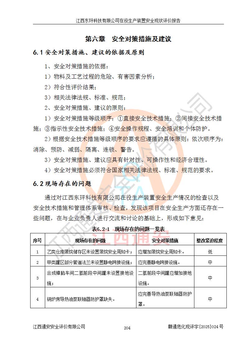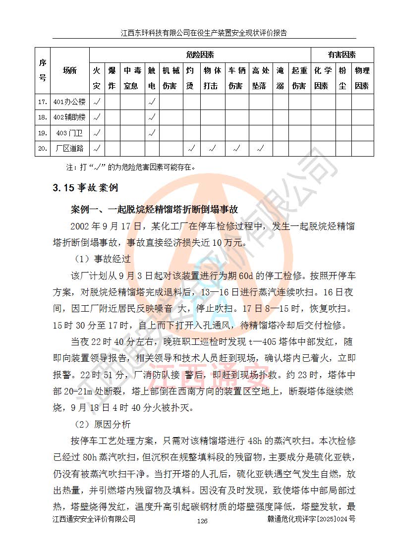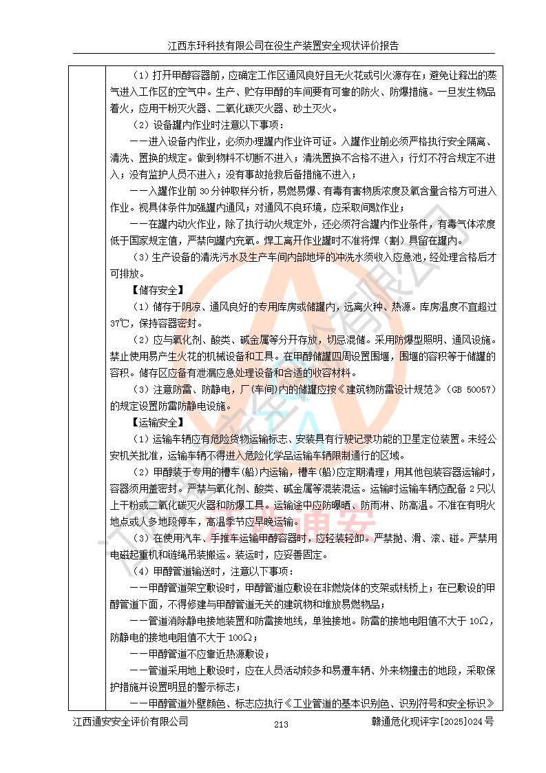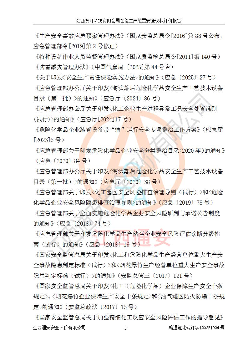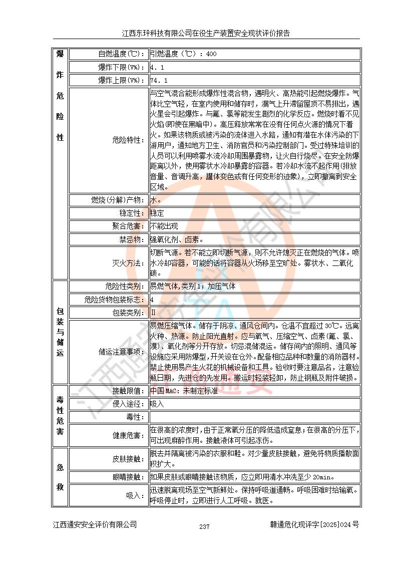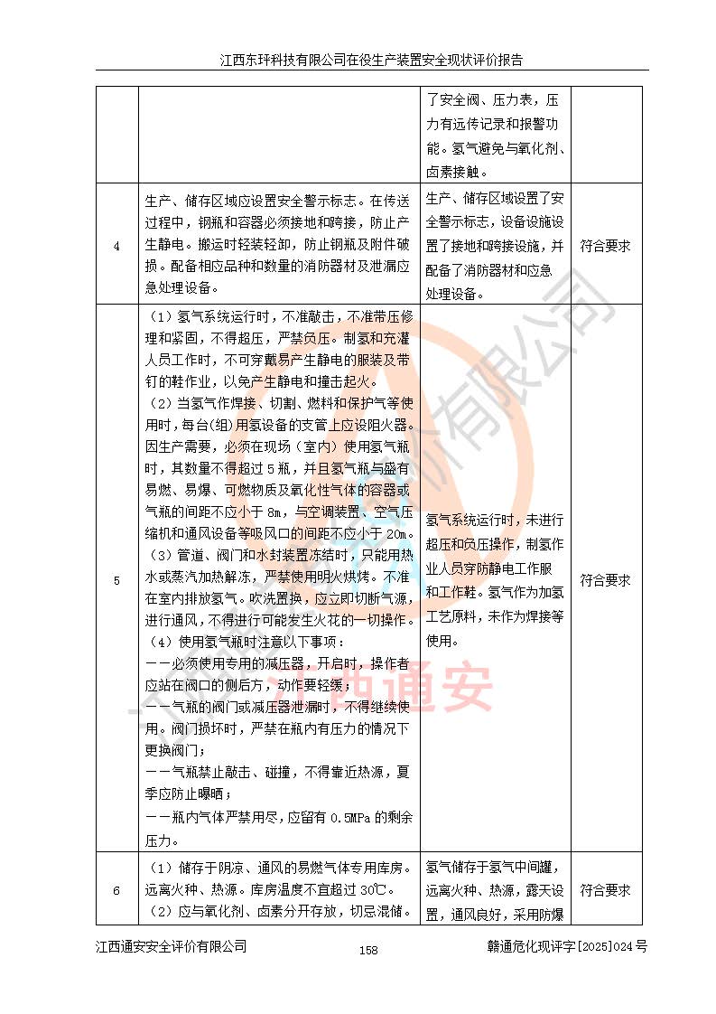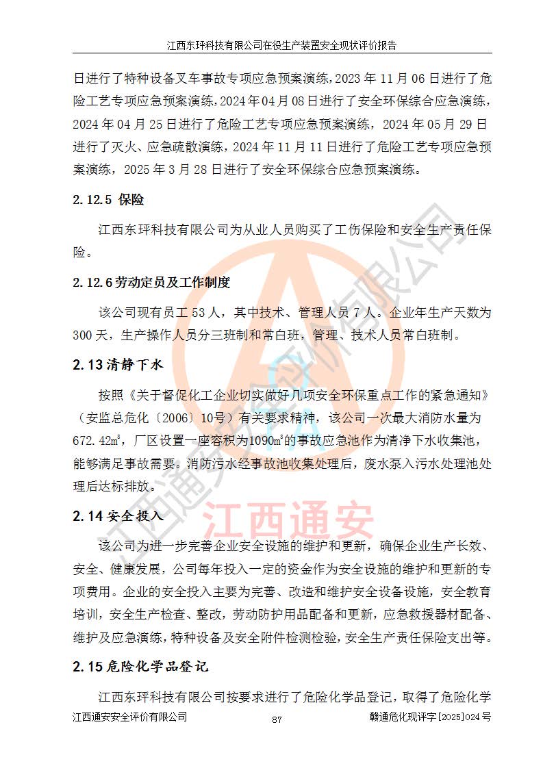 江西東玶科技有限公司位于江西省吉安市吉水縣城西工業(yè)園區(qū),法定**人為徐東,成立于2018年04月08日,注冊(cè)資本叁仟貳佰叁拾萬(wàn)元整,經(jīng)營(yíng)范圍為合成樟腦、α-蒎烯、β-蒎烯、二氫月桂烯(含月桂烯)、莰烯、雙戊烯、氫氣(中間產(chǎn)品)的制造加工(憑**批準(zhǔn)證書(shū)經(jīng)營(yíng));白乙酯、雙萜烯等合成香料的制造加工等。 江西東玶科技有限公司2022年08月01日取得了《安全生產(chǎn)許可證》,許可證編號(hào):(贛)WH安許證字[2022]1160號(hào),許可范圍為合成樟腦(2000t/a)、二氫月桂烯(1000t/a)、月桂烯(3200t/a)、莰烯(1000t/a)、雙戊烯(810t/a)、雙萜烯(1070t/a)、α-蒎烯(7500t/a)、β-蒎烯(3200t/a)、白乙酯(500t/a),**期為2022年08月01日至2025年07月31日。該公司2023年5月29日取得了三級(jí)安全生產(chǎn)標(biāo)準(zhǔn)化證書(shū),證書(shū)編號(hào):贛AQBWHⅢ202300036,**期至2026年5月。該公司現(xiàn)有員工53人,其中專職安全生產(chǎn)管理人員2人。 因生產(chǎn)經(jīng)營(yíng)需要,江西東玶科技有限公司實(shí)施了年產(chǎn)12000噸松節(jié)油深加工系列產(chǎn)品項(xiàng)目(二期),并將二氫月桂烯的設(shè)計(jì)生產(chǎn)規(guī)模2000t/a變更為1500t/a,減少中間產(chǎn)品蒎烷的消耗量,剩余的蒎烷(720t/a)作為產(chǎn)品銷售。江西東玶科技有限公司委托深圳天陽(yáng)工程設(shè)計(jì)有限公司進(jìn)行了設(shè)計(jì)變更,按程序要求進(jìn)行了試生產(chǎn),委托評(píng)價(jià)公司編制了安全驗(yàn)收評(píng)價(jià)報(bào)告,并于2025年1月16日組織專家組和相關(guān)單位進(jìn)行了驗(yàn)收。驗(yàn)收完成后,江西東玶科技有限公司2025年06月04日對(duì)《安全生產(chǎn)許可證》進(jìn)行了變更,許可范圍變更為合成樟腦(2000t/a)、二氫月桂烯(1500t/a)、月桂烯(3200t/a)、莰烯(1000t/a)、雙戊烯(902.5t/a)、雙萜烯(1200.7t/a)、α-蒎烯(7500t/a)、β-蒎烯(3200t/a)、白乙酯(500t/a)、蒎烷(中間產(chǎn)品,720t/a)。 江西東玶科技有限公司在役生產(chǎn)裝置生產(chǎn)過(guò)程中涉及的主要原輔材料為松節(jié)油、乙酸、液堿、甲醇、碳酸鈉、二甲苯、偏鈦酸、甲酸、硫酸銅、雷尼鎳、離子膜、天然氣、氮?dú)?,中間產(chǎn)品為氫氣、α-蒎烯、β-蒎烯、蒎烷,產(chǎn)品為合成樟腦、二氫月桂烯、月桂烯、莰烯、雙戊烯、白乙酯、雙萜烯,副產(chǎn)品為醋酸鈉。根據(jù)《危險(xiǎn)化學(xué)品目錄》,該在役生產(chǎn)裝置涉及的松節(jié)油、乙酸、液堿、甲醇、二甲苯、甲酸、雷尼鎳、天然氣(燃料)、氮?dú)猓▔嚎s的)、柴油,中間產(chǎn)品α-蒎烯、β-蒎烯、氫氣、蒎烷和產(chǎn)品中合成樟腦、二氫月桂烯、月桂烯、莰烯、雙戊烯屬于危險(xiǎn)化學(xué)品。經(jīng)辨識(shí),甲醇、氫氣和天然氣(燃料)屬于重點(diǎn)監(jiān)管的危險(xiǎn)化學(xué)品,甲醇屬于特別管控的危險(xiǎn)化學(xué)品,不涉及監(jiān)控化學(xué)品、易制毒化學(xué)品、易制爆危險(xiǎn)化學(xué)品、劇毒化學(xué)品和高毒物品,生產(chǎn)、儲(chǔ)存單元不構(gòu)成危險(xiǎn)化學(xué)品重大危險(xiǎn)源,涉及的加氫工藝屬于重點(diǎn)監(jiān)管的危險(xiǎn)化工工藝。根據(jù)生產(chǎn)工藝特點(diǎn)及物料的理化特性可知,該在役生產(chǎn)裝置生產(chǎn)過(guò)程中存在火災(zāi)與爆炸、中毒與窒息、觸電、機(jī)械傷害、灼燙等危險(xiǎn)有害因素。 該公司自2022年08月01日取得安全生產(chǎn)許可證以來(lái),生產(chǎn)運(yùn)行正常,未發(fā)生一般及以上生產(chǎn)安全事故。 |