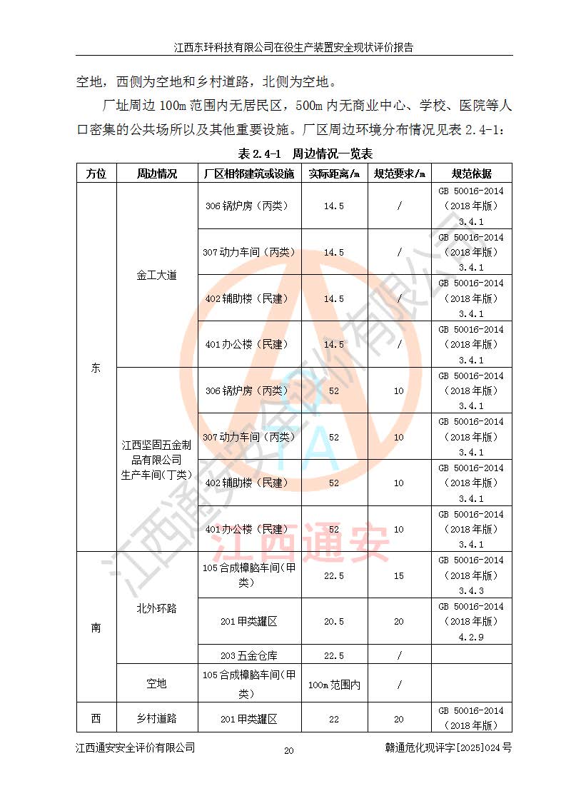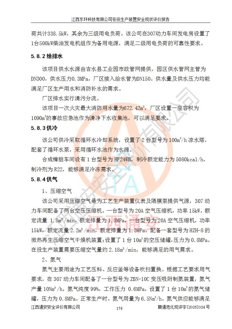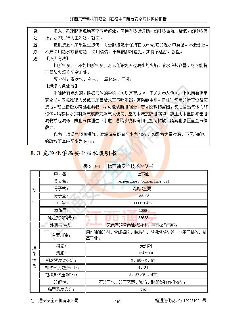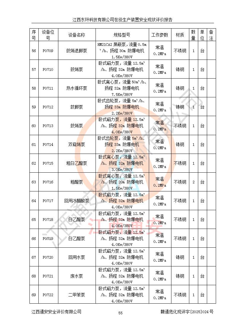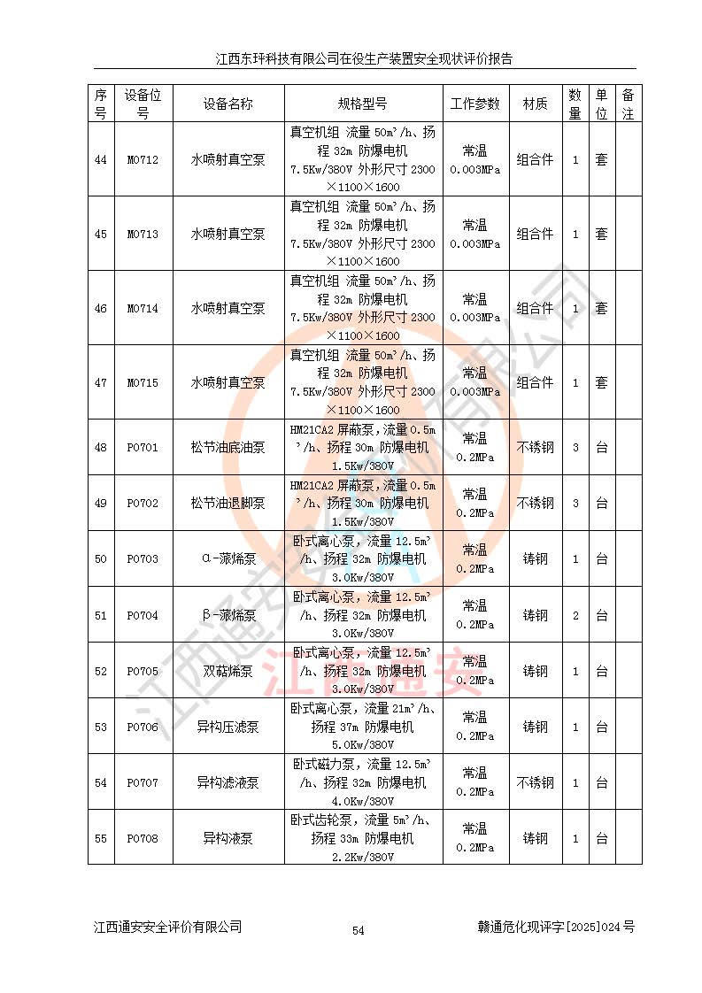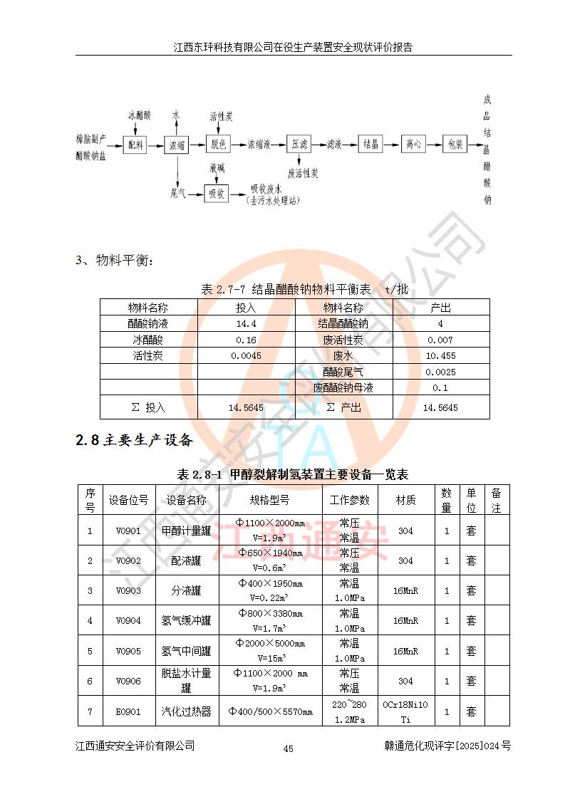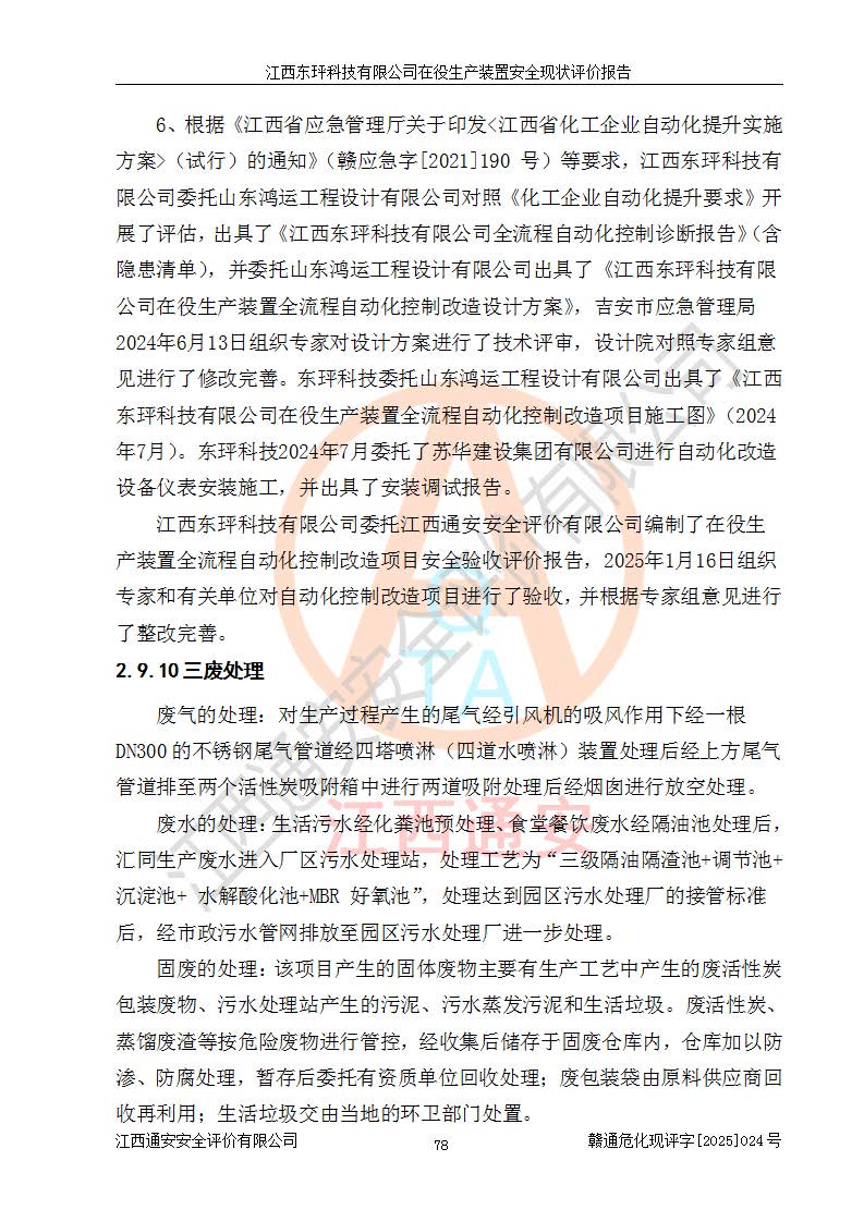 江西東玶科技有限公司位于江西省吉安市吉水縣城西工業(yè)園區(qū),法定**人為徐東,成立于2018年04月08日,注冊(cè)資本叁仟貳佰叁拾萬(wàn)元整,經(jīng)營(yíng)范圍為合成樟腦、α-蒎烯、β-蒎烯、二氫月桂烯(含月桂烯)、莰烯、雙戊烯、氫氣(中間產(chǎn)品)的制造加工(憑**批準(zhǔn)證書(shū)經(jīng)營(yíng));白乙酯、雙萜烯等合成香料的制造加工等。 江西東玶科技有限公司2022年08月01日取得了《安全生產(chǎn)許可證》,許可證編號(hào):(贛)WH安許證字[2022]1160號(hào),許可范圍為合成樟腦(2000t/a)、二氫月桂烯(1000t/a)、月桂烯(3200t/a)、莰烯(1000t/a)、雙戊烯(810t/a)、雙萜烯(1070t/a)、α-蒎烯(7500t/a)、β-蒎烯(3200t/a)、白乙酯(500t/a),**期為2022年08月01日至2025年07月31日。該公司2023年5月29日取得了三級(jí)安全生產(chǎn)標(biāo)準(zhǔn)化證書(shū),證書(shū)編號(hào):贛AQBWHⅢ202300036,**期至2026年5月。該公司現(xiàn)有員工53人,其中專職安全生產(chǎn)管理人員2人。 因生產(chǎn)經(jīng)營(yíng)需要,江西東玶科技有限公司實(shí)施了年產(chǎn)12000噸松節(jié)油深加工系列產(chǎn)品項(xiàng)目(二期),并將二氫月桂烯的設(shè)計(jì)生產(chǎn)規(guī)模2000t/a變更為1500t/a,減少中間產(chǎn)品蒎烷的消耗量,剩余的蒎烷(720t/a)作為產(chǎn)品銷售。江西東玶科技有限公司委托深圳天陽(yáng)工程設(shè)計(jì)有限公司進(jìn)行了設(shè)計(jì)變更,按程序要求進(jìn)行了試生產(chǎn),委托評(píng)價(jià)公司編制了安全驗(yàn)收評(píng)價(jià)報(bào)告,并于2025年1月16日組織專家組和相關(guān)單位進(jìn)行了驗(yàn)收。驗(yàn)收完成后,江西東玶科技有限公司2025年06月04日對(duì)《安全生產(chǎn)許可證》進(jìn)行了變更,許可范圍變更為合成樟腦(2000t/a)、二氫月桂烯(1500t/a)、月桂烯(3200t/a)、莰烯(1000t/a)、雙戊烯(902.5t/a)、雙萜烯(1200.7t/a)、α-蒎烯(7500t/a)、β-蒎烯(3200t/a)、白乙酯(500t/a)、蒎烷(中間產(chǎn)品,720t/a)。 江西東玶科技有限公司在役生產(chǎn)裝置生產(chǎn)過(guò)程中涉及的主要原輔材料為松節(jié)油、乙酸、液堿、甲醇、碳酸鈉、二甲苯、偏鈦酸、甲酸、硫酸銅、雷尼鎳、離子膜、天然氣、氮?dú)?,中間產(chǎn)品為氫氣、α-蒎烯、β-蒎烯、蒎烷,產(chǎn)品為合成樟腦、二氫月桂烯、月桂烯、莰烯、雙戊烯、白乙酯、雙萜烯,副產(chǎn)品為醋酸鈉。根據(jù)《危險(xiǎn)化學(xué)品目錄》,該在役生產(chǎn)裝置涉及的松節(jié)油、乙酸、液堿、甲醇、二甲苯、甲酸、雷尼鎳、天然氣(燃料)、氮?dú)猓▔嚎s的)、柴油,中間產(chǎn)品α-蒎烯、β-蒎烯、氫氣、蒎烷和產(chǎn)品中合成樟腦、二氫月桂烯、月桂烯、莰烯、雙戊烯屬于危險(xiǎn)化學(xué)品。經(jīng)辨識(shí),甲醇、氫氣和天然氣(燃料)屬于重點(diǎn)監(jiān)管的危險(xiǎn)化學(xué)品,甲醇屬于特別管控的危險(xiǎn)化學(xué)品,不涉及監(jiān)控化學(xué)品、易制毒化學(xué)品、易制爆危險(xiǎn)化學(xué)品、劇毒化學(xué)品和高毒物品,生產(chǎn)、儲(chǔ)存單元不構(gòu)成危險(xiǎn)化學(xué)品重大危險(xiǎn)源,涉及的加氫工藝屬于重點(diǎn)監(jiān)管的危險(xiǎn)化工工藝。根據(jù)生產(chǎn)工藝特點(diǎn)及物料的理化特性可知,該在役生產(chǎn)裝置生產(chǎn)過(guò)程中存在火災(zāi)與爆炸、中毒與窒息、觸電、機(jī)械傷害、灼燙等危險(xiǎn)有害因素。 該公司自2022年08月01日取得安全生產(chǎn)許可證以來(lái),生產(chǎn)運(yùn)行正常,未發(fā)生一般及以上生產(chǎn)安全事故。 |