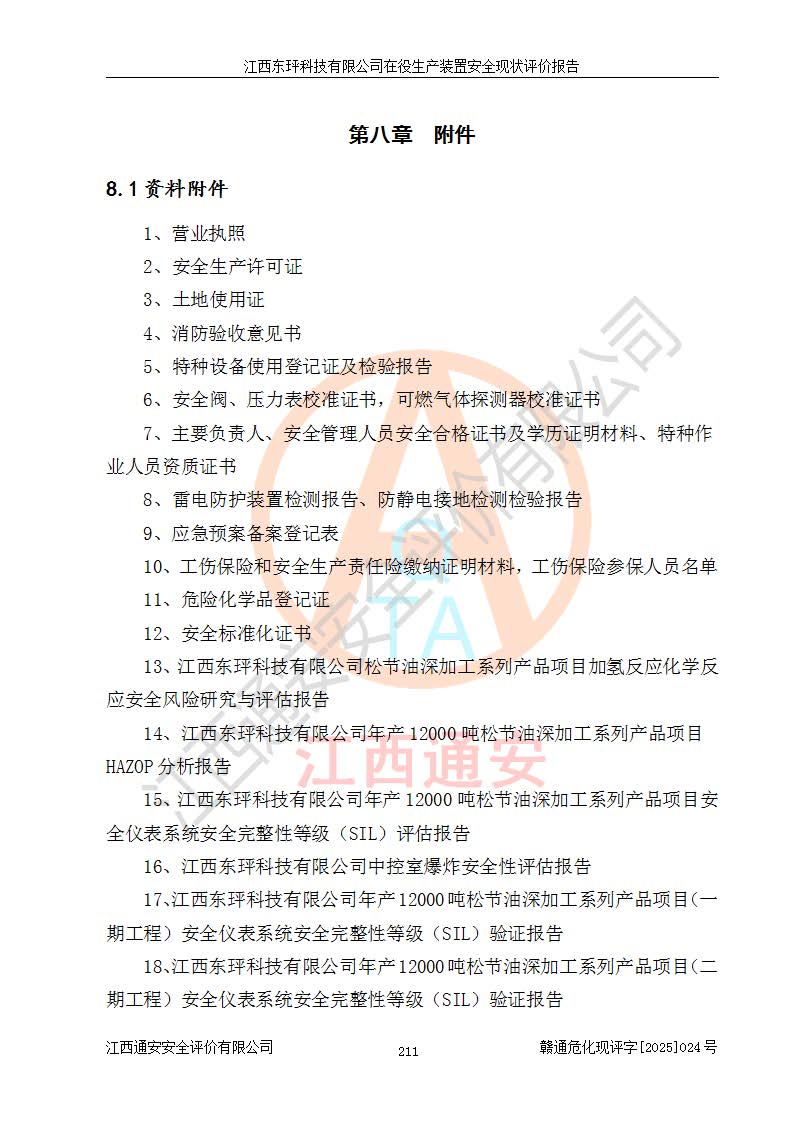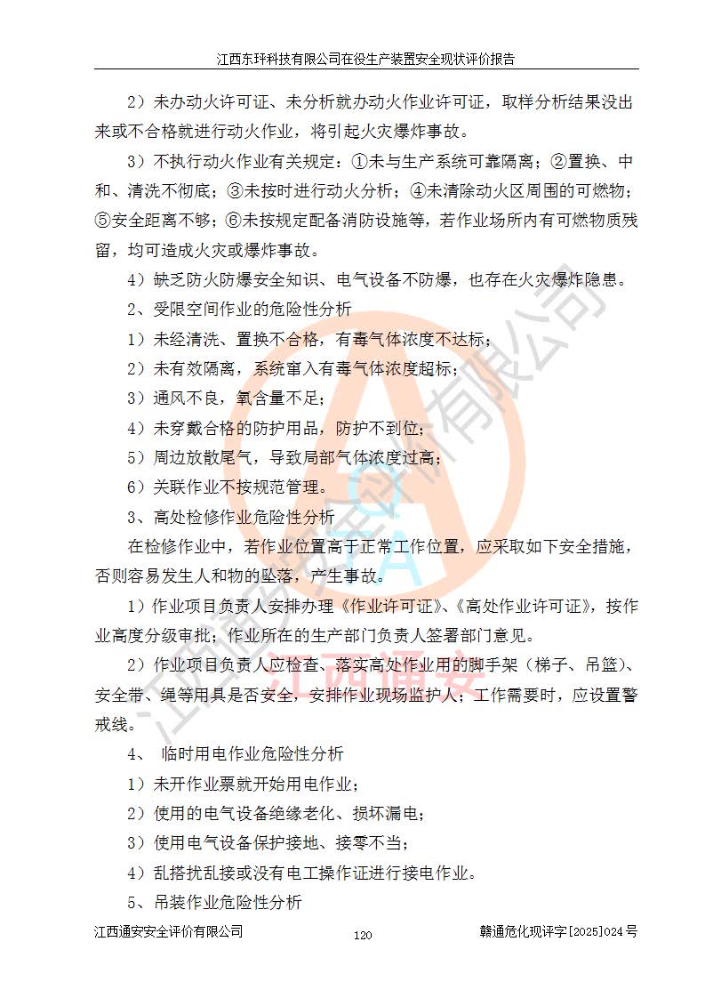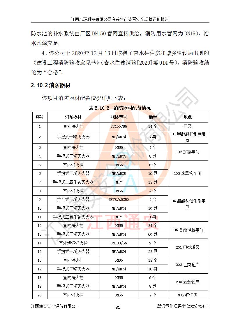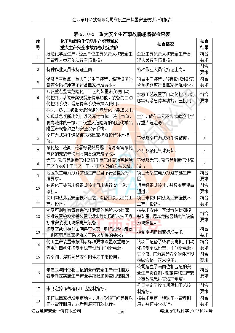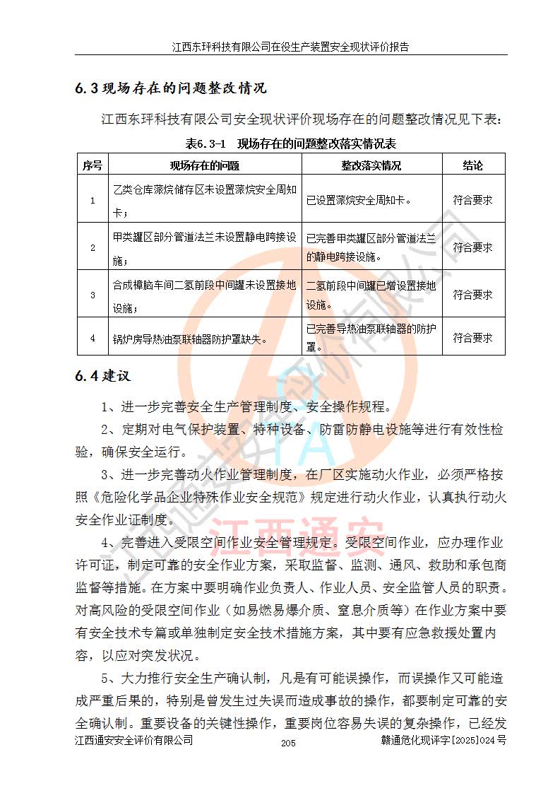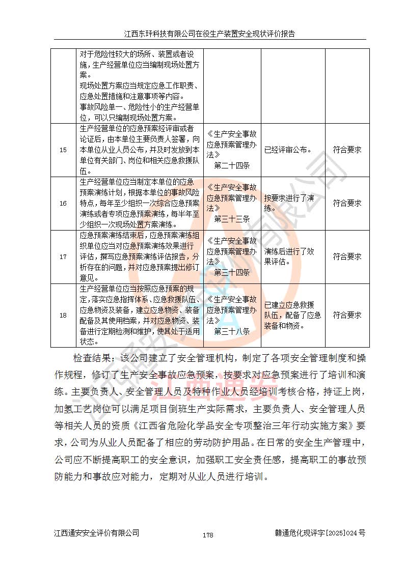 江西東玶科技有限公司位于江西省吉安市吉水縣城西工業(yè)園區(qū),法定**人為徐東,成立于2018年04月08日,注冊(cè)資本叁仟貳佰叁拾萬(wàn)元整,經(jīng)營(yíng)范圍為合成樟腦、α-蒎烯、β-蒎烯、二氫月桂烯(含月桂烯)、莰烯、雙戊烯、氫氣(中間產(chǎn)品)的制造加工(憑**批準(zhǔn)證書(shū)經(jīng)營(yíng));白乙酯、雙萜烯等合成香料的制造加工等。 江西東玶科技有限公司2022年08月01日取得了《安全生產(chǎn)許可證》,許可證編號(hào):(贛)WH安許證字[2022]1160號(hào),許可范圍為合成樟腦(2000t/a)、二氫月桂烯(1000t/a)、月桂烯(3200t/a)、莰烯(1000t/a)、雙戊烯(810t/a)、雙萜烯(1070t/a)、α-蒎烯(7500t/a)、β-蒎烯(3200t/a)、白乙酯(500t/a),**期為2022年08月01日至2025年07月31日。該公司2023年5月29日取得了三級(jí)安全生產(chǎn)標(biāo)準(zhǔn)化證書(shū),證書(shū)編號(hào):贛AQBWHⅢ202300036,**期至2026年5月。該公司現(xiàn)有員工53人,其中專職安全生產(chǎn)管理人員2人。 因生產(chǎn)經(jīng)營(yíng)需要,江西東玶科技有限公司實(shí)施了年產(chǎn)12000噸松節(jié)油深加工系列產(chǎn)品項(xiàng)目(二期),并將二氫月桂烯的設(shè)計(jì)生產(chǎn)規(guī)模2000t/a變更為1500t/a,減少中間產(chǎn)品蒎烷的消耗量,剩余的蒎烷(720t/a)作為產(chǎn)品銷售。江西東玶科技有限公司委托深圳天陽(yáng)工程設(shè)計(jì)有限公司進(jìn)行了設(shè)計(jì)變更,按程序要求進(jìn)行了試生產(chǎn),委托評(píng)價(jià)公司編制了安全驗(yàn)收評(píng)價(jià)報(bào)告,并于2025年1月16日組織專家組和相關(guān)單位進(jìn)行了驗(yàn)收。驗(yàn)收完成后,江西東玶科技有限公司2025年06月04日對(duì)《安全生產(chǎn)許可證》進(jìn)行了變更,許可范圍變更為合成樟腦(2000t/a)、二氫月桂烯(1500t/a)、月桂烯(3200t/a)、莰烯(1000t/a)、雙戊烯(902.5t/a)、雙萜烯(1200.7t/a)、α-蒎烯(7500t/a)、β-蒎烯(3200t/a)、白乙酯(500t/a)、蒎烷(中間產(chǎn)品,720t/a)。 江西東玶科技有限公司在役生產(chǎn)裝置生產(chǎn)過(guò)程中涉及的主要原輔材料為松節(jié)油、乙酸、液堿、甲醇、碳酸鈉、二甲苯、偏鈦酸、甲酸、硫酸銅、雷尼鎳、離子膜、天然氣、氮?dú)?,中間產(chǎn)品為氫氣、α-蒎烯、β-蒎烯、蒎烷,產(chǎn)品為合成樟腦、二氫月桂烯、月桂烯、莰烯、雙戊烯、白乙酯、雙萜烯,副產(chǎn)品為醋酸鈉。根據(jù)《危險(xiǎn)化學(xué)品目錄》,該在役生產(chǎn)裝置涉及的松節(jié)油、乙酸、液堿、甲醇、二甲苯、甲酸、雷尼鎳、天然氣(燃料)、氮?dú)猓▔嚎s的)、柴油,中間產(chǎn)品α-蒎烯、β-蒎烯、氫氣、蒎烷和產(chǎn)品中合成樟腦、二氫月桂烯、月桂烯、莰烯、雙戊烯屬于危險(xiǎn)化學(xué)品。經(jīng)辨識(shí),甲醇、氫氣和天然氣(燃料)屬于重點(diǎn)監(jiān)管的危險(xiǎn)化學(xué)品,甲醇屬于特別管控的危險(xiǎn)化學(xué)品,不涉及監(jiān)控化學(xué)品、易制毒化學(xué)品、易制爆危險(xiǎn)化學(xué)品、劇毒化學(xué)品和高毒物品,生產(chǎn)、儲(chǔ)存單元不構(gòu)成危險(xiǎn)化學(xué)品重大危險(xiǎn)源,涉及的加氫工藝屬于重點(diǎn)監(jiān)管的危險(xiǎn)化工工藝。根據(jù)生產(chǎn)工藝特點(diǎn)及物料的理化特性可知,該在役生產(chǎn)裝置生產(chǎn)過(guò)程中存在火災(zāi)與爆炸、中毒與窒息、觸電、機(jī)械傷害、灼燙等危險(xiǎn)有害因素。 該公司自2022年08月01日取得安全生產(chǎn)許可證以來(lái),生產(chǎn)運(yùn)行正常,未發(fā)生一般及以上生產(chǎn)安全事故。 |