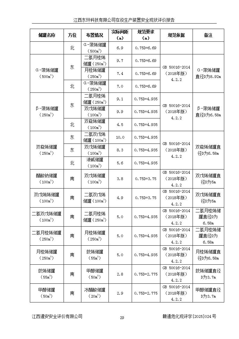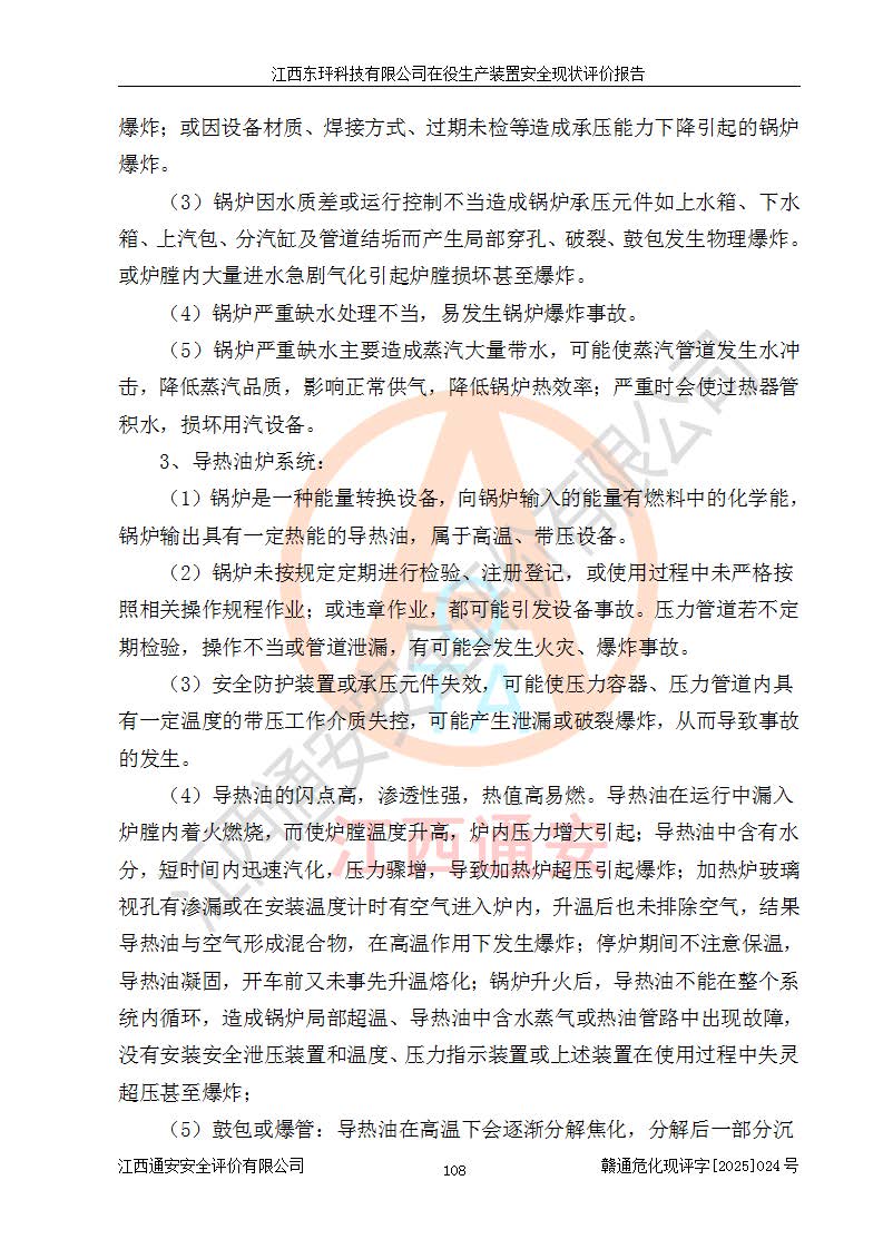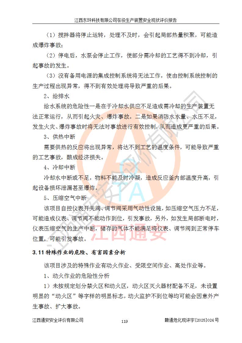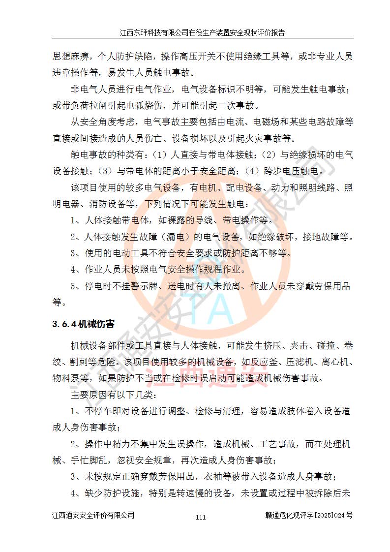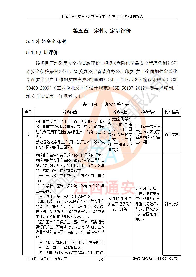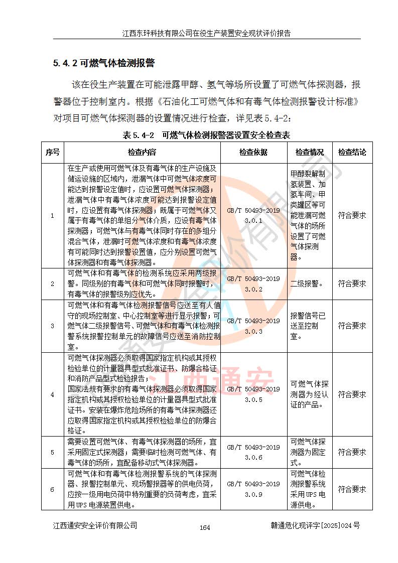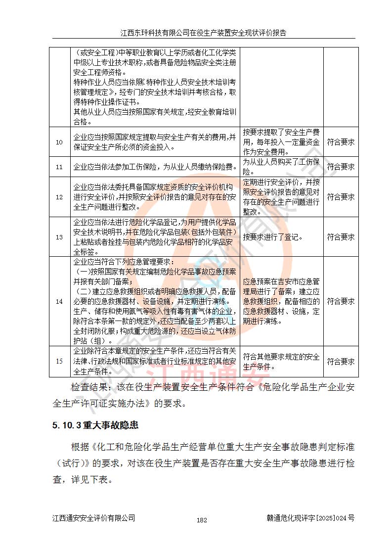 江西東玶科技有限公司位于江西省吉安市吉水縣城西工業(yè)園區(qū),法定**人為徐東,成立于2018年04月08日,注冊(cè)資本叁仟貳佰叁拾萬(wàn)元整,經(jīng)營(yíng)范圍為合成樟腦、α-蒎烯、β-蒎烯、二氫月桂烯(含月桂烯)、莰烯、雙戊烯、氫氣(中間產(chǎn)品)的制造加工(憑**批準(zhǔn)證書(shū)經(jīng)營(yíng));白乙酯、雙萜烯等合成香料的制造加工等。 江西東玶科技有限公司2022年08月01日取得了《安全生產(chǎn)許可證》,許可證編號(hào):(贛)WH安許證字[2022]1160號(hào),許可范圍為合成樟腦(2000t/a)、二氫月桂烯(1000t/a)、月桂烯(3200t/a)、莰烯(1000t/a)、雙戊烯(810t/a)、雙萜烯(1070t/a)、α-蒎烯(7500t/a)、β-蒎烯(3200t/a)、白乙酯(500t/a),**期為2022年08月01日至2025年07月31日。該公司2023年5月29日取得了三級(jí)安全生產(chǎn)標(biāo)準(zhǔn)化證書(shū),證書(shū)編號(hào):贛AQBWHⅢ202300036,**期至2026年5月。該公司現(xiàn)有員工53人,其中專職安全生產(chǎn)管理人員2人。 因生產(chǎn)經(jīng)營(yíng)需要,江西東玶科技有限公司實(shí)施了年產(chǎn)12000噸松節(jié)油深加工系列產(chǎn)品項(xiàng)目(二期),并將二氫月桂烯的設(shè)計(jì)生產(chǎn)規(guī)模2000t/a變更為1500t/a,減少中間產(chǎn)品蒎烷的消耗量,剩余的蒎烷(720t/a)作為產(chǎn)品銷售。江西東玶科技有限公司委托深圳天陽(yáng)工程設(shè)計(jì)有限公司進(jìn)行了設(shè)計(jì)變更,按程序要求進(jìn)行了試生產(chǎn),委托評(píng)價(jià)公司編制了安全驗(yàn)收評(píng)價(jià)報(bào)告,并于2025年1月16日組織專家組和相關(guān)單位進(jìn)行了驗(yàn)收。驗(yàn)收完成后,江西東玶科技有限公司2025年06月04日對(duì)《安全生產(chǎn)許可證》進(jìn)行了變更,許可范圍變更為合成樟腦(2000t/a)、二氫月桂烯(1500t/a)、月桂烯(3200t/a)、莰烯(1000t/a)、雙戊烯(902.5t/a)、雙萜烯(1200.7t/a)、α-蒎烯(7500t/a)、β-蒎烯(3200t/a)、白乙酯(500t/a)、蒎烷(中間產(chǎn)品,720t/a)。 江西東玶科技有限公司在役生產(chǎn)裝置生產(chǎn)過(guò)程中涉及的主要原輔材料為松節(jié)油、乙酸、液堿、甲醇、碳酸鈉、二甲苯、偏鈦酸、甲酸、硫酸銅、雷尼鎳、離子膜、天然氣、氮?dú)?,中間產(chǎn)品為氫氣、α-蒎烯、β-蒎烯、蒎烷,產(chǎn)品為合成樟腦、二氫月桂烯、月桂烯、莰烯、雙戊烯、白乙酯、雙萜烯,副產(chǎn)品為醋酸鈉。根據(jù)《危險(xiǎn)化學(xué)品目錄》,該在役生產(chǎn)裝置涉及的松節(jié)油、乙酸、液堿、甲醇、二甲苯、甲酸、雷尼鎳、天然氣(燃料)、氮?dú)猓▔嚎s的)、柴油,中間產(chǎn)品α-蒎烯、β-蒎烯、氫氣、蒎烷和產(chǎn)品中合成樟腦、二氫月桂烯、月桂烯、莰烯、雙戊烯屬于危險(xiǎn)化學(xué)品。經(jīng)辨識(shí),甲醇、氫氣和天然氣(燃料)屬于重點(diǎn)監(jiān)管的危險(xiǎn)化學(xué)品,甲醇屬于特別管控的危險(xiǎn)化學(xué)品,不涉及監(jiān)控化學(xué)品、易制毒化學(xué)品、易制爆危險(xiǎn)化學(xué)品、劇毒化學(xué)品和高毒物品,生產(chǎn)、儲(chǔ)存單元不構(gòu)成危險(xiǎn)化學(xué)品重大危險(xiǎn)源,涉及的加氫工藝屬于重點(diǎn)監(jiān)管的危險(xiǎn)化工工藝。根據(jù)生產(chǎn)工藝特點(diǎn)及物料的理化特性可知,該在役生產(chǎn)裝置生產(chǎn)過(guò)程中存在火災(zāi)與爆炸、中毒與窒息、觸電、機(jī)械傷害、灼燙等危險(xiǎn)有害因素。 該公司自2022年08月01日取得安全生產(chǎn)許可證以來(lái),生產(chǎn)運(yùn)行正常,未發(fā)生一般及以上生產(chǎn)安全事故。 |