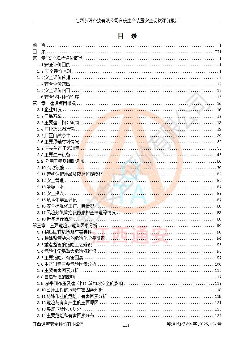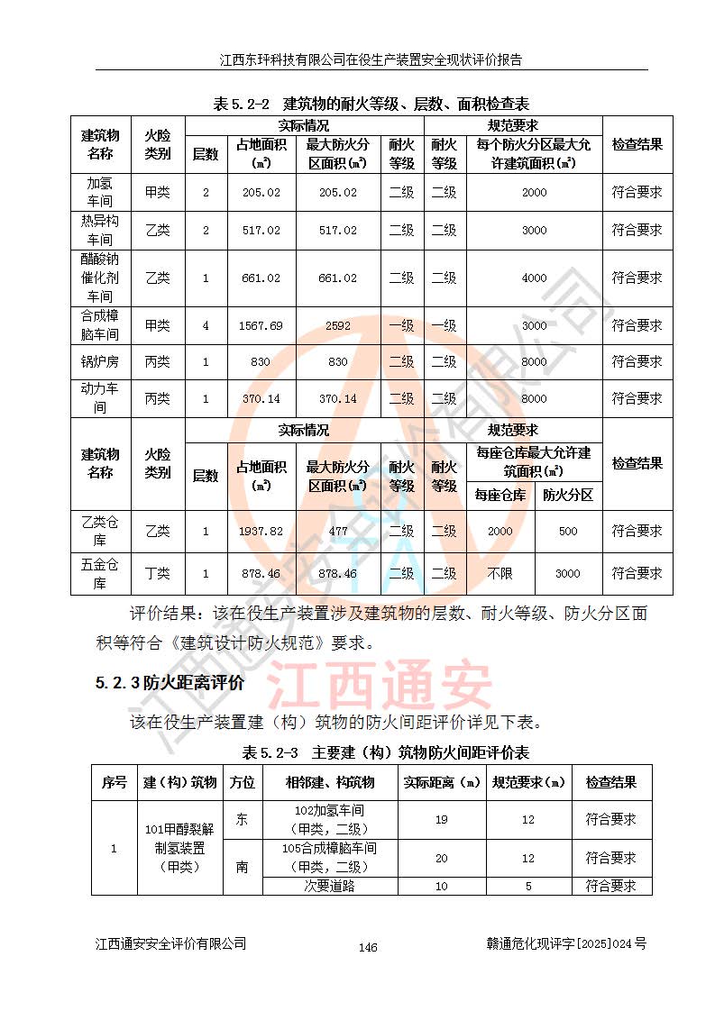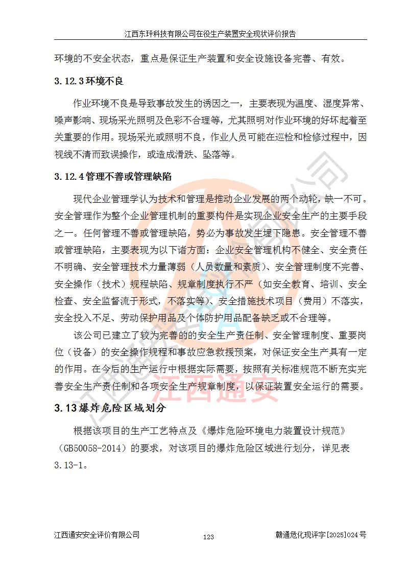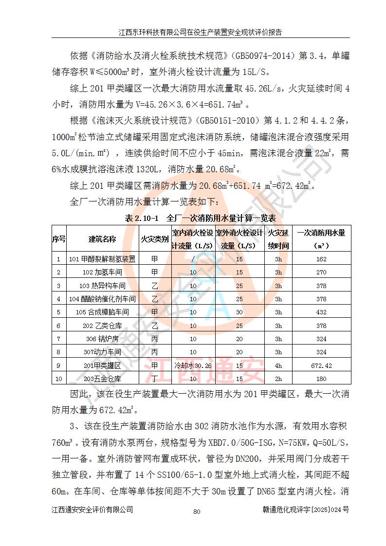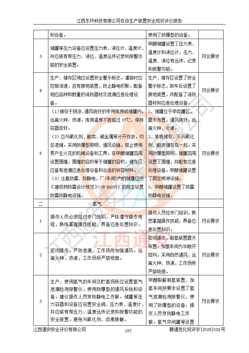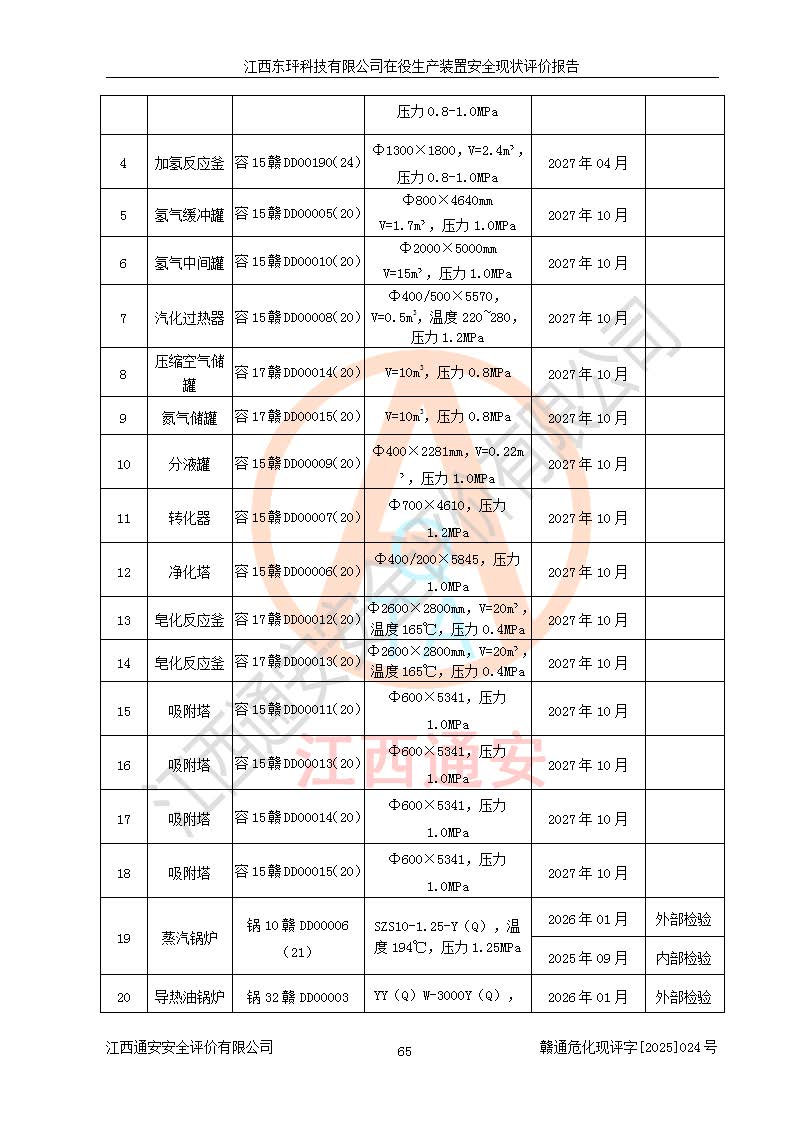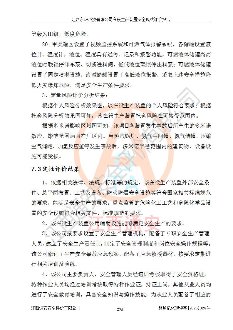 江西東玶科技有限公司位于江西省吉安市吉水縣城西工業(yè)園區(qū),法定**人為徐東,成立于2018年04月08日,注冊(cè)資本叁仟貳佰叁拾萬(wàn)元整,經(jīng)營(yíng)范圍為合成樟腦、α-蒎烯、β-蒎烯、二氫月桂烯(含月桂烯)、莰烯、雙戊烯、氫氣(中間產(chǎn)品)的制造加工(憑**批準(zhǔn)證書(shū)經(jīng)營(yíng));白乙酯、雙萜烯等合成香料的制造加工等。 江西東玶科技有限公司2022年08月01日取得了《安全生產(chǎn)許可證》,許可證編號(hào):(贛)WH安許證字[2022]1160號(hào),許可范圍為合成樟腦(2000t/a)、二氫月桂烯(1000t/a)、月桂烯(3200t/a)、莰烯(1000t/a)、雙戊烯(810t/a)、雙萜烯(1070t/a)、α-蒎烯(7500t/a)、β-蒎烯(3200t/a)、白乙酯(500t/a),**期為2022年08月01日至2025年07月31日。該公司2023年5月29日取得了三級(jí)安全生產(chǎn)標(biāo)準(zhǔn)化證書(shū),證書(shū)編號(hào):贛AQBWHⅢ202300036,**期至2026年5月。該公司現(xiàn)有員工53人,其中專職安全生產(chǎn)管理人員2人。 因生產(chǎn)經(jīng)營(yíng)需要,江西東玶科技有限公司實(shí)施了年產(chǎn)12000噸松節(jié)油深加工系列產(chǎn)品項(xiàng)目(二期),并將二氫月桂烯的設(shè)計(jì)生產(chǎn)規(guī)模2000t/a變更為1500t/a,減少中間產(chǎn)品蒎烷的消耗量,剩余的蒎烷(720t/a)作為產(chǎn)品銷售。江西東玶科技有限公司委托深圳天陽(yáng)工程設(shè)計(jì)有限公司進(jìn)行了設(shè)計(jì)變更,按程序要求進(jìn)行了試生產(chǎn),委托評(píng)價(jià)公司編制了安全驗(yàn)收評(píng)價(jià)報(bào)告,并于2025年1月16日組織專家組和相關(guān)單位進(jìn)行了驗(yàn)收。驗(yàn)收完成后,江西東玶科技有限公司2025年06月04日對(duì)《安全生產(chǎn)許可證》進(jìn)行了變更,許可范圍變更為合成樟腦(2000t/a)、二氫月桂烯(1500t/a)、月桂烯(3200t/a)、莰烯(1000t/a)、雙戊烯(902.5t/a)、雙萜烯(1200.7t/a)、α-蒎烯(7500t/a)、β-蒎烯(3200t/a)、白乙酯(500t/a)、蒎烷(中間產(chǎn)品,720t/a)。 江西東玶科技有限公司在役生產(chǎn)裝置生產(chǎn)過(guò)程中涉及的主要原輔材料為松節(jié)油、乙酸、液堿、甲醇、碳酸鈉、二甲苯、偏鈦酸、甲酸、硫酸銅、雷尼鎳、離子膜、天然氣、氮?dú)?,中間產(chǎn)品為氫氣、α-蒎烯、β-蒎烯、蒎烷,產(chǎn)品為合成樟腦、二氫月桂烯、月桂烯、莰烯、雙戊烯、白乙酯、雙萜烯,副產(chǎn)品為醋酸鈉。根據(jù)《危險(xiǎn)化學(xué)品目錄》,該在役生產(chǎn)裝置涉及的松節(jié)油、乙酸、液堿、甲醇、二甲苯、甲酸、雷尼鎳、天然氣(燃料)、氮?dú)猓▔嚎s的)、柴油,中間產(chǎn)品α-蒎烯、β-蒎烯、氫氣、蒎烷和產(chǎn)品中合成樟腦、二氫月桂烯、月桂烯、莰烯、雙戊烯屬于危險(xiǎn)化學(xué)品。經(jīng)辨識(shí),甲醇、氫氣和天然氣(燃料)屬于重點(diǎn)監(jiān)管的危險(xiǎn)化學(xué)品,甲醇屬于特別管控的危險(xiǎn)化學(xué)品,不涉及監(jiān)控化學(xué)品、易制毒化學(xué)品、易制爆危險(xiǎn)化學(xué)品、劇毒化學(xué)品和高毒物品,生產(chǎn)、儲(chǔ)存單元不構(gòu)成危險(xiǎn)化學(xué)品重大危險(xiǎn)源,涉及的加氫工藝屬于重點(diǎn)監(jiān)管的危險(xiǎn)化工工藝。根據(jù)生產(chǎn)工藝特點(diǎn)及物料的理化特性可知,該在役生產(chǎn)裝置生產(chǎn)過(guò)程中存在火災(zāi)與爆炸、中毒與窒息、觸電、機(jī)械傷害、灼燙等危險(xiǎn)有害因素。 該公司自2022年08月01日取得安全生產(chǎn)許可證以來(lái),生產(chǎn)運(yùn)行正常,未發(fā)生一般及以上生產(chǎn)安全事故。 |
