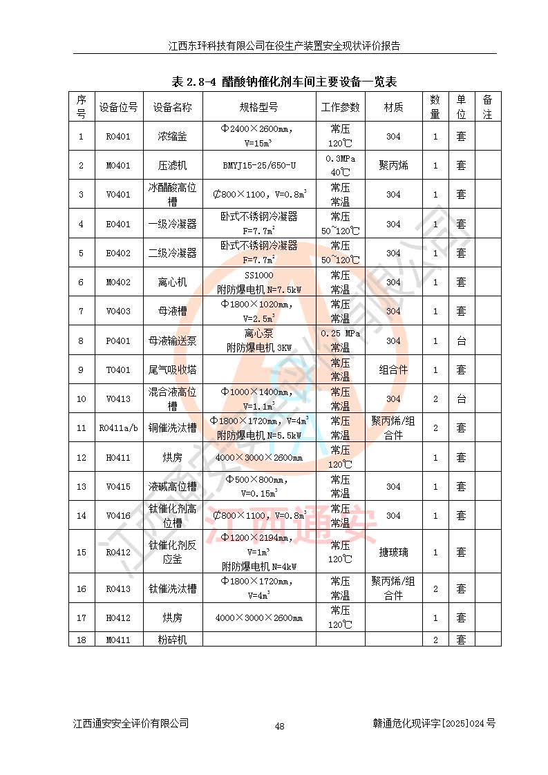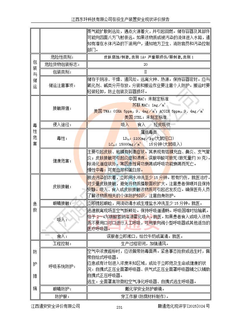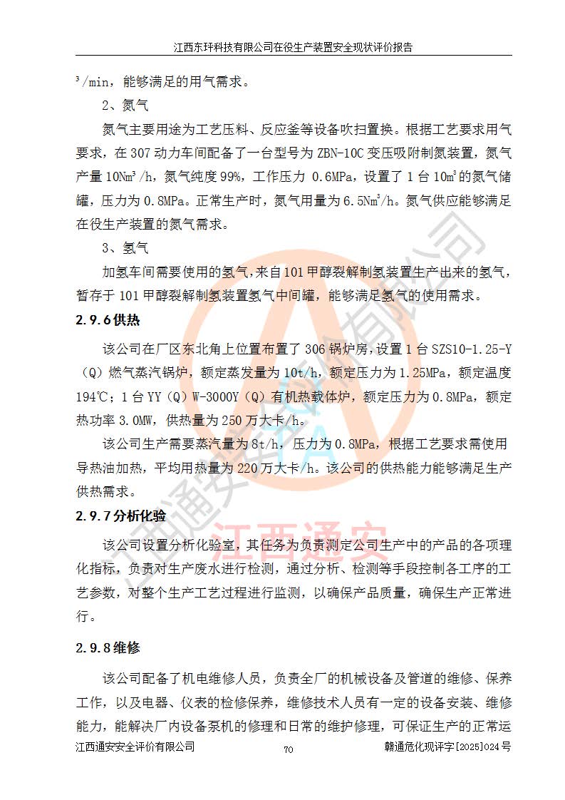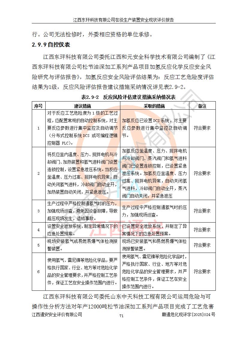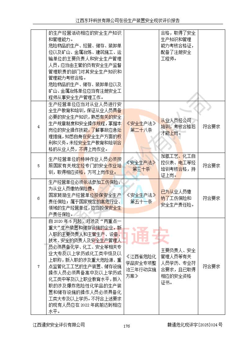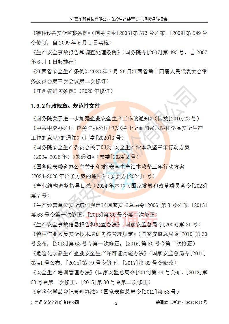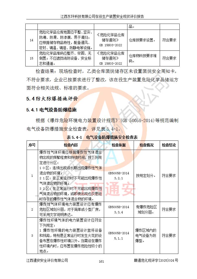 江西東玶科技有限公司位于江西省吉安市吉水縣城西工業(yè)園區(qū),法定**人為徐東,成立于2018年04月08日,注冊(cè)資本叁仟貳佰叁拾萬(wàn)元整,經(jīng)營(yíng)范圍為合成樟腦、α-蒎烯、β-蒎烯、二氫月桂烯(含月桂烯)、莰烯、雙戊烯、氫氣(中間產(chǎn)品)的制造加工(憑**批準(zhǔn)證書(shū)經(jīng)營(yíng));白乙酯、雙萜烯等合成香料的制造加工等。 江西東玶科技有限公司2022年08月01日取得了《安全生產(chǎn)許可證》,許可證編號(hào):(贛)WH安許證字[2022]1160號(hào),許可范圍為合成樟腦(2000t/a)、二氫月桂烯(1000t/a)、月桂烯(3200t/a)、莰烯(1000t/a)、雙戊烯(810t/a)、雙萜烯(1070t/a)、α-蒎烯(7500t/a)、β-蒎烯(3200t/a)、白乙酯(500t/a),**期為2022年08月01日至2025年07月31日。該公司2023年5月29日取得了三級(jí)安全生產(chǎn)標(biāo)準(zhǔn)化證書(shū),證書(shū)編號(hào):贛AQBWHⅢ202300036,**期至2026年5月。該公司現(xiàn)有員工53人,其中專職安全生產(chǎn)管理人員2人。 因生產(chǎn)經(jīng)營(yíng)需要,江西東玶科技有限公司實(shí)施了年產(chǎn)12000噸松節(jié)油深加工系列產(chǎn)品項(xiàng)目(二期),并將二氫月桂烯的設(shè)計(jì)生產(chǎn)規(guī)模2000t/a變更為1500t/a,減少中間產(chǎn)品蒎烷的消耗量,剩余的蒎烷(720t/a)作為產(chǎn)品銷售。江西東玶科技有限公司委托深圳天陽(yáng)工程設(shè)計(jì)有限公司進(jìn)行了設(shè)計(jì)變更,按程序要求進(jìn)行了試生產(chǎn),委托評(píng)價(jià)公司編制了安全驗(yàn)收評(píng)價(jià)報(bào)告,并于2025年1月16日組織專家組和相關(guān)單位進(jìn)行了驗(yàn)收。驗(yàn)收完成后,江西東玶科技有限公司2025年06月04日對(duì)《安全生產(chǎn)許可證》進(jìn)行了變更,許可范圍變更為合成樟腦(2000t/a)、二氫月桂烯(1500t/a)、月桂烯(3200t/a)、莰烯(1000t/a)、雙戊烯(902.5t/a)、雙萜烯(1200.7t/a)、α-蒎烯(7500t/a)、β-蒎烯(3200t/a)、白乙酯(500t/a)、蒎烷(中間產(chǎn)品,720t/a)。 江西東玶科技有限公司在役生產(chǎn)裝置生產(chǎn)過(guò)程中涉及的主要原輔材料為松節(jié)油、乙酸、液堿、甲醇、碳酸鈉、二甲苯、偏鈦酸、甲酸、硫酸銅、雷尼鎳、離子膜、天然氣、氮?dú)?,中間產(chǎn)品為氫氣、α-蒎烯、β-蒎烯、蒎烷,產(chǎn)品為合成樟腦、二氫月桂烯、月桂烯、莰烯、雙戊烯、白乙酯、雙萜烯,副產(chǎn)品為醋酸鈉。根據(jù)《危險(xiǎn)化學(xué)品目錄》,該在役生產(chǎn)裝置涉及的松節(jié)油、乙酸、液堿、甲醇、二甲苯、甲酸、雷尼鎳、天然氣(燃料)、氮?dú)猓▔嚎s的)、柴油,中間產(chǎn)品α-蒎烯、β-蒎烯、氫氣、蒎烷和產(chǎn)品中合成樟腦、二氫月桂烯、月桂烯、莰烯、雙戊烯屬于危險(xiǎn)化學(xué)品。經(jīng)辨識(shí),甲醇、氫氣和天然氣(燃料)屬于重點(diǎn)監(jiān)管的危險(xiǎn)化學(xué)品,甲醇屬于特別管控的危險(xiǎn)化學(xué)品,不涉及監(jiān)控化學(xué)品、易制毒化學(xué)品、易制爆危險(xiǎn)化學(xué)品、劇毒化學(xué)品和高毒物品,生產(chǎn)、儲(chǔ)存單元不構(gòu)成危險(xiǎn)化學(xué)品重大危險(xiǎn)源,涉及的加氫工藝屬于重點(diǎn)監(jiān)管的危險(xiǎn)化工工藝。根據(jù)生產(chǎn)工藝特點(diǎn)及物料的理化特性可知,該在役生產(chǎn)裝置生產(chǎn)過(guò)程中存在火災(zāi)與爆炸、中毒與窒息、觸電、機(jī)械傷害、灼燙等危險(xiǎn)有害因素。 該公司自2022年08月01日取得安全生產(chǎn)許可證以來(lái),生產(chǎn)運(yùn)行正常,未發(fā)生一般及以上生產(chǎn)安全事故。 |