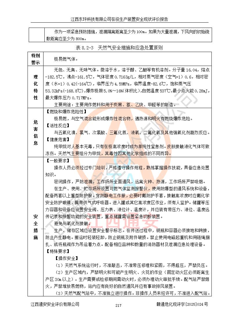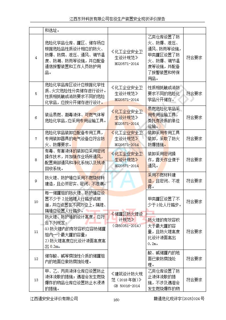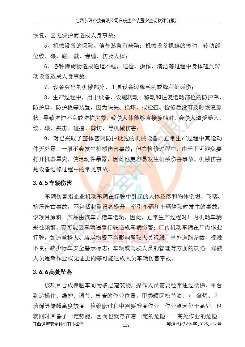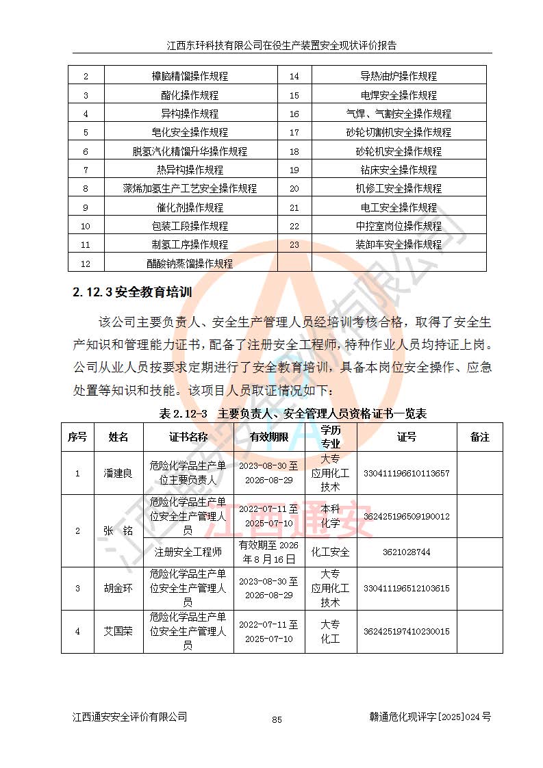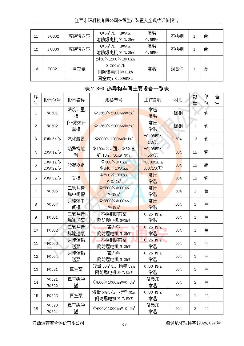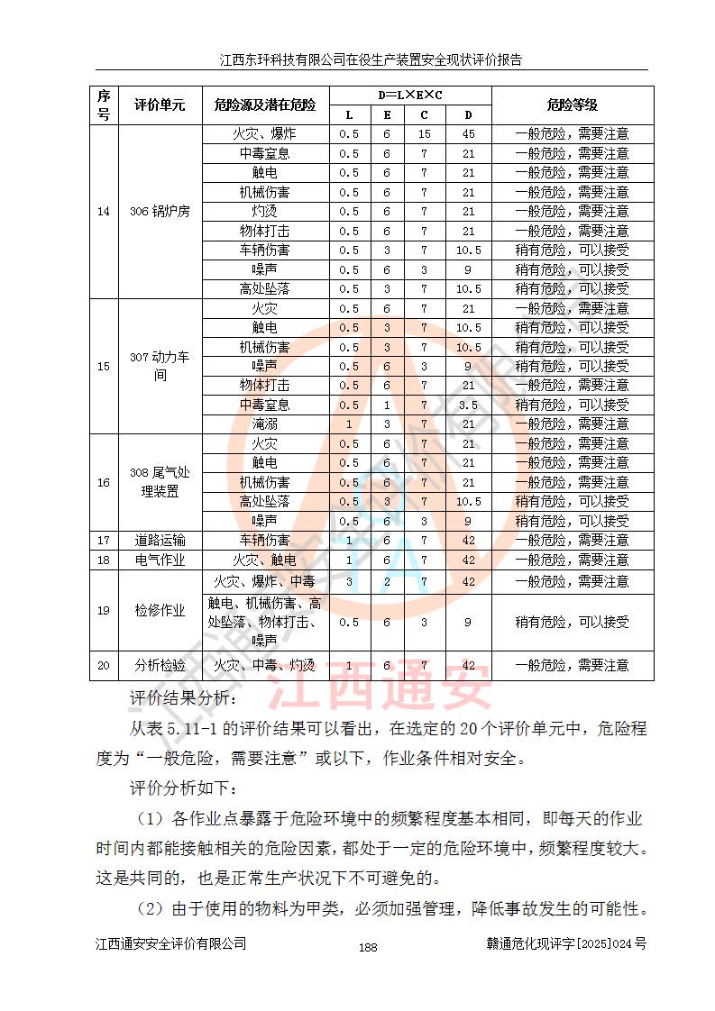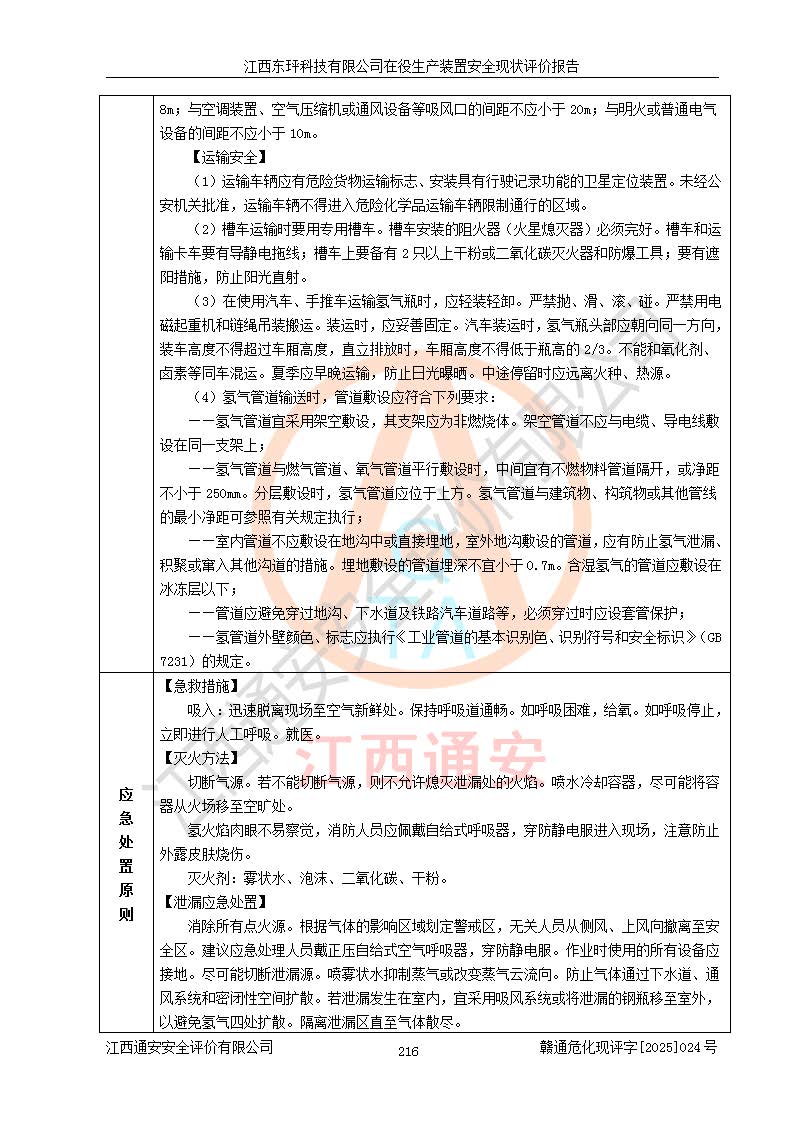 江西東玶科技有限公司位于江西省吉安市吉水縣城西工業(yè)園區(qū),法定**人為徐東,成立于2018年04月08日,注冊(cè)資本叁仟貳佰叁拾萬(wàn)元整,經(jīng)營(yíng)范圍為合成樟腦、α-蒎烯、β-蒎烯、二氫月桂烯(含月桂烯)、莰烯、雙戊烯、氫氣(中間產(chǎn)品)的制造加工(憑**批準(zhǔn)證書(shū)經(jīng)營(yíng));白乙酯、雙萜烯等合成香料的制造加工等。 江西東玶科技有限公司2022年08月01日取得了《安全生產(chǎn)許可證》,許可證編號(hào):(贛)WH安許證字[2022]1160號(hào),許可范圍為合成樟腦(2000t/a)、二氫月桂烯(1000t/a)、月桂烯(3200t/a)、莰烯(1000t/a)、雙戊烯(810t/a)、雙萜烯(1070t/a)、α-蒎烯(7500t/a)、β-蒎烯(3200t/a)、白乙酯(500t/a),**期為2022年08月01日至2025年07月31日。該公司2023年5月29日取得了三級(jí)安全生產(chǎn)標(biāo)準(zhǔn)化證書(shū),證書(shū)編號(hào):贛AQBWHⅢ202300036,**期至2026年5月。該公司現(xiàn)有員工53人,其中專職安全生產(chǎn)管理人員2人。 因生產(chǎn)經(jīng)營(yíng)需要,江西東玶科技有限公司實(shí)施了年產(chǎn)12000噸松節(jié)油深加工系列產(chǎn)品項(xiàng)目(二期),并將二氫月桂烯的設(shè)計(jì)生產(chǎn)規(guī)模2000t/a變更為1500t/a,減少中間產(chǎn)品蒎烷的消耗量,剩余的蒎烷(720t/a)作為產(chǎn)品銷售。江西東玶科技有限公司委托深圳天陽(yáng)工程設(shè)計(jì)有限公司進(jìn)行了設(shè)計(jì)變更,按程序要求進(jìn)行了試生產(chǎn),委托評(píng)價(jià)公司編制了安全驗(yàn)收評(píng)價(jià)報(bào)告,并于2025年1月16日組織專家組和相關(guān)單位進(jìn)行了驗(yàn)收。驗(yàn)收完成后,江西東玶科技有限公司2025年06月04日對(duì)《安全生產(chǎn)許可證》進(jìn)行了變更,許可范圍變更為合成樟腦(2000t/a)、二氫月桂烯(1500t/a)、月桂烯(3200t/a)、莰烯(1000t/a)、雙戊烯(902.5t/a)、雙萜烯(1200.7t/a)、α-蒎烯(7500t/a)、β-蒎烯(3200t/a)、白乙酯(500t/a)、蒎烷(中間產(chǎn)品,720t/a)。 江西東玶科技有限公司在役生產(chǎn)裝置生產(chǎn)過(guò)程中涉及的主要原輔材料為松節(jié)油、乙酸、液堿、甲醇、碳酸鈉、二甲苯、偏鈦酸、甲酸、硫酸銅、雷尼鎳、離子膜、天然氣、氮?dú)?,中間產(chǎn)品為氫氣、α-蒎烯、β-蒎烯、蒎烷,產(chǎn)品為合成樟腦、二氫月桂烯、月桂烯、莰烯、雙戊烯、白乙酯、雙萜烯,副產(chǎn)品為醋酸鈉。根據(jù)《危險(xiǎn)化學(xué)品目錄》,該在役生產(chǎn)裝置涉及的松節(jié)油、乙酸、液堿、甲醇、二甲苯、甲酸、雷尼鎳、天然氣(燃料)、氮?dú)猓▔嚎s的)、柴油,中間產(chǎn)品α-蒎烯、β-蒎烯、氫氣、蒎烷和產(chǎn)品中合成樟腦、二氫月桂烯、月桂烯、莰烯、雙戊烯屬于危險(xiǎn)化學(xué)品。經(jīng)辨識(shí),甲醇、氫氣和天然氣(燃料)屬于重點(diǎn)監(jiān)管的危險(xiǎn)化學(xué)品,甲醇屬于特別管控的危險(xiǎn)化學(xué)品,不涉及監(jiān)控化學(xué)品、易制毒化學(xué)品、易制爆危險(xiǎn)化學(xué)品、劇毒化學(xué)品和高毒物品,生產(chǎn)、儲(chǔ)存單元不構(gòu)成危險(xiǎn)化學(xué)品重大危險(xiǎn)源,涉及的加氫工藝屬于重點(diǎn)監(jiān)管的危險(xiǎn)化工工藝。根據(jù)生產(chǎn)工藝特點(diǎn)及物料的理化特性可知,該在役生產(chǎn)裝置生產(chǎn)過(guò)程中存在火災(zāi)與爆炸、中毒與窒息、觸電、機(jī)械傷害、灼燙等危險(xiǎn)有害因素。 該公司自2022年08月01日取得安全生產(chǎn)許可證以來(lái),生產(chǎn)運(yùn)行正常,未發(fā)生一般及以上生產(chǎn)安全事故。 |