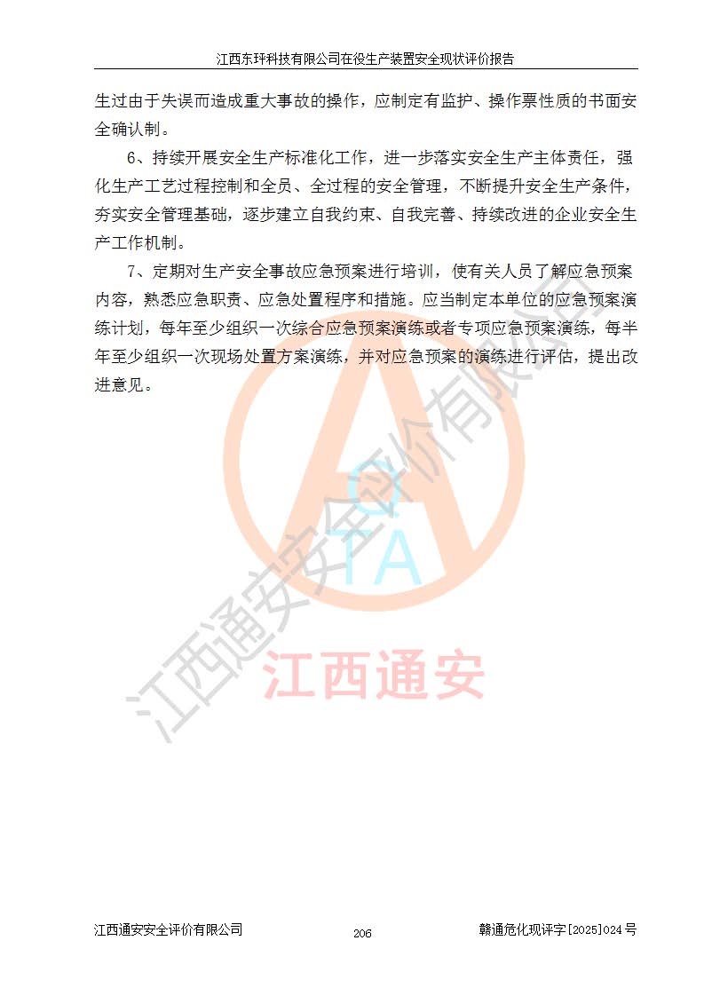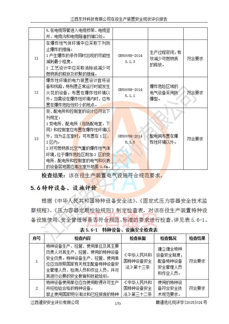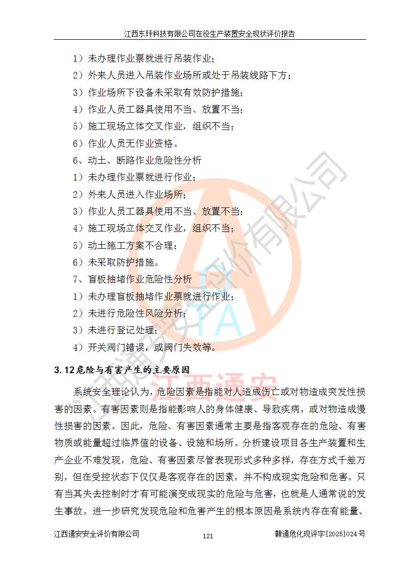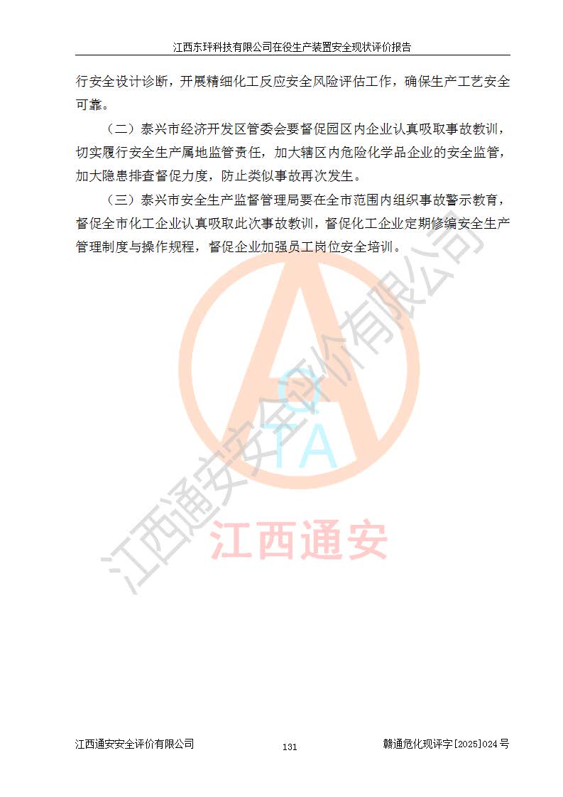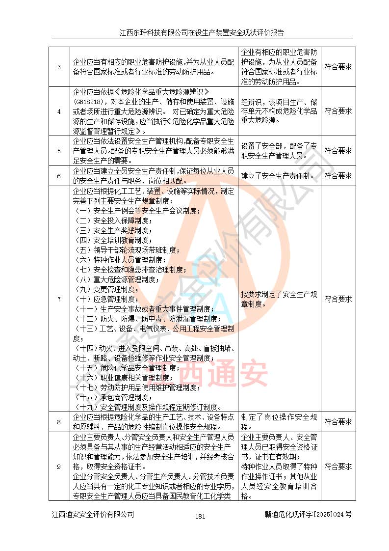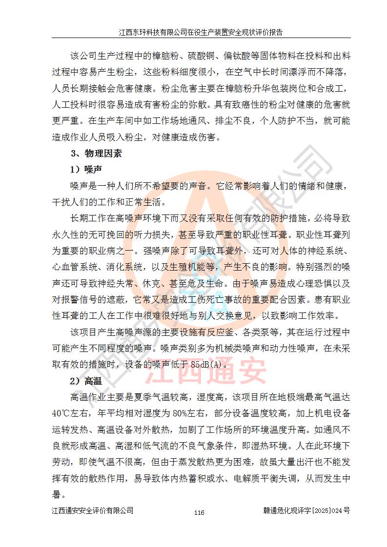 江西東玶科技有限公司位于江西省吉安市吉水縣城西工業(yè)園區(qū),法定**人為徐東,成立于2018年04月08日,注冊(cè)資本叁仟貳佰叁拾萬(wàn)元整,經(jīng)營(yíng)范圍為合成樟腦、α-蒎烯、β-蒎烯、二氫月桂烯(含月桂烯)、莰烯、雙戊烯、氫氣(中間產(chǎn)品)的制造加工(憑**批準(zhǔn)證書(shū)經(jīng)營(yíng));白乙酯、雙萜烯等合成香料的制造加工等。 江西東玶科技有限公司2022年08月01日取得了《安全生產(chǎn)許可證》,許可證編號(hào):(贛)WH安許證字[2022]1160號(hào),許可范圍為合成樟腦(2000t/a)、二氫月桂烯(1000t/a)、月桂烯(3200t/a)、莰烯(1000t/a)、雙戊烯(810t/a)、雙萜烯(1070t/a)、α-蒎烯(7500t/a)、β-蒎烯(3200t/a)、白乙酯(500t/a),**期為2022年08月01日至2025年07月31日。該公司2023年5月29日取得了三級(jí)安全生產(chǎn)標(biāo)準(zhǔn)化證書(shū),證書(shū)編號(hào):贛AQBWHⅢ202300036,**期至2026年5月。該公司現(xiàn)有員工53人,其中專職安全生產(chǎn)管理人員2人。 因生產(chǎn)經(jīng)營(yíng)需要,江西東玶科技有限公司實(shí)施了年產(chǎn)12000噸松節(jié)油深加工系列產(chǎn)品項(xiàng)目(二期),并將二氫月桂烯的設(shè)計(jì)生產(chǎn)規(guī)模2000t/a變更為1500t/a,減少中間產(chǎn)品蒎烷的消耗量,剩余的蒎烷(720t/a)作為產(chǎn)品銷售。江西東玶科技有限公司委托深圳天陽(yáng)工程設(shè)計(jì)有限公司進(jìn)行了設(shè)計(jì)變更,按程序要求進(jìn)行了試生產(chǎn),委托評(píng)價(jià)公司編制了安全驗(yàn)收評(píng)價(jià)報(bào)告,并于2025年1月16日組織專家組和相關(guān)單位進(jìn)行了驗(yàn)收。驗(yàn)收完成后,江西東玶科技有限公司2025年06月04日對(duì)《安全生產(chǎn)許可證》進(jìn)行了變更,許可范圍變更為合成樟腦(2000t/a)、二氫月桂烯(1500t/a)、月桂烯(3200t/a)、莰烯(1000t/a)、雙戊烯(902.5t/a)、雙萜烯(1200.7t/a)、α-蒎烯(7500t/a)、β-蒎烯(3200t/a)、白乙酯(500t/a)、蒎烷(中間產(chǎn)品,720t/a)。 江西東玶科技有限公司在役生產(chǎn)裝置生產(chǎn)過(guò)程中涉及的主要原輔材料為松節(jié)油、乙酸、液堿、甲醇、碳酸鈉、二甲苯、偏鈦酸、甲酸、硫酸銅、雷尼鎳、離子膜、天然氣、氮?dú)?,中間產(chǎn)品為氫氣、α-蒎烯、β-蒎烯、蒎烷,產(chǎn)品為合成樟腦、二氫月桂烯、月桂烯、莰烯、雙戊烯、白乙酯、雙萜烯,副產(chǎn)品為醋酸鈉。根據(jù)《危險(xiǎn)化學(xué)品目錄》,該在役生產(chǎn)裝置涉及的松節(jié)油、乙酸、液堿、甲醇、二甲苯、甲酸、雷尼鎳、天然氣(燃料)、氮?dú)猓▔嚎s的)、柴油,中間產(chǎn)品α-蒎烯、β-蒎烯、氫氣、蒎烷和產(chǎn)品中合成樟腦、二氫月桂烯、月桂烯、莰烯、雙戊烯屬于危險(xiǎn)化學(xué)品。經(jīng)辨識(shí),甲醇、氫氣和天然氣(燃料)屬于重點(diǎn)監(jiān)管的危險(xiǎn)化學(xué)品,甲醇屬于特別管控的危險(xiǎn)化學(xué)品,不涉及監(jiān)控化學(xué)品、易制毒化學(xué)品、易制爆危險(xiǎn)化學(xué)品、劇毒化學(xué)品和高毒物品,生產(chǎn)、儲(chǔ)存單元不構(gòu)成危險(xiǎn)化學(xué)品重大危險(xiǎn)源,涉及的加氫工藝屬于重點(diǎn)監(jiān)管的危險(xiǎn)化工工藝。根據(jù)生產(chǎn)工藝特點(diǎn)及物料的理化特性可知,該在役生產(chǎn)裝置生產(chǎn)過(guò)程中存在火災(zāi)與爆炸、中毒與窒息、觸電、機(jī)械傷害、灼燙等危險(xiǎn)有害因素。 該公司自2022年08月01日取得安全生產(chǎn)許可證以來(lái),生產(chǎn)運(yùn)行正常,未發(fā)生一般及以上生產(chǎn)安全事故。 |
