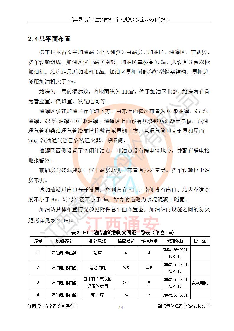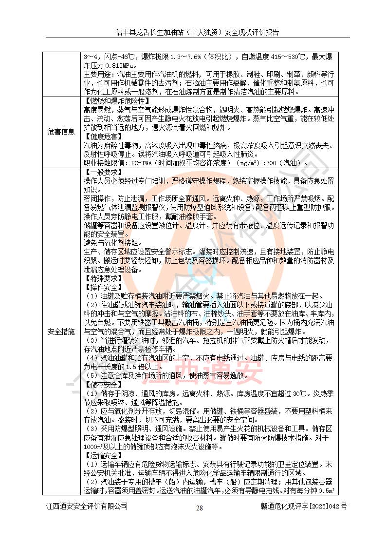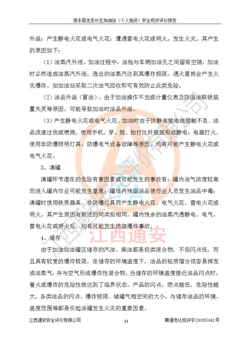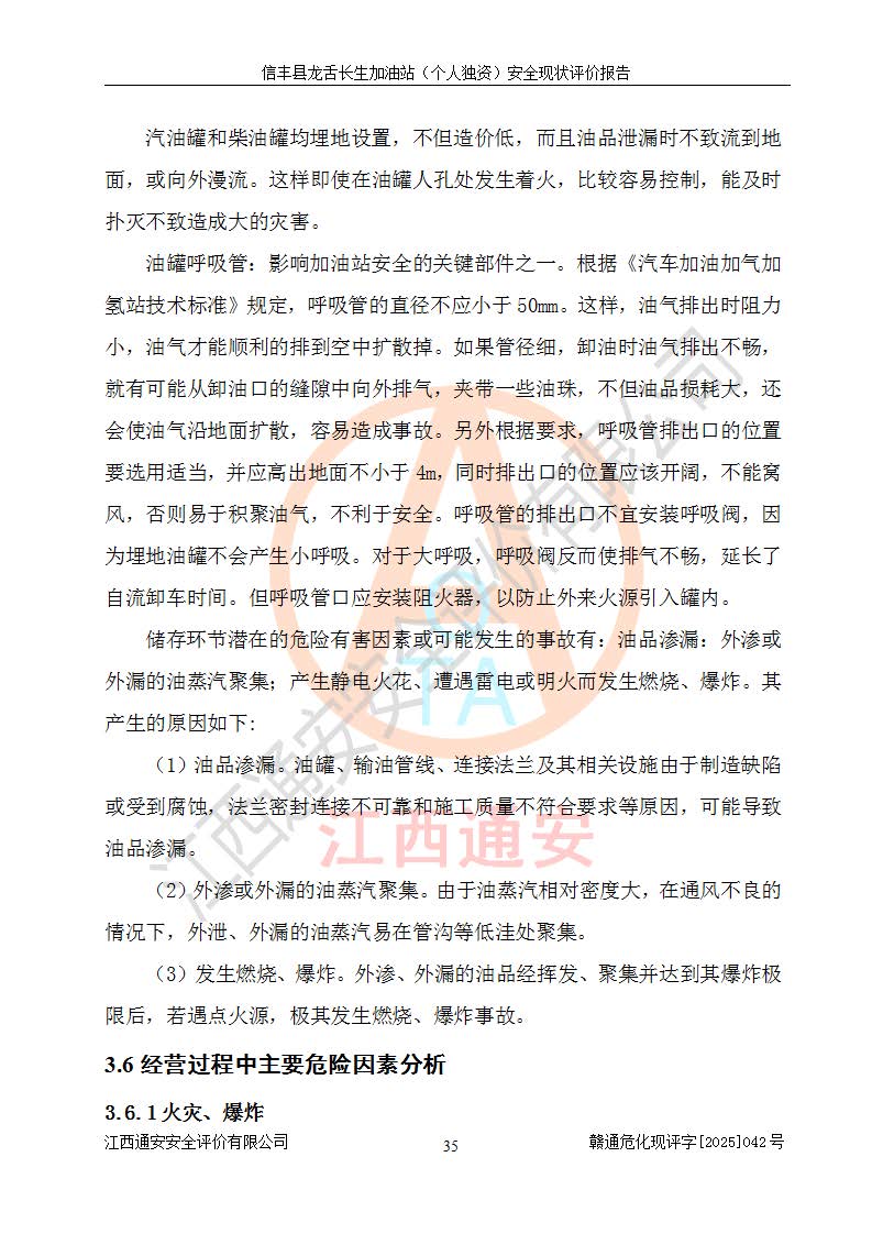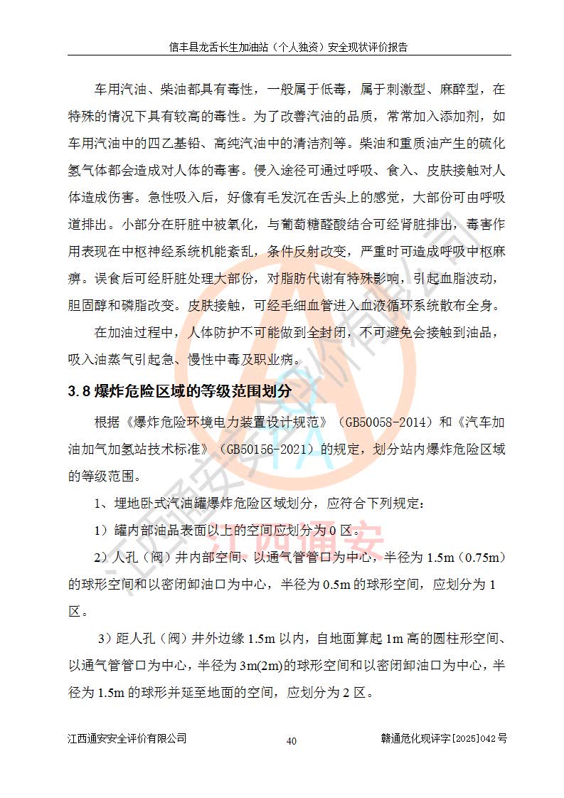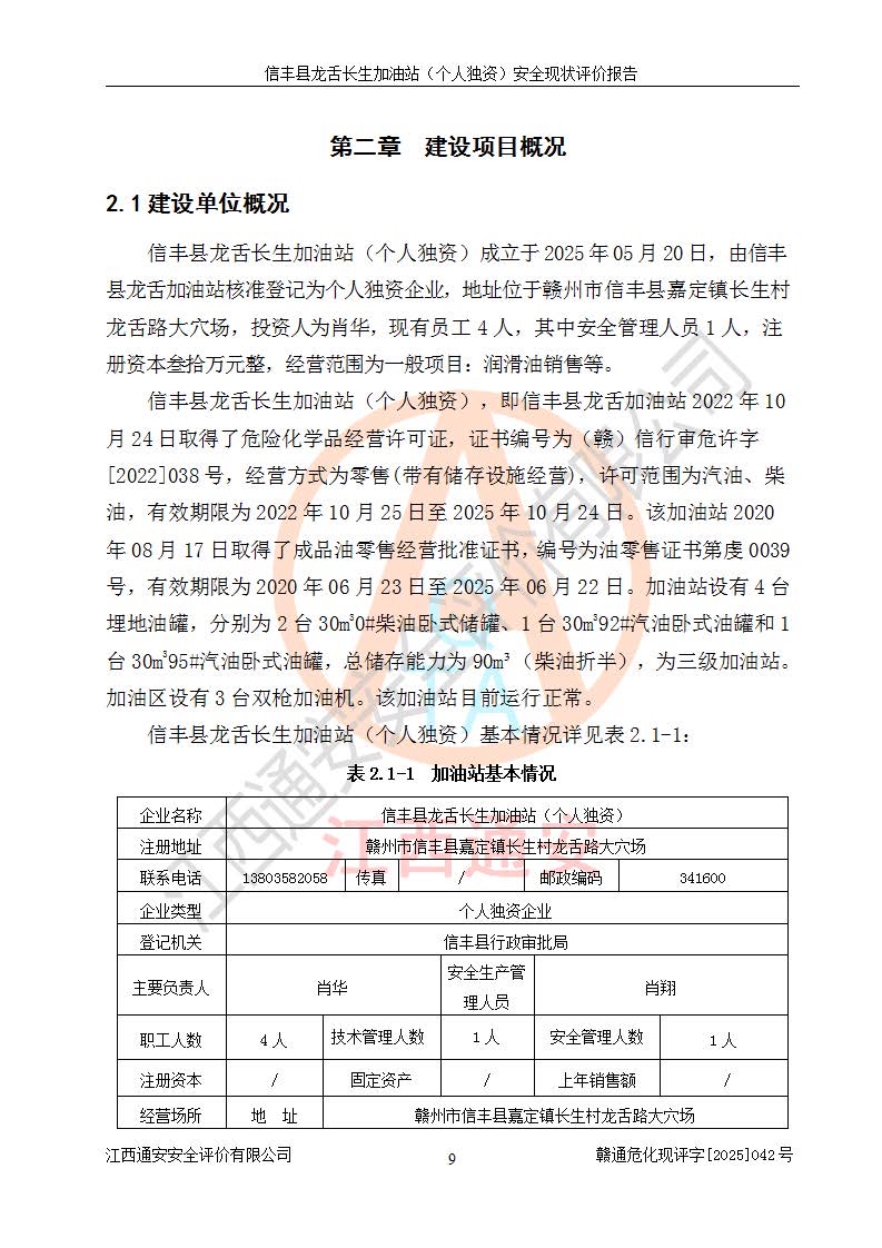 項目簡介 | 信豐縣龍舌長生加油站(個人獨資)成立于2025年05月20日,由信豐縣龍舌加油站核準登記為個人獨資企業(yè),地址位于贛州市信豐縣嘉定鎮(zhèn)長生村龍舌路大穴場,投資人為肖華,現(xiàn)有員工4人,其中安全管理人員1人,注冊資本叁拾萬元整,經營范圍為一般項目:潤滑油銷售等。 信豐縣龍舌長生加油站(個人獨資),即信豐縣龍舌加油站2022年10月24日取得了危險化學品經營許可證,證書編號為(贛)信行審危許字[2022]038號,經營方式為零售,許可范圍為汽油、柴油,**期限為2022年10月25日至2025年10月24日。該加油站2020年08月17日取得了成品油零售經營批準證書,編號為油零售證書第虔0039號,**期限為2020年06月23日至2025年06月22日。加油站設有4臺埋地油罐,分別為2臺30m30#柴油臥式儲罐、1臺30m392#汽油臥式油罐和1臺30m395#汽油臥式油罐,總儲存能力為90m3(柴油折半),為三級加油站。加油區(qū)設有3臺雙槍加油機。該加油站目前運行正常。 | |||