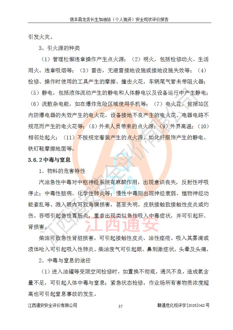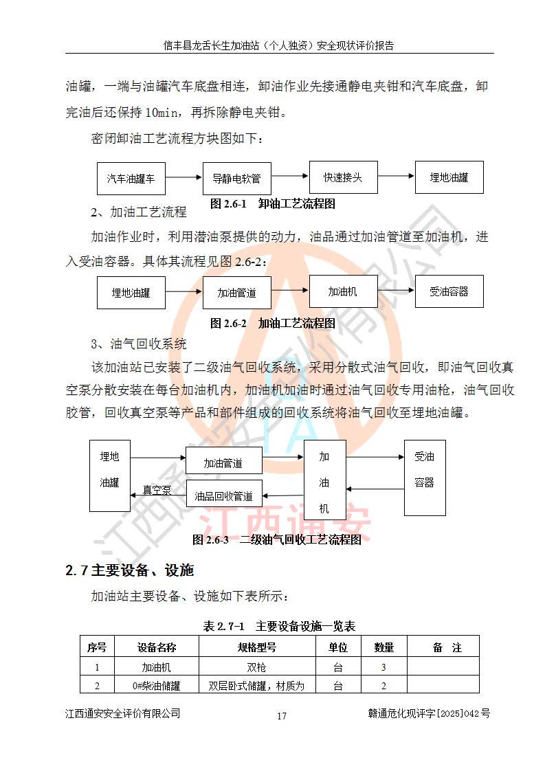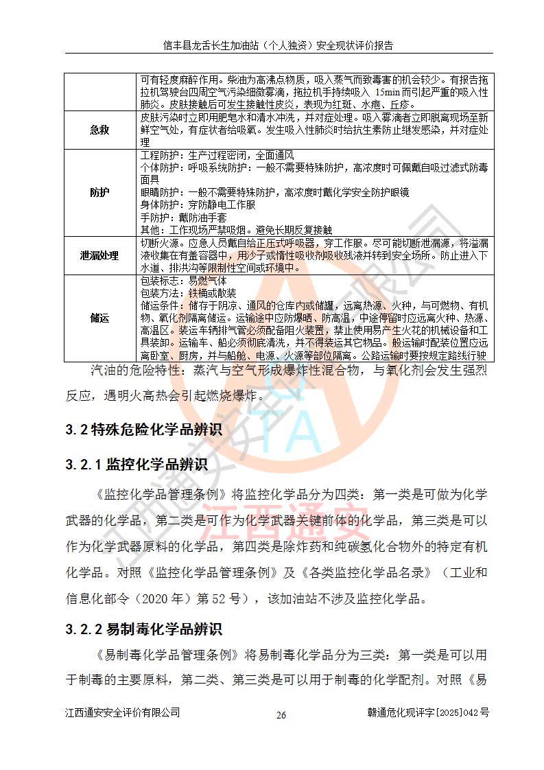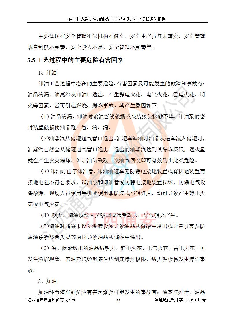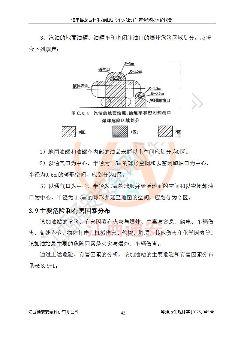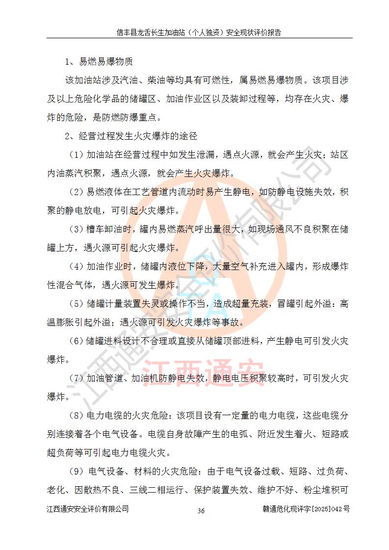 項目簡介 | 信豐縣龍舌長生加油站(個人獨資)成立于2025年05月20日,由信豐縣龍舌加油站核準登記為個人獨資企業(yè),地址位于贛州市信豐縣嘉定鎮(zhèn)長生村龍舌路大穴場,投資人為肖華,現(xiàn)有員工4人,其中安全管理人員1人,注冊資本叁拾萬元整,經營范圍為一般項目:潤滑油銷售等。 信豐縣龍舌長生加油站(個人獨資),即信豐縣龍舌加油站2022年10月24日取得了危險化學品經營許可證,證書編號為(贛)信行審危許字[2022]038號,經營方式為零售,許可范圍為汽油、柴油,**期限為2022年10月25日至2025年10月24日。該加油站2020年08月17日取得了成品油零售經營批準證書,編號為油零售證書第虔0039號,**期限為2020年06月23日至2025年06月22日。加油站設有4臺埋地油罐,分別為2臺30m30#柴油臥式儲罐、1臺30m392#汽油臥式油罐和1臺30m395#汽油臥式油罐,總儲存能力為90m3(柴油折半),為三級加油站。加油區(qū)設有3臺雙槍加油機。該加油站目前運行正常。 | |||