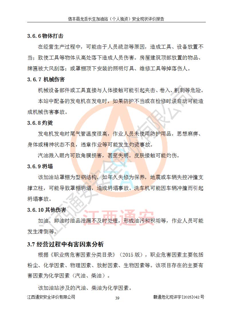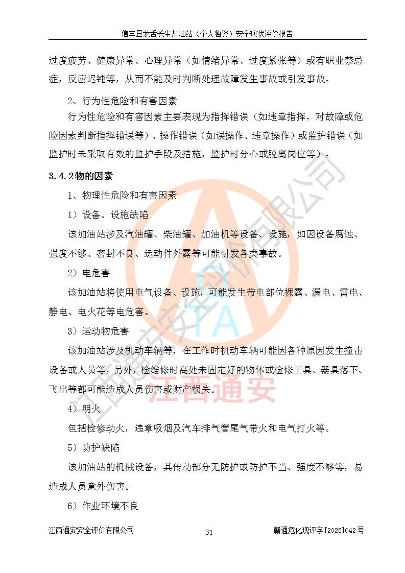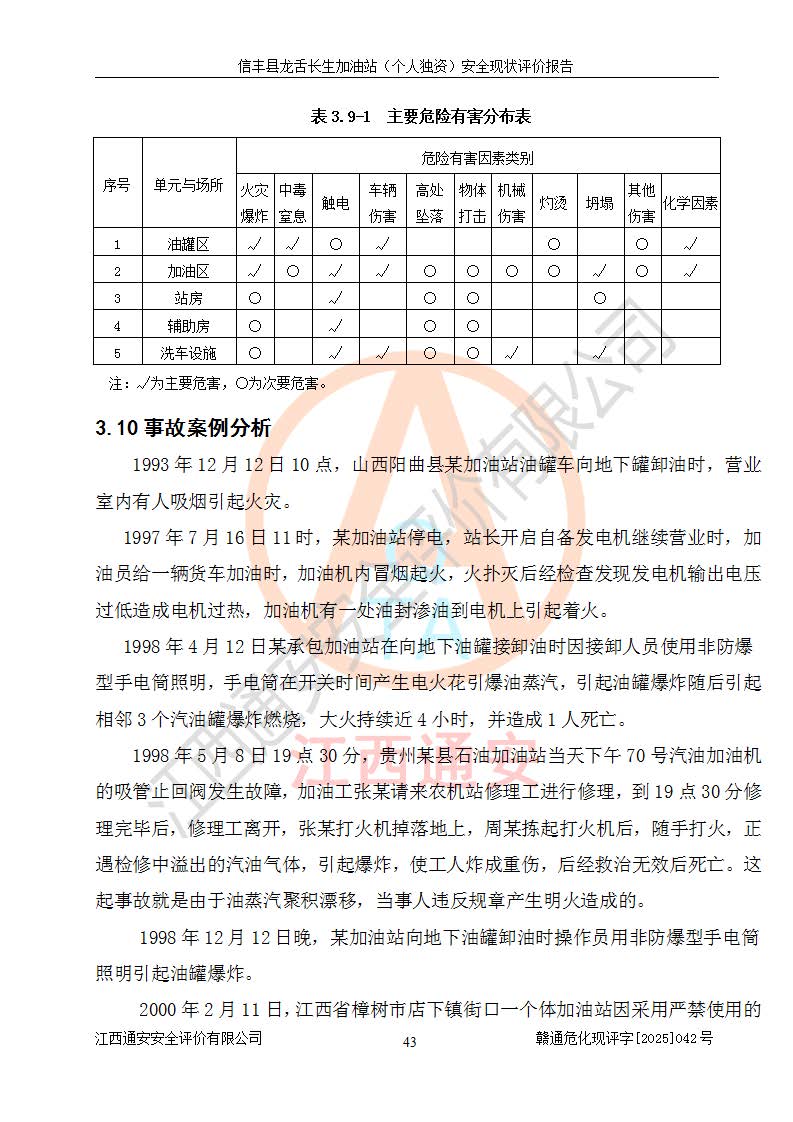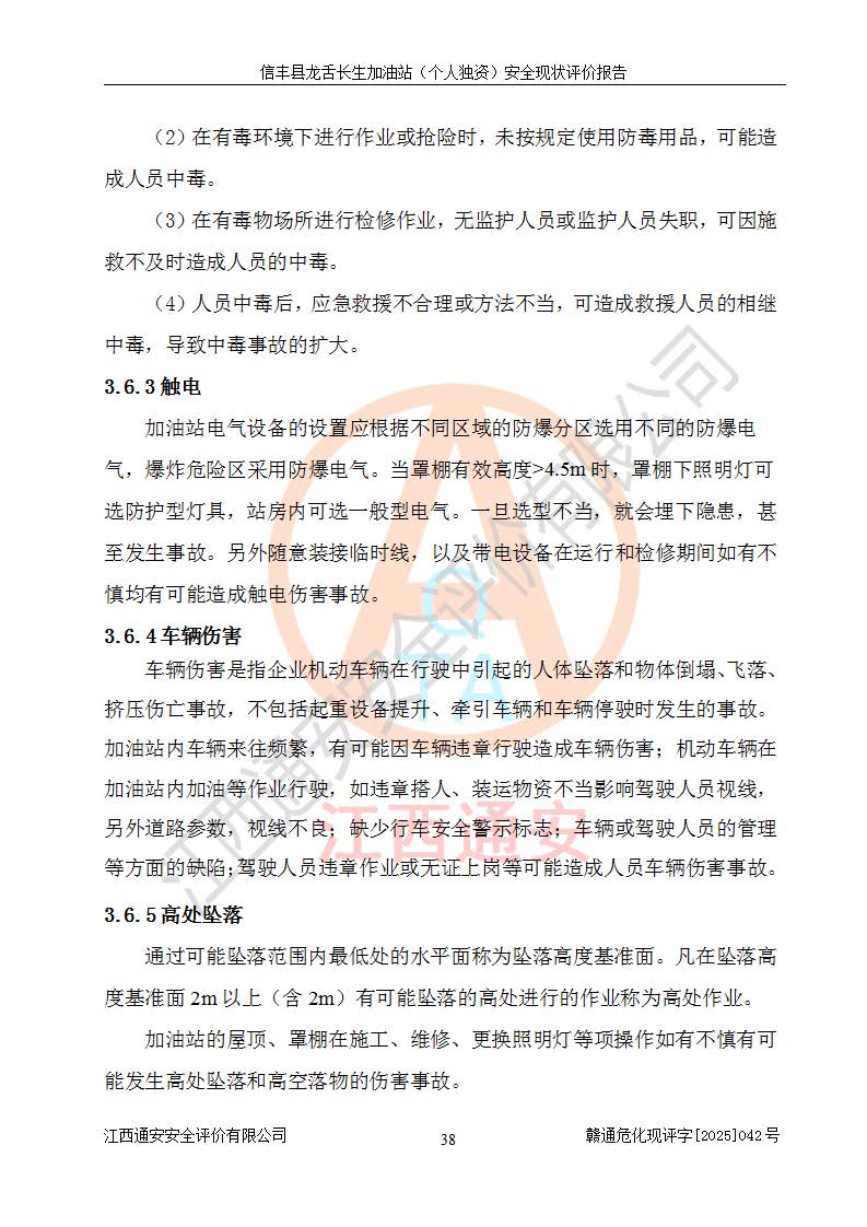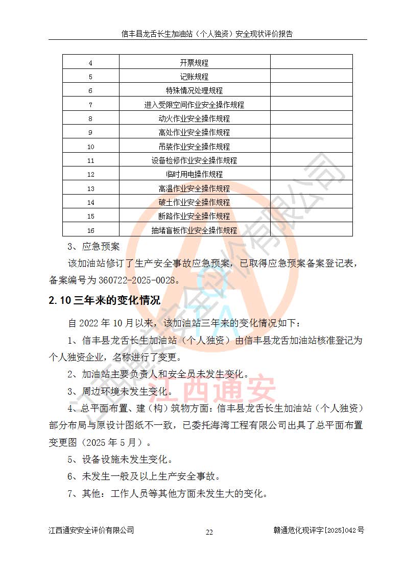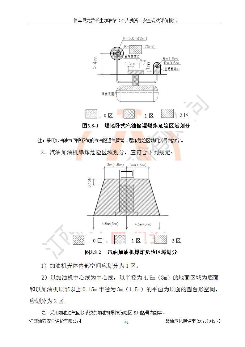 項目簡介 | 信豐縣龍舌長生加油站(個人獨資)成立于2025年05月20日,由信豐縣龍舌加油站核準登記為個人獨資企業(yè),地址位于贛州市信豐縣嘉定鎮(zhèn)長生村龍舌路大穴場,投資人為肖華,現(xiàn)有員工4人,其中安全管理人員1人,注冊資本叁拾萬元整,經營范圍為一般項目:潤滑油銷售等。 信豐縣龍舌長生加油站(個人獨資),即信豐縣龍舌加油站2022年10月24日取得了危險化學品經營許可證,證書編號為(贛)信行審危許字[2022]038號,經營方式為零售,許可范圍為汽油、柴油,**期限為2022年10月25日至2025年10月24日。該加油站2020年08月17日取得了成品油零售經營批準證書,編號為油零售證書第虔0039號,**期限為2020年06月23日至2025年06月22日。加油站設有4臺埋地油罐,分別為2臺30m30#柴油臥式儲罐、1臺30m392#汽油臥式油罐和1臺30m395#汽油臥式油罐,總儲存能力為90m3(柴油折半),為三級加油站。加油區(qū)設有3臺雙槍加油機。該加油站目前運行正常。 | |||
