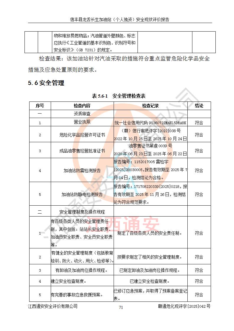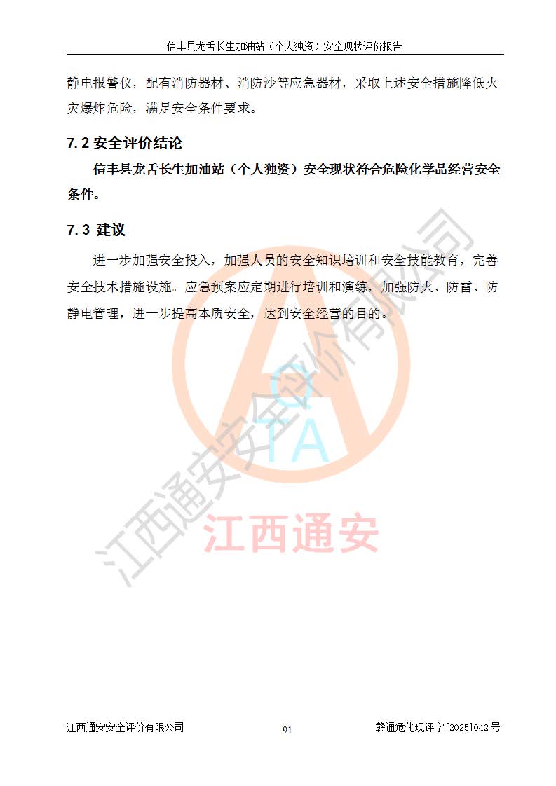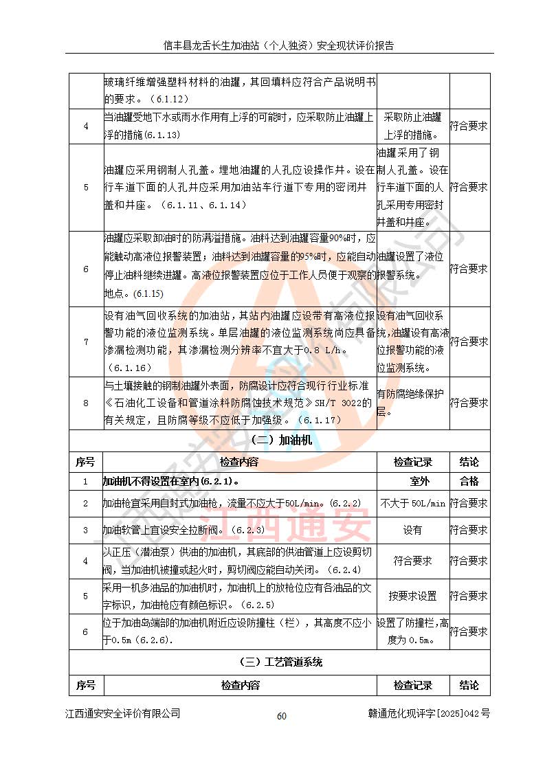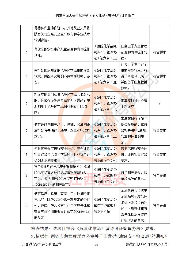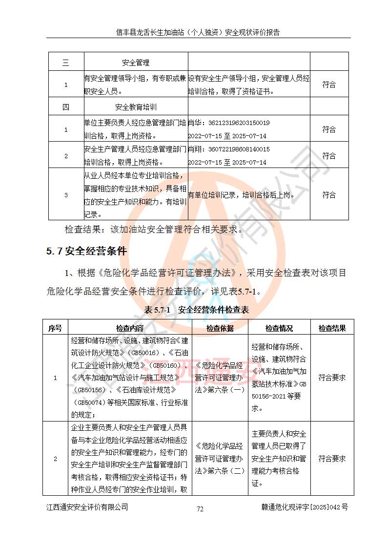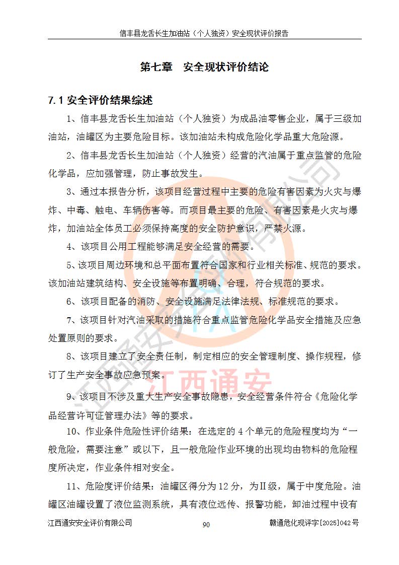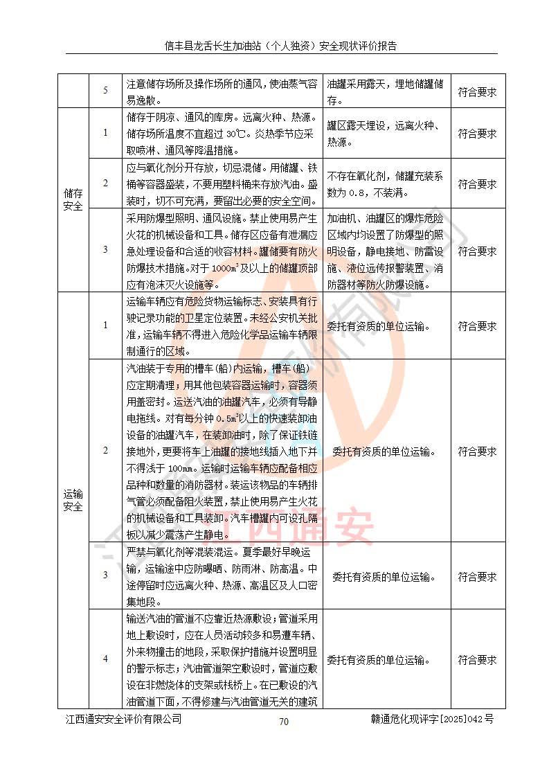 評價結論 | 信豐縣龍舌長生加油站(個人獨資)安全現(xiàn)狀符合危險化學品經營安全條件。 | |||