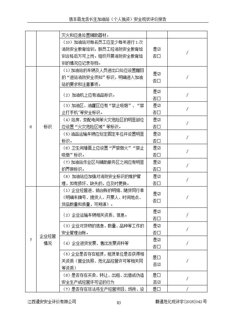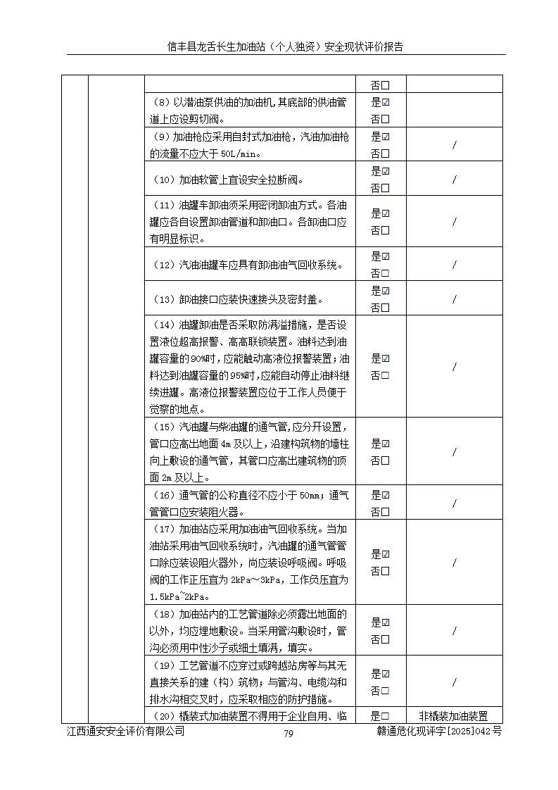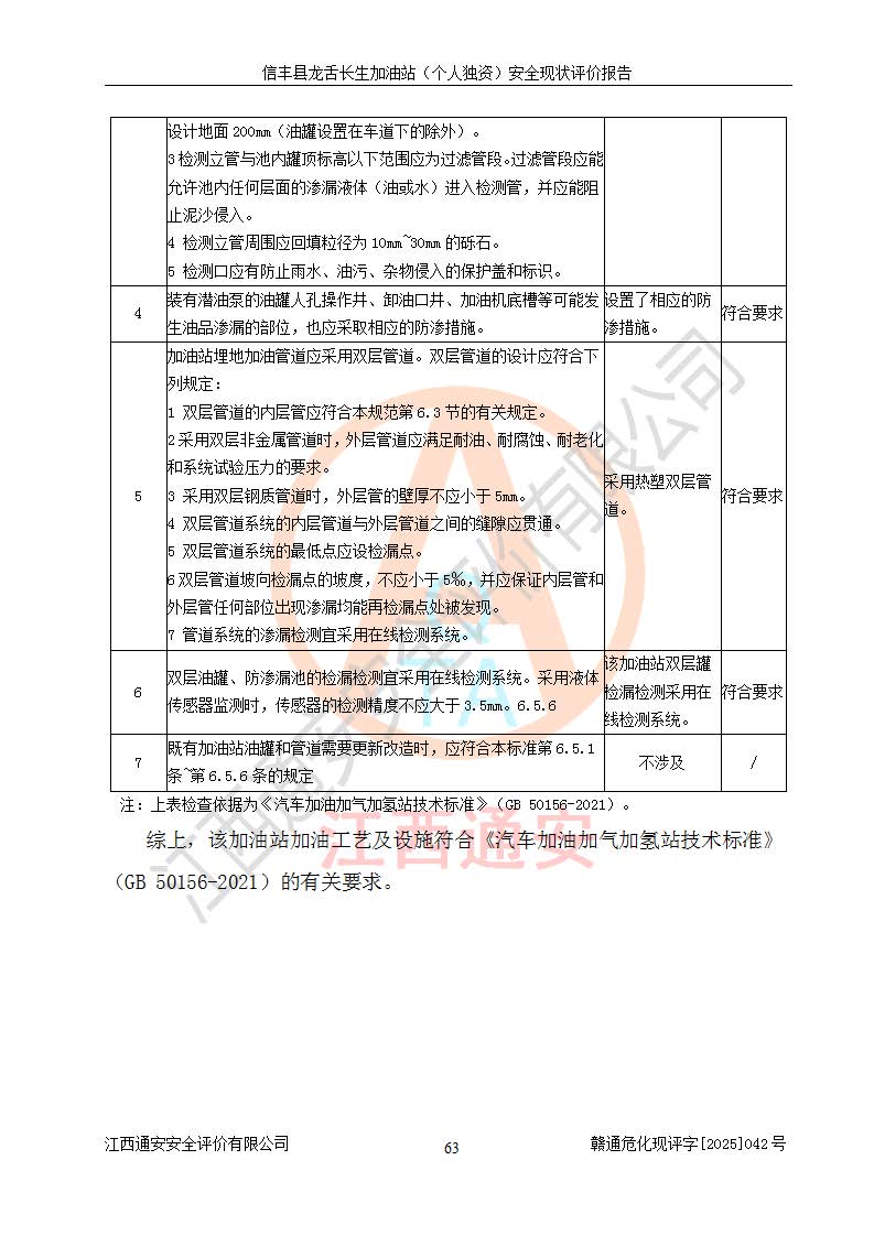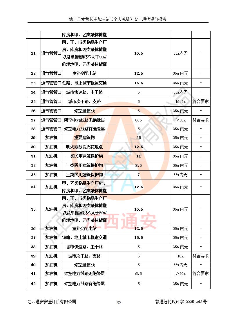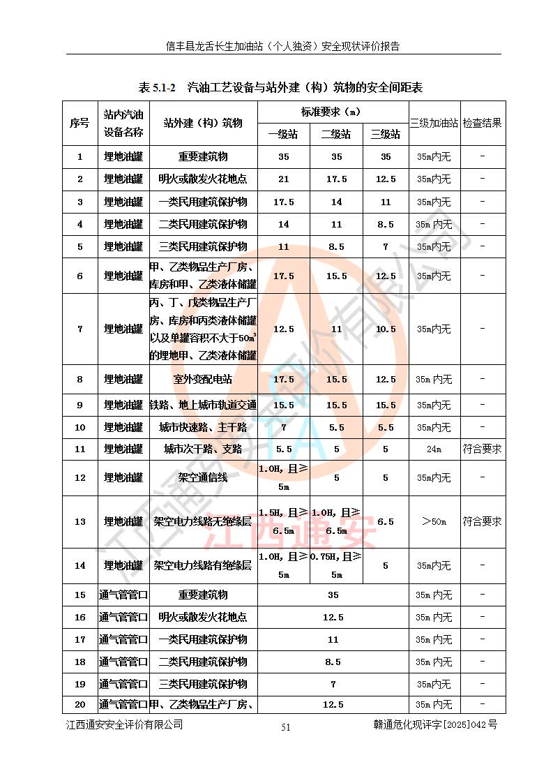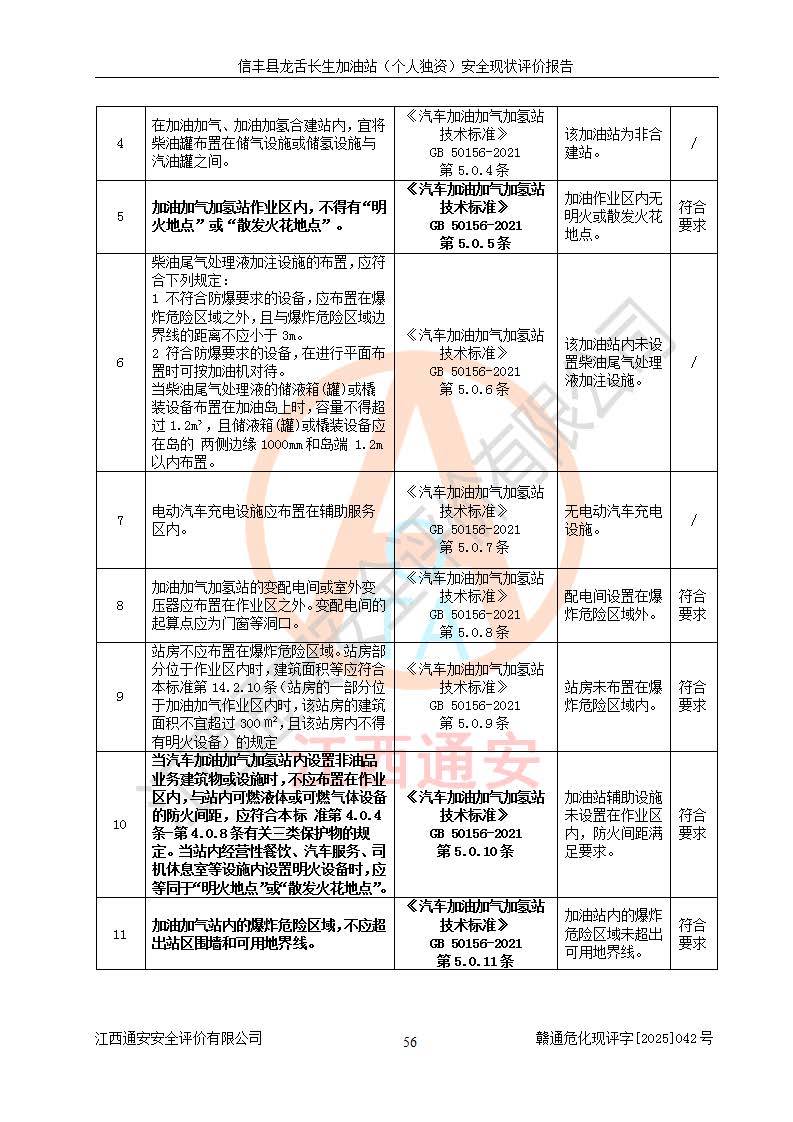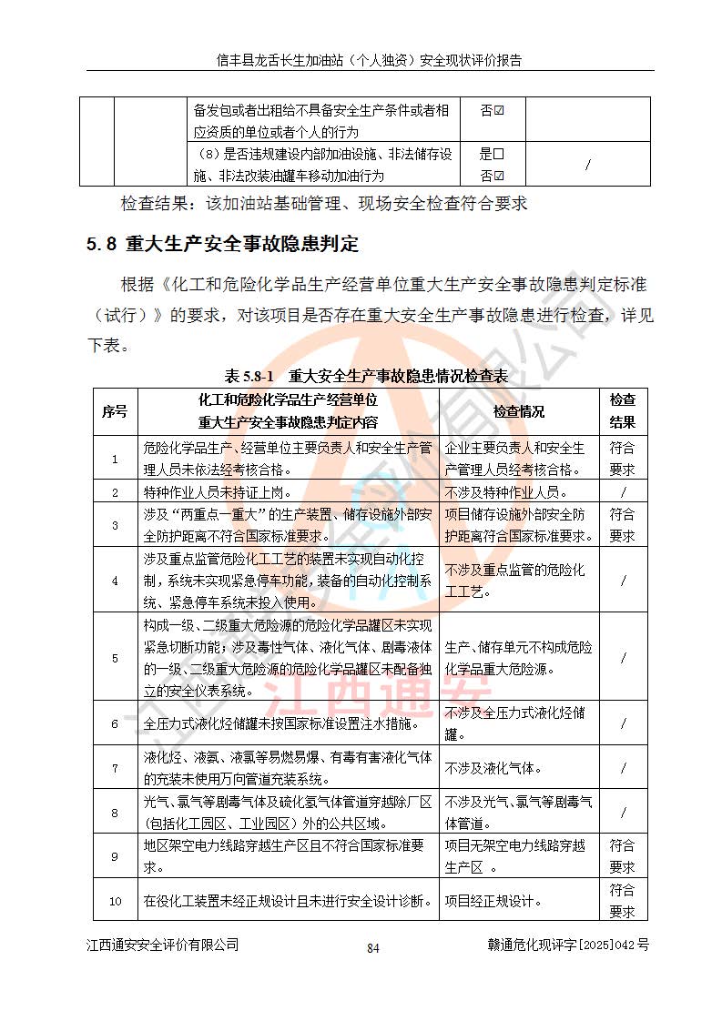 評價結論 | 信豐縣龍舌長生加油站(個人獨資)安全現(xiàn)狀符合危險化學品經營安全條件。 | |||