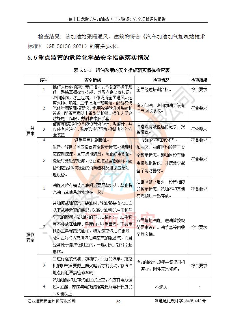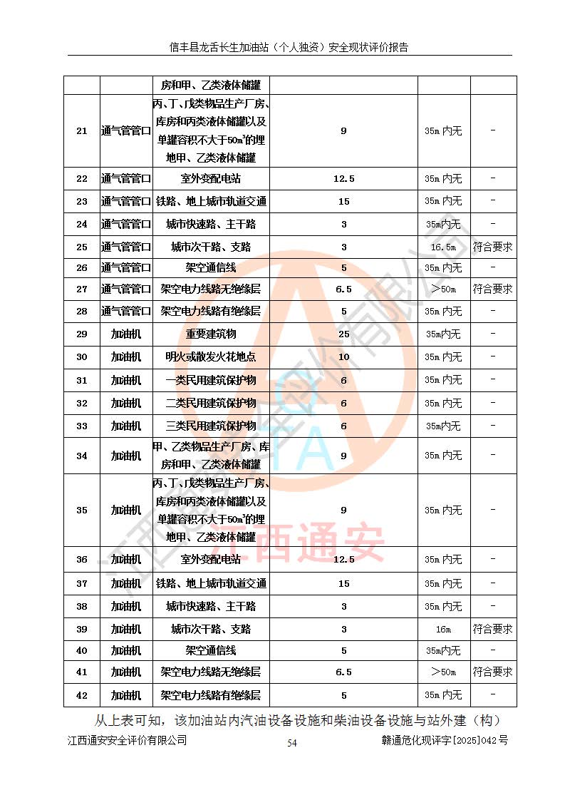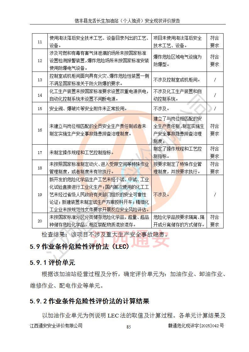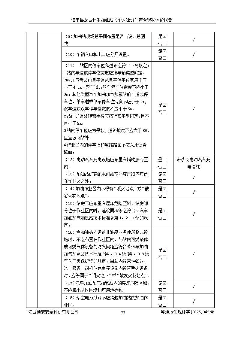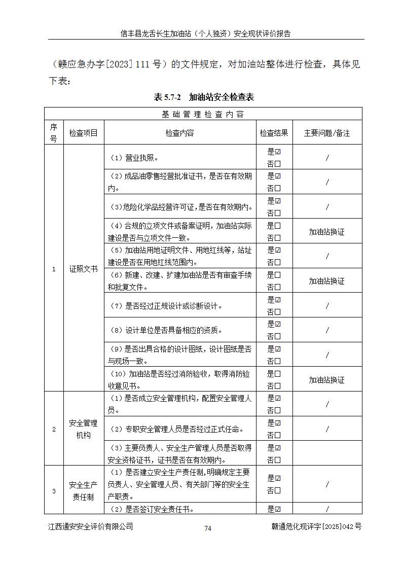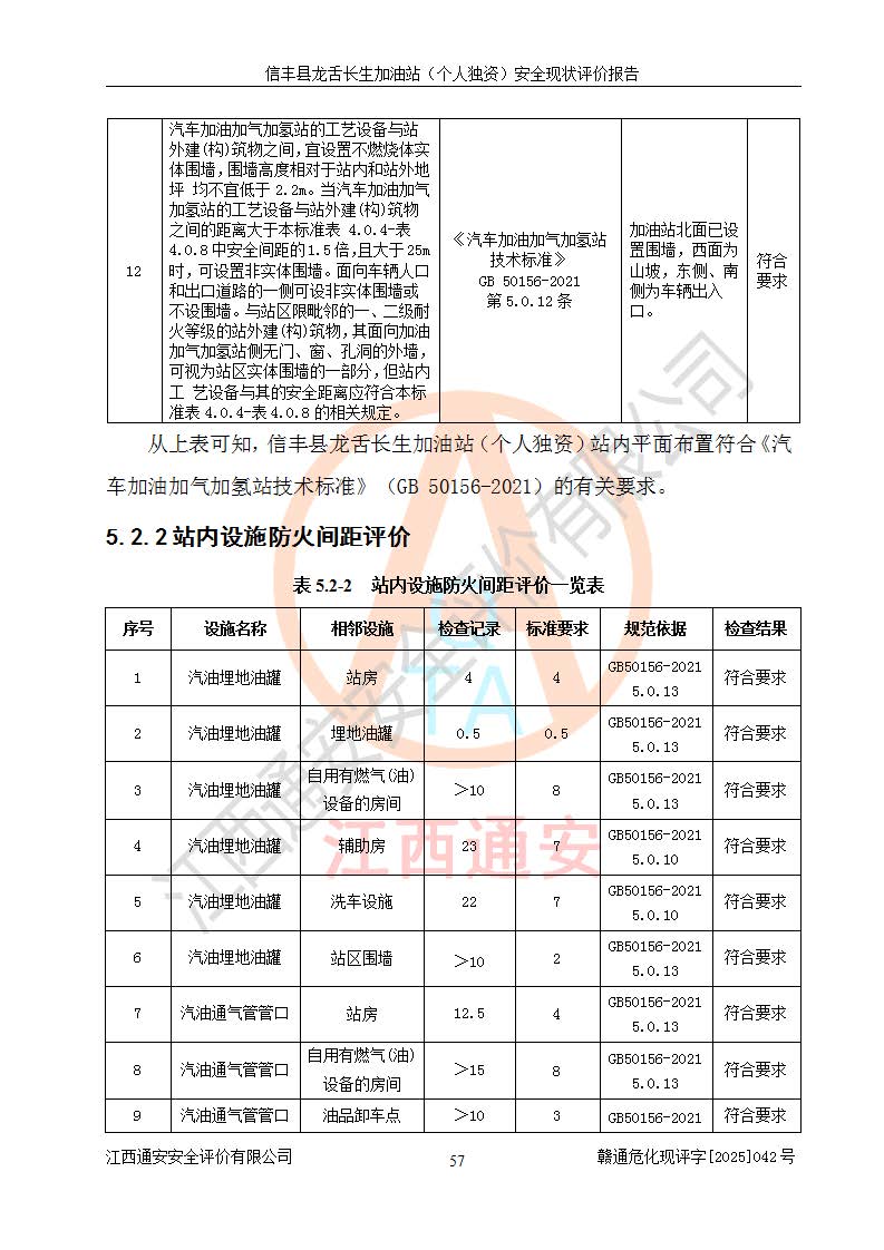 評價結論 | 信豐縣龍舌長生加油站(個人獨資)安全現(xiàn)狀符合危險化學品經營安全條件。 | |||