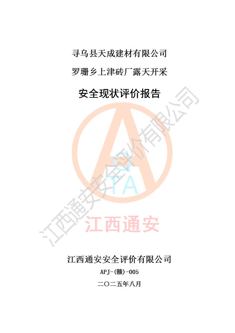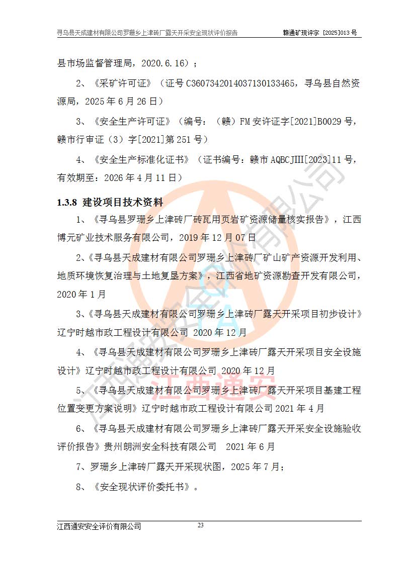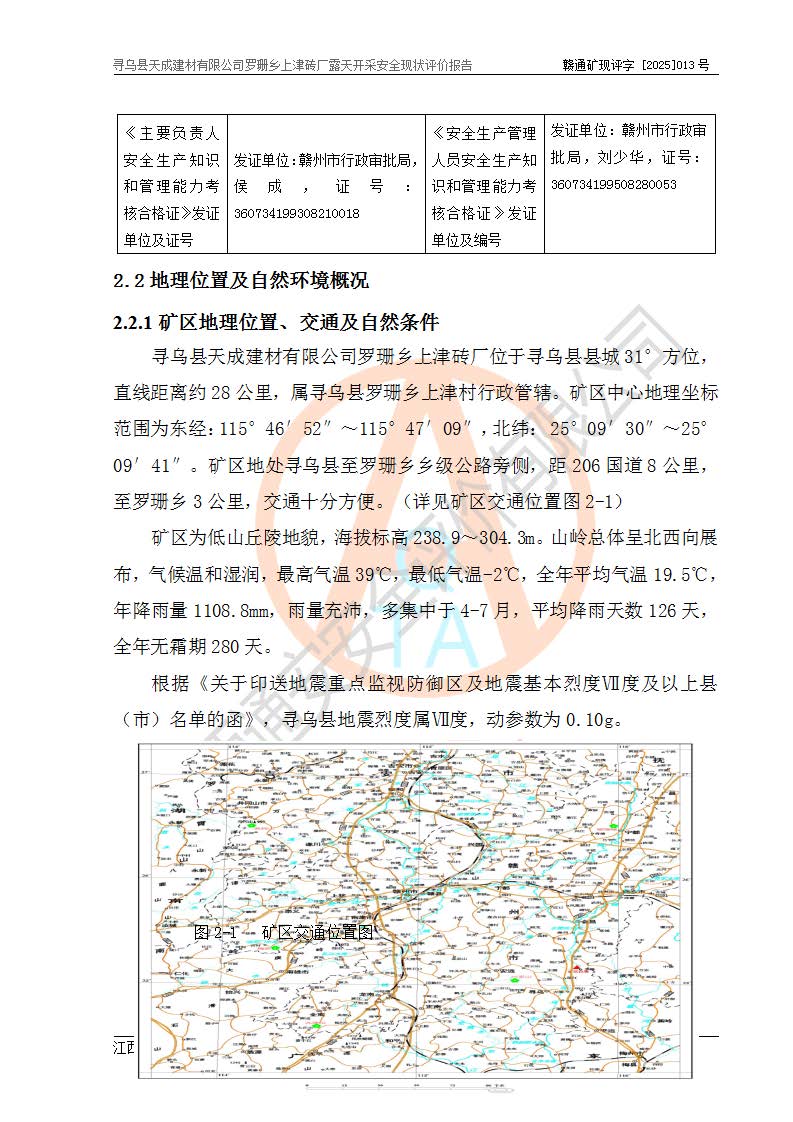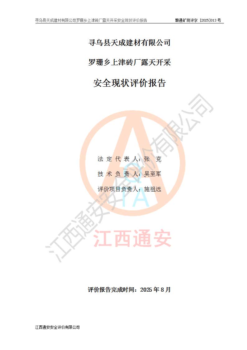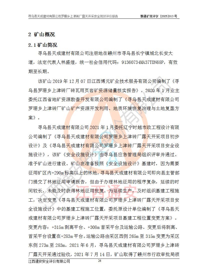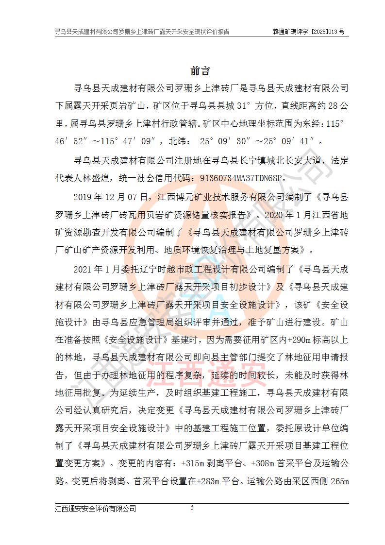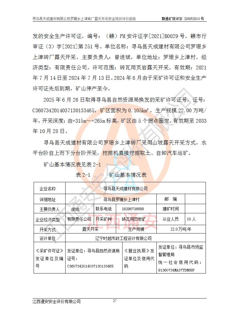 尋烏縣天成建材有限公司羅珊鄉(xiāng)上津磚廠是尋烏縣天成建材有限公司下屬露天開采頁巖礦山,礦區(qū)位于尋烏縣縣城31°方位,直線距離約28**,屬尋烏縣羅珊鄉(xiāng)上津村行政管轄。礦區(qū)中心地理坐標(biāo)范圍為東經(jīng):115°46′52″~115°47′09″,北緯: 25°09′30″~25°09′41″。 尋烏縣天成建材有限公司注冊地在尋烏縣長寧鎮(zhèn)城北長安大道,法定**人林盛煌,統(tǒng)一社會(huì)信用代碼:91360734MA37TDN68P。 2019年12月07日,江西博元礦業(yè)技術(shù)服務(wù)有限公司編制了《尋烏縣羅珊鄉(xiāng)上津磚廠磚瓦用頁巖礦資源儲量核實(shí)報(bào)告》。2020年1月江西省地礦資源勘查開發(fā)有限公司編制了《尋烏縣天成建材有限公司羅珊鄉(xiāng)上津磚廠礦山礦產(chǎn)資源開發(fā)利用、地質(zhì)環(huán)境恢復(fù)治理與土地復(fù)墾方案》。 2021年1月礦山委托遼寧時(shí)越市政工程設(shè)計(jì)有限公司編制了《尋烏縣天成建材有限公司羅珊鄉(xiāng)上津磚廠露天開采項(xiàng)目初步設(shè)計(jì)》及《尋烏縣天成建材有限公司羅珊鄉(xiāng)上津磚廠露天開采項(xiàng)目安全設(shè)施設(shè)計(jì)》,該礦《安全設(shè)施設(shè)計(jì)》由尋烏縣應(yīng)急管理局組織評審并通過,準(zhǔn)予礦山進(jìn)行建設(shè)。礦山在準(zhǔn)備按照《安全設(shè)施設(shè)計(jì)》基建時(shí),因?yàn)樾枰饔玫V區(qū)內(nèi)+290m標(biāo)高以上的林地,尋烏縣天成建材有限公司即向縣主管部門提交了林地征用申請報(bào)告,但由于辦理林地征用的程序復(fù)雜,延續(xù)的時(shí)間較長,未能及時(shí)獲得林地征用批復(fù)。為延續(xù)生產(chǎn),及時(shí)組織基建工程施工,尋烏縣天成建材有限公司經(jīng)認(rèn)真研究后,決定變更《尋烏縣天成建材有限公司羅珊鄉(xiāng)上津磚廠露天開采項(xiàng)目安全設(shè)施設(shè)計(jì)》中的基建工程施工位置,委托原設(shè)計(jì)單位編制了《尋烏縣天成建材有限公司羅珊鄉(xiāng)上津磚廠露天開采項(xiàng)目基建工程位置變更方案》。變更的內(nèi)容有:+315m剝離平臺、+308m首采平臺及運(yùn)輸公路。變更后將剝離、首采平臺設(shè)置在+283m平臺。運(yùn)輸公路由采區(qū)西側(cè)265m至315m變更為采區(qū)東側(cè)273m至283m。 2021年6月,尋烏縣天成建材有限公司羅珊鄉(xiāng)上津磚廠露天開采項(xiàng)目通過露天開采安全設(shè)施驗(yàn)收。2021年7月14日,礦山取得了贛州市行政審批局頒發(fā)的安全生產(chǎn)許可證,編號:(贛)FM安許證字[2021]B0029號,贛市行審證(3)字[2021]第251號。單位名稱:尋烏縣天成建材有限公司羅珊鄉(xiāng)上津磚廠露天開采,主要負(fù)責(zé)人:曾進(jìn)斌,單位地址:羅珊鄉(xiāng)上津村,經(jīng)濟(jì)類型:有限責(zé)任公司,許可范圍:磚瓦用頁巖露天開采。**期:2021年7月14日至2024年7月13日。2024年6月由于采礦許可證和安全生產(chǎn)許可證先后到期,礦山停產(chǎn)至今。 2025年6月26日取得尋烏縣自然資源局換發(fā)的采礦許可證號,證號:C3607342014037130133465,礦區(qū)面積為0.105km2,生產(chǎn)規(guī)模22.00萬噸/年,開采深度:由+315m~+265m標(biāo)高,礦區(qū)由5個(gè)拐點(diǎn)圈定。**期至2033年10月28日。 尋烏縣天成建材有限公司羅珊鄉(xiāng)上津磚廠采用山坡露天開采方式,水平臺階自上而下分臺階開采,挖掘機(jī)直接挖掘取土、自卸汽車運(yùn)礦。 根據(jù)《安全生產(chǎn)法》、《礦山安全法》、《安全生產(chǎn)許可證條例》、《非煤礦礦山企業(yè)安全生產(chǎn)許可證實(shí)施辦法》和原江西省安全生產(chǎn)監(jiān)督管理局《關(guān)于做好非煤礦礦山企業(yè)安全生產(chǎn)許可證延期換證工作的通知》的要求,尋烏縣天成建材有限公司委托江西通安安全評價(jià)有限公司對羅珊鄉(xiāng)上津磚廠露天開采進(jìn)行安全現(xiàn)狀評價(jià)。 |
