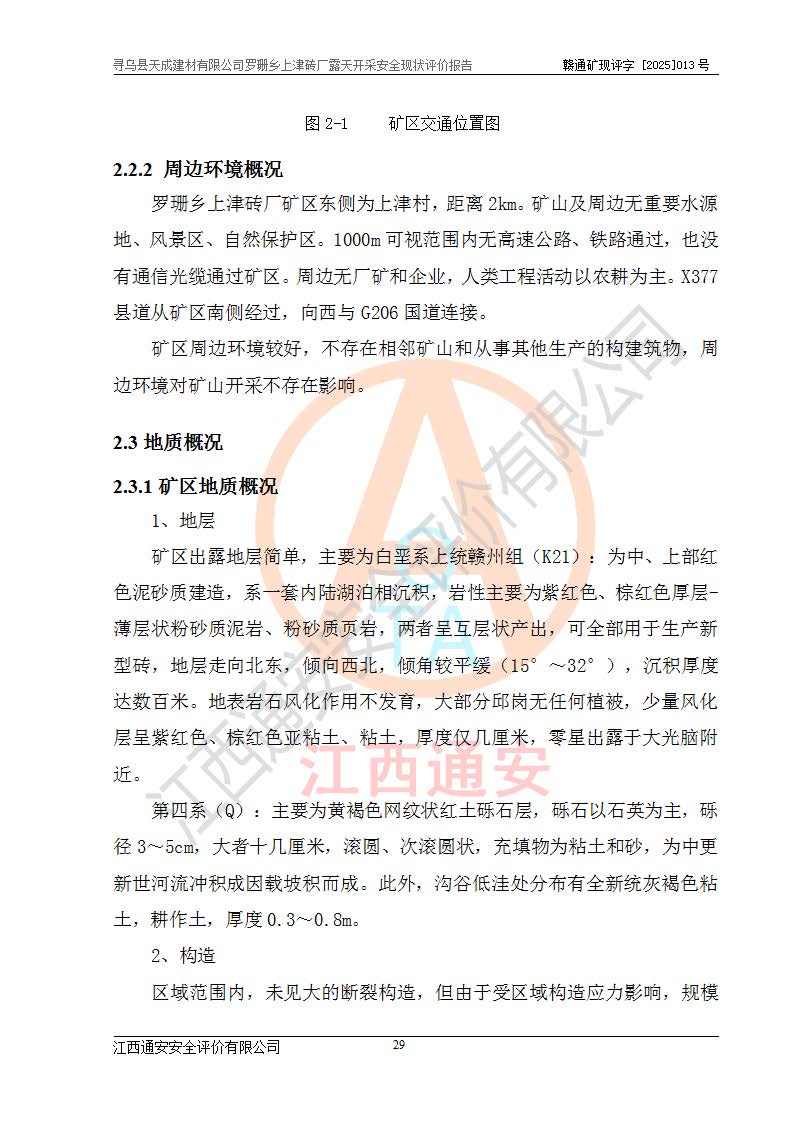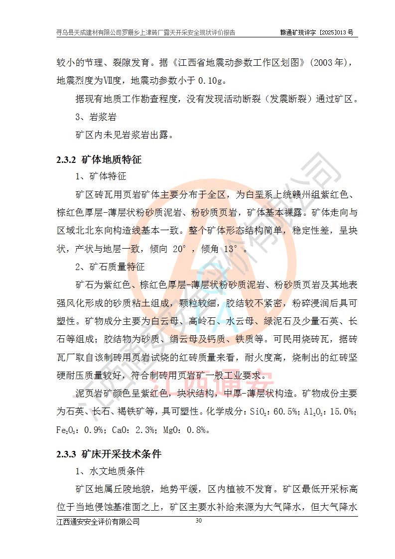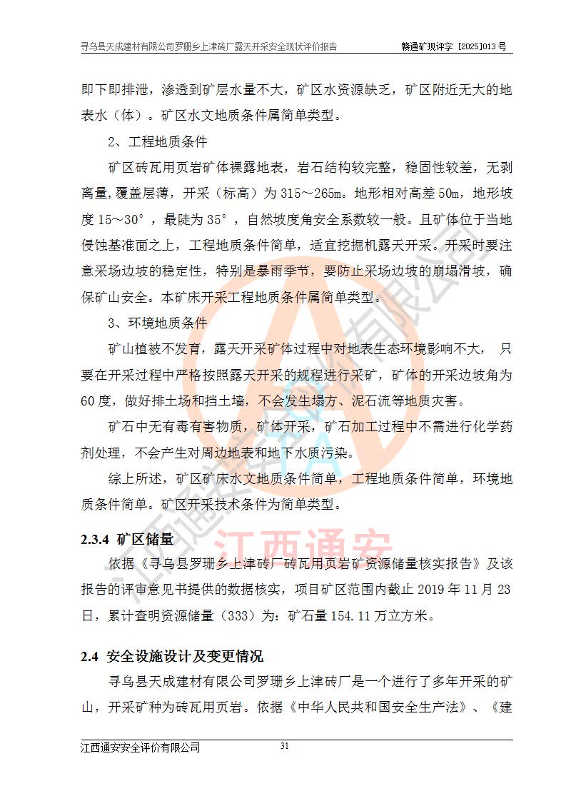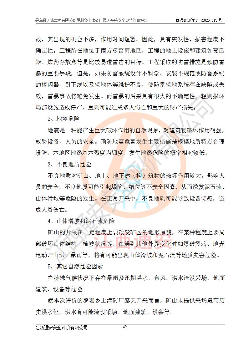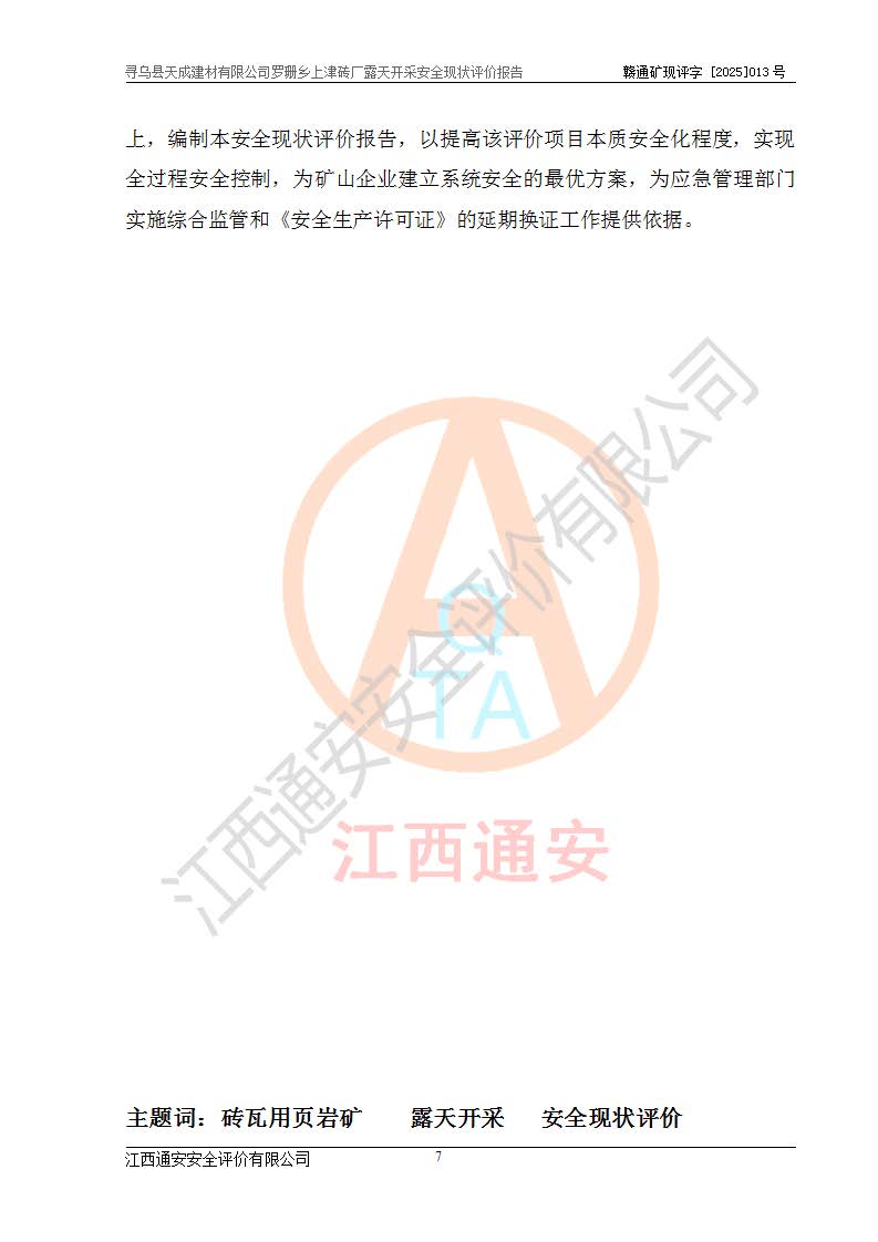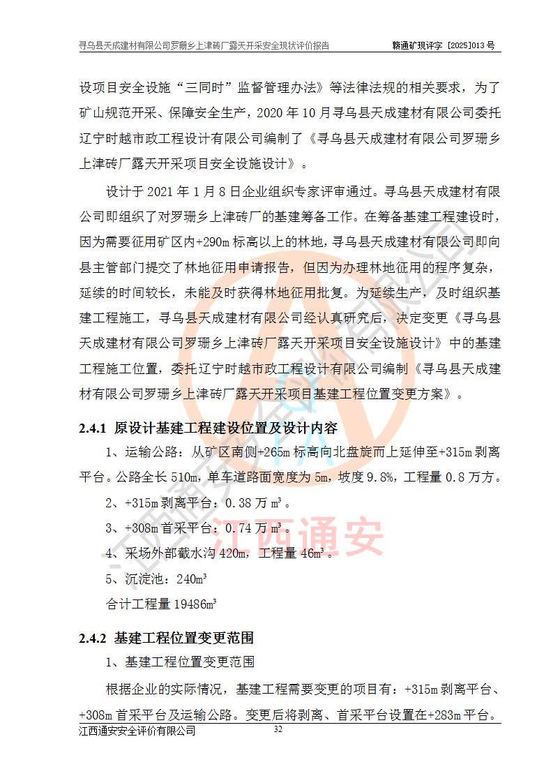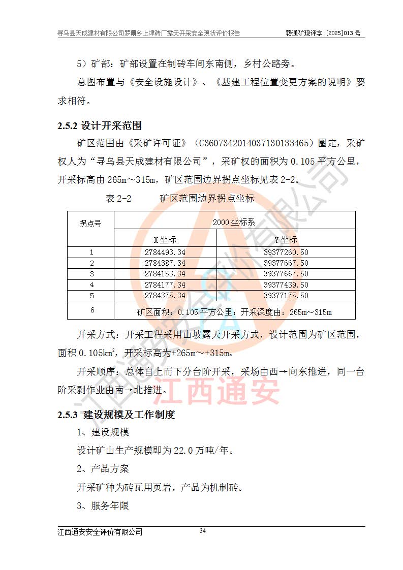 尋烏縣天成建材有限公司羅珊鄉(xiāng)上津磚廠是尋烏縣天成建材有限公司下屬露天開采頁巖礦山,礦區(qū)位于尋烏縣縣城31°方位,直線距離約28**,屬尋烏縣羅珊鄉(xiāng)上津村行政管轄。礦區(qū)中心地理坐標(biāo)范圍為東經(jīng):115°46′52″~115°47′09″,北緯: 25°09′30″~25°09′41″。 尋烏縣天成建材有限公司注冊地在尋烏縣長寧鎮(zhèn)城北長安大道,法定**人林盛煌,統(tǒng)一社會(huì)信用代碼:91360734MA37TDN68P。 2019年12月07日,江西博元礦業(yè)技術(shù)服務(wù)有限公司編制了《尋烏縣羅珊鄉(xiāng)上津磚廠磚瓦用頁巖礦資源儲量核實(shí)報(bào)告》。2020年1月江西省地礦資源勘查開發(fā)有限公司編制了《尋烏縣天成建材有限公司羅珊鄉(xiāng)上津磚廠礦山礦產(chǎn)資源開發(fā)利用、地質(zhì)環(huán)境恢復(fù)治理與土地復(fù)墾方案》。 2021年1月礦山委托遼寧時(shí)越市政工程設(shè)計(jì)有限公司編制了《尋烏縣天成建材有限公司羅珊鄉(xiāng)上津磚廠露天開采項(xiàng)目初步設(shè)計(jì)》及《尋烏縣天成建材有限公司羅珊鄉(xiāng)上津磚廠露天開采項(xiàng)目安全設(shè)施設(shè)計(jì)》,該礦《安全設(shè)施設(shè)計(jì)》由尋烏縣應(yīng)急管理局組織評審并通過,準(zhǔn)予礦山進(jìn)行建設(shè)。礦山在準(zhǔn)備按照《安全設(shè)施設(shè)計(jì)》基建時(shí),因?yàn)樾枰饔玫V區(qū)內(nèi)+290m標(biāo)高以上的林地,尋烏縣天成建材有限公司即向縣主管部門提交了林地征用申請報(bào)告,但由于辦理林地征用的程序復(fù)雜,延續(xù)的時(shí)間較長,未能及時(shí)獲得林地征用批復(fù)。為延續(xù)生產(chǎn),及時(shí)組織基建工程施工,尋烏縣天成建材有限公司經(jīng)認(rèn)真研究后,決定變更《尋烏縣天成建材有限公司羅珊鄉(xiāng)上津磚廠露天開采項(xiàng)目安全設(shè)施設(shè)計(jì)》中的基建工程施工位置,委托原設(shè)計(jì)單位編制了《尋烏縣天成建材有限公司羅珊鄉(xiāng)上津磚廠露天開采項(xiàng)目基建工程位置變更方案》。變更的內(nèi)容有:+315m剝離平臺、+308m首采平臺及運(yùn)輸公路。變更后將剝離、首采平臺設(shè)置在+283m平臺。運(yùn)輸公路由采區(qū)西側(cè)265m至315m變更為采區(qū)東側(cè)273m至283m。 2021年6月,尋烏縣天成建材有限公司羅珊鄉(xiāng)上津磚廠露天開采項(xiàng)目通過露天開采安全設(shè)施驗(yàn)收。2021年7月14日,礦山取得了贛州市行政審批局頒發(fā)的安全生產(chǎn)許可證,編號:(贛)FM安許證字[2021]B0029號,贛市行審證(3)字[2021]第251號。單位名稱:尋烏縣天成建材有限公司羅珊鄉(xiāng)上津磚廠露天開采,主要負(fù)責(zé)人:曾進(jìn)斌,單位地址:羅珊鄉(xiāng)上津村,經(jīng)濟(jì)類型:有限責(zé)任公司,許可范圍:磚瓦用頁巖露天開采。**期:2021年7月14日至2024年7月13日。2024年6月由于采礦許可證和安全生產(chǎn)許可證先后到期,礦山停產(chǎn)至今。 2025年6月26日取得尋烏縣自然資源局換發(fā)的采礦許可證號,證號:C3607342014037130133465,礦區(qū)面積為0.105km2,生產(chǎn)規(guī)模22.00萬噸/年,開采深度:由+315m~+265m標(biāo)高,礦區(qū)由5個(gè)拐點(diǎn)圈定。**期至2033年10月28日。 尋烏縣天成建材有限公司羅珊鄉(xiāng)上津磚廠采用山坡露天開采方式,水平臺階自上而下分臺階開采,挖掘機(jī)直接挖掘取土、自卸汽車運(yùn)礦。 根據(jù)《安全生產(chǎn)法》、《礦山安全法》、《安全生產(chǎn)許可證條例》、《非煤礦礦山企業(yè)安全生產(chǎn)許可證實(shí)施辦法》和原江西省安全生產(chǎn)監(jiān)督管理局《關(guān)于做好非煤礦礦山企業(yè)安全生產(chǎn)許可證延期換證工作的通知》的要求,尋烏縣天成建材有限公司委托江西通安安全評價(jià)有限公司對羅珊鄉(xiāng)上津磚廠露天開采進(jìn)行安全現(xiàn)狀評價(jià)。 |