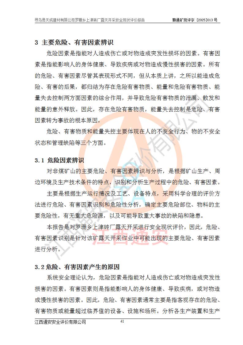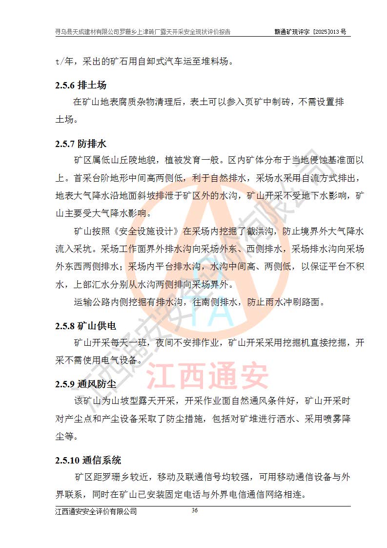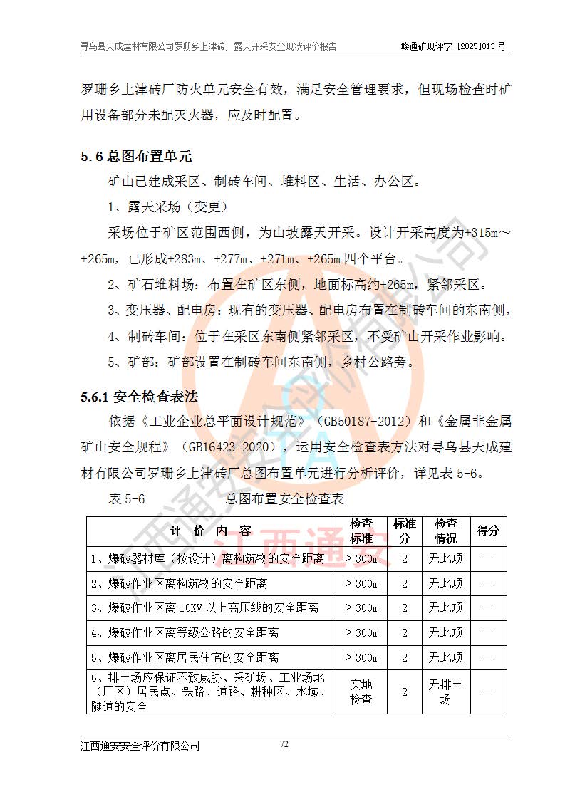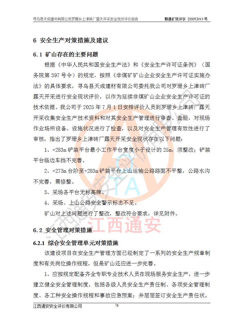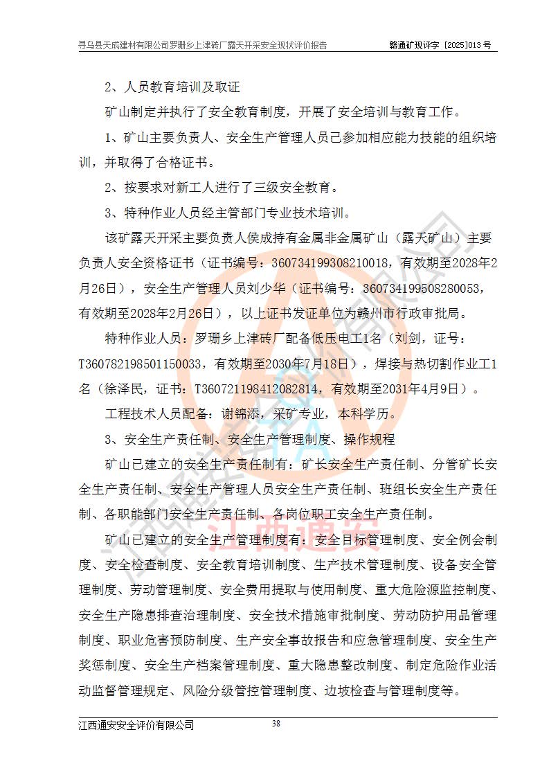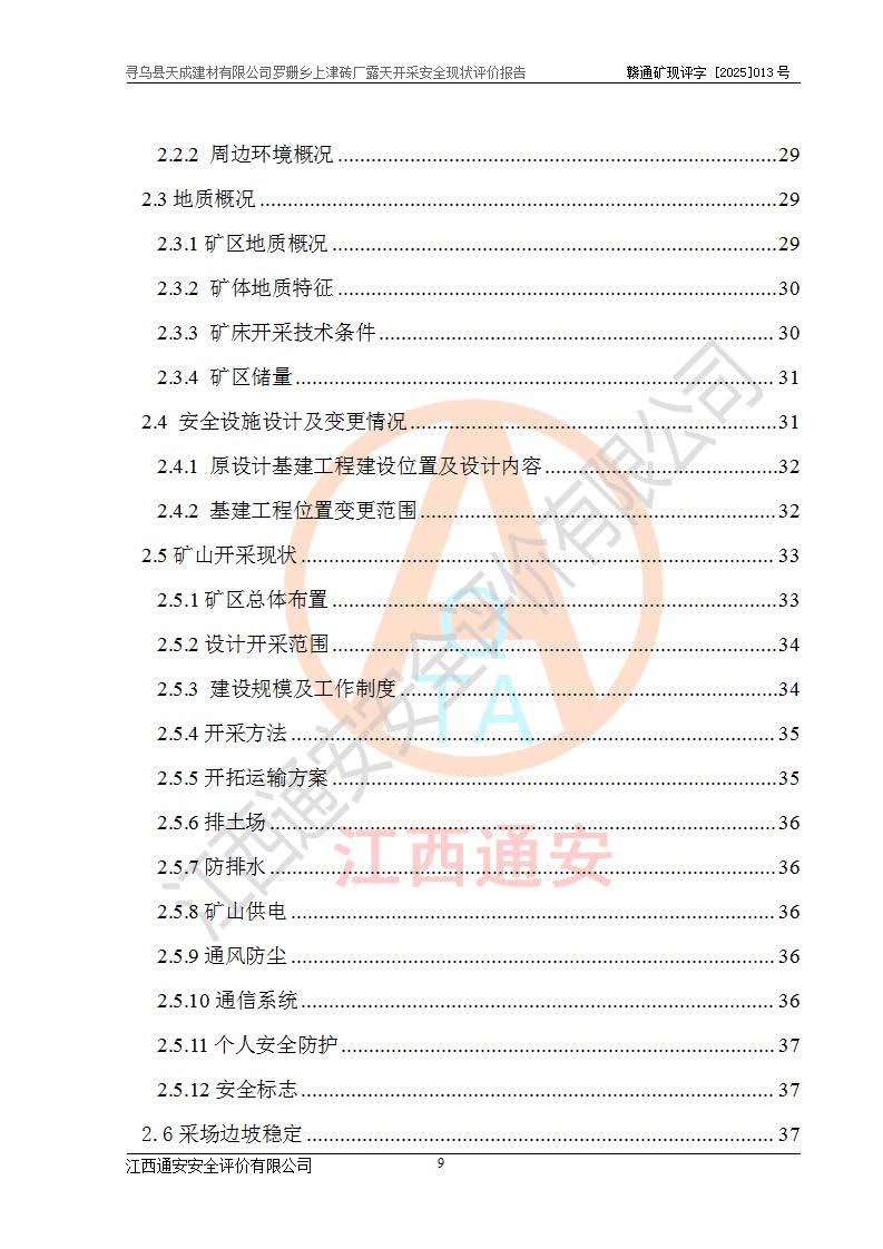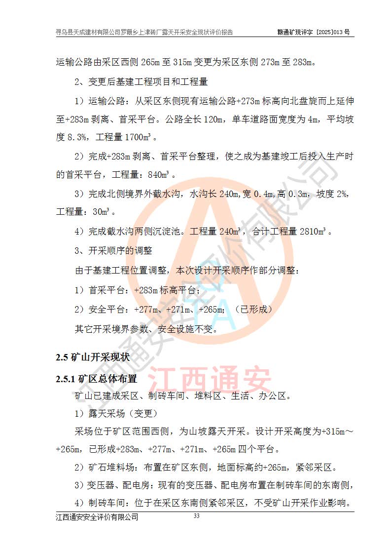 尋烏縣天成建材有限公司羅珊鄉(xiāng)上津磚廠是尋烏縣天成建材有限公司下屬露天開采頁巖礦山,礦區(qū)位于尋烏縣縣城31°方位,直線距離約28**,屬尋烏縣羅珊鄉(xiāng)上津村行政管轄。礦區(qū)中心地理坐標(biāo)范圍為東經(jīng):115°46′52″~115°47′09″,北緯: 25°09′30″~25°09′41″。 尋烏縣天成建材有限公司注冊地在尋烏縣長寧鎮(zhèn)城北長安大道,法定**人林盛煌,統(tǒng)一社會(huì)信用代碼:91360734MA37TDN68P。 2019年12月07日,江西博元礦業(yè)技術(shù)服務(wù)有限公司編制了《尋烏縣羅珊鄉(xiāng)上津磚廠磚瓦用頁巖礦資源儲量核實(shí)報(bào)告》。2020年1月江西省地礦資源勘查開發(fā)有限公司編制了《尋烏縣天成建材有限公司羅珊鄉(xiāng)上津磚廠礦山礦產(chǎn)資源開發(fā)利用、地質(zhì)環(huán)境恢復(fù)治理與土地復(fù)墾方案》。 2021年1月礦山委托遼寧時(shí)越市政工程設(shè)計(jì)有限公司編制了《尋烏縣天成建材有限公司羅珊鄉(xiāng)上津磚廠露天開采項(xiàng)目初步設(shè)計(jì)》及《尋烏縣天成建材有限公司羅珊鄉(xiāng)上津磚廠露天開采項(xiàng)目安全設(shè)施設(shè)計(jì)》,該礦《安全設(shè)施設(shè)計(jì)》由尋烏縣應(yīng)急管理局組織評審并通過,準(zhǔn)予礦山進(jìn)行建設(shè)。礦山在準(zhǔn)備按照《安全設(shè)施設(shè)計(jì)》基建時(shí),因?yàn)樾枰饔玫V區(qū)內(nèi)+290m標(biāo)高以上的林地,尋烏縣天成建材有限公司即向縣主管部門提交了林地征用申請報(bào)告,但由于辦理林地征用的程序復(fù)雜,延續(xù)的時(shí)間較長,未能及時(shí)獲得林地征用批復(fù)。為延續(xù)生產(chǎn),及時(shí)組織基建工程施工,尋烏縣天成建材有限公司經(jīng)認(rèn)真研究后,決定變更《尋烏縣天成建材有限公司羅珊鄉(xiāng)上津磚廠露天開采項(xiàng)目安全設(shè)施設(shè)計(jì)》中的基建工程施工位置,委托原設(shè)計(jì)單位編制了《尋烏縣天成建材有限公司羅珊鄉(xiāng)上津磚廠露天開采項(xiàng)目基建工程位置變更方案》。變更的內(nèi)容有:+315m剝離平臺、+308m首采平臺及運(yùn)輸公路。變更后將剝離、首采平臺設(shè)置在+283m平臺。運(yùn)輸公路由采區(qū)西側(cè)265m至315m變更為采區(qū)東側(cè)273m至283m。 2021年6月,尋烏縣天成建材有限公司羅珊鄉(xiāng)上津磚廠露天開采項(xiàng)目通過露天開采安全設(shè)施驗(yàn)收。2021年7月14日,礦山取得了贛州市行政審批局頒發(fā)的安全生產(chǎn)許可證,編號:(贛)FM安許證字[2021]B0029號,贛市行審證(3)字[2021]第251號。單位名稱:尋烏縣天成建材有限公司羅珊鄉(xiāng)上津磚廠露天開采,主要負(fù)責(zé)人:曾進(jìn)斌,單位地址:羅珊鄉(xiāng)上津村,經(jīng)濟(jì)類型:有限責(zé)任公司,許可范圍:磚瓦用頁巖露天開采。**期:2021年7月14日至2024年7月13日。2024年6月由于采礦許可證和安全生產(chǎn)許可證先后到期,礦山停產(chǎn)至今。 2025年6月26日取得尋烏縣自然資源局換發(fā)的采礦許可證號,證號:C3607342014037130133465,礦區(qū)面積為0.105km2,生產(chǎn)規(guī)模22.00萬噸/年,開采深度:由+315m~+265m標(biāo)高,礦區(qū)由5個(gè)拐點(diǎn)圈定。**期至2033年10月28日。 尋烏縣天成建材有限公司羅珊鄉(xiāng)上津磚廠采用山坡露天開采方式,水平臺階自上而下分臺階開采,挖掘機(jī)直接挖掘取土、自卸汽車運(yùn)礦。 根據(jù)《安全生產(chǎn)法》、《礦山安全法》、《安全生產(chǎn)許可證條例》、《非煤礦礦山企業(yè)安全生產(chǎn)許可證實(shí)施辦法》和原江西省安全生產(chǎn)監(jiān)督管理局《關(guān)于做好非煤礦礦山企業(yè)安全生產(chǎn)許可證延期換證工作的通知》的要求,尋烏縣天成建材有限公司委托江西通安安全評價(jià)有限公司對羅珊鄉(xiāng)上津磚廠露天開采進(jìn)行安全現(xiàn)狀評價(jià)。 |