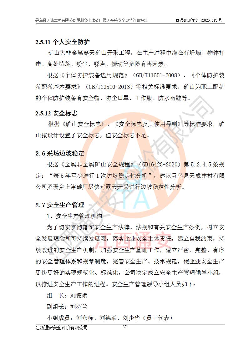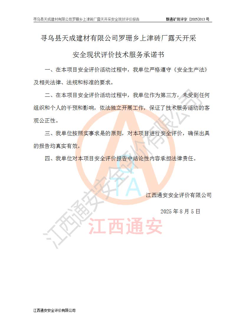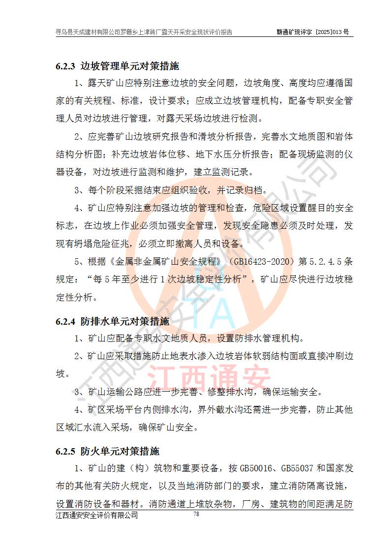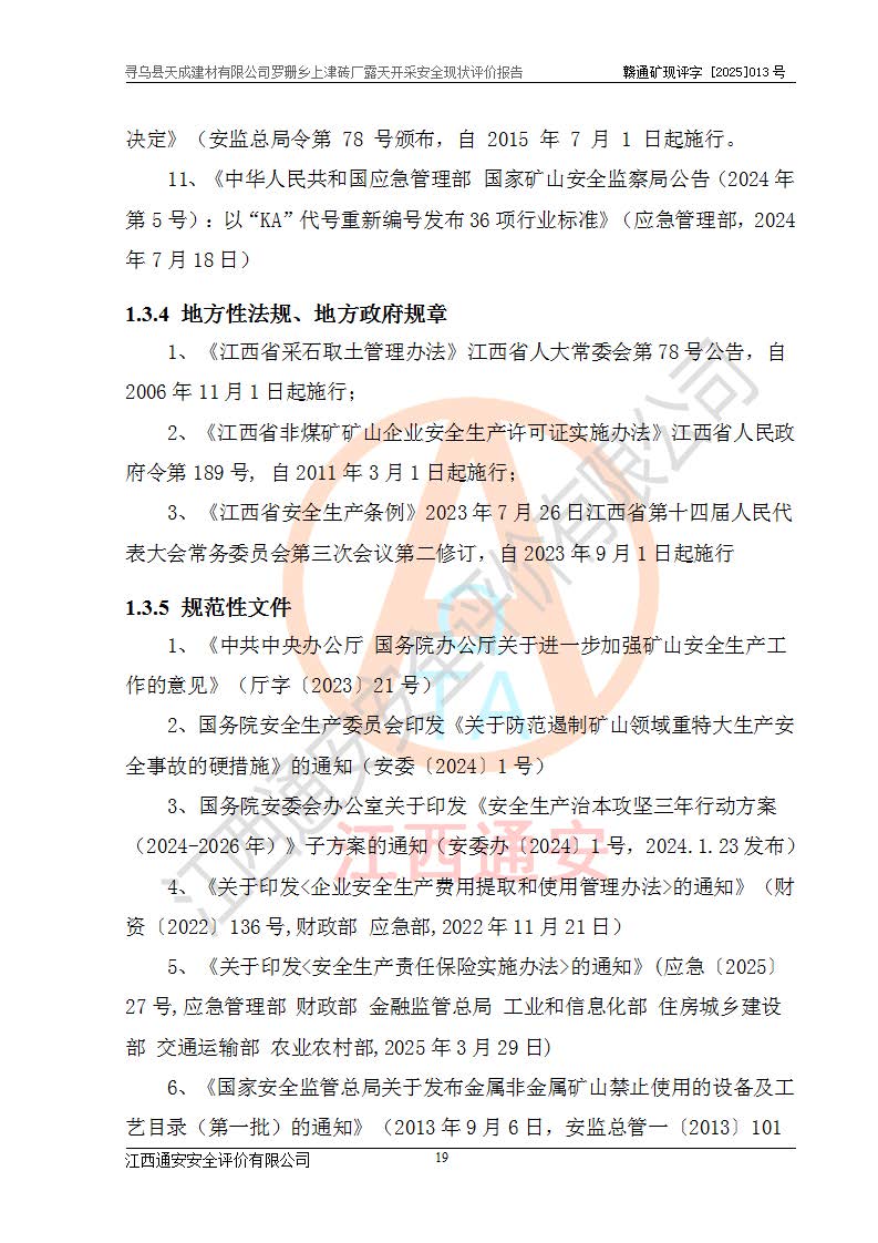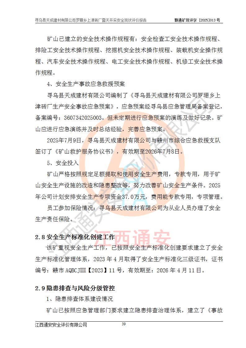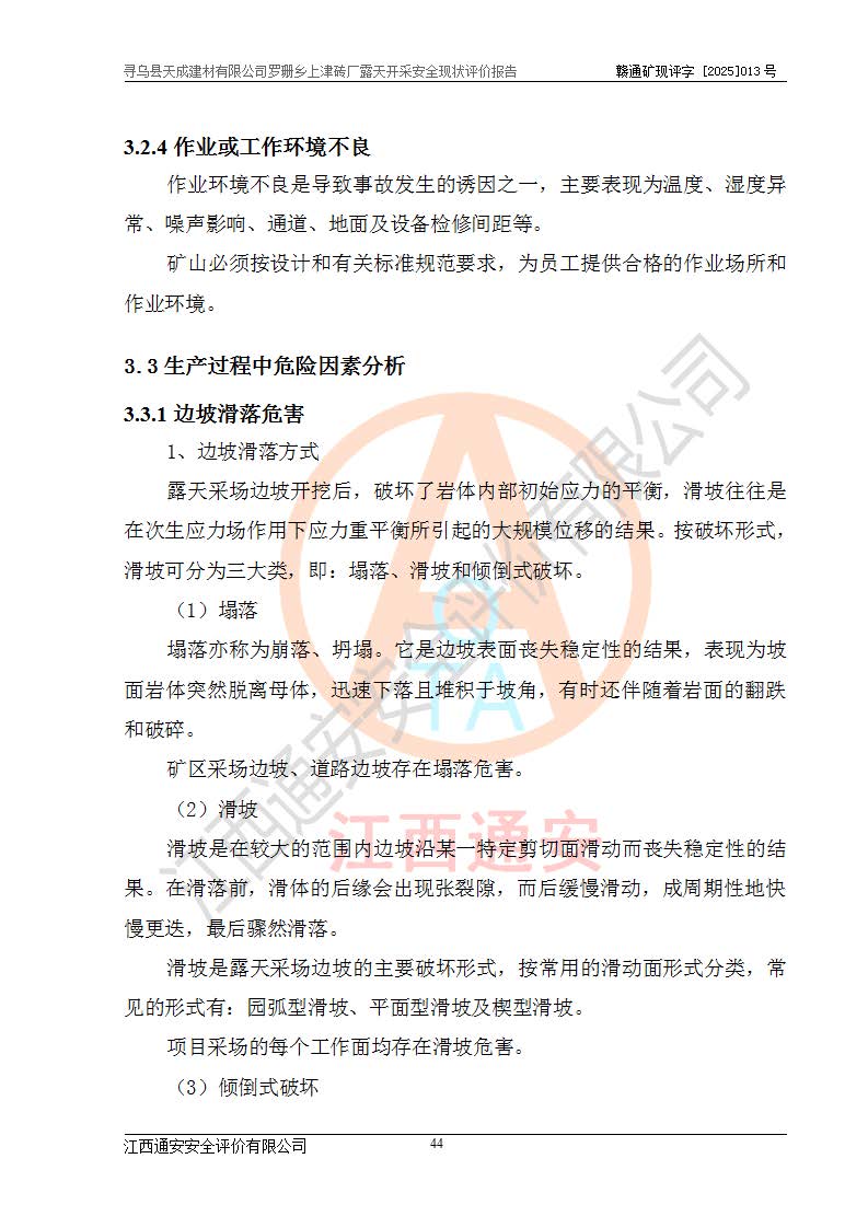 尋烏縣天成建材有限公司羅珊鄉(xiāng)上津磚廠是尋烏縣天成建材有限公司下屬露天開采頁巖礦山,礦區(qū)位于尋烏縣縣城31°方位,直線距離約28**,屬尋烏縣羅珊鄉(xiāng)上津村行政管轄。礦區(qū)中心地理坐標(biāo)范圍為東經(jīng):115°46′52″~115°47′09″,北緯: 25°09′30″~25°09′41″。 尋烏縣天成建材有限公司注冊地在尋烏縣長寧鎮(zhèn)城北長安大道,法定**人林盛煌,統(tǒng)一社會(huì)信用代碼:91360734MA37TDN68P。 2019年12月07日,江西博元礦業(yè)技術(shù)服務(wù)有限公司編制了《尋烏縣羅珊鄉(xiāng)上津磚廠磚瓦用頁巖礦資源儲量核實(shí)報(bào)告》。2020年1月江西省地礦資源勘查開發(fā)有限公司編制了《尋烏縣天成建材有限公司羅珊鄉(xiāng)上津磚廠礦山礦產(chǎn)資源開發(fā)利用、地質(zhì)環(huán)境恢復(fù)治理與土地復(fù)墾方案》。 2021年1月礦山委托遼寧時(shí)越市政工程設(shè)計(jì)有限公司編制了《尋烏縣天成建材有限公司羅珊鄉(xiāng)上津磚廠露天開采項(xiàng)目初步設(shè)計(jì)》及《尋烏縣天成建材有限公司羅珊鄉(xiāng)上津磚廠露天開采項(xiàng)目安全設(shè)施設(shè)計(jì)》,該礦《安全設(shè)施設(shè)計(jì)》由尋烏縣應(yīng)急管理局組織評審并通過,準(zhǔn)予礦山進(jìn)行建設(shè)。礦山在準(zhǔn)備按照《安全設(shè)施設(shè)計(jì)》基建時(shí),因?yàn)樾枰饔玫V區(qū)內(nèi)+290m標(biāo)高以上的林地,尋烏縣天成建材有限公司即向縣主管部門提交了林地征用申請報(bào)告,但由于辦理林地征用的程序復(fù)雜,延續(xù)的時(shí)間較長,未能及時(shí)獲得林地征用批復(fù)。為延續(xù)生產(chǎn),及時(shí)組織基建工程施工,尋烏縣天成建材有限公司經(jīng)認(rèn)真研究后,決定變更《尋烏縣天成建材有限公司羅珊鄉(xiāng)上津磚廠露天開采項(xiàng)目安全設(shè)施設(shè)計(jì)》中的基建工程施工位置,委托原設(shè)計(jì)單位編制了《尋烏縣天成建材有限公司羅珊鄉(xiāng)上津磚廠露天開采項(xiàng)目基建工程位置變更方案》。變更的內(nèi)容有:+315m剝離平臺、+308m首采平臺及運(yùn)輸公路。變更后將剝離、首采平臺設(shè)置在+283m平臺。運(yùn)輸公路由采區(qū)西側(cè)265m至315m變更為采區(qū)東側(cè)273m至283m。 2021年6月,尋烏縣天成建材有限公司羅珊鄉(xiāng)上津磚廠露天開采項(xiàng)目通過露天開采安全設(shè)施驗(yàn)收。2021年7月14日,礦山取得了贛州市行政審批局頒發(fā)的安全生產(chǎn)許可證,編號:(贛)FM安許證字[2021]B0029號,贛市行審證(3)字[2021]第251號。單位名稱:尋烏縣天成建材有限公司羅珊鄉(xiāng)上津磚廠露天開采,主要負(fù)責(zé)人:曾進(jìn)斌,單位地址:羅珊鄉(xiāng)上津村,經(jīng)濟(jì)類型:有限責(zé)任公司,許可范圍:磚瓦用頁巖露天開采。**期:2021年7月14日至2024年7月13日。2024年6月由于采礦許可證和安全生產(chǎn)許可證先后到期,礦山停產(chǎn)至今。 2025年6月26日取得尋烏縣自然資源局換發(fā)的采礦許可證號,證號:C3607342014037130133465,礦區(qū)面積為0.105km2,生產(chǎn)規(guī)模22.00萬噸/年,開采深度:由+315m~+265m標(biāo)高,礦區(qū)由5個(gè)拐點(diǎn)圈定。**期至2033年10月28日。 尋烏縣天成建材有限公司羅珊鄉(xiāng)上津磚廠采用山坡露天開采方式,水平臺階自上而下分臺階開采,挖掘機(jī)直接挖掘取土、自卸汽車運(yùn)礦。 根據(jù)《安全生產(chǎn)法》、《礦山安全法》、《安全生產(chǎn)許可證條例》、《非煤礦礦山企業(yè)安全生產(chǎn)許可證實(shí)施辦法》和原江西省安全生產(chǎn)監(jiān)督管理局《關(guān)于做好非煤礦礦山企業(yè)安全生產(chǎn)許可證延期換證工作的通知》的要求,尋烏縣天成建材有限公司委托江西通安安全評價(jià)有限公司對羅珊鄉(xiāng)上津磚廠露天開采進(jìn)行安全現(xiàn)狀評價(jià)。 |